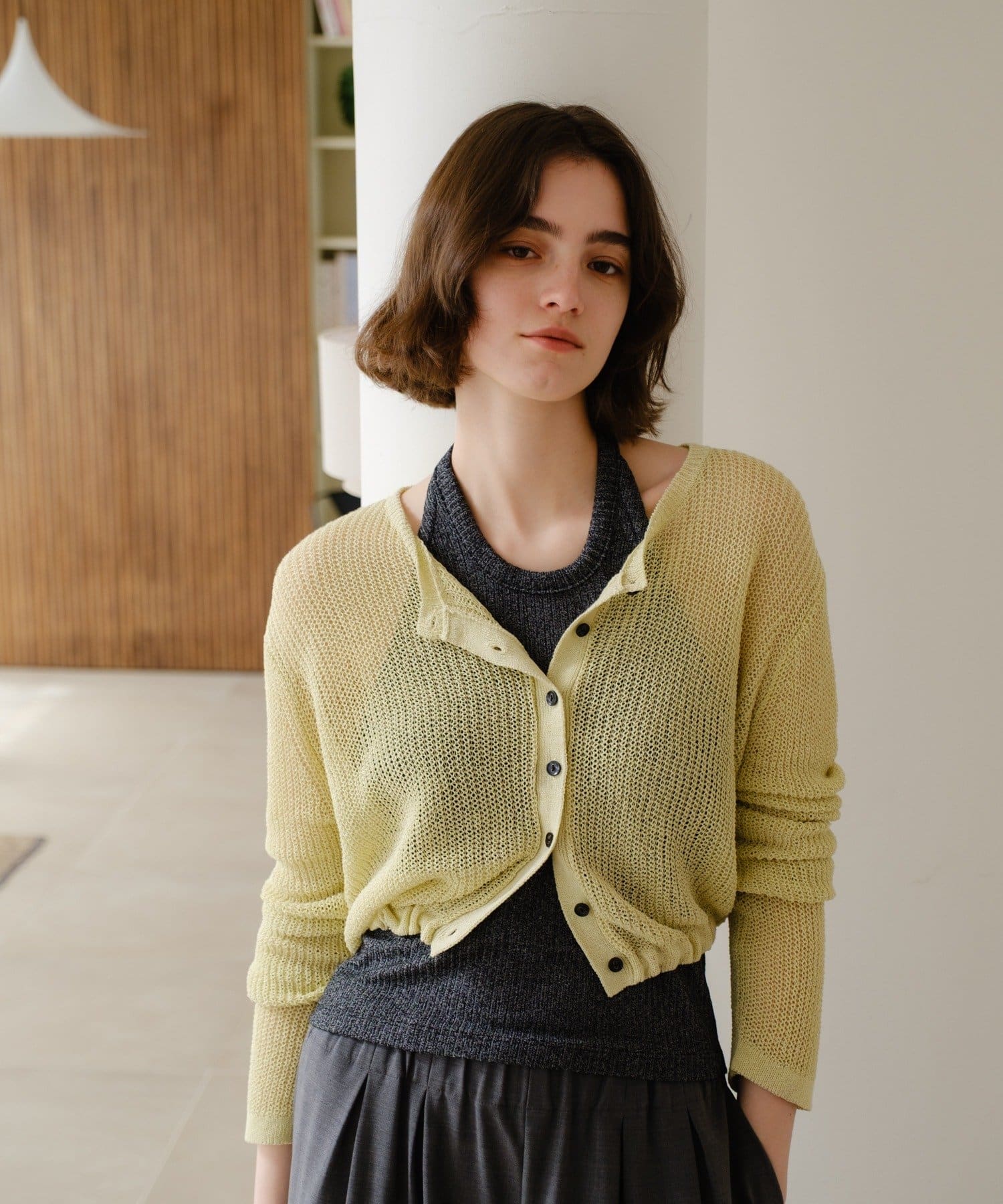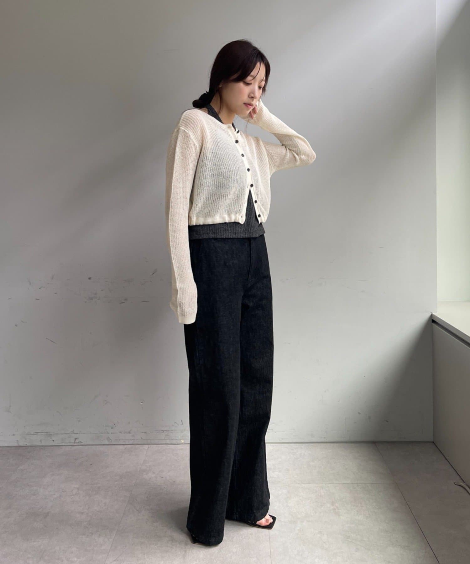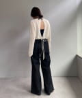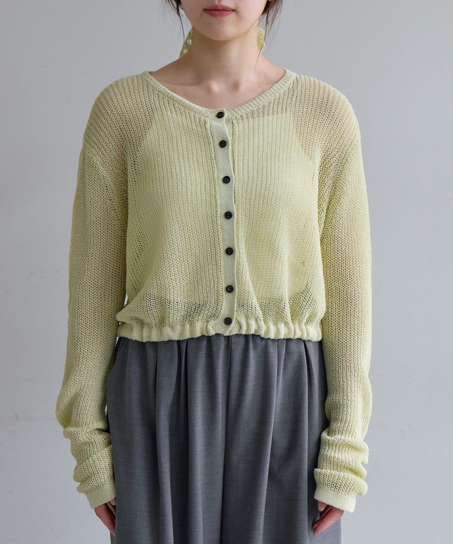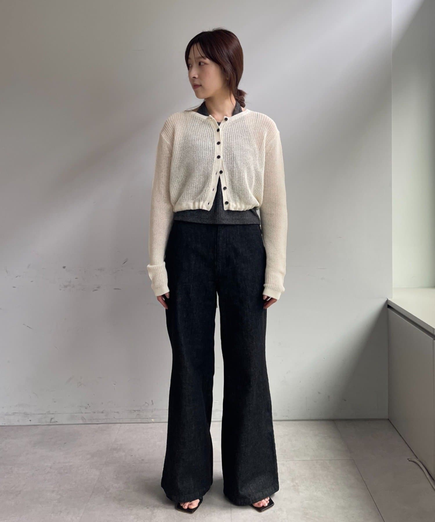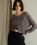 着丈はやや短めのクロップド丈に設定しており、ウエスト位置が高く見え、スタイルアップが叶います。前後逆にしてボレロのように着るアレンジもおすすめです。