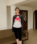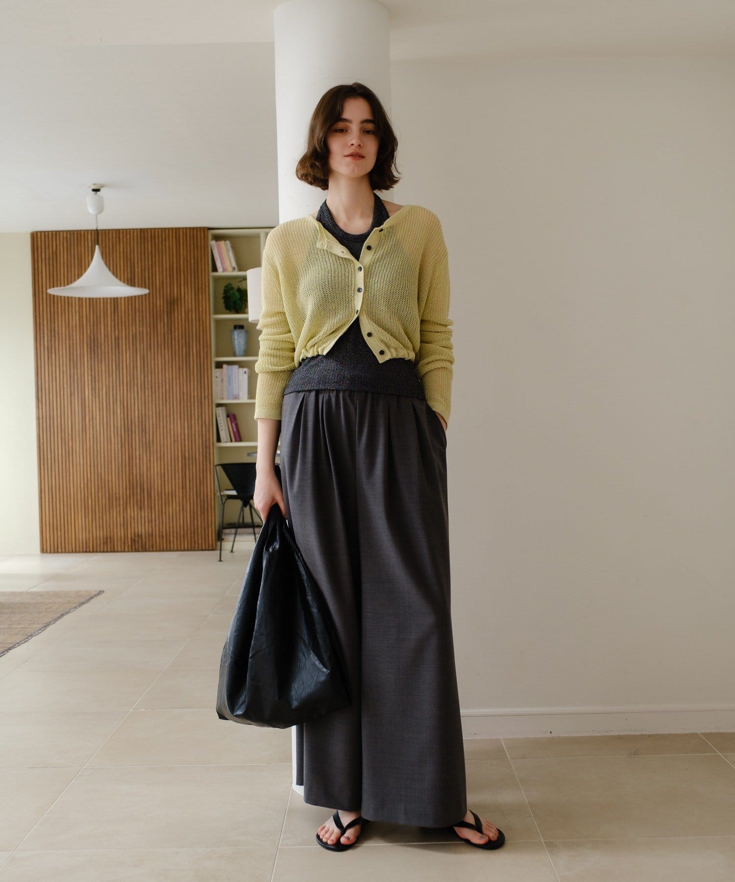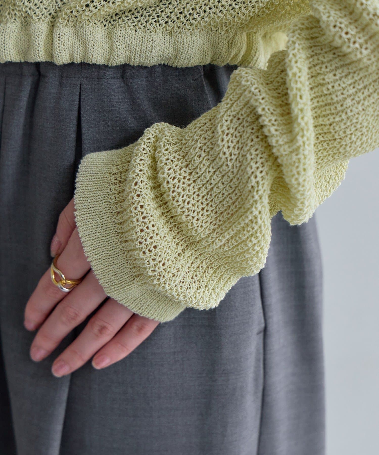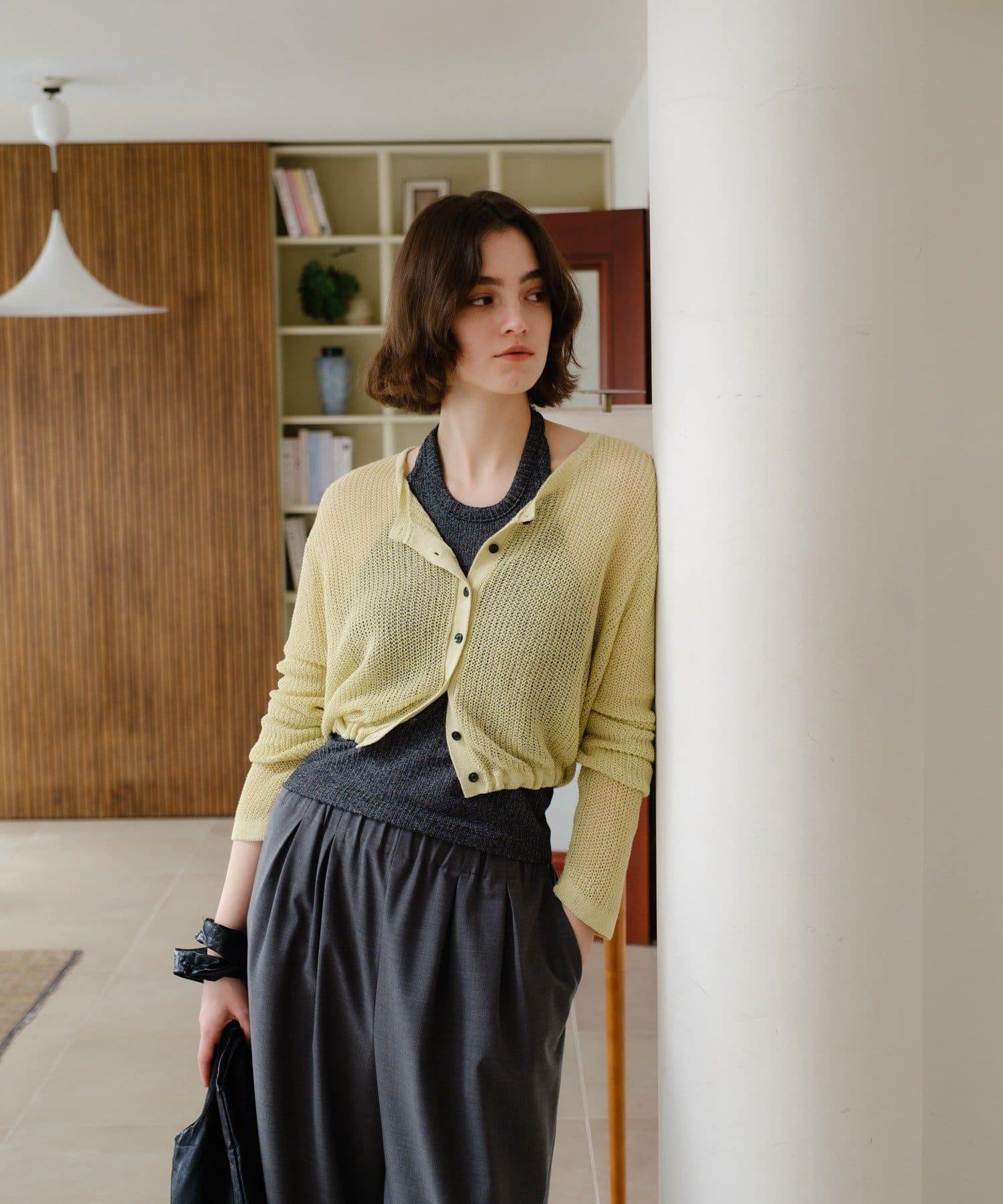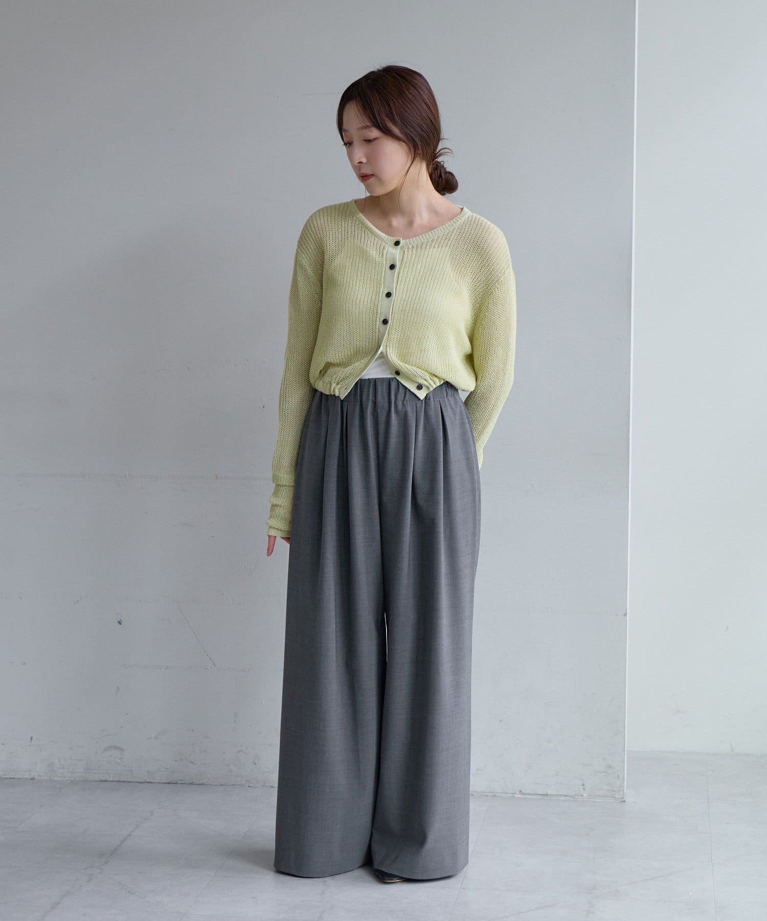 着丈はやや短めのクロップド丈に設定しており、ウエスト位置が高く見え、スタイルアップが叶います。前後逆にしてボレロのように着るアレンジもおすすめです。
