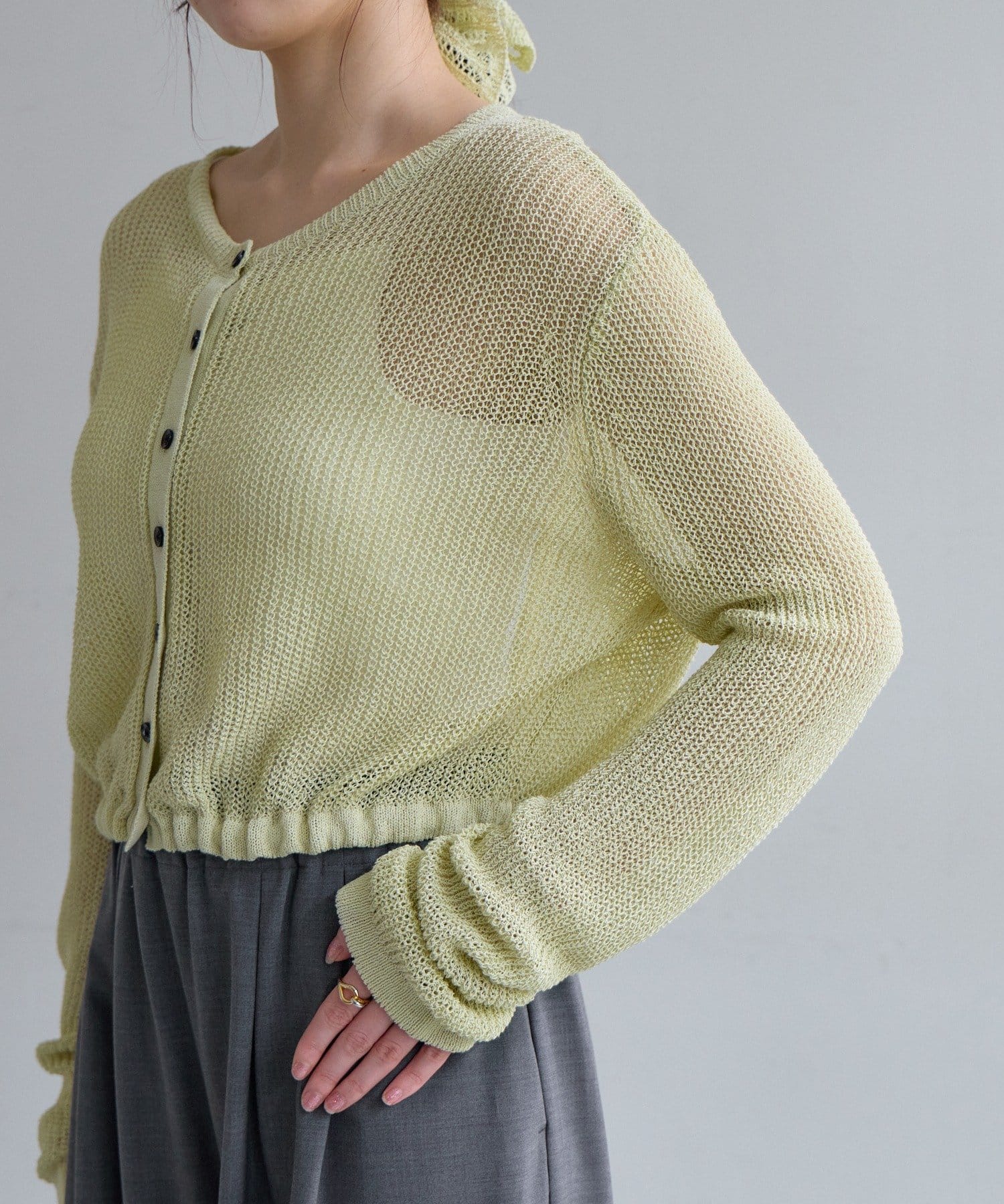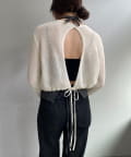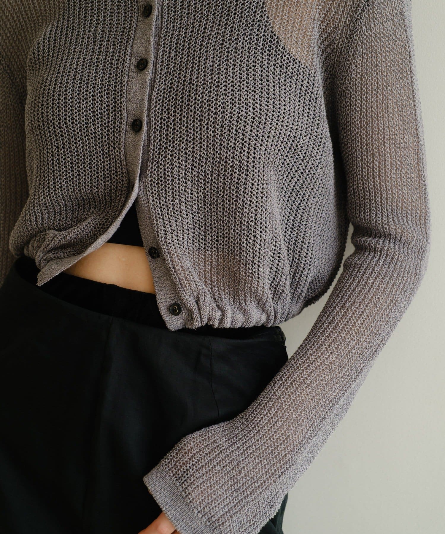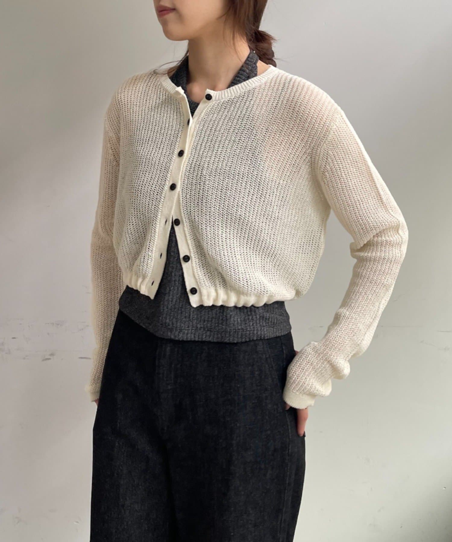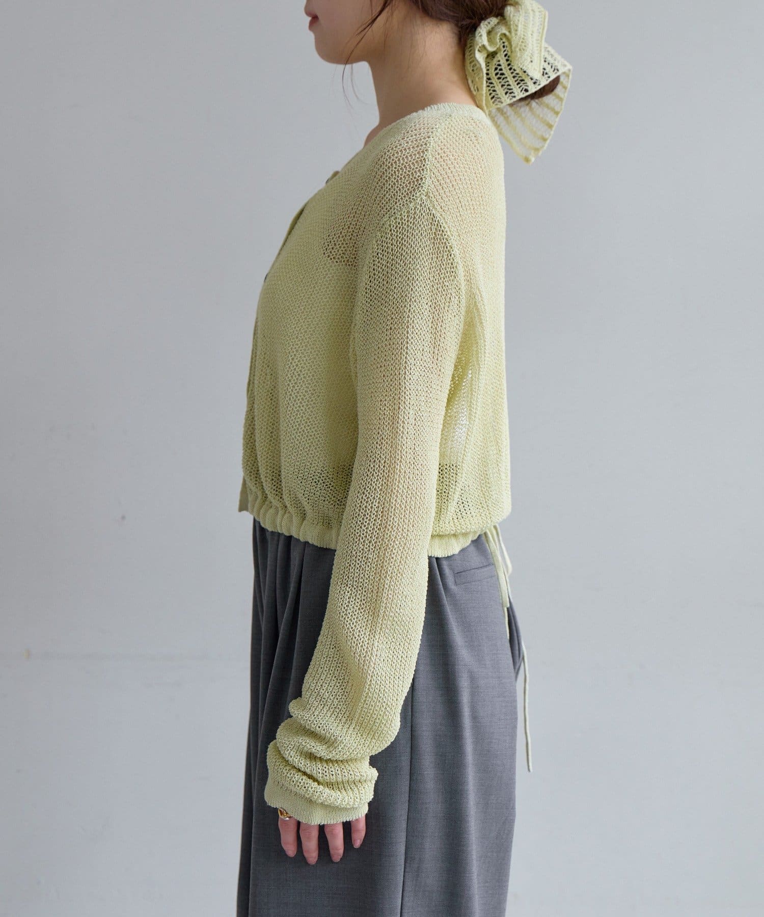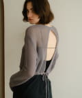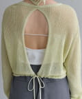背中が大きく開いたデザインが目を引く、シアーのサマーニットカーディガン。シャリ感があるペーパーヤーンを使用しており、夏も肌離れが良く、涼しく着用いただけます。裾にぐるりと紐が内蔵されており、後ろで紐を絞って裾にギャザーを寄せられる仕様です。