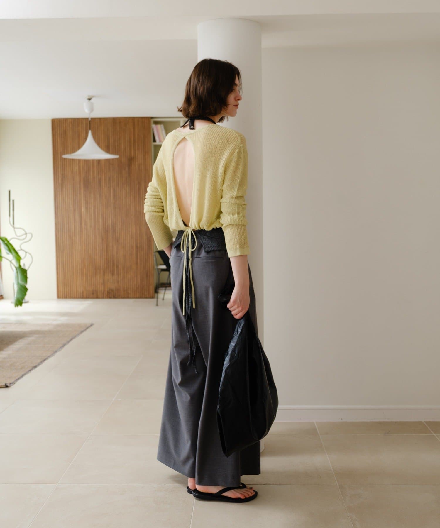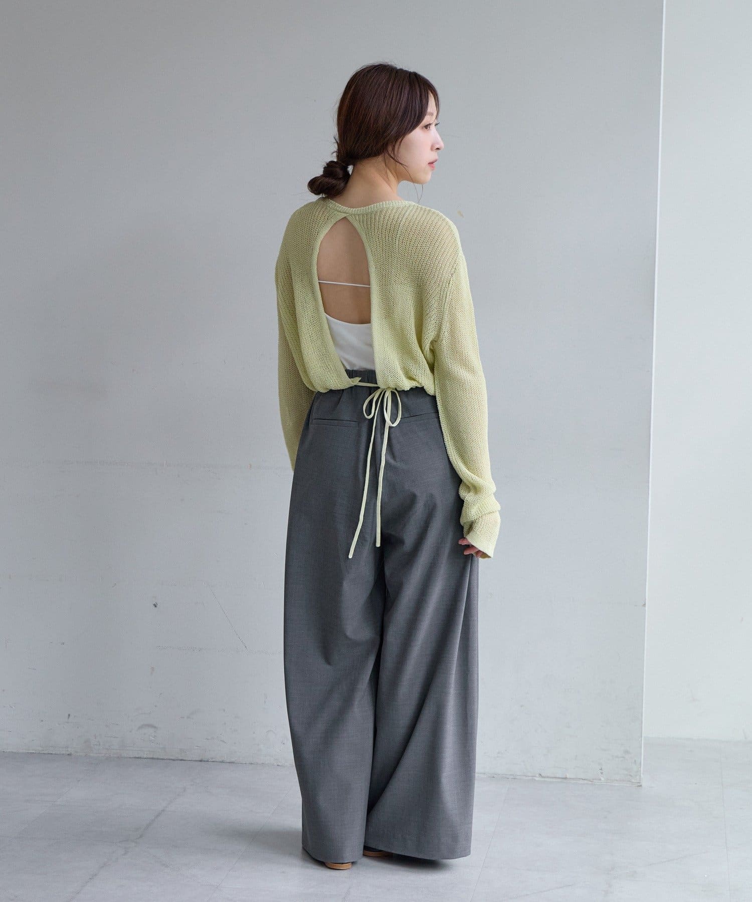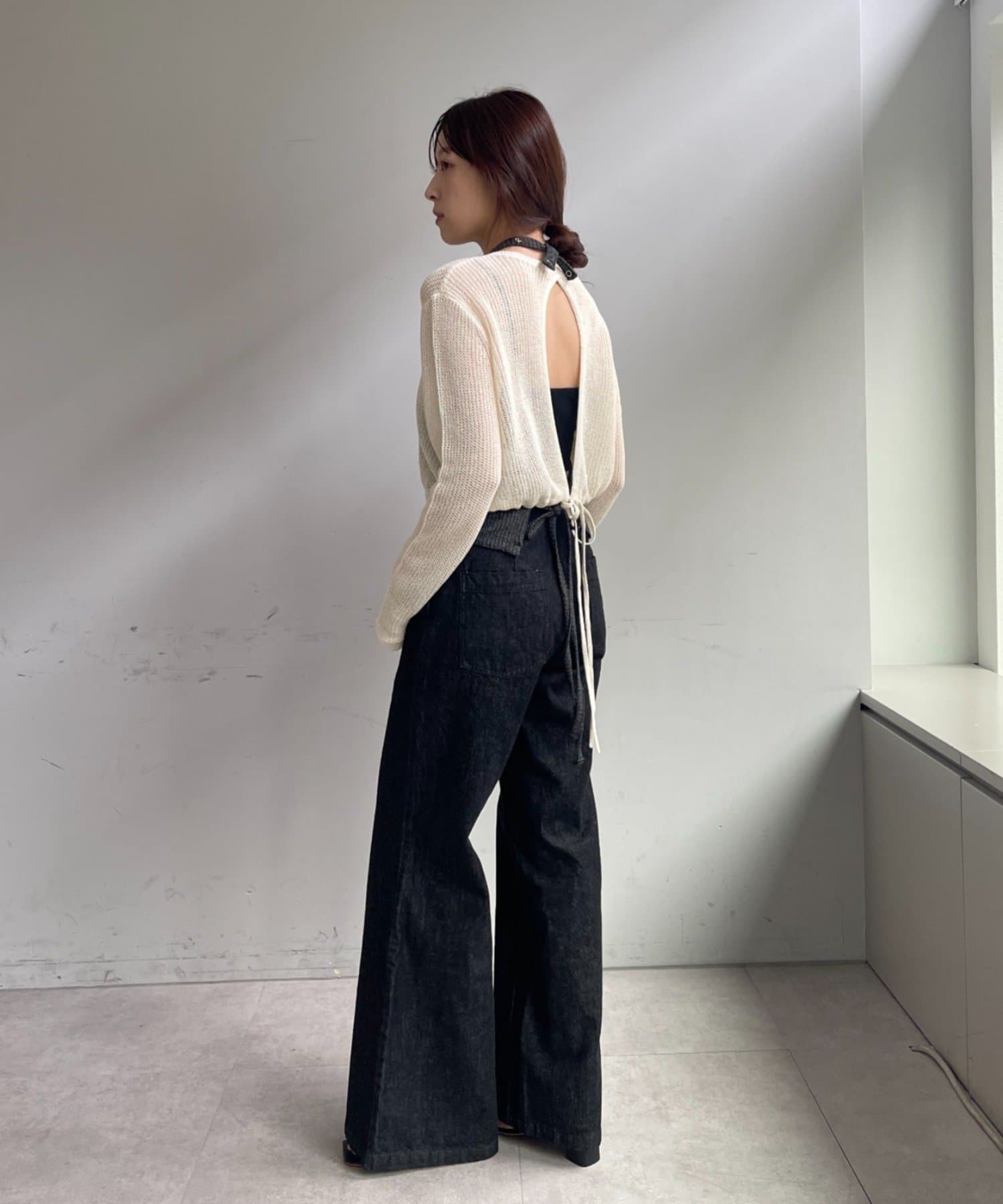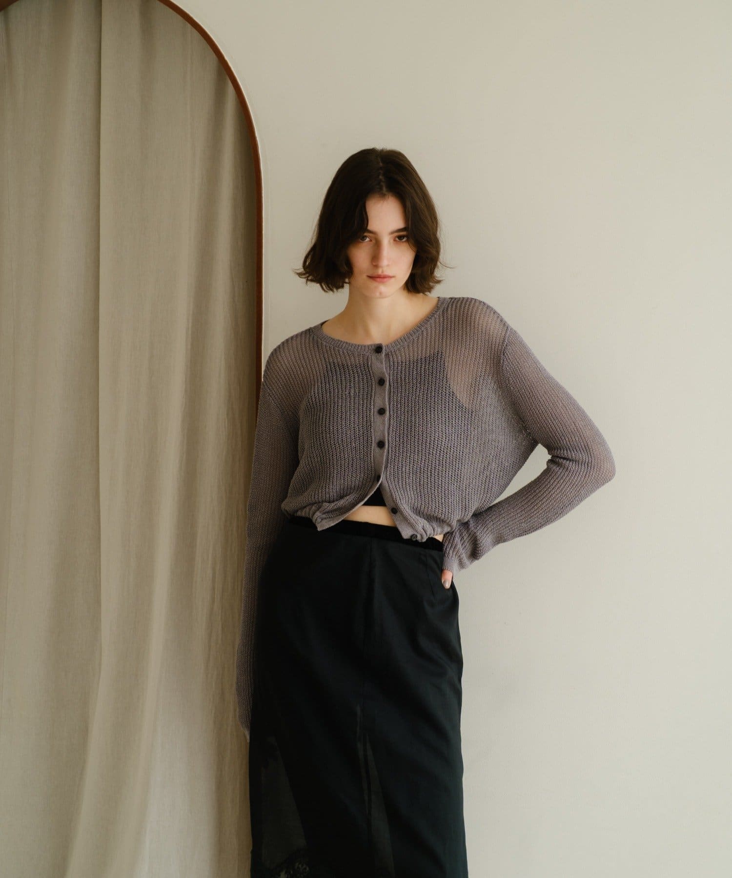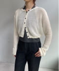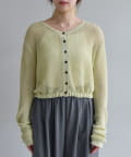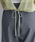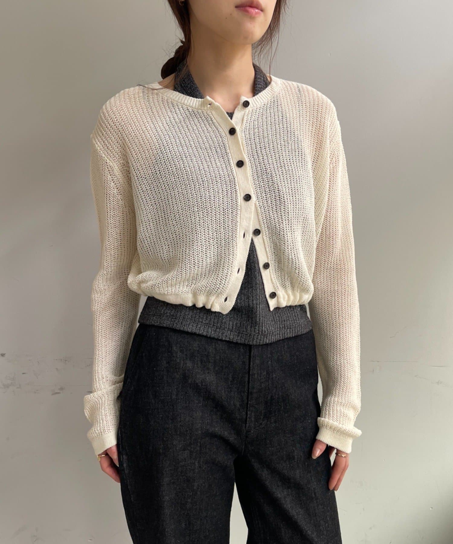 背中が大きく開いたデザインが目を引く、シアーのサマーニットカーディガン。シャリ感があるペーパーヤーンを使用しており、夏も肌離れが良く、涼しく着用いただけます。裾にぐるりと紐が内蔵されており、後ろで紐を絞って裾にギャザーを寄せられる仕様です。