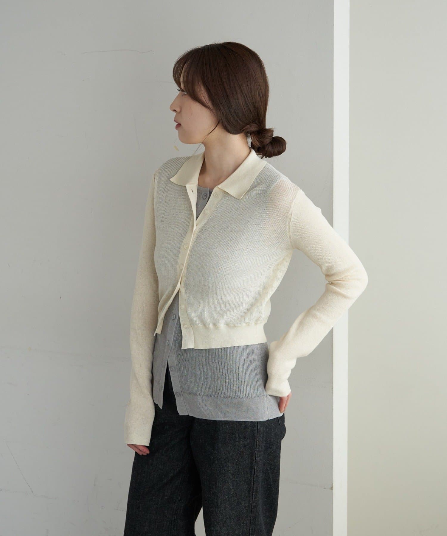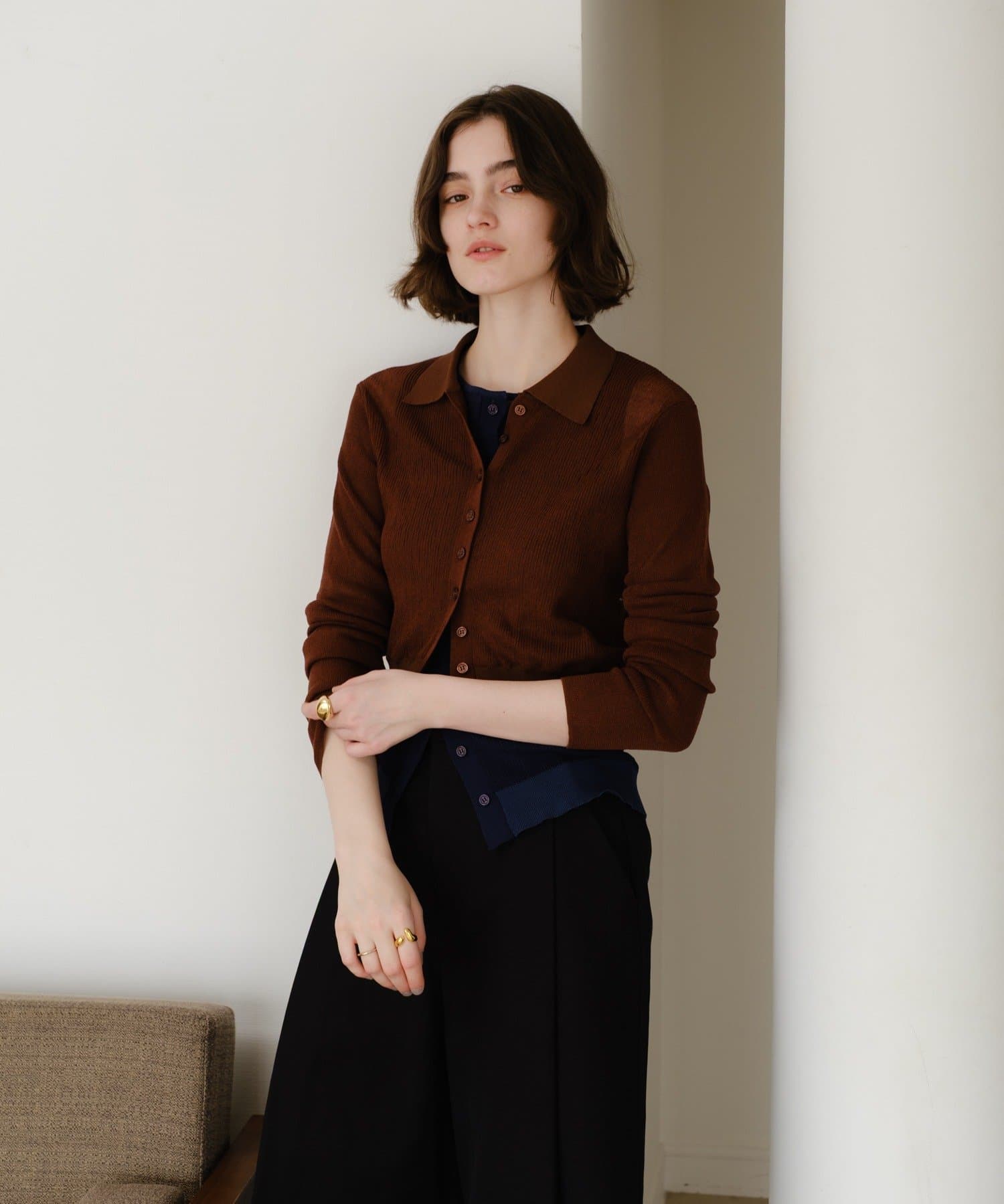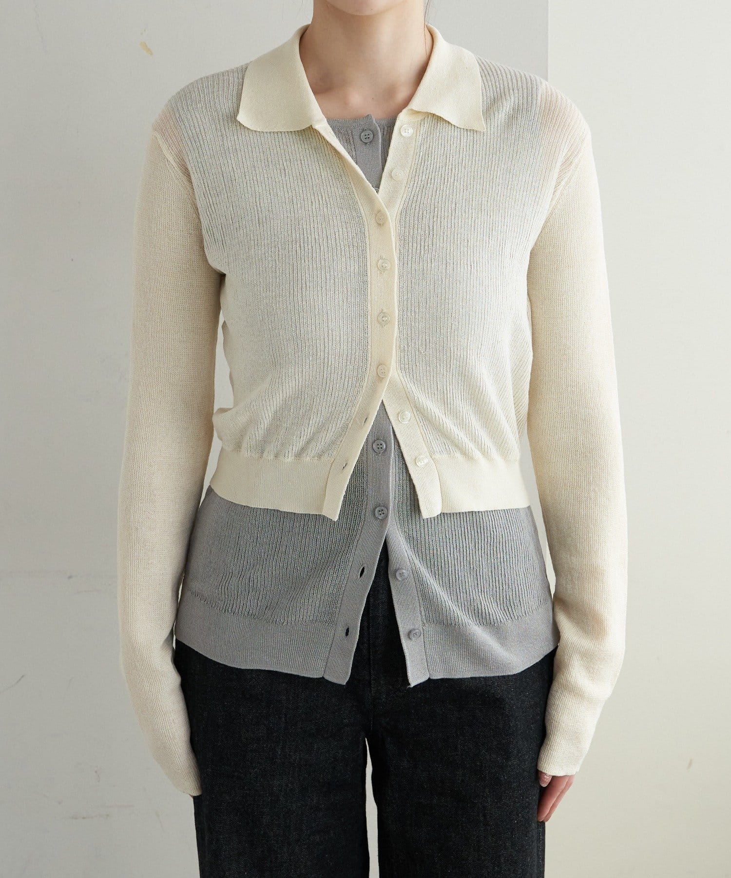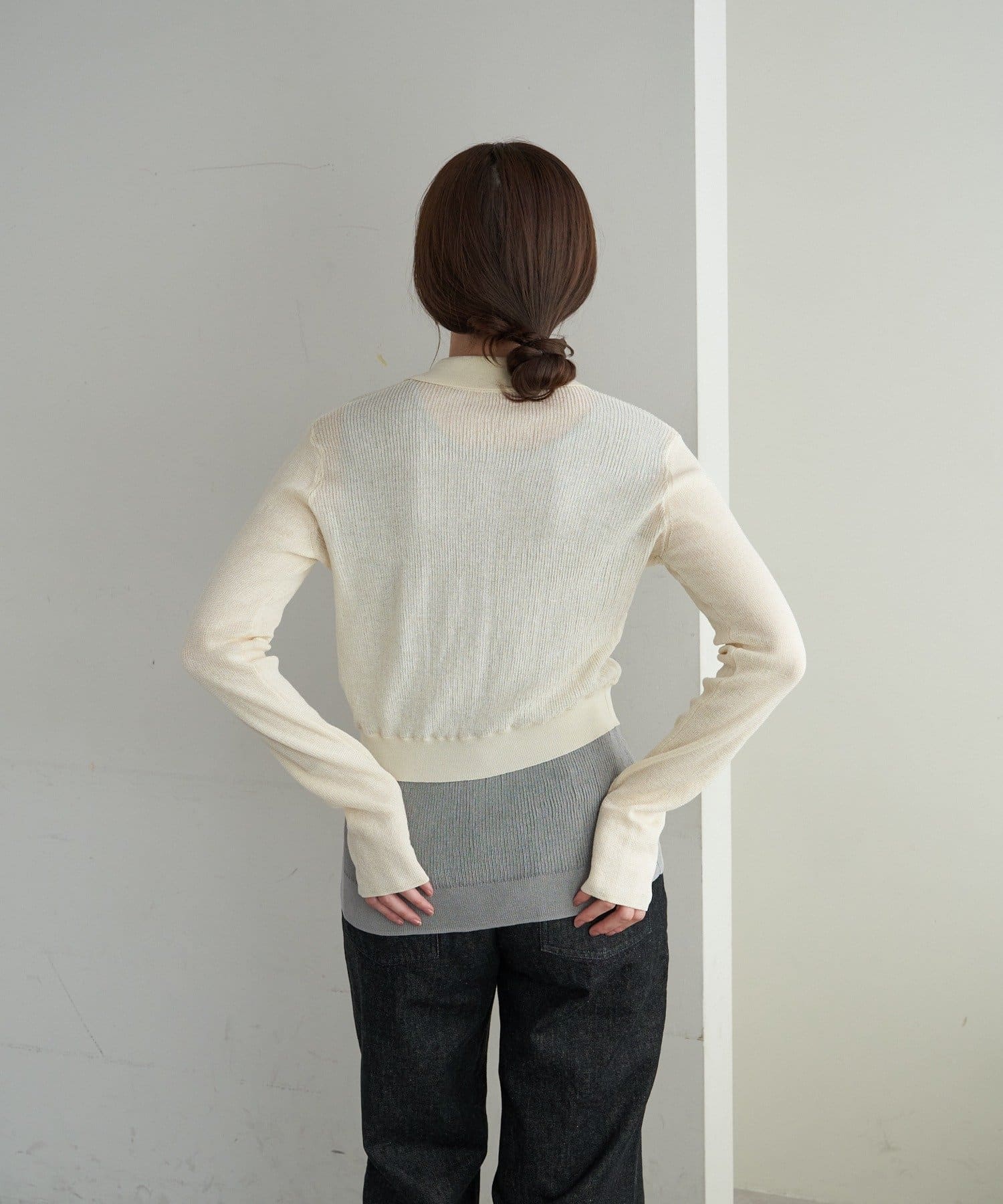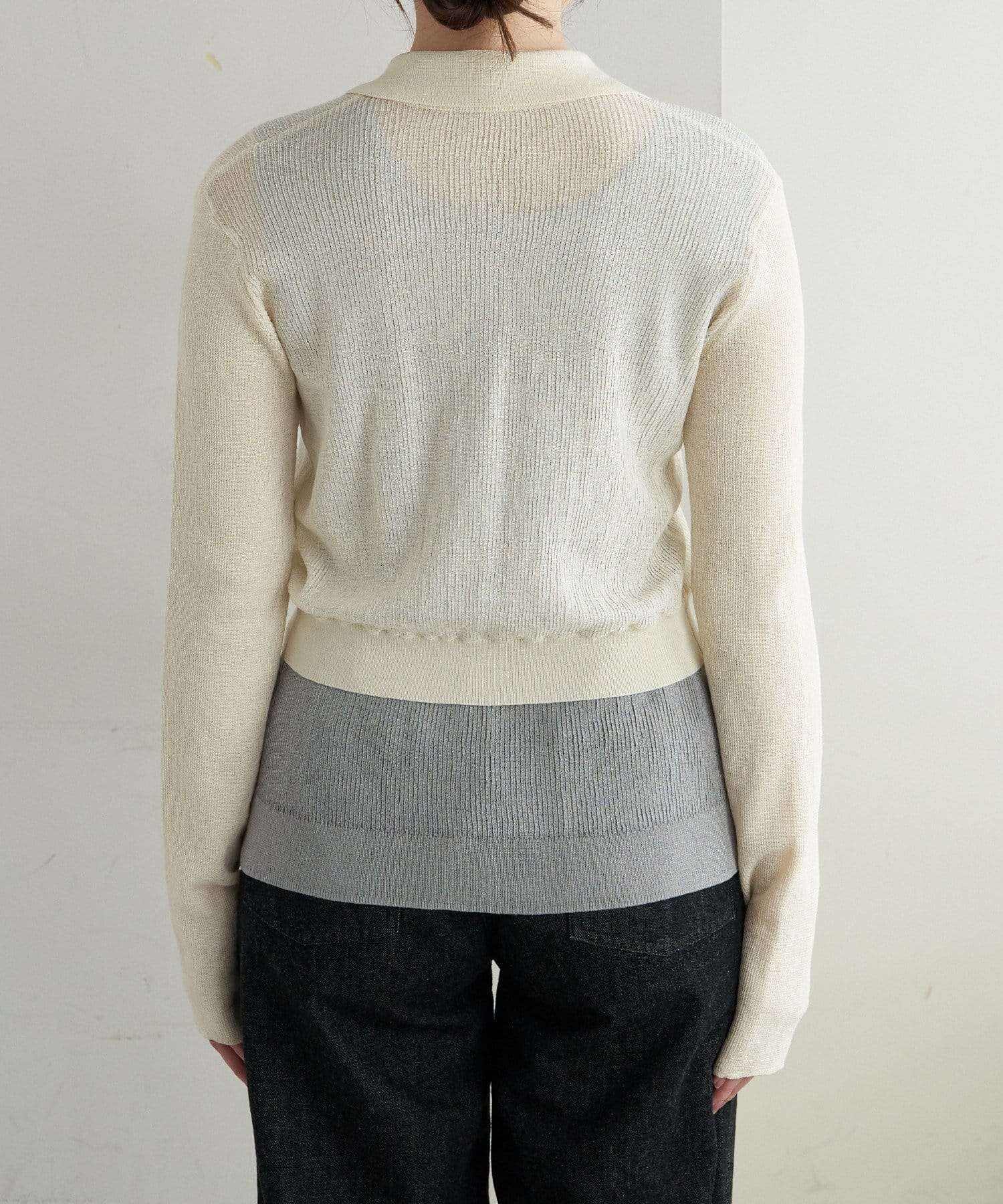 襟付きのシアーリブニットと配色のタンクトップの贅沢なレイヤード用2ピースSET。シャリ感のあるレーヨン、ナイロンの糸を使用しており、程よく透け感があるので夏も涼しく着用いただけるサマーニットです。