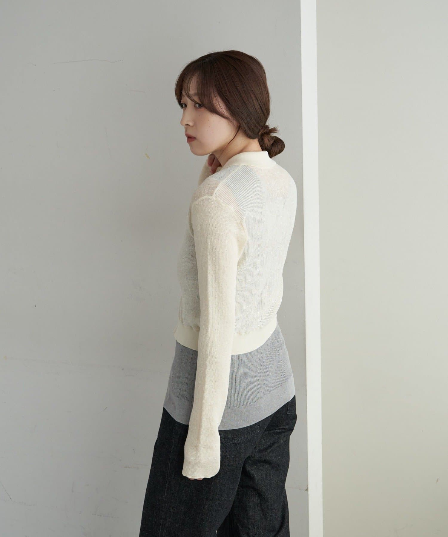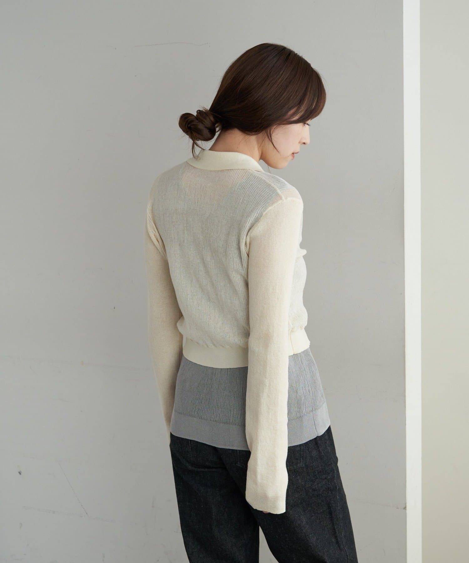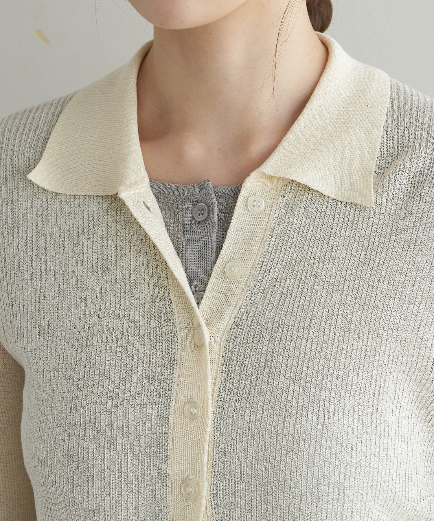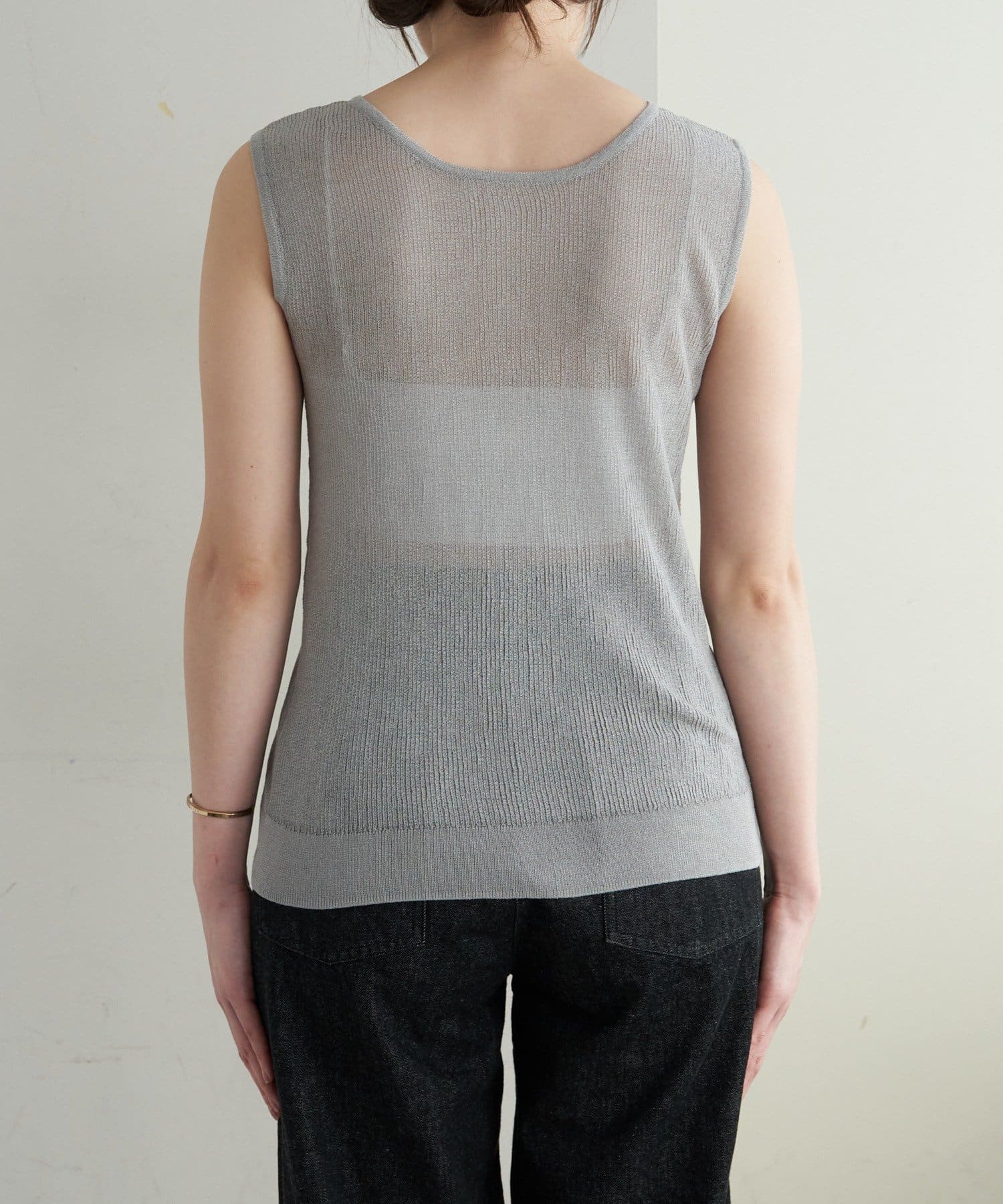 襟付きのシアーリブニットと配色のタンクトップの贅沢なレイヤード用2ピースSET。シャリ感のあるレーヨン、ナイロンの糸を使用しており、程よく透け感があるので夏も涼しく着用いただけるサマーニットです。