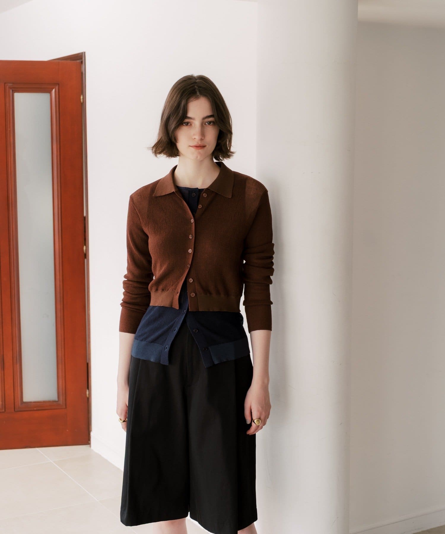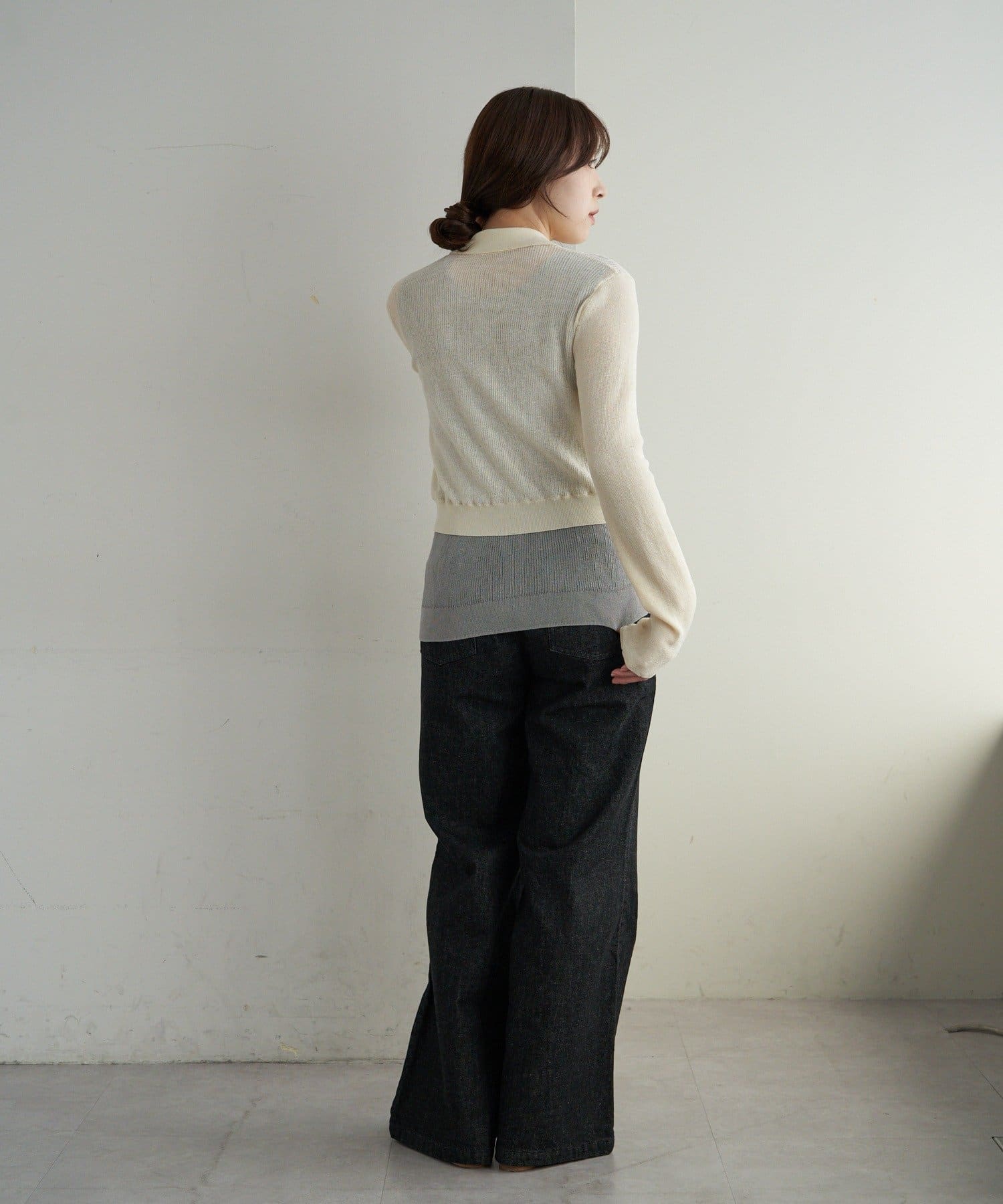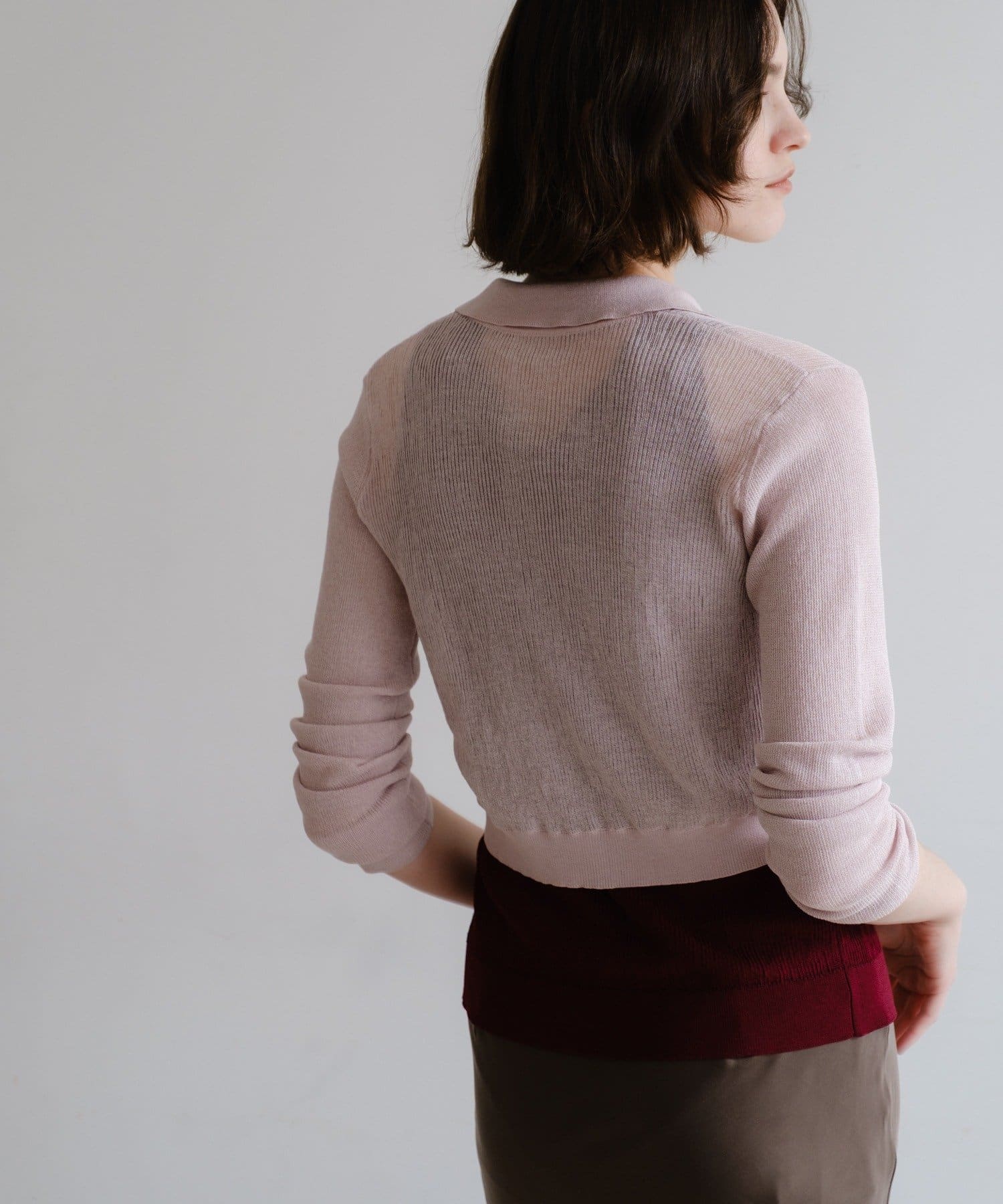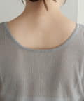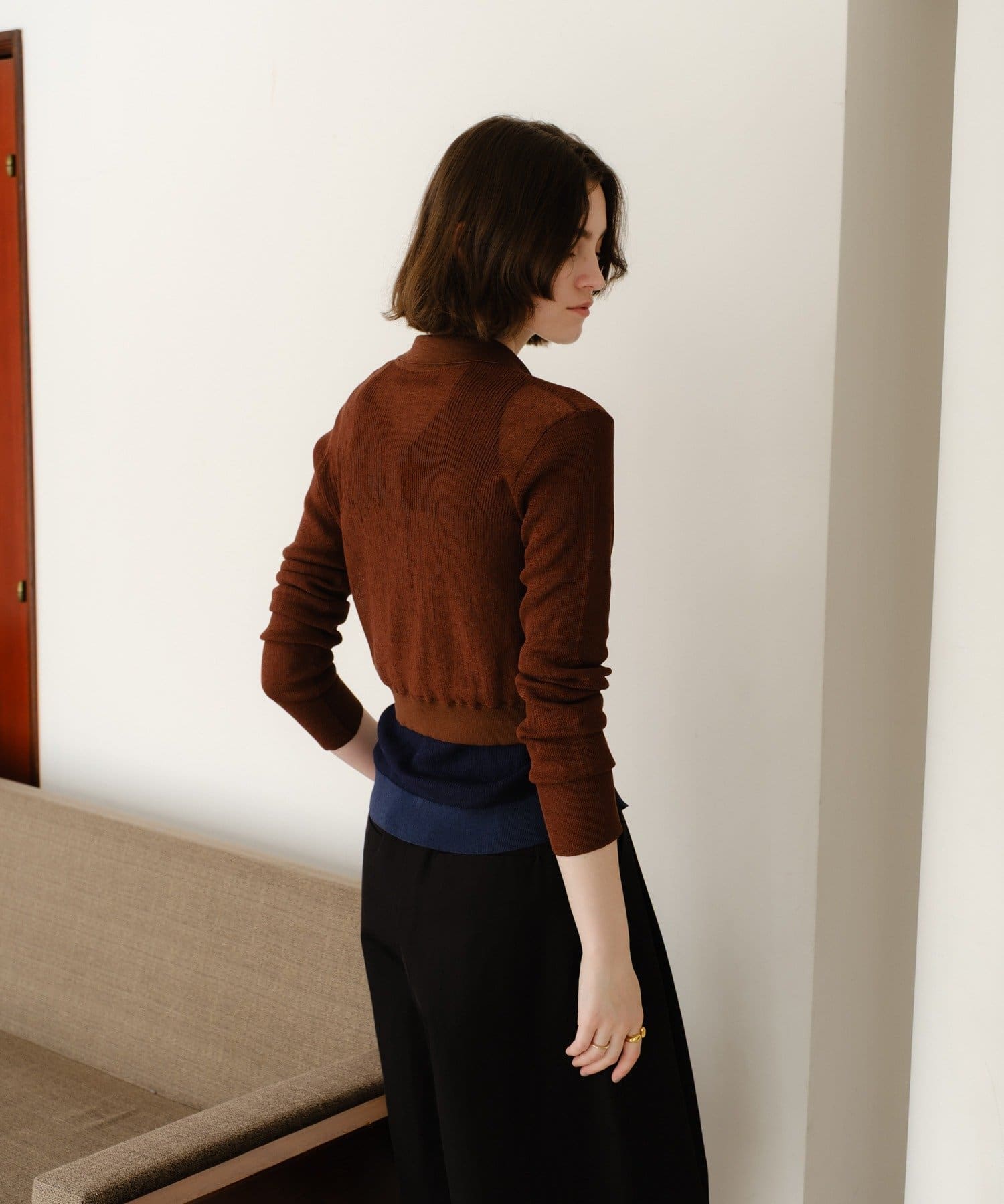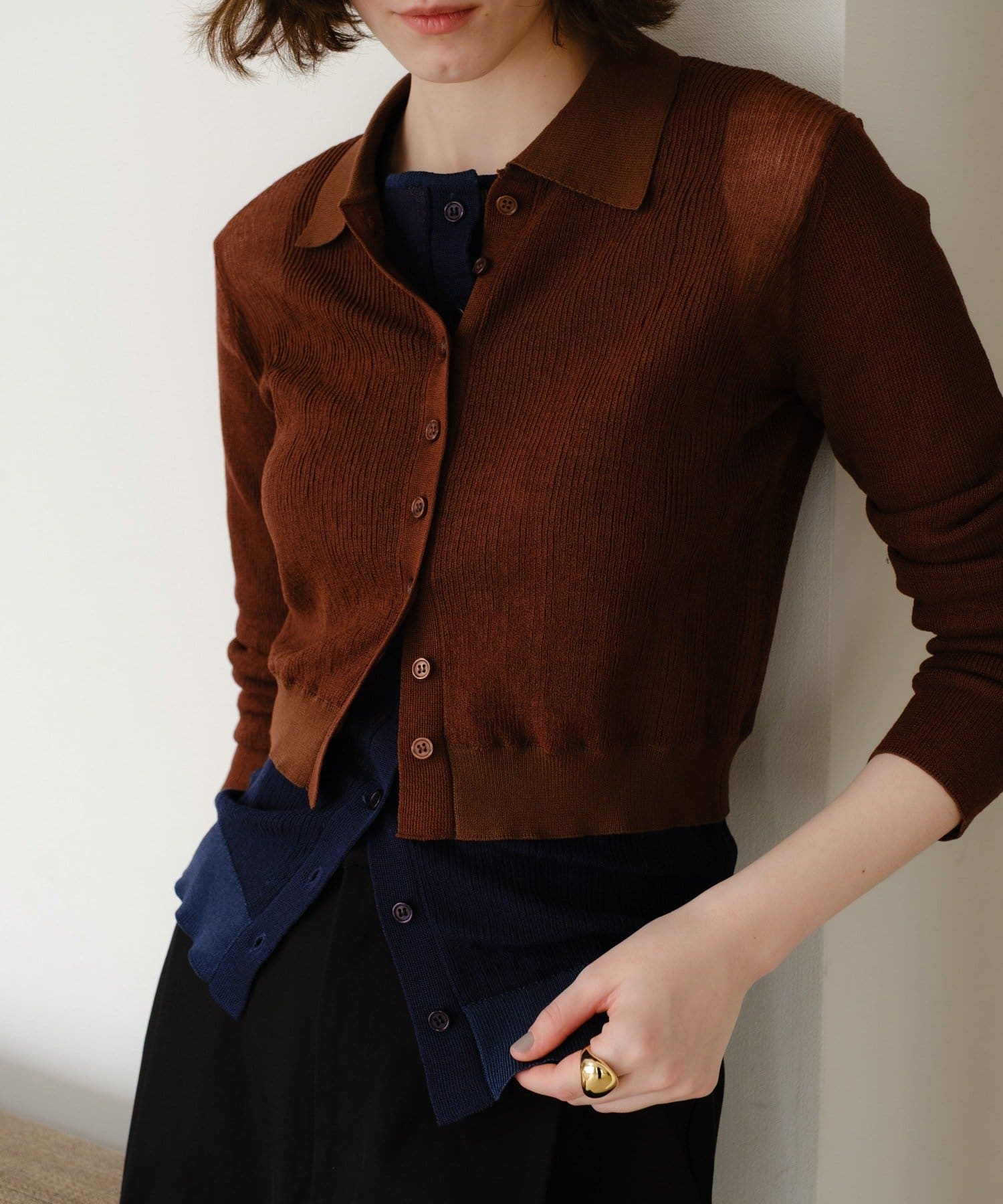 襟付きのシアーリブニットと配色のタンクトップの贅沢なレイヤード用2ピースSET。シャリ感のあるレーヨン、ナイロンの糸を使用しており、程よく透け感があるので夏も涼しく着用いただけるサマーニットです。
