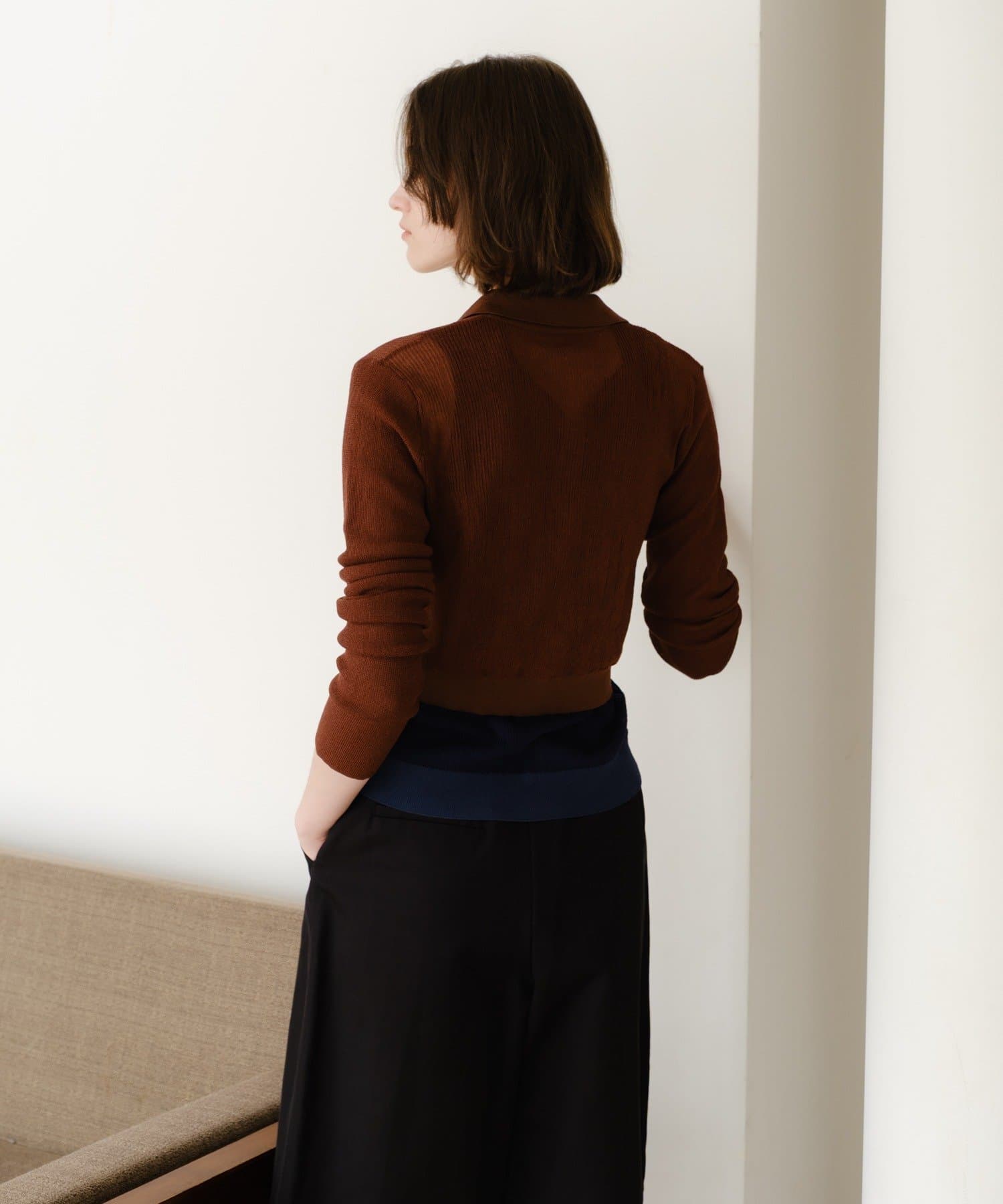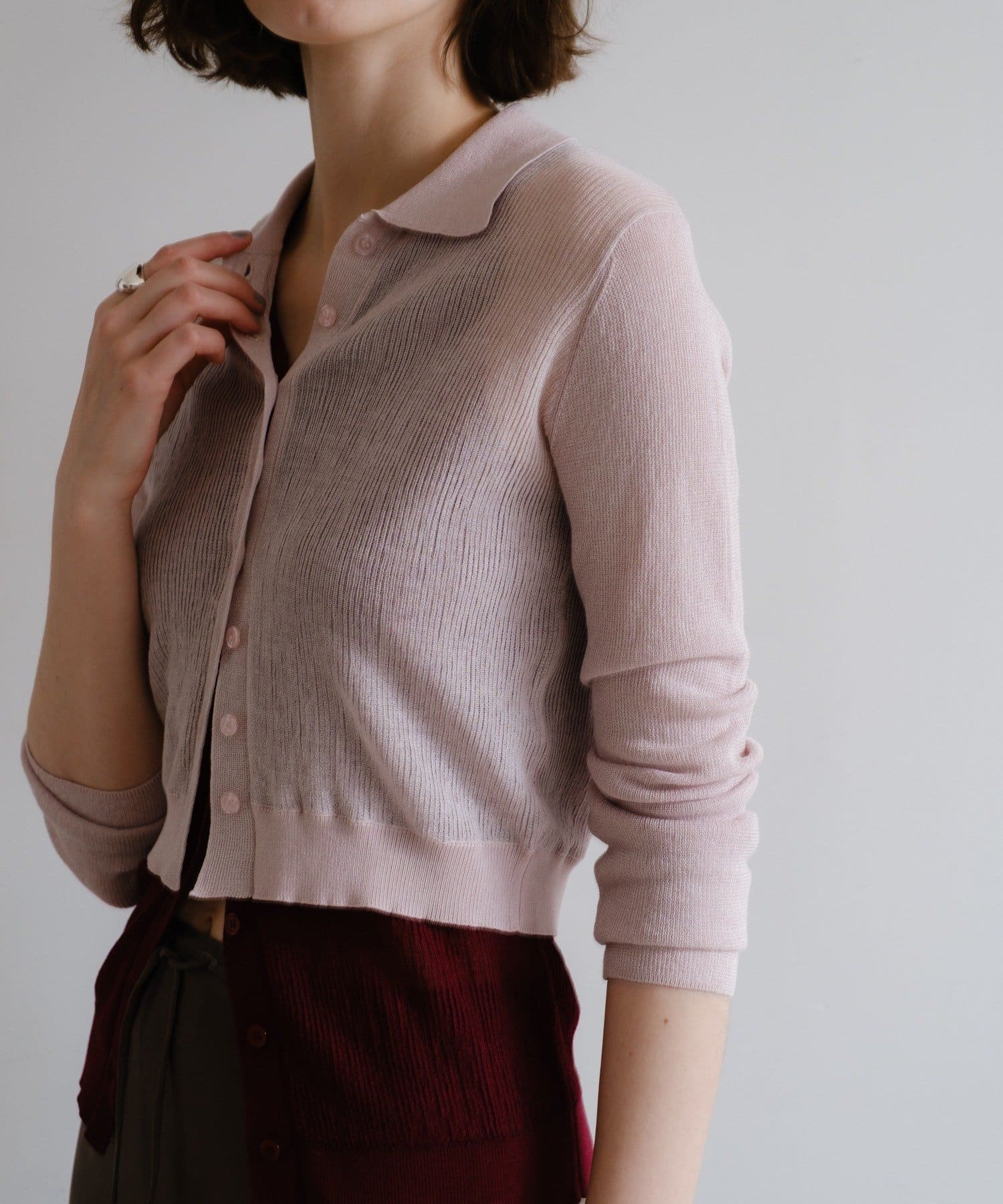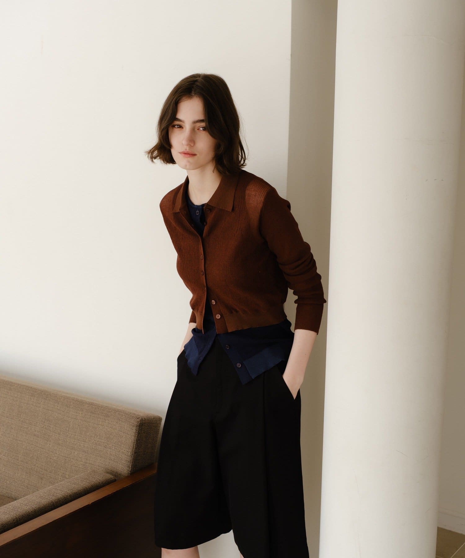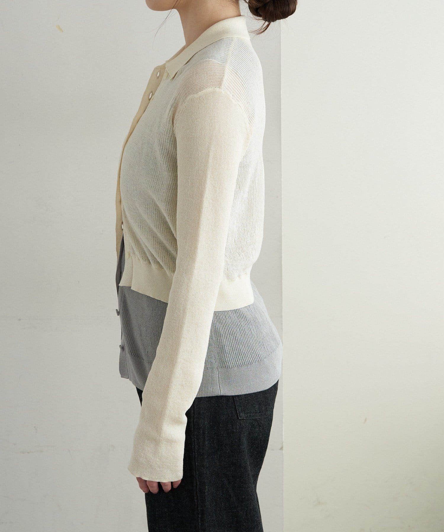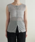 襟付きのシアーリブニットと配色のタンクトップの贅沢なレイヤード用2ピースSET。シャリ感のあるレーヨン、ナイロンの糸を使用しており、程よく透け感があるので夏も涼しく着用いただけるサマーニットです。