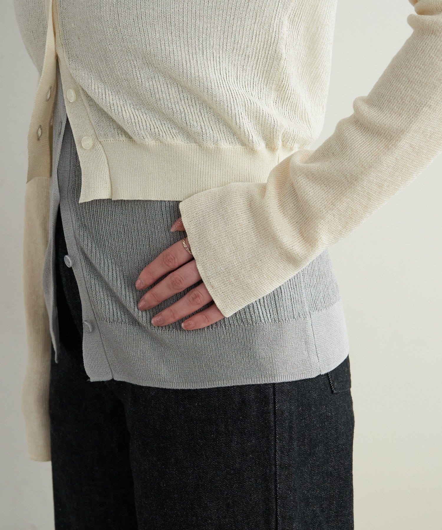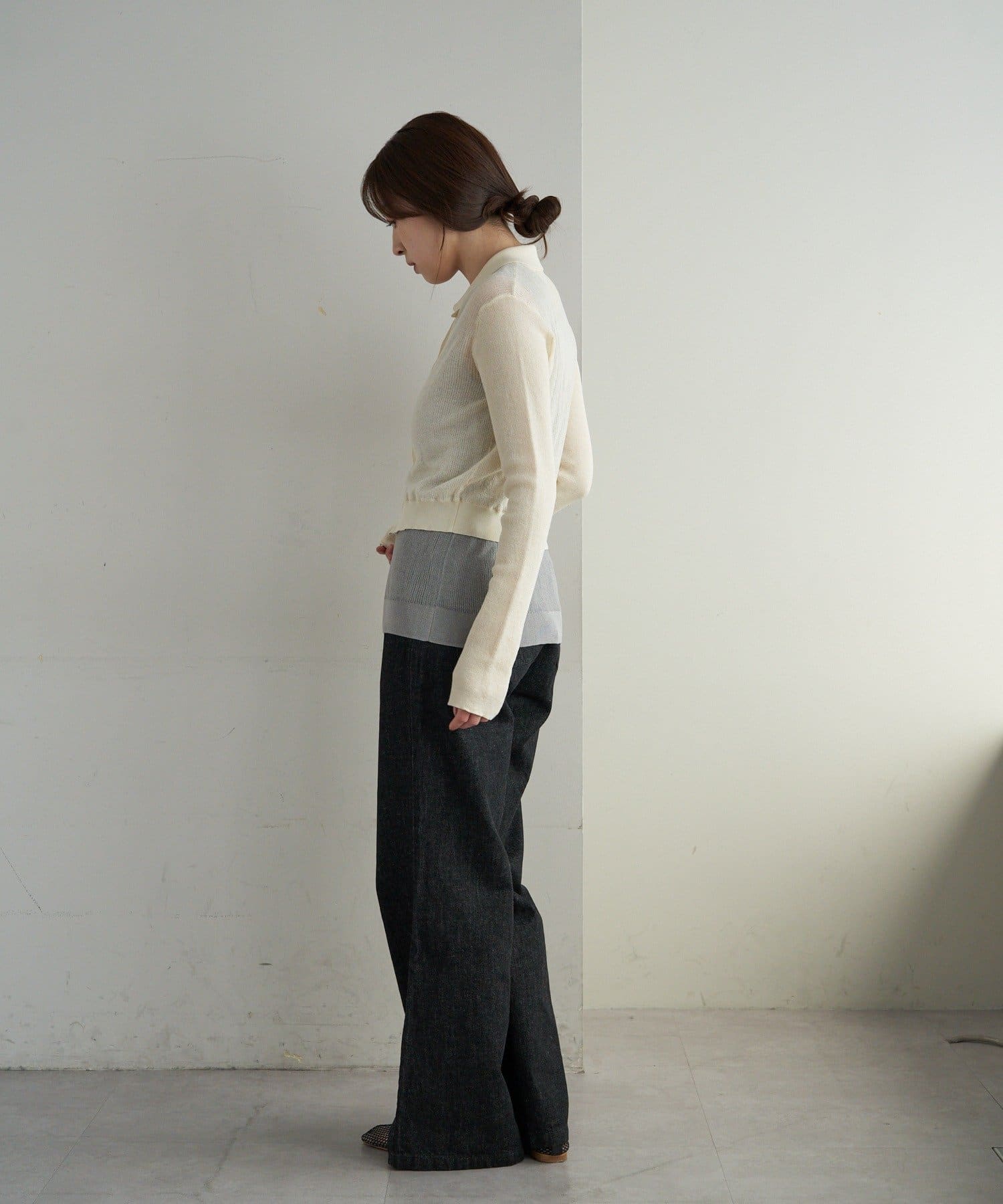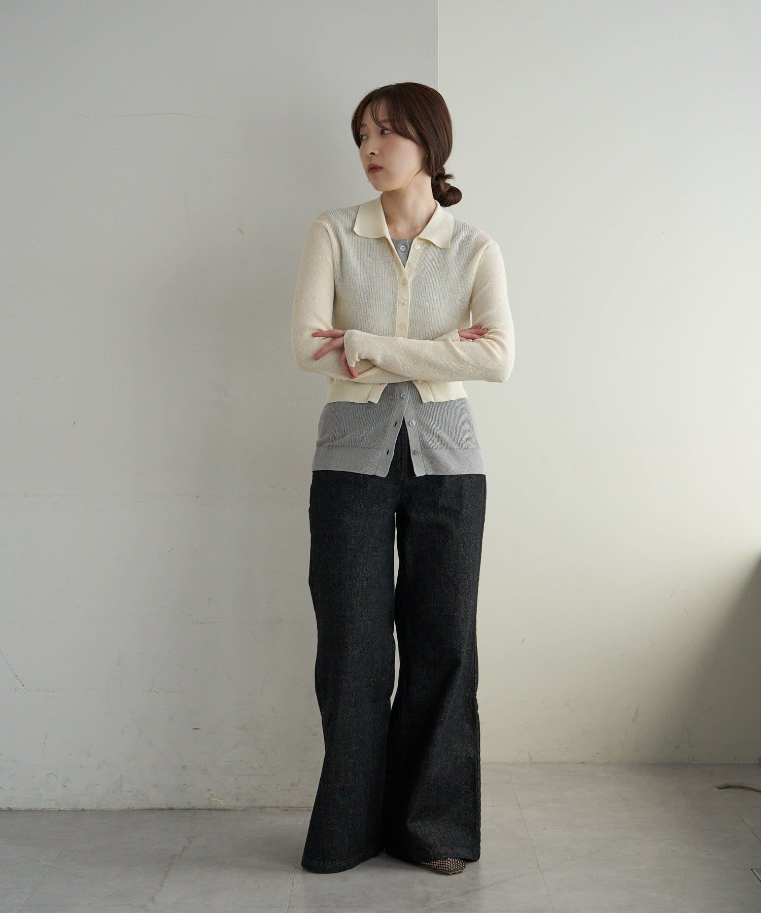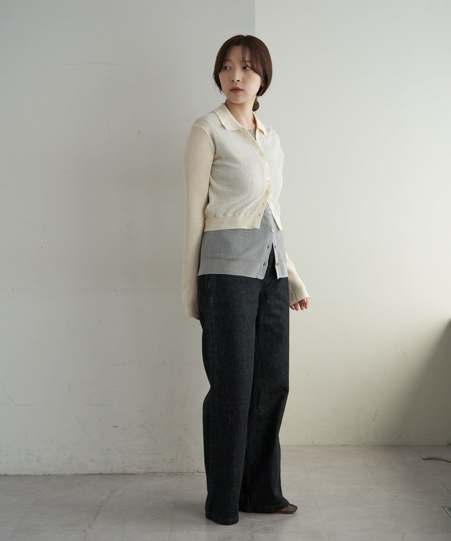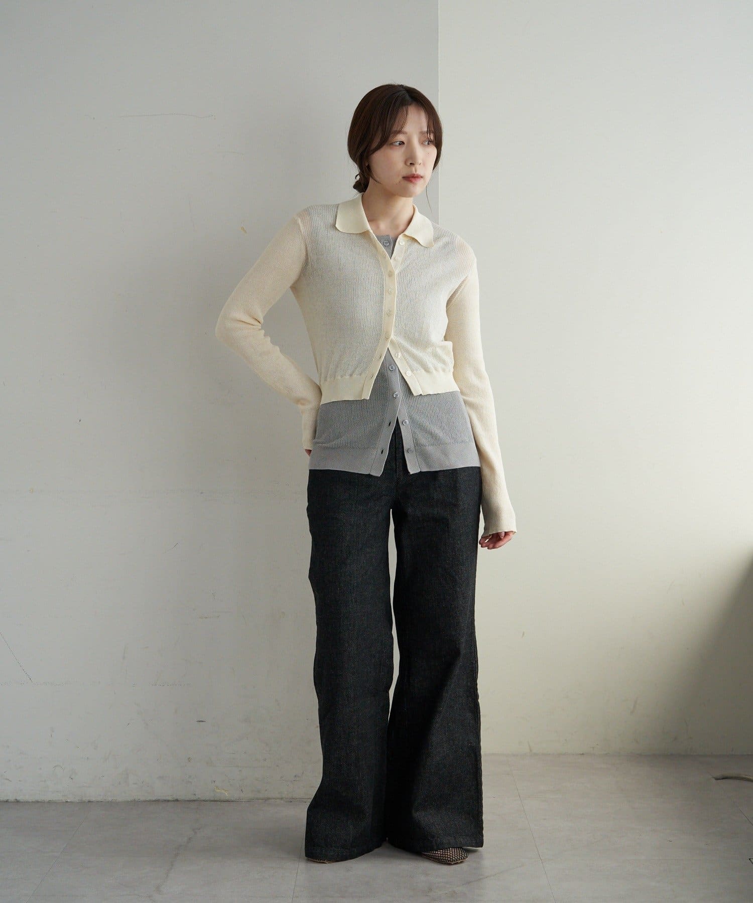 襟付きのシアーリブニットと配色のタンクトップの贅沢なレイヤード用2ピースSET。シャリ感のあるレーヨン、ナイロンの糸を使用しており、程よく透け感があるので夏も涼しく着用いただけるサマーニットです。