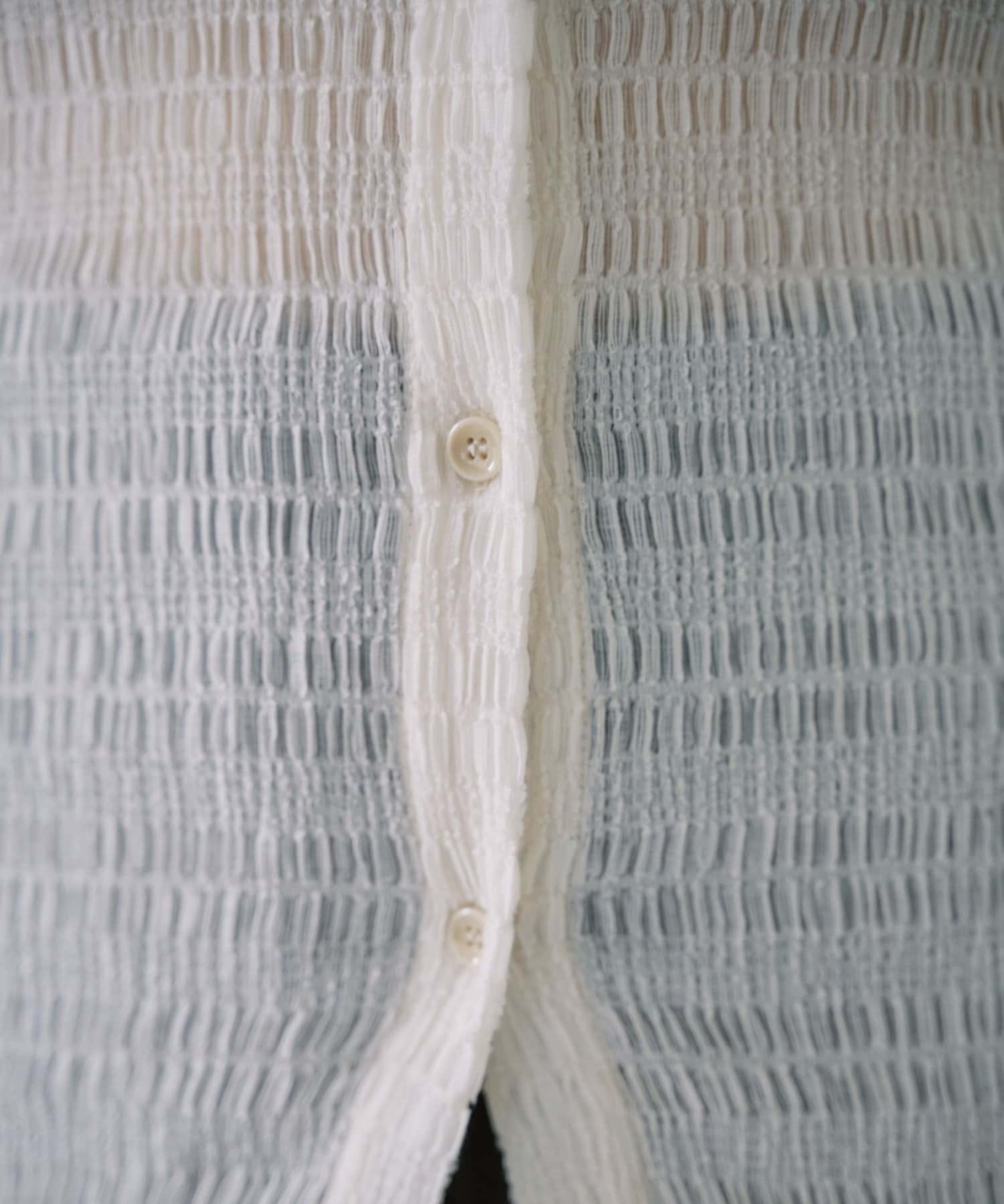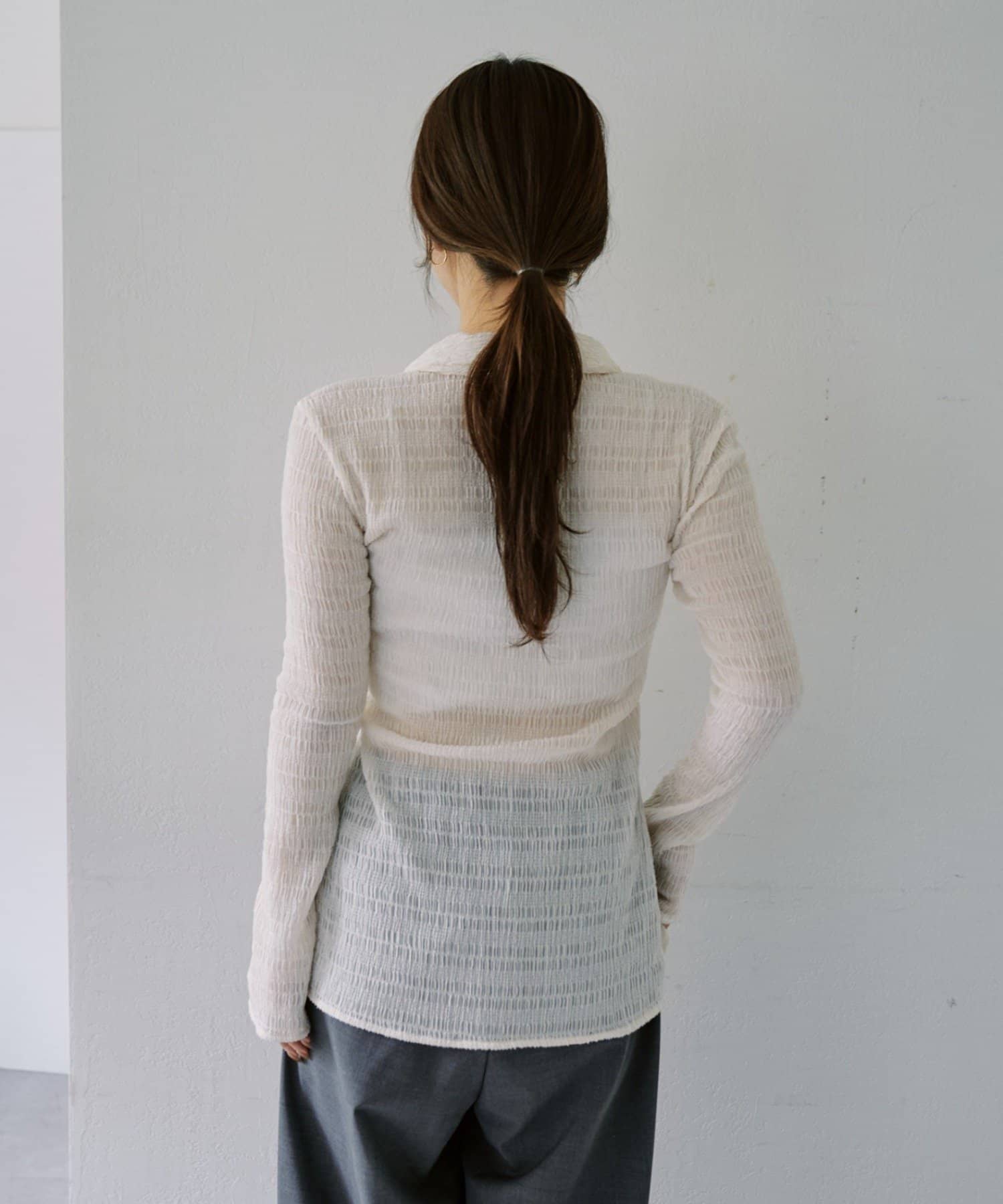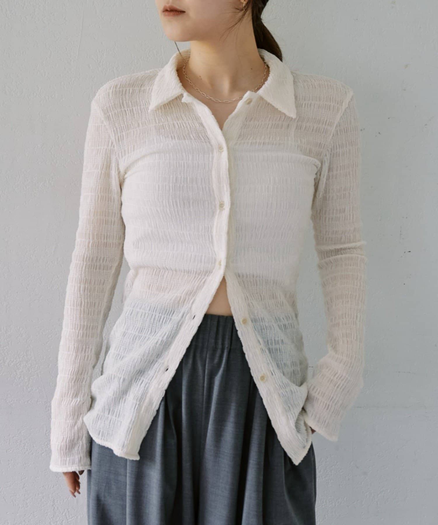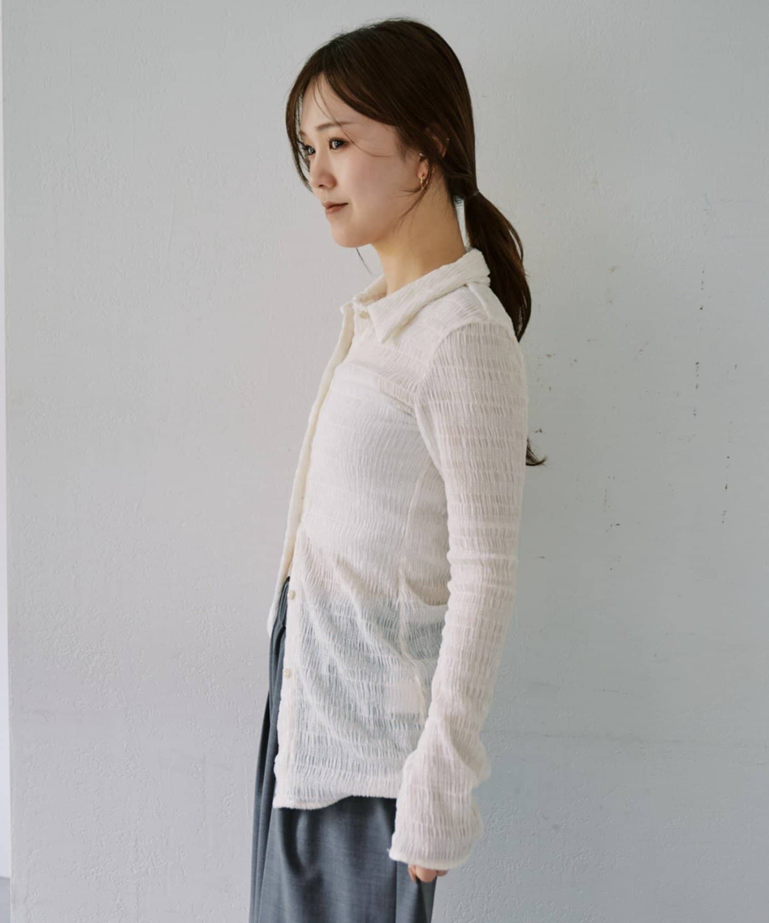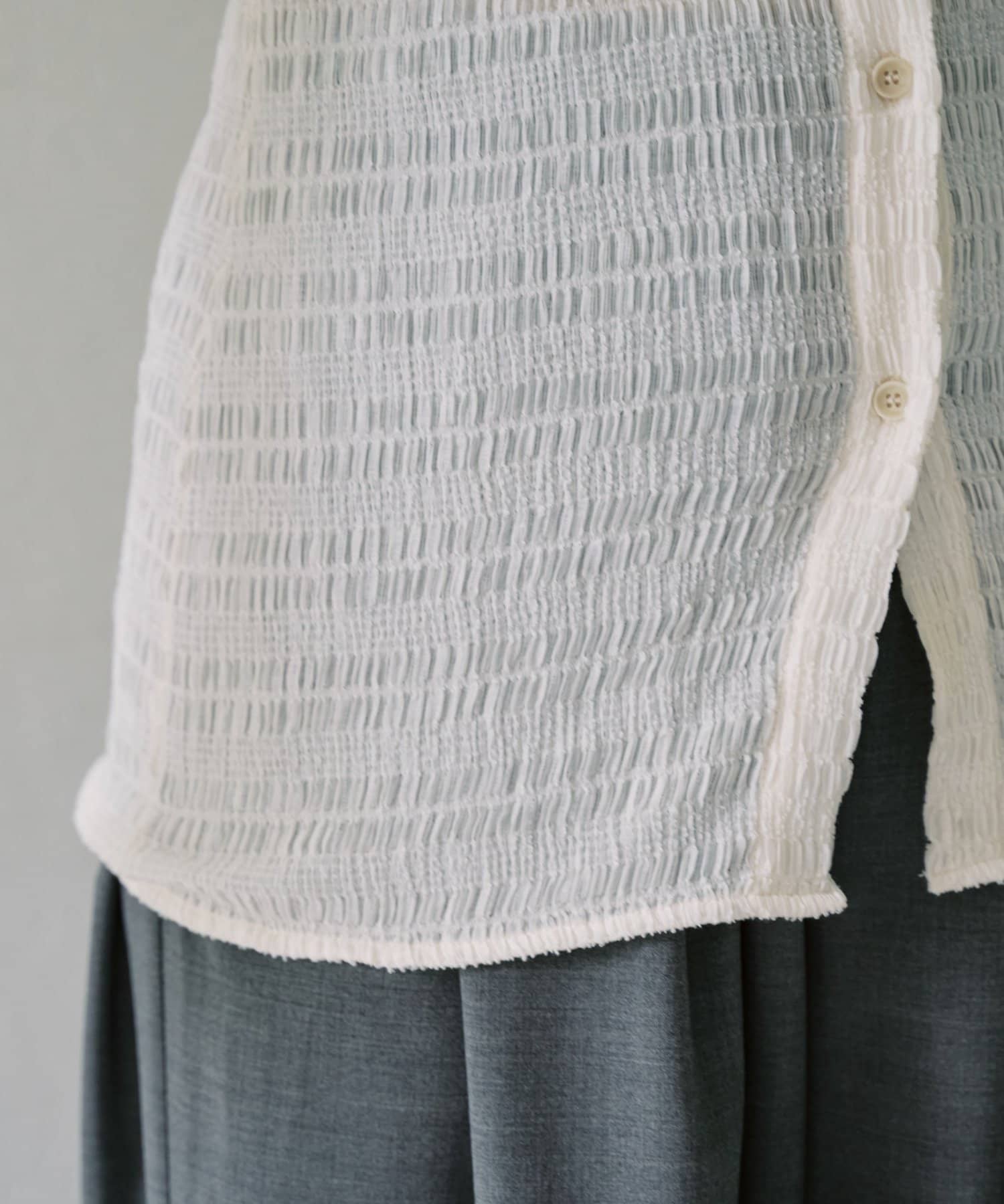 夏の重ね着用の万能シャツが登場。透け感と表面感がキャッチーなシアーシャーリングの生地を、今年らしくコンパクトなシャツ型トップスに仕立てました。生地は特殊な編み機を使用してシャーリング加工を施しており、心地よいストレッチ性と鮮度ある表情感を表現しています。また、環境に配慮したリサイクルポリエステルを原料としており、速乾性、吸汗性、防炎性のある機能性に優れています。