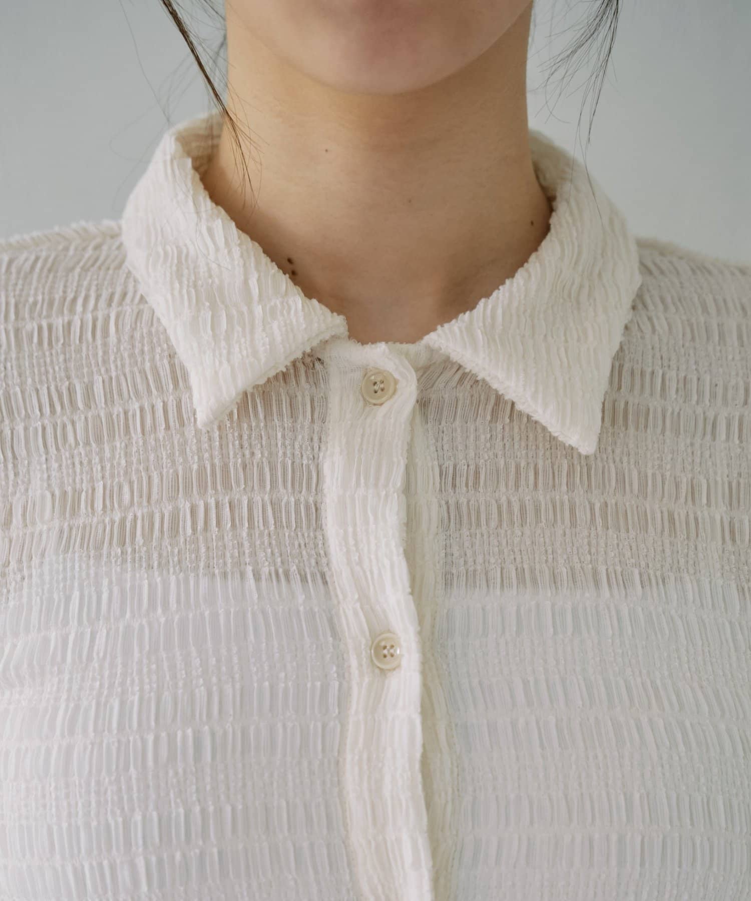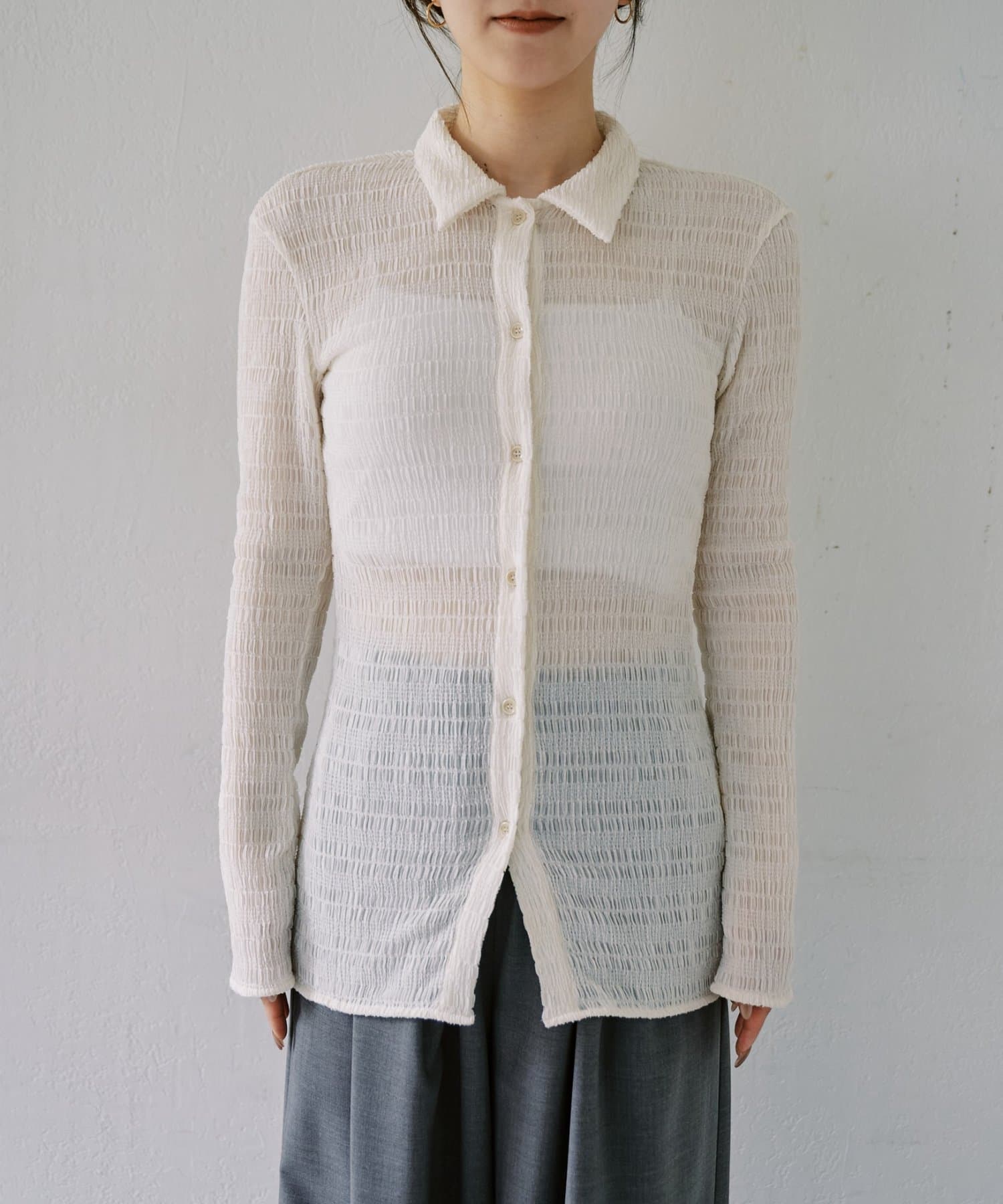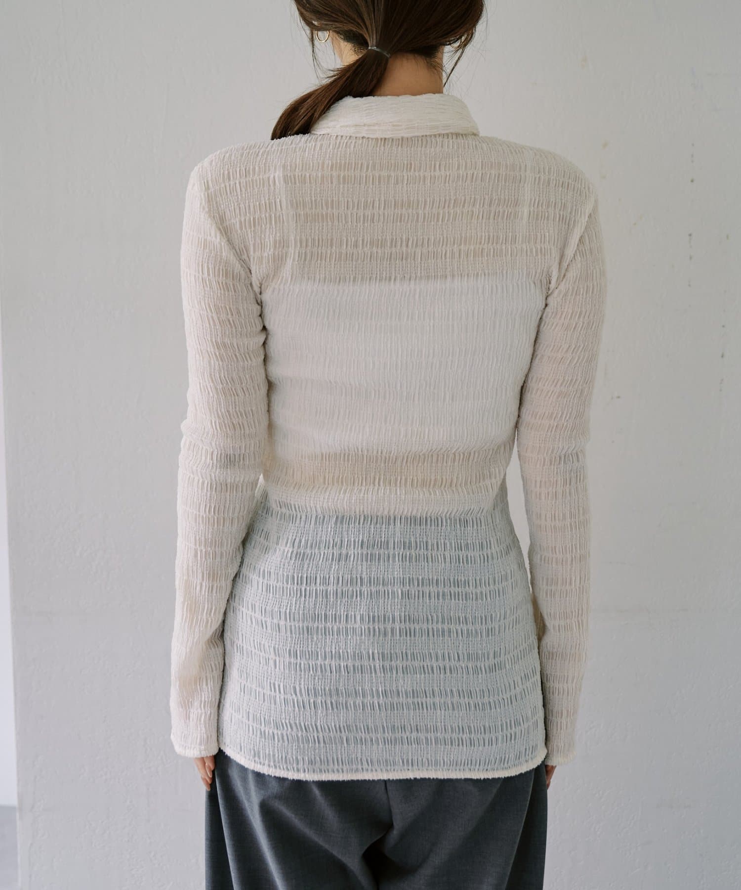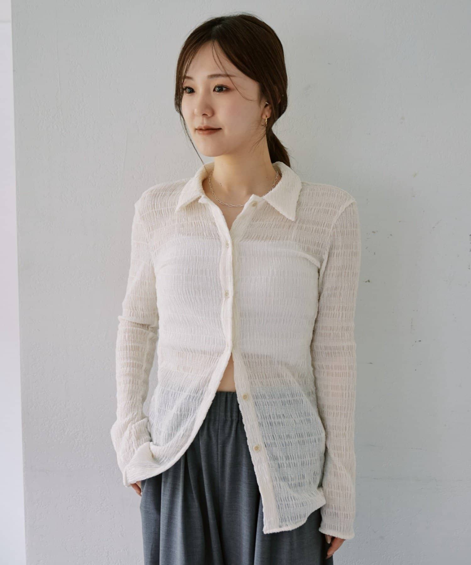 夏の重ね着用の万能シャツが登場。透け感と表面感がキャッチーなシアーシャーリングの生地を、今年らしくコンパクトなシャツ型トップスに仕立てました。生地は特殊な編み機を使用してシャーリング加工を施しており、心地よいストレッチ性と鮮度ある表情感を表現しています。また、環境に配慮したリサイクルポリエステルを原料としており、速乾性、吸汗性、防炎性のある機能性に優れています。