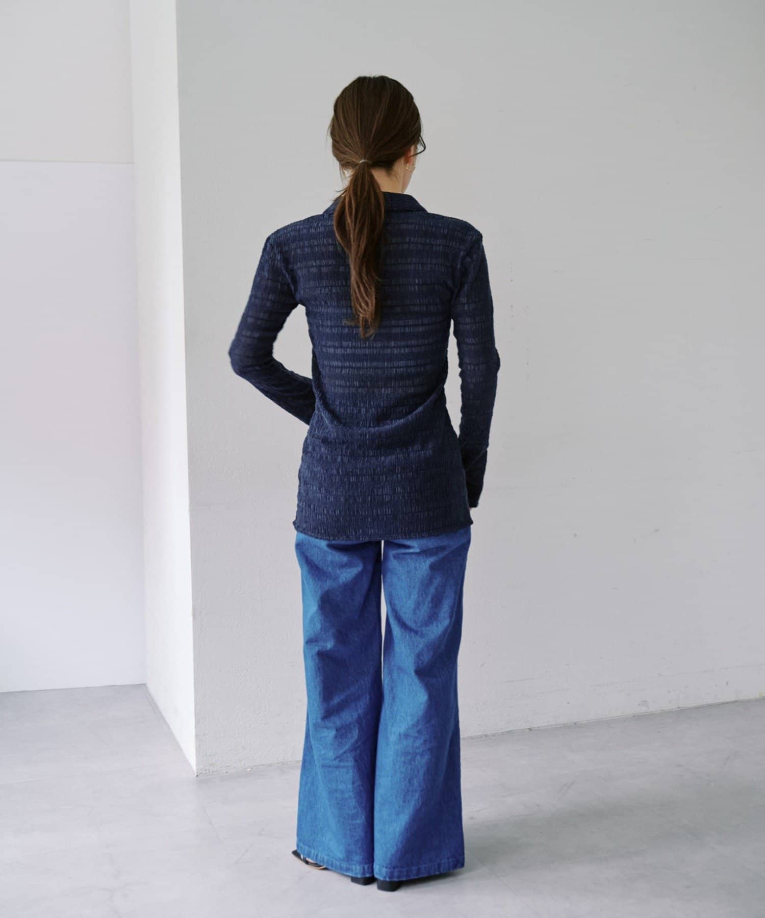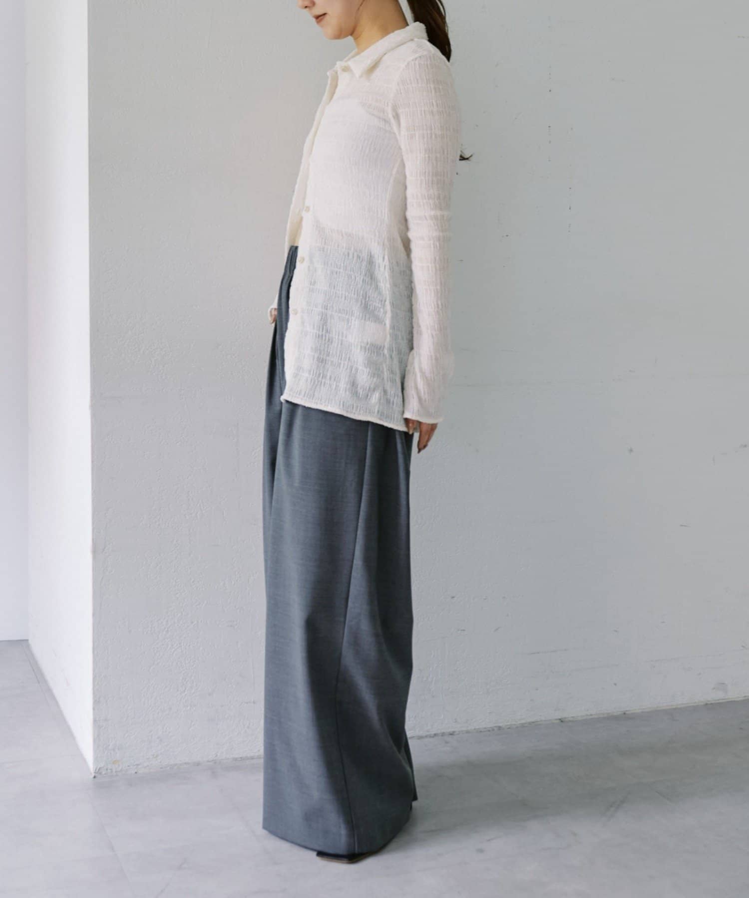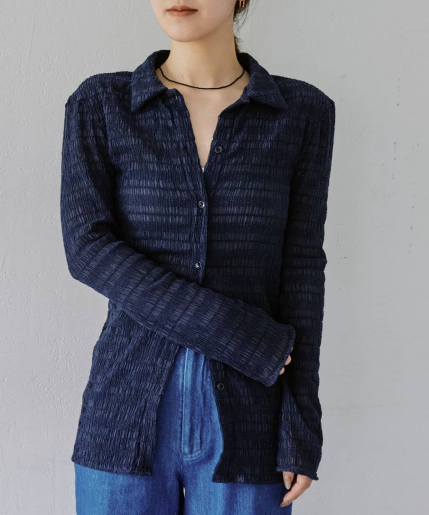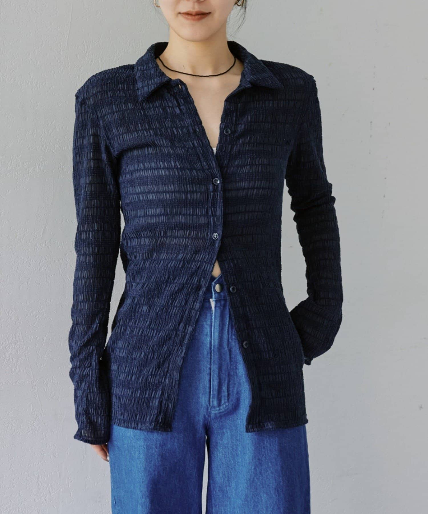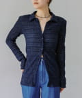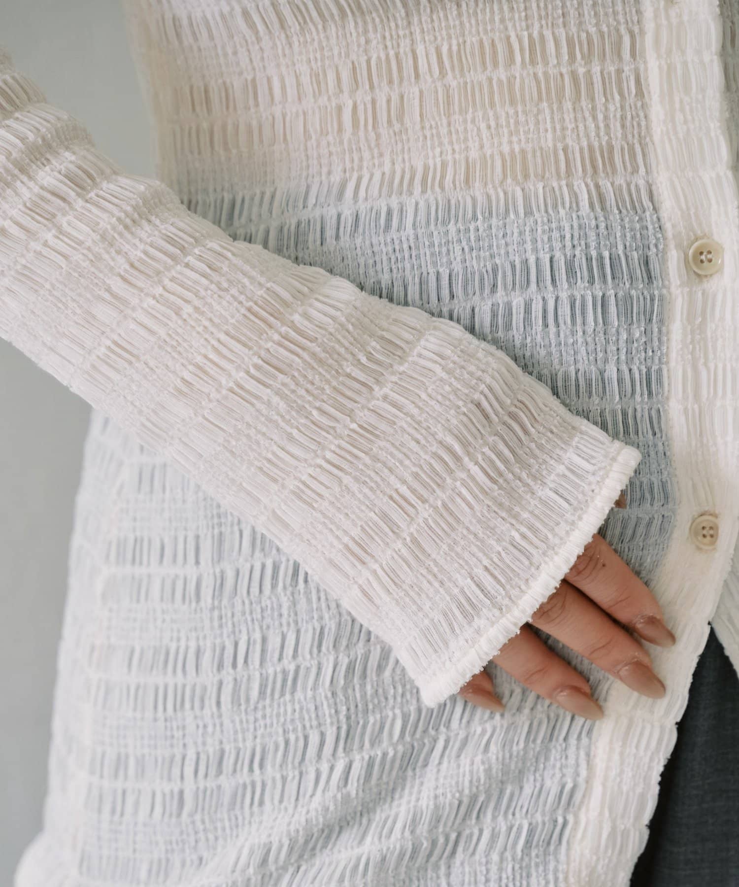 夏の重ね着用の万能シャツが登場。透け感と表面感がキャッチーなシアーシャーリングの生地を、今年らしくコンパクトなシャツ型トップスに仕立てました。生地は特殊な編み機を使用してシャーリング加工を施しており、心地よいストレッチ性と鮮度ある表情感を表現しています。また、環境に配慮したリサイクルポリエステルを原料としており、速乾性、吸汗性、防炎性のある機能性に優れています。