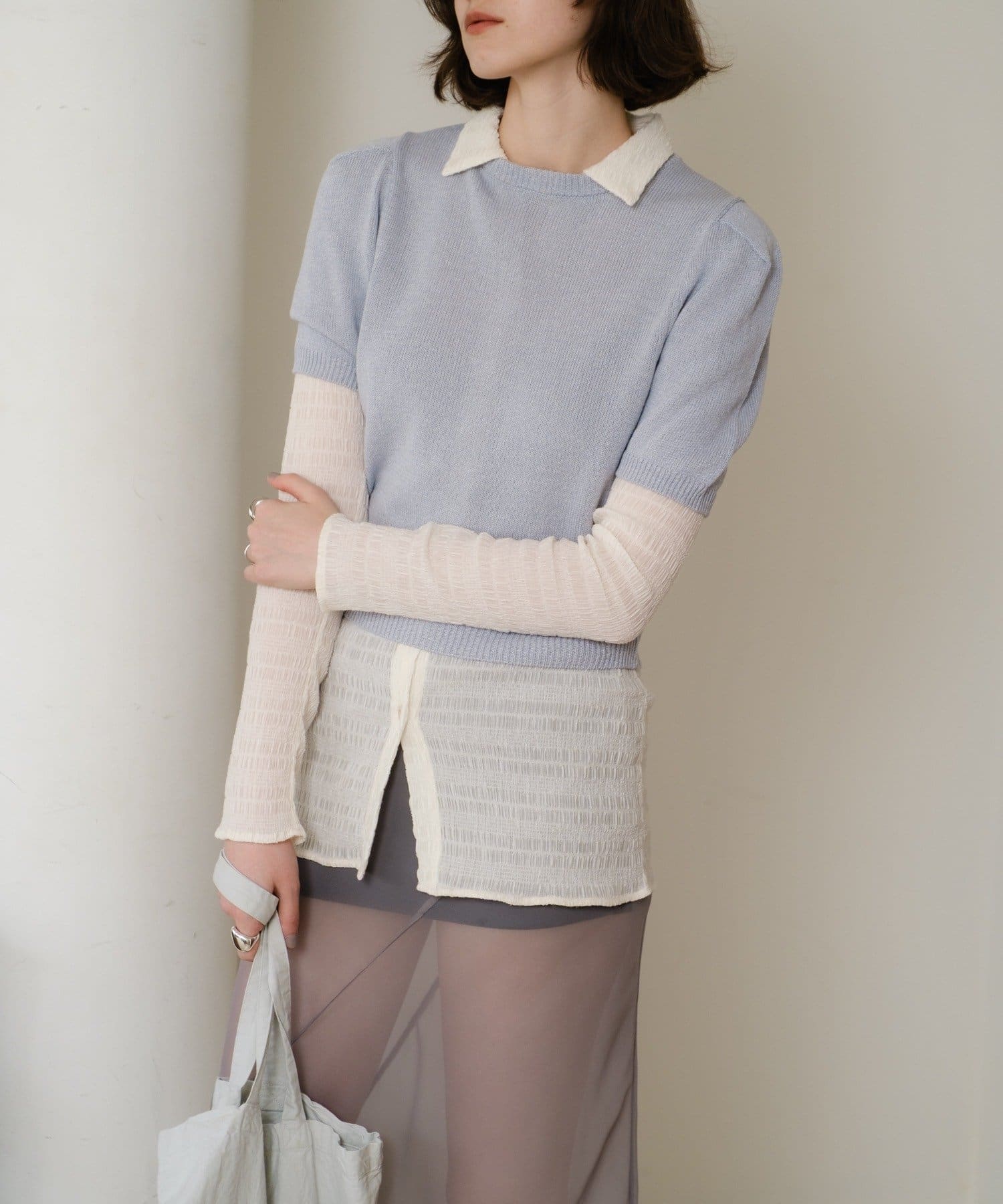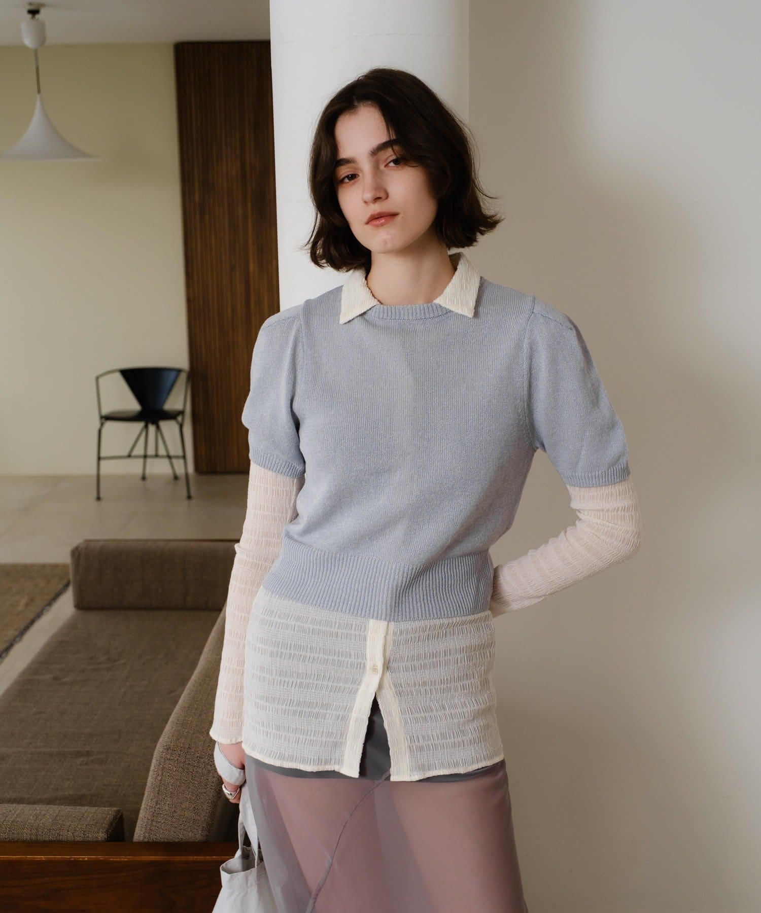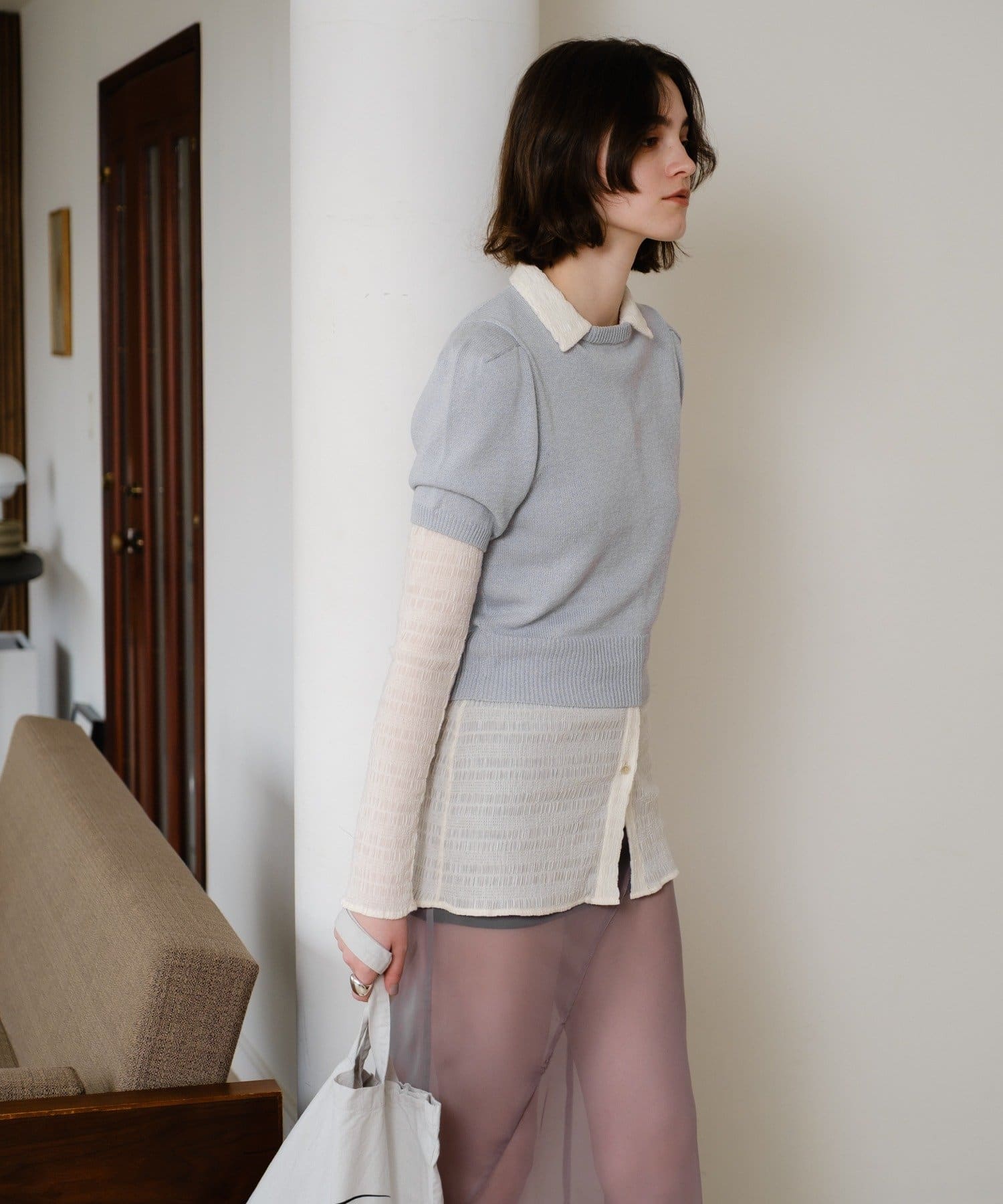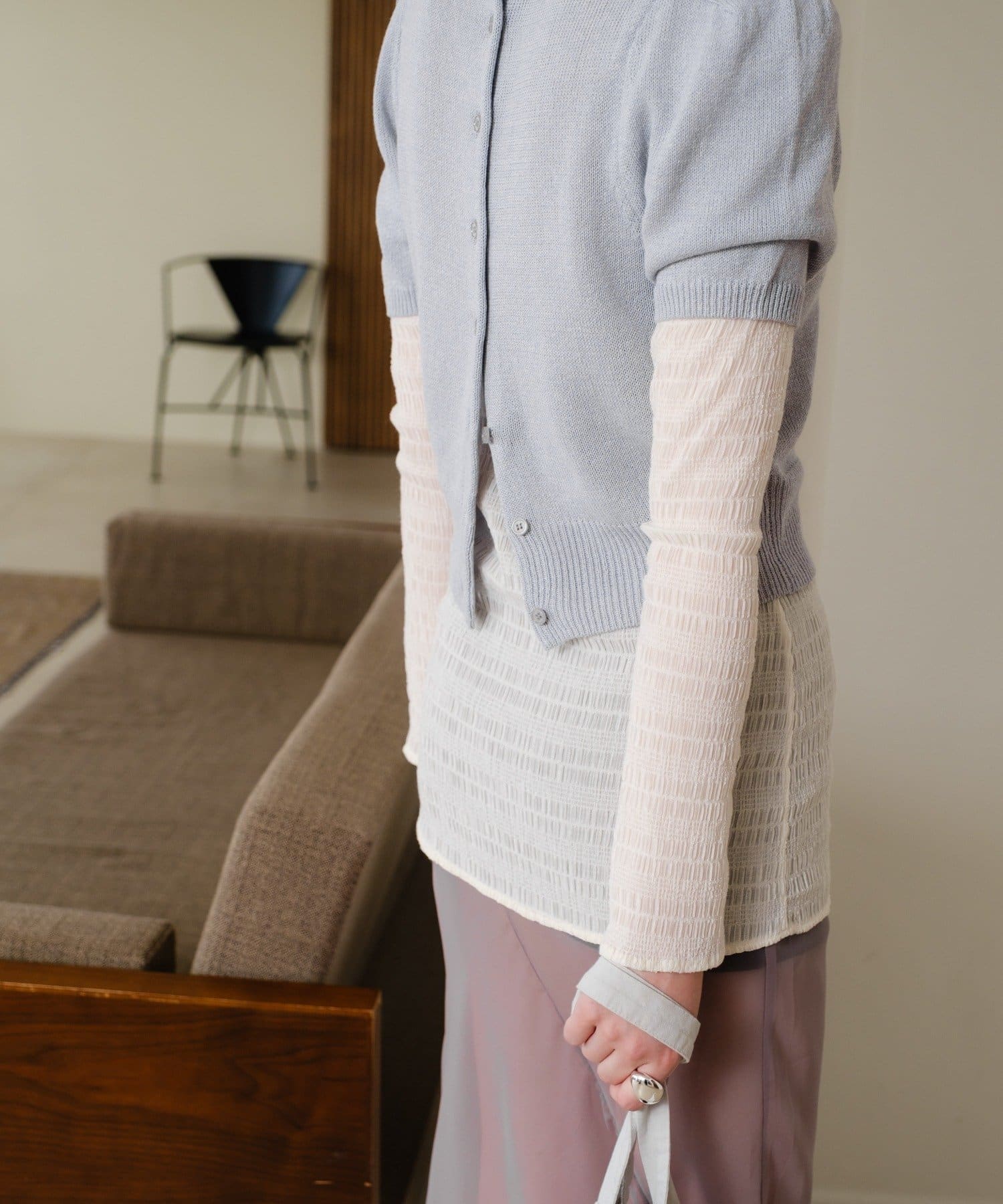 インナーにTシャツやブラトップを着て羽織にしたり、襟物同士の重ね着スタイルもおすすめです。また、半袖のサマーニットの中にレイヤードしても、今年らしく新鮮に着用いただけます。
