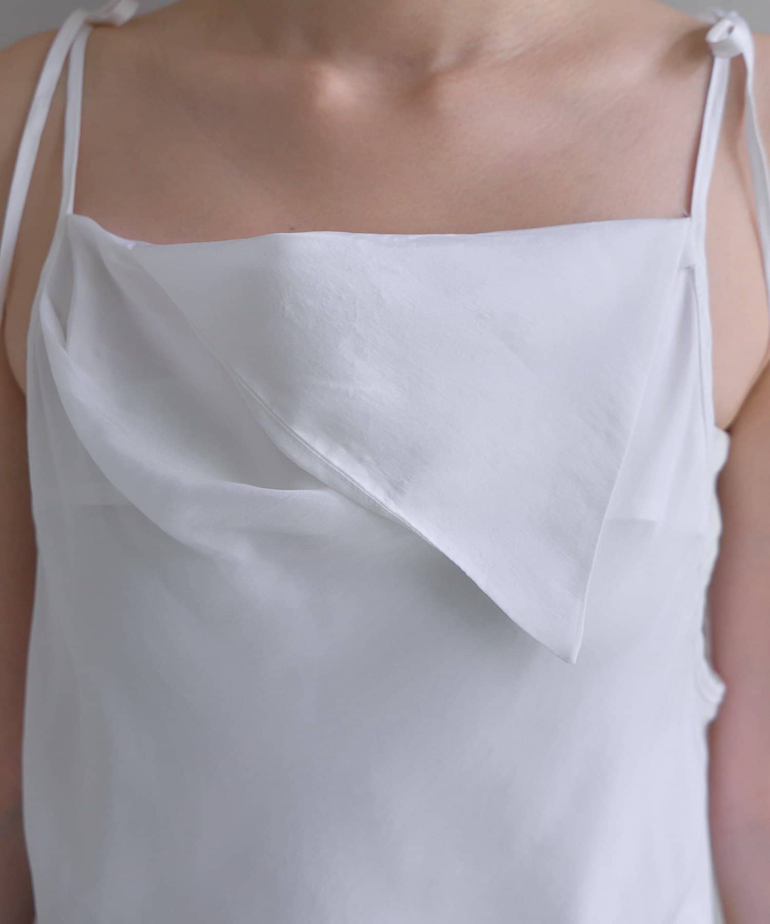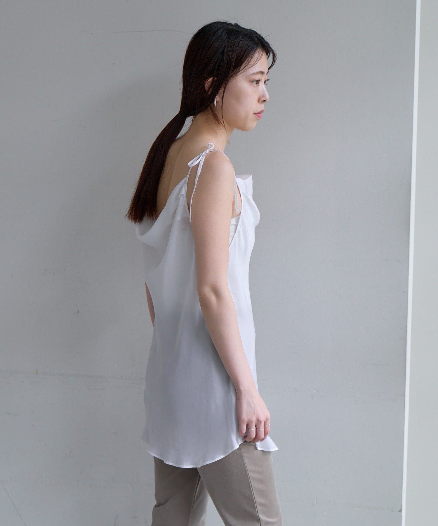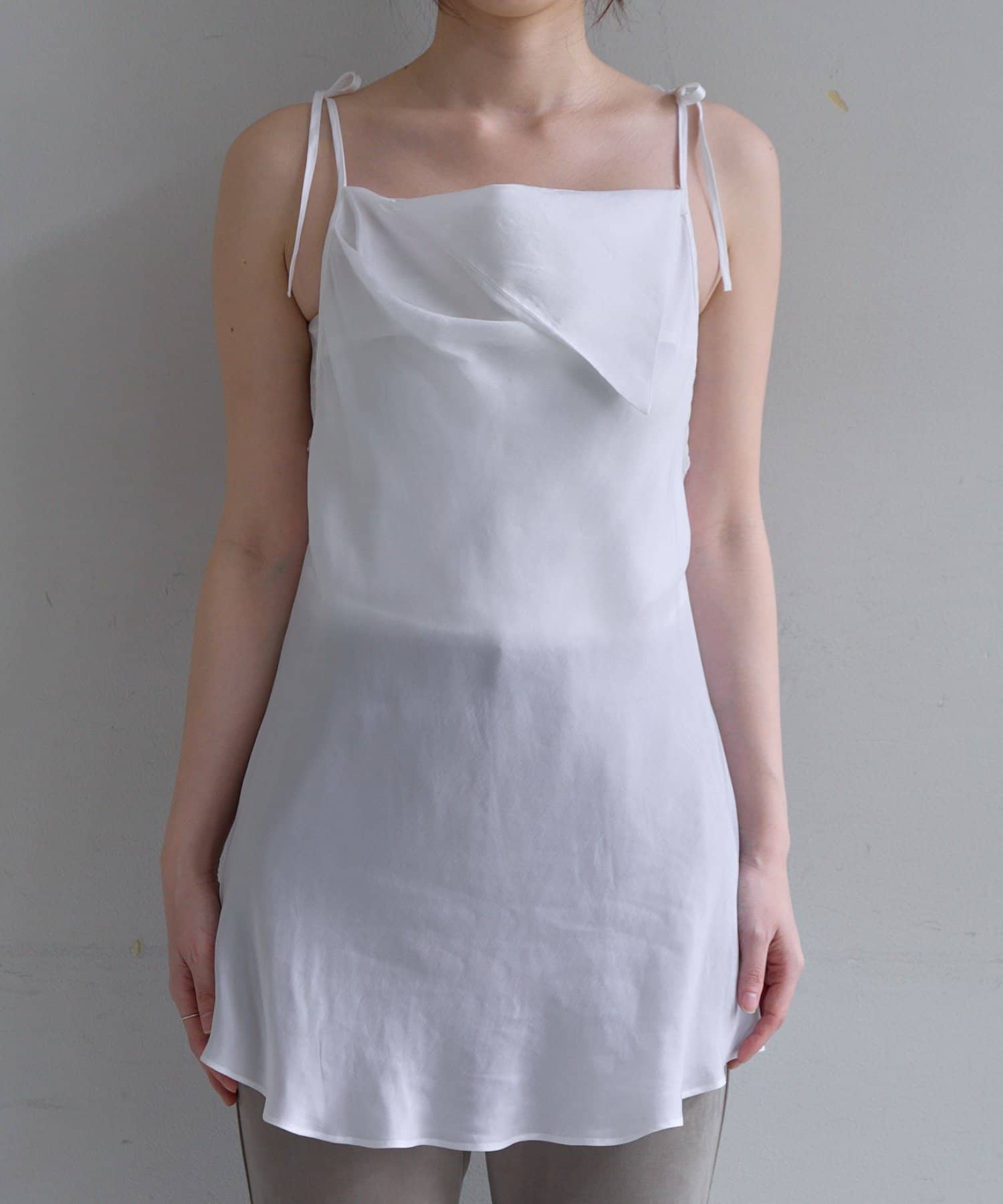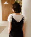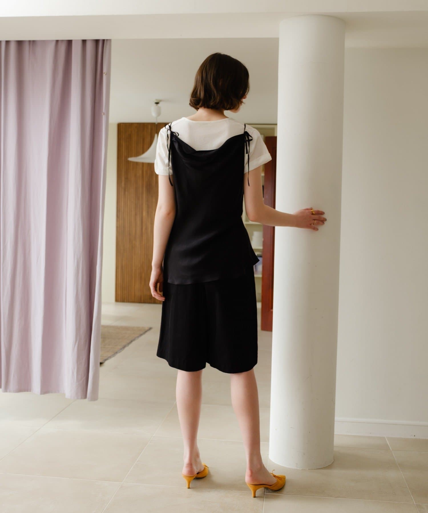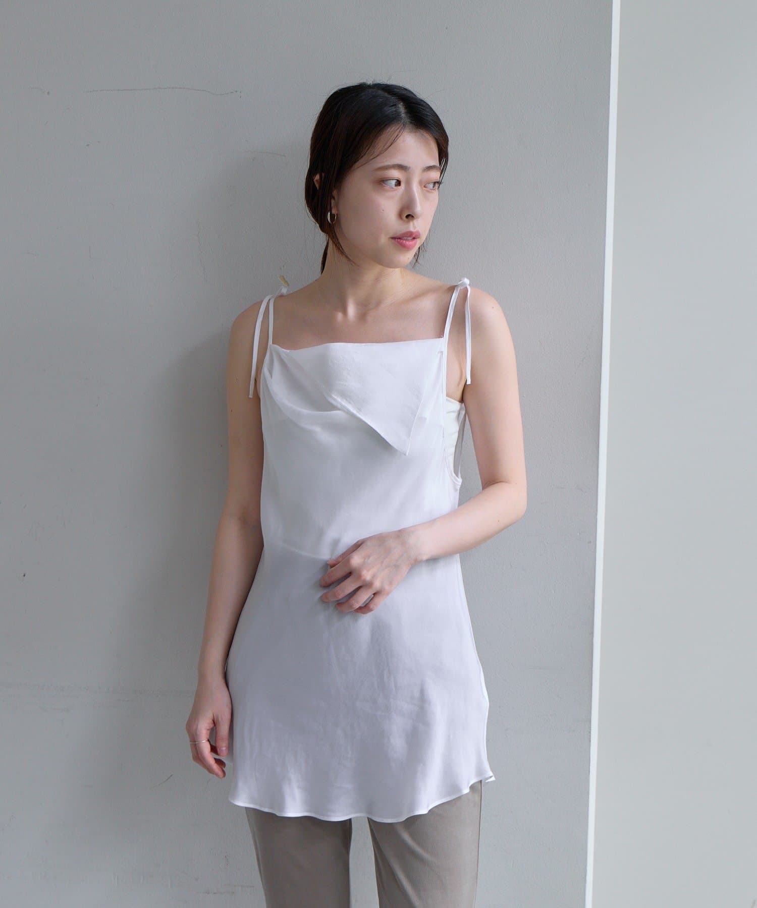 肩紐は結んで長さを調整できる仕様。アレンジ次第で首回りを詰めて着たり、胸下まで降ろしてチュニックとして着たり、自由自在にアレンジが可能です。また、胸の前後には折り返して使えるフラップが付いており、外に出すとスカーフネックのように、内側にいれるとドレープネックにも変身するマルチウェイなデザインです。