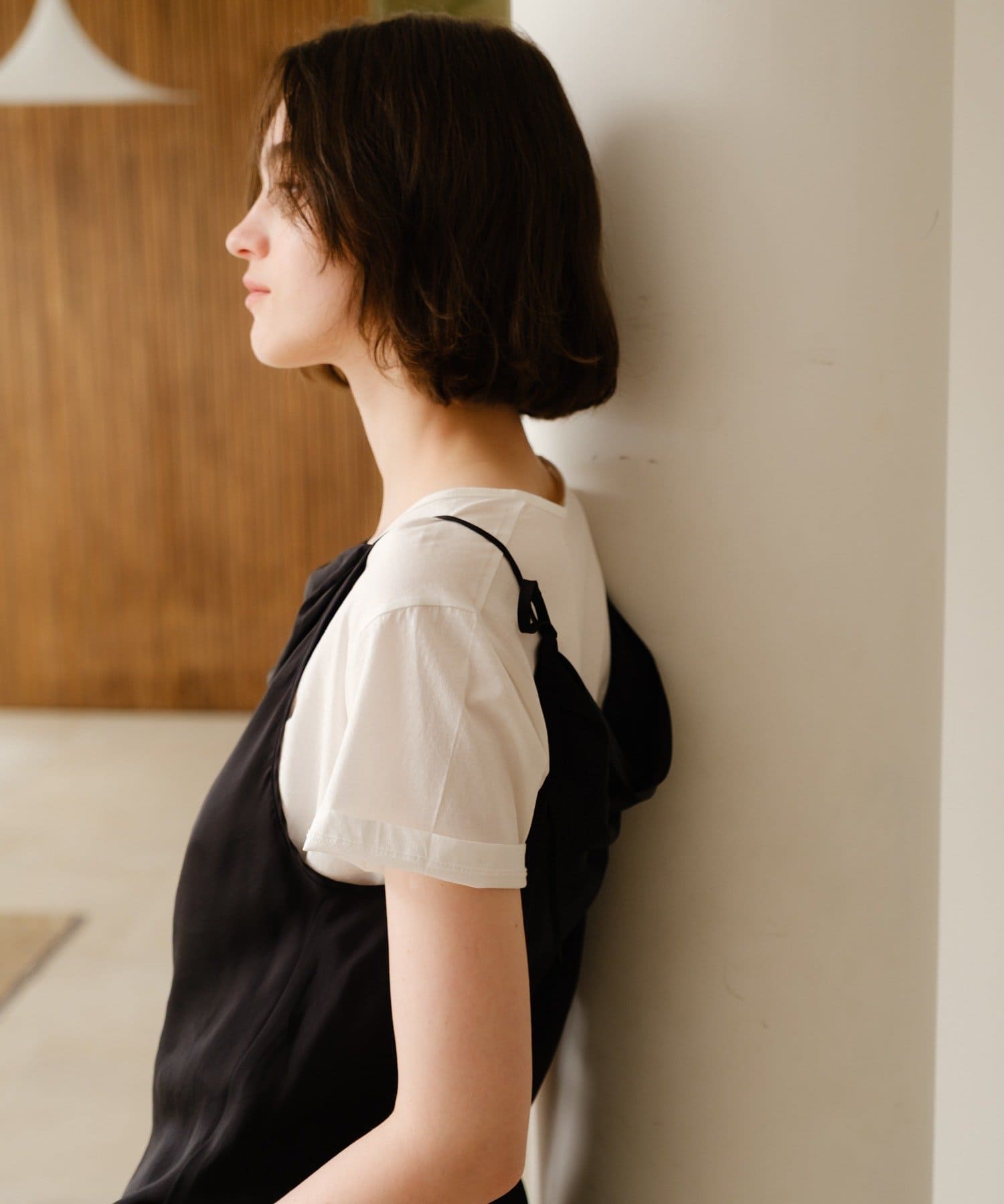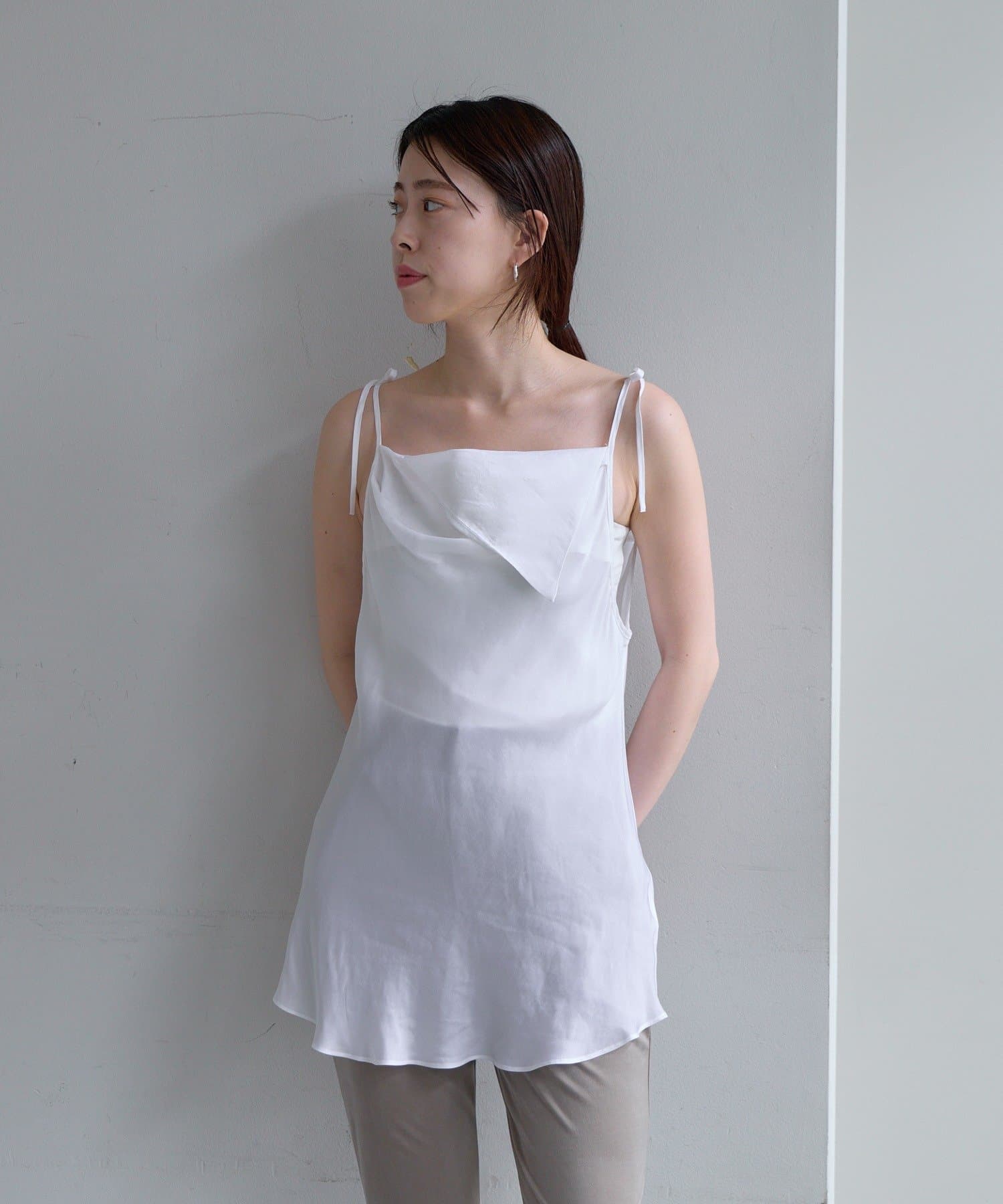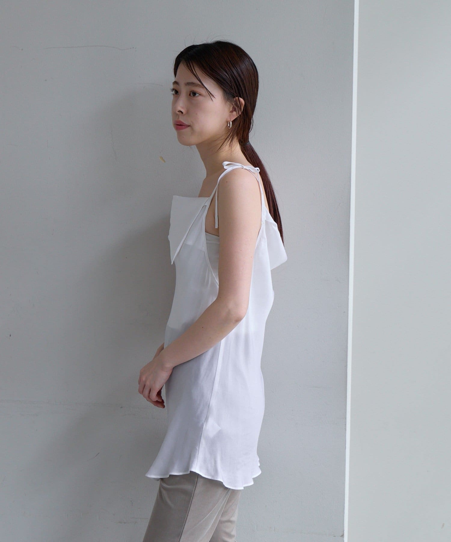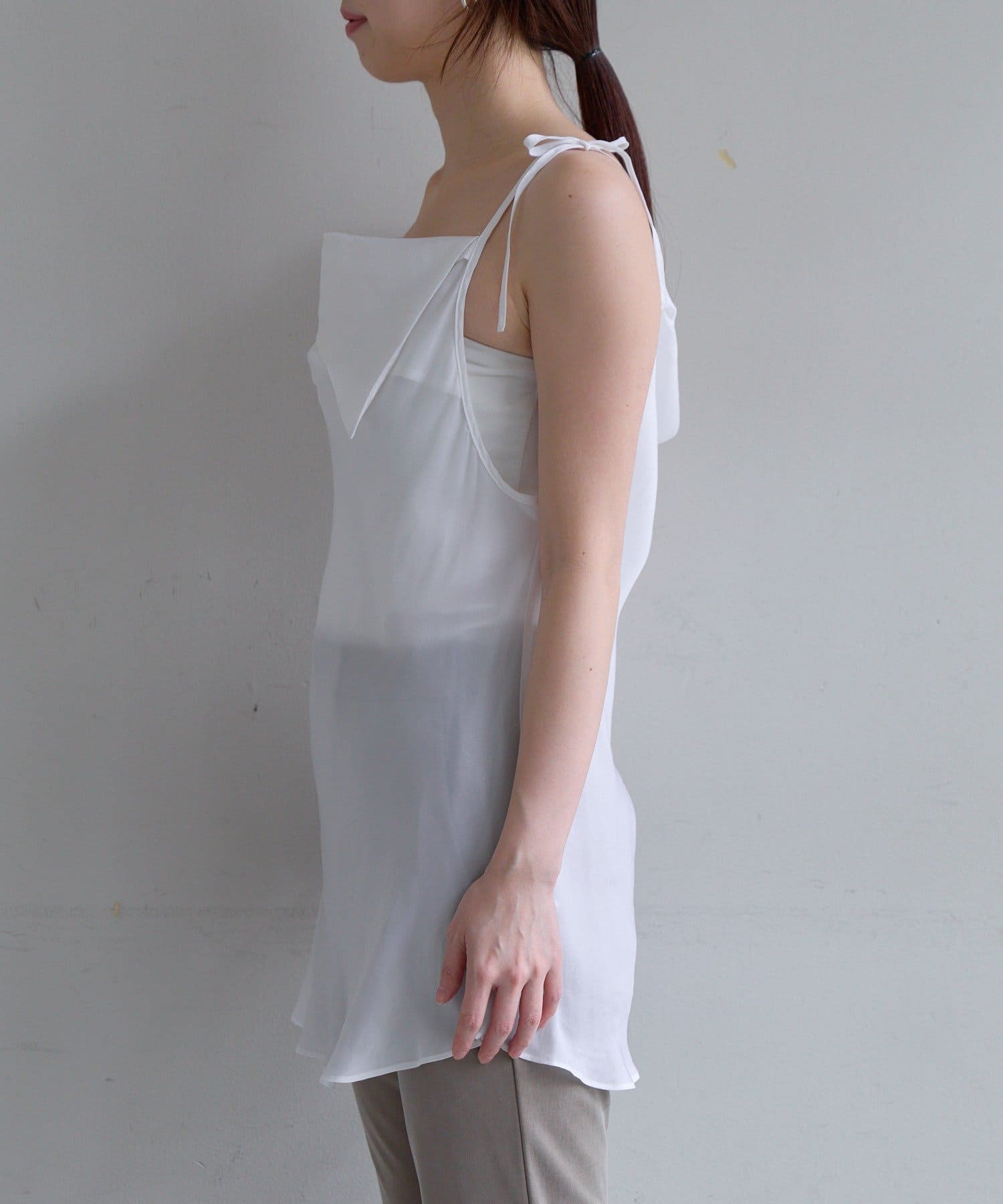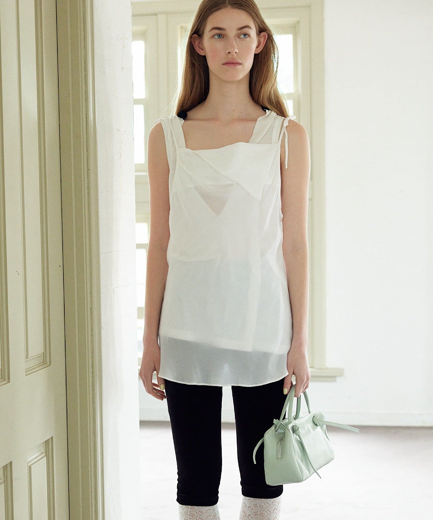 肩紐は結んで長さを調整できる仕様。アレンジ次第で首回りを詰めて着たり、胸下まで降ろしてチュニックとして着たり、自由自在にアレンジが可能です。また、胸の前後には折り返して使えるフラップが付いており、外に出すとスカーフネックのように、内側にいれるとドレープネックにも変身するマルチウェイなデザインです。