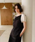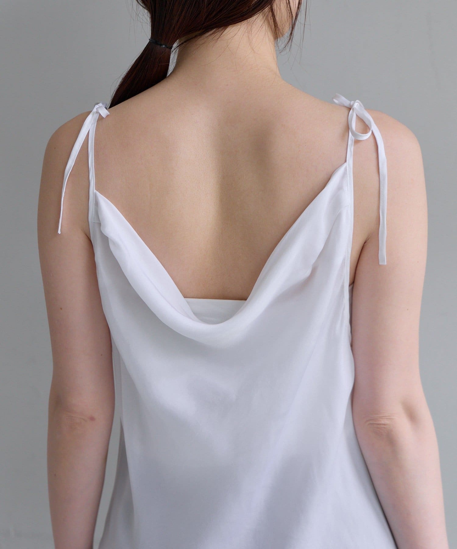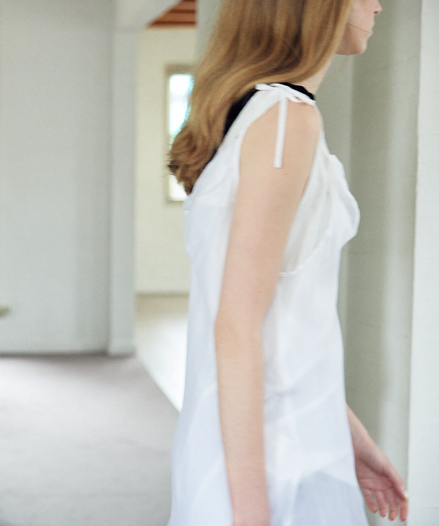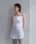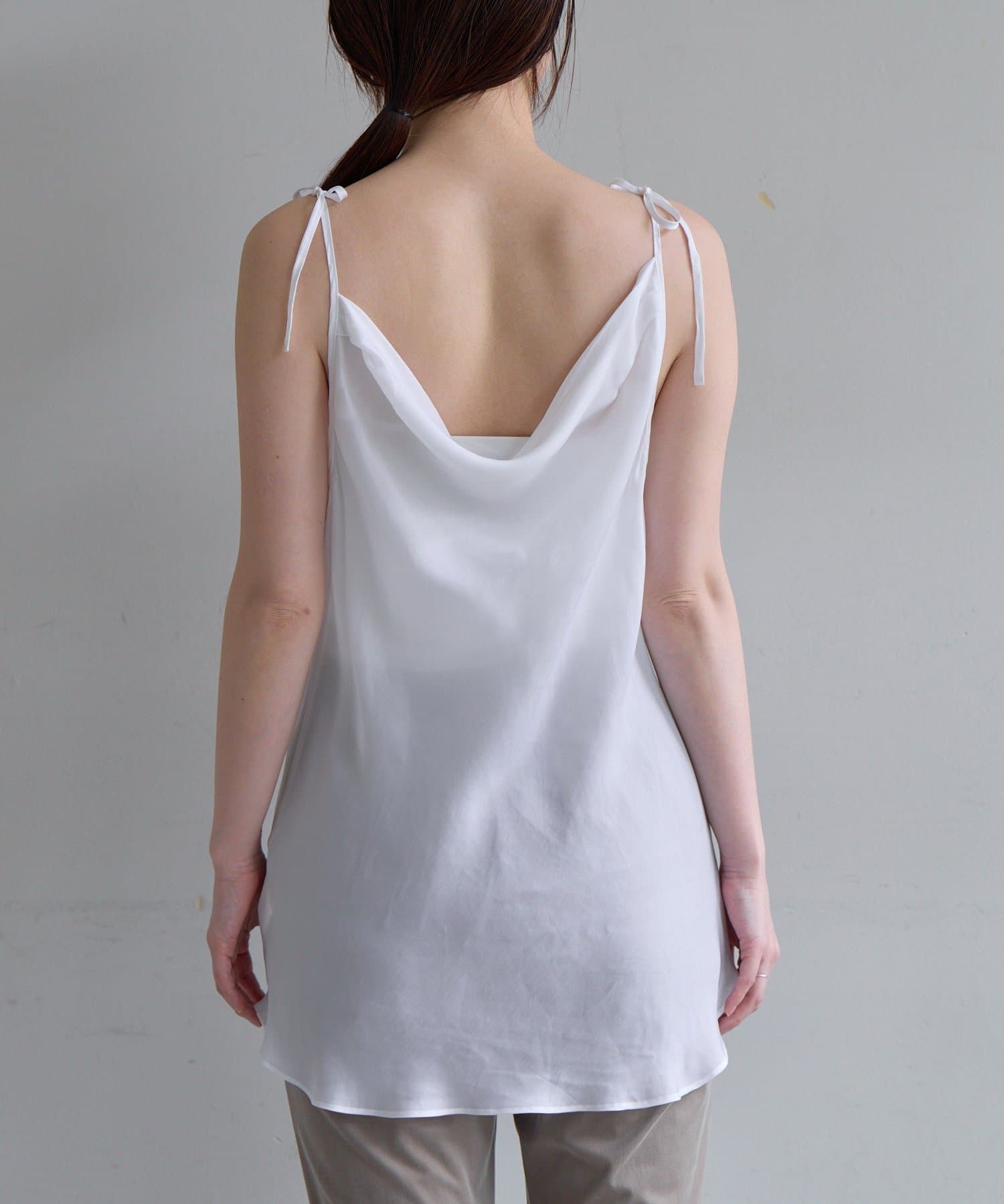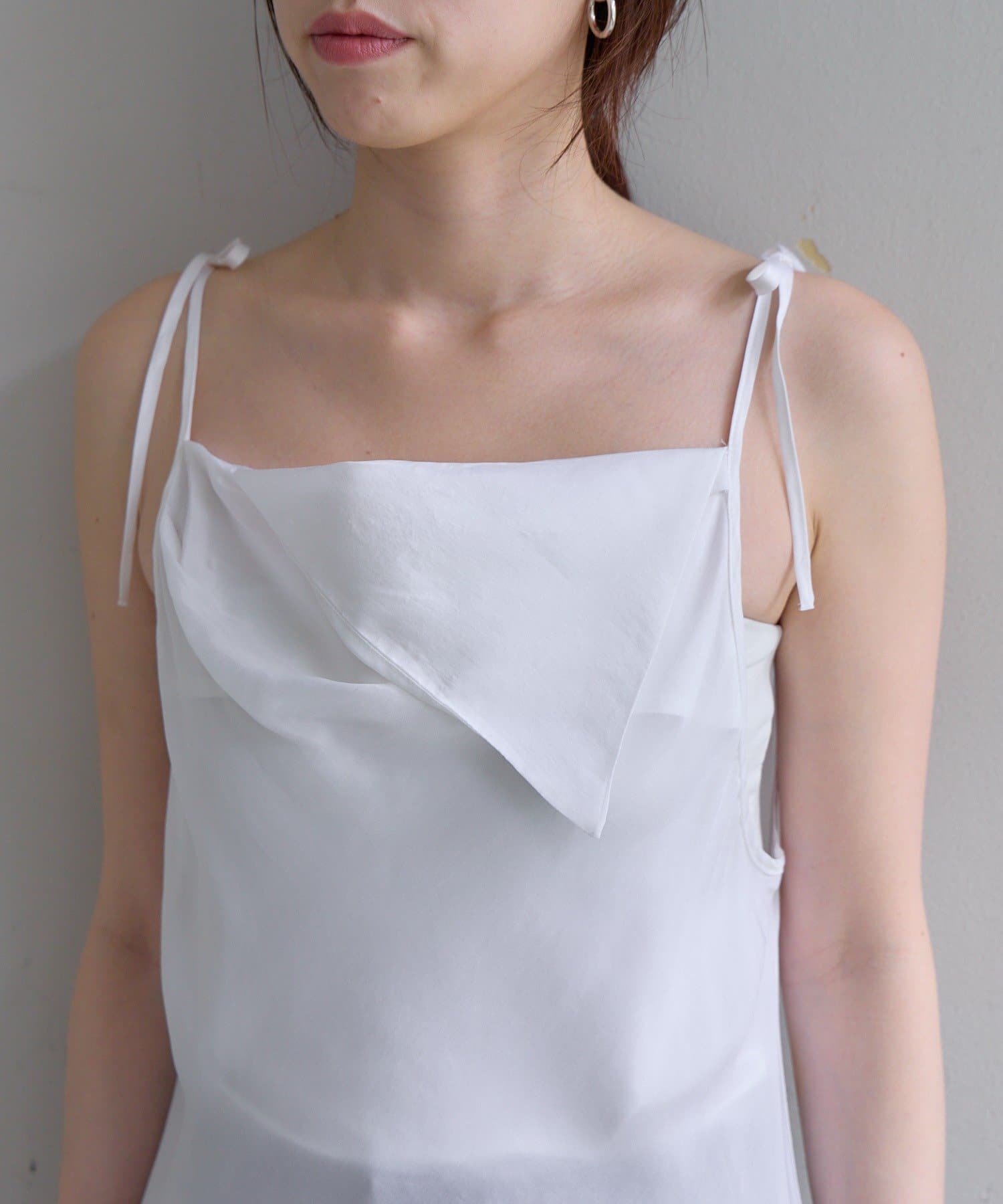 肩紐は結んで長さを調整できる仕様。アレンジ次第で首回りを詰めて着たり、胸下まで降ろしてチュニックとして着たり、自由自在にアレンジが可能です。また、胸の前後には折り返して使えるフラップが付いており、外に出すとスカーフネックのように、内側にいれるとドレープネックにも変身するマルチウェイなデザインです。