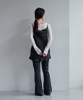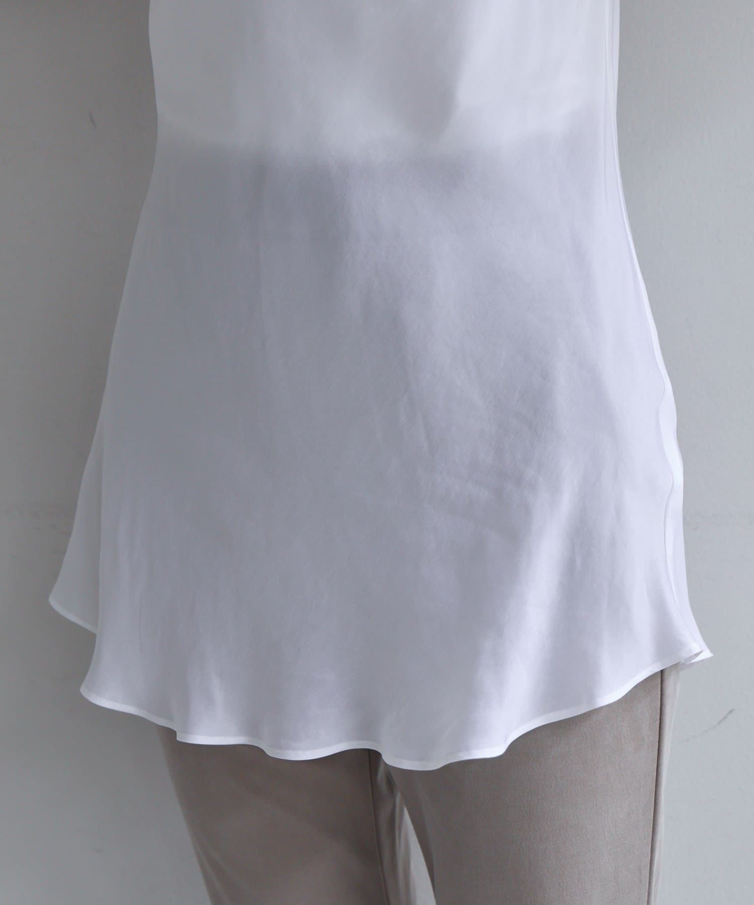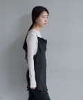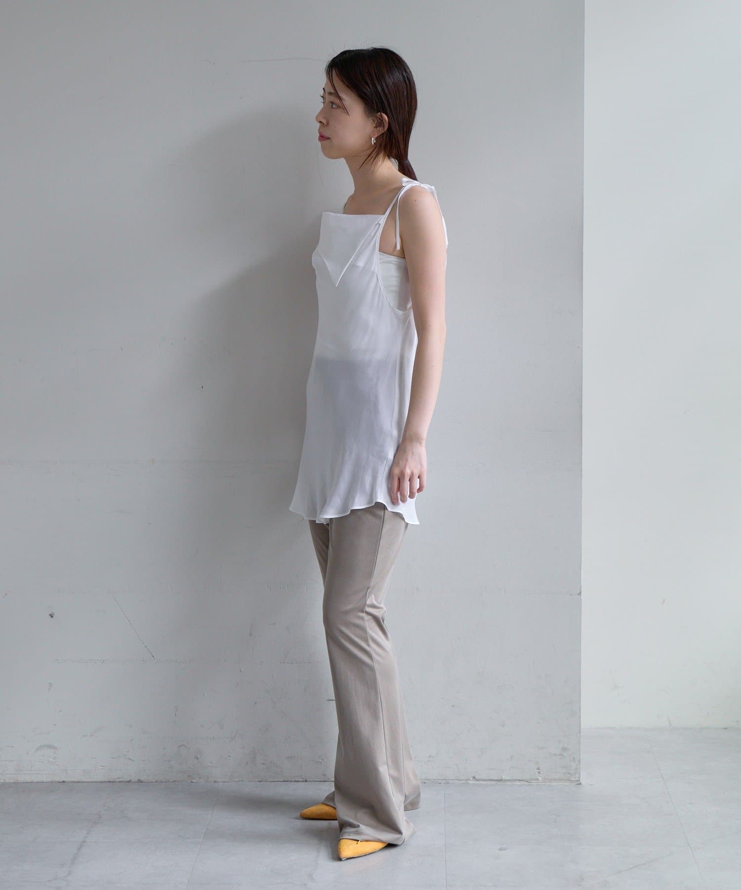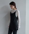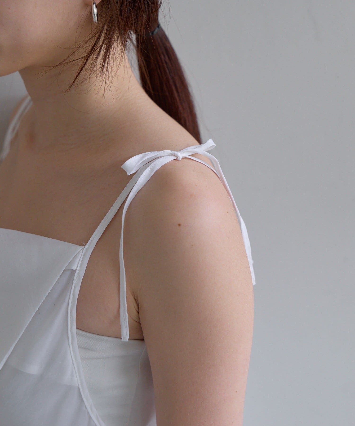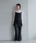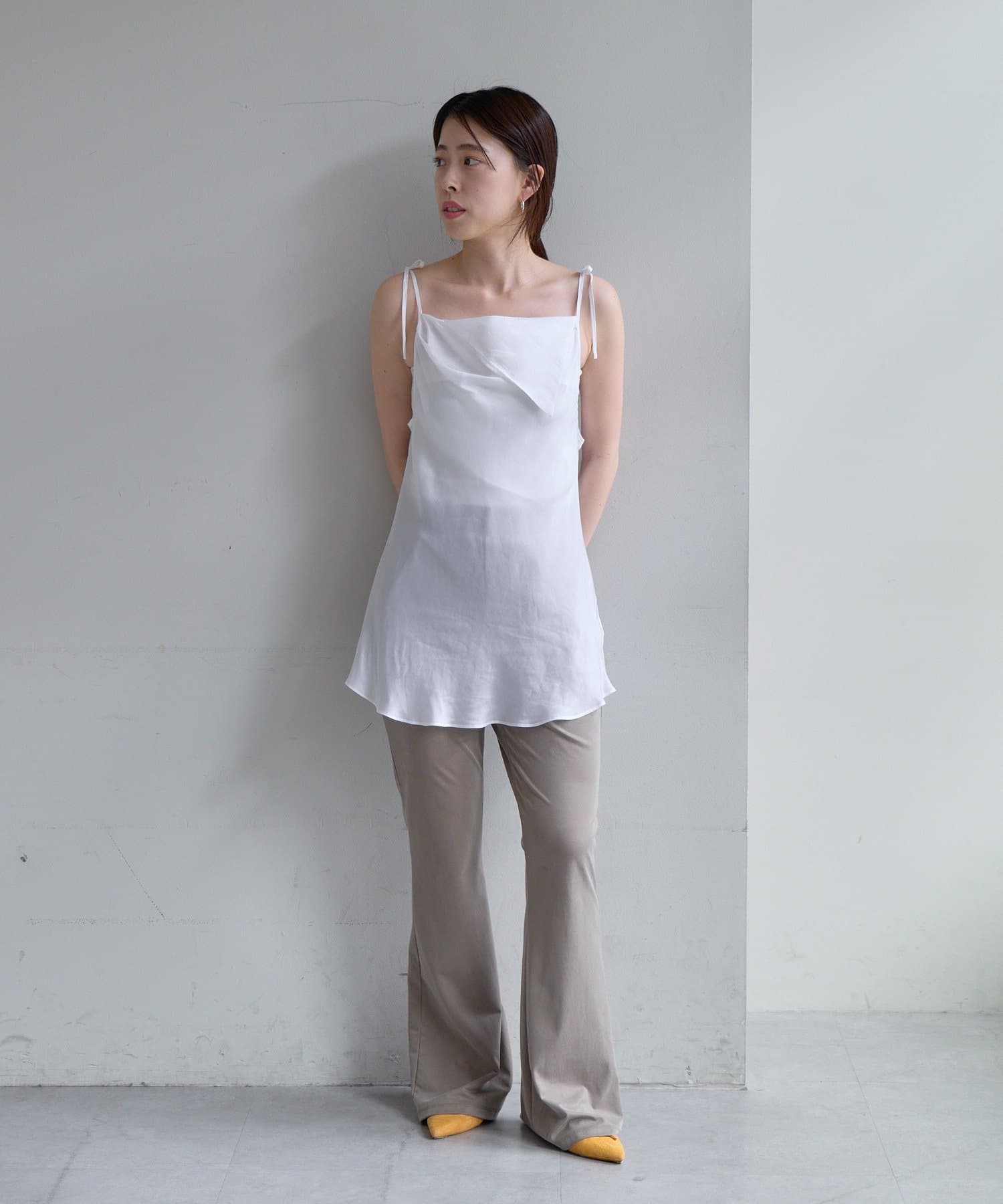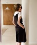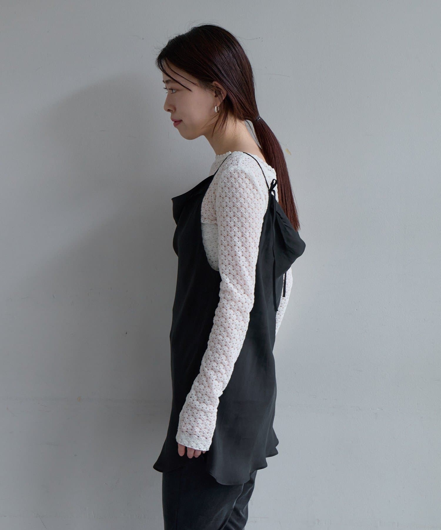 肩紐は結んで長さを調整できる仕様。アレンジ次第で首回りを詰めて着たり、胸下まで降ろしてチュニックとして着たり、自由自在にアレンジが可能です。また、胸の前後には折り返して使えるフラップが付いており、外に出すとスカーフネックのように、内側にいれるとドレープネックにも変身するマルチウェイなデザインです。