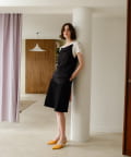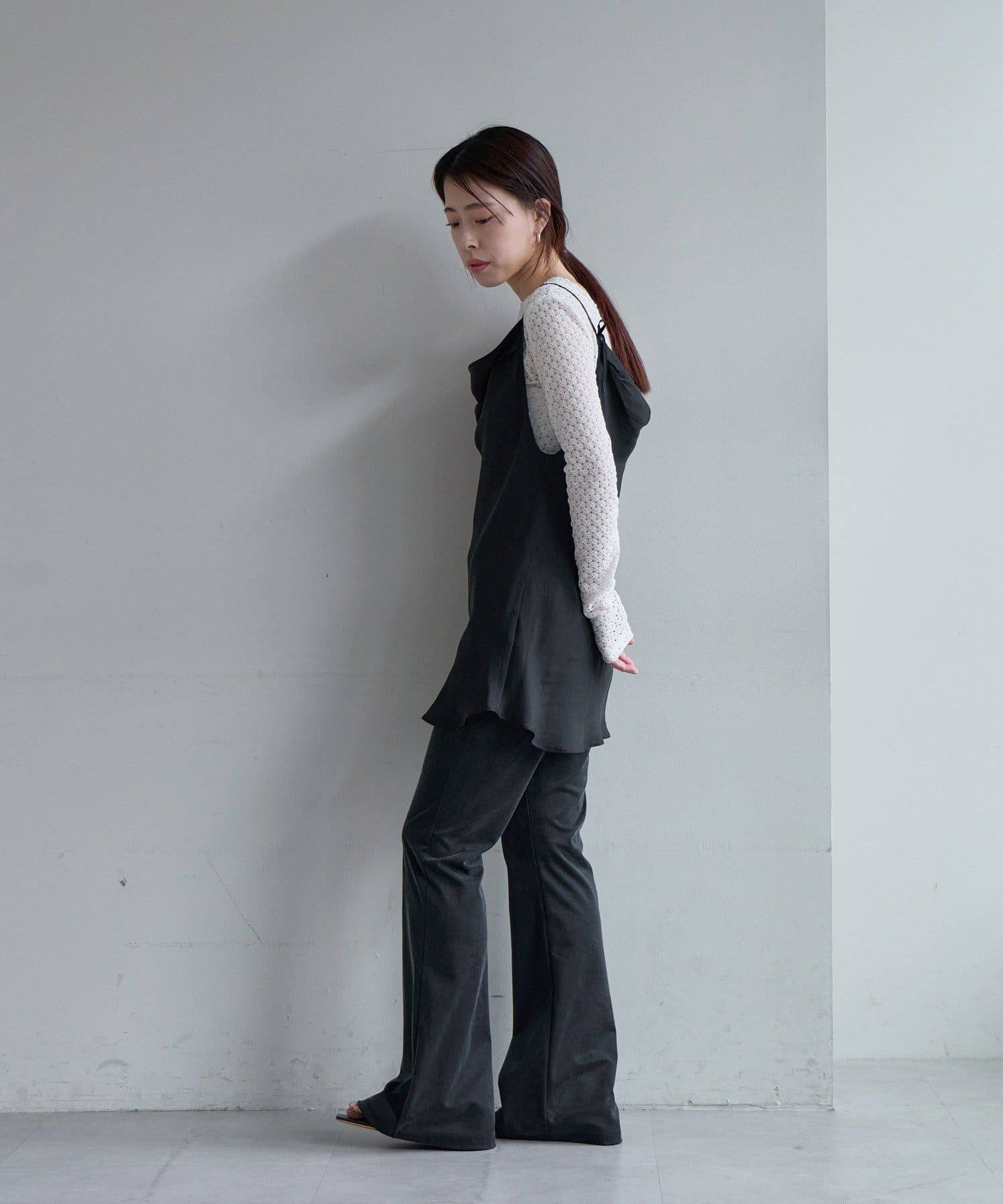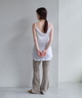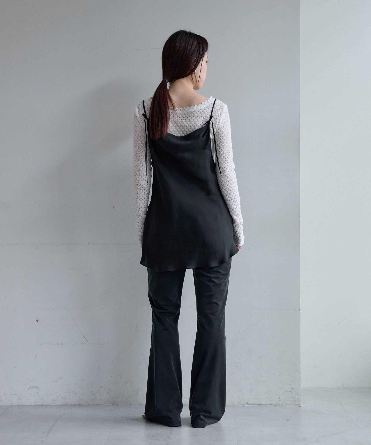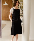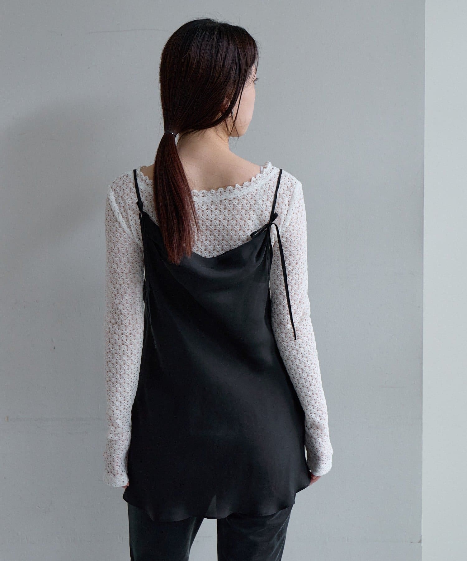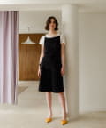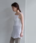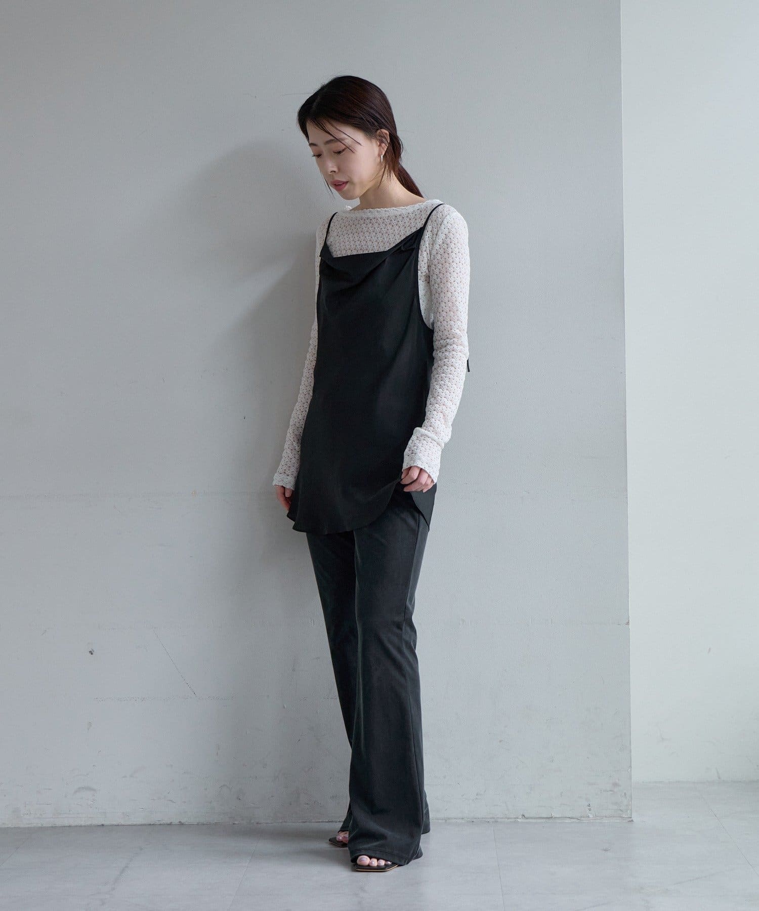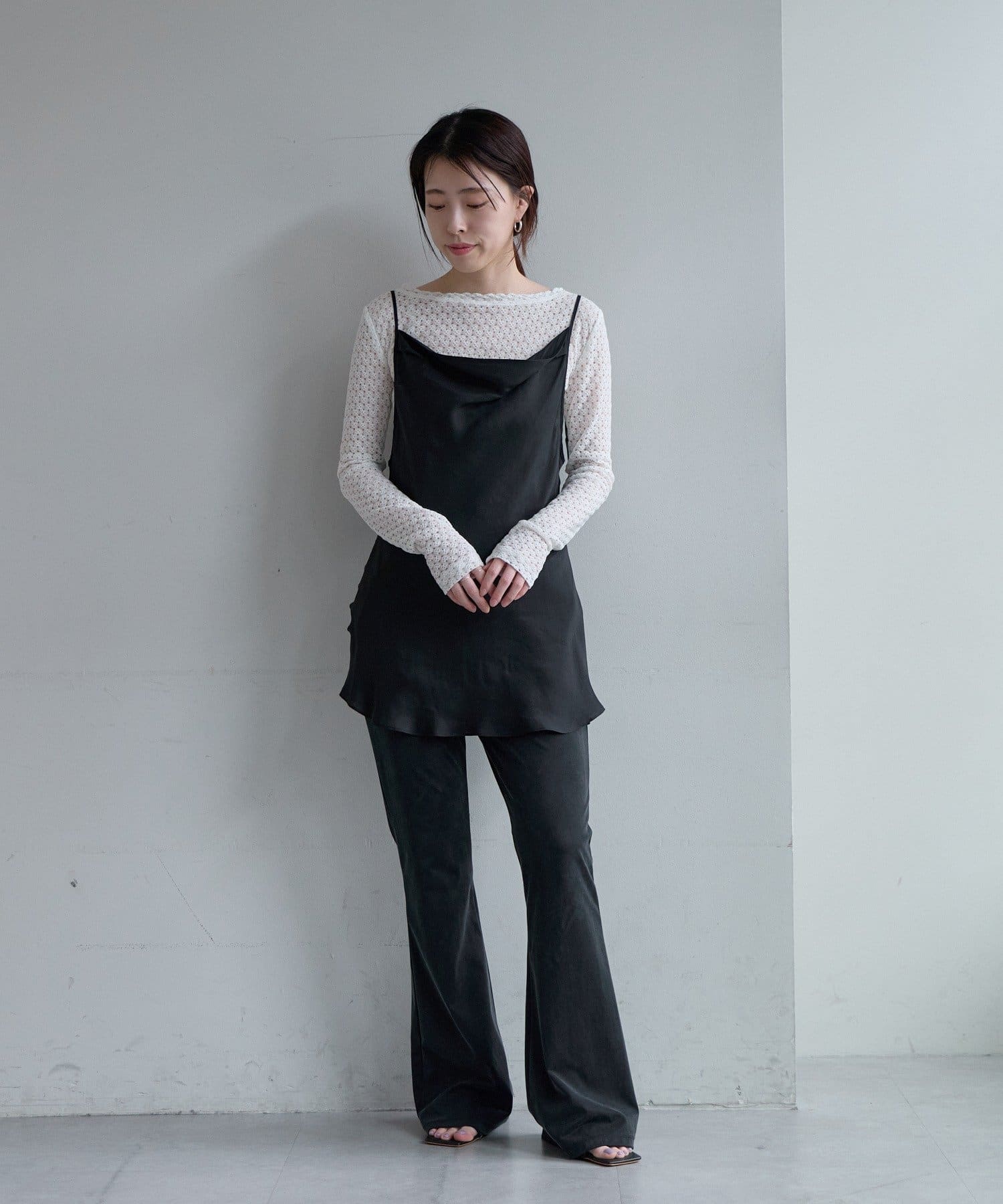 肩紐は結んで長さを調整できる仕様。アレンジ次第で首回りを詰めて着たり、胸下まで降ろしてチュニックとして着たり、自由自在にアレンジが可能です。また、胸の前後には折り返して使えるフラップが付いており、外に出すとスカーフネックのように、内側にいれるとドレープネックにも変身するマルチウェイなデザインです。