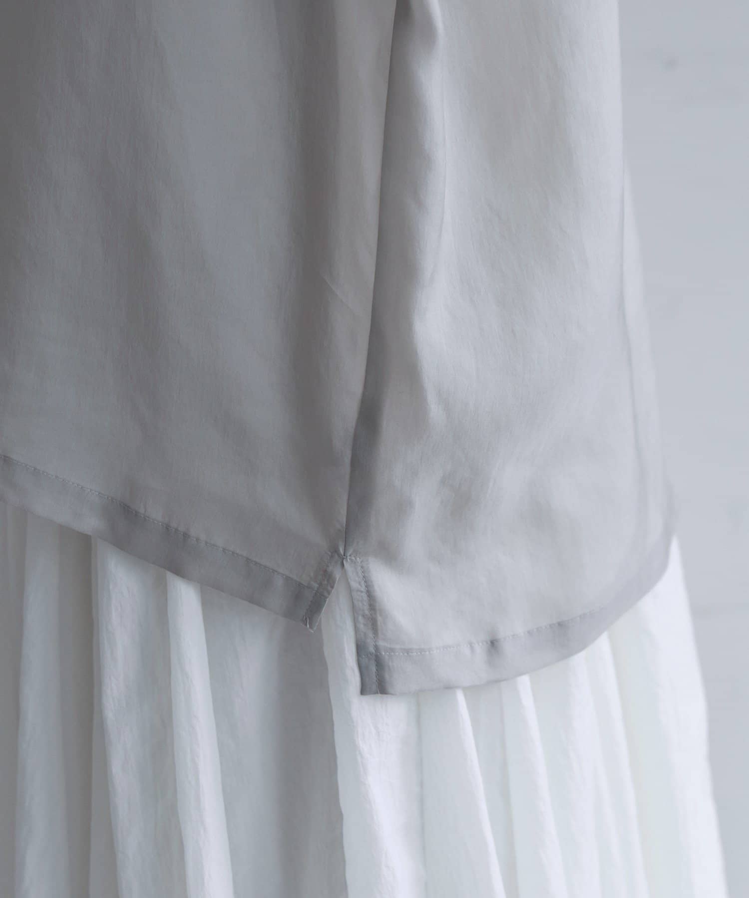 また、自宅で洗濯が可能。カラーはグレーベージュとチャコールグレーの2色展開。同生地でドレープキャミソールとペプラムブラウスを展開しております。