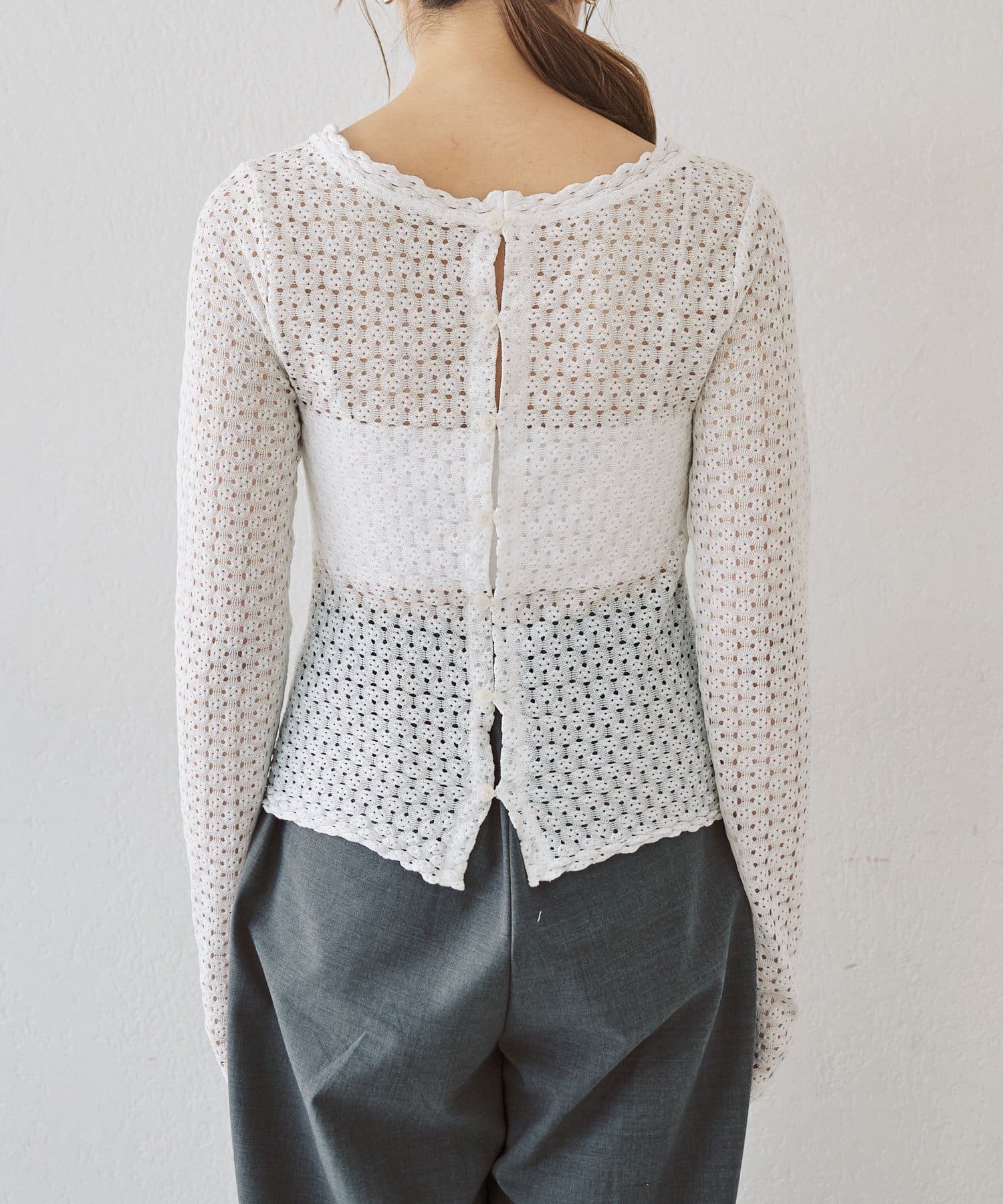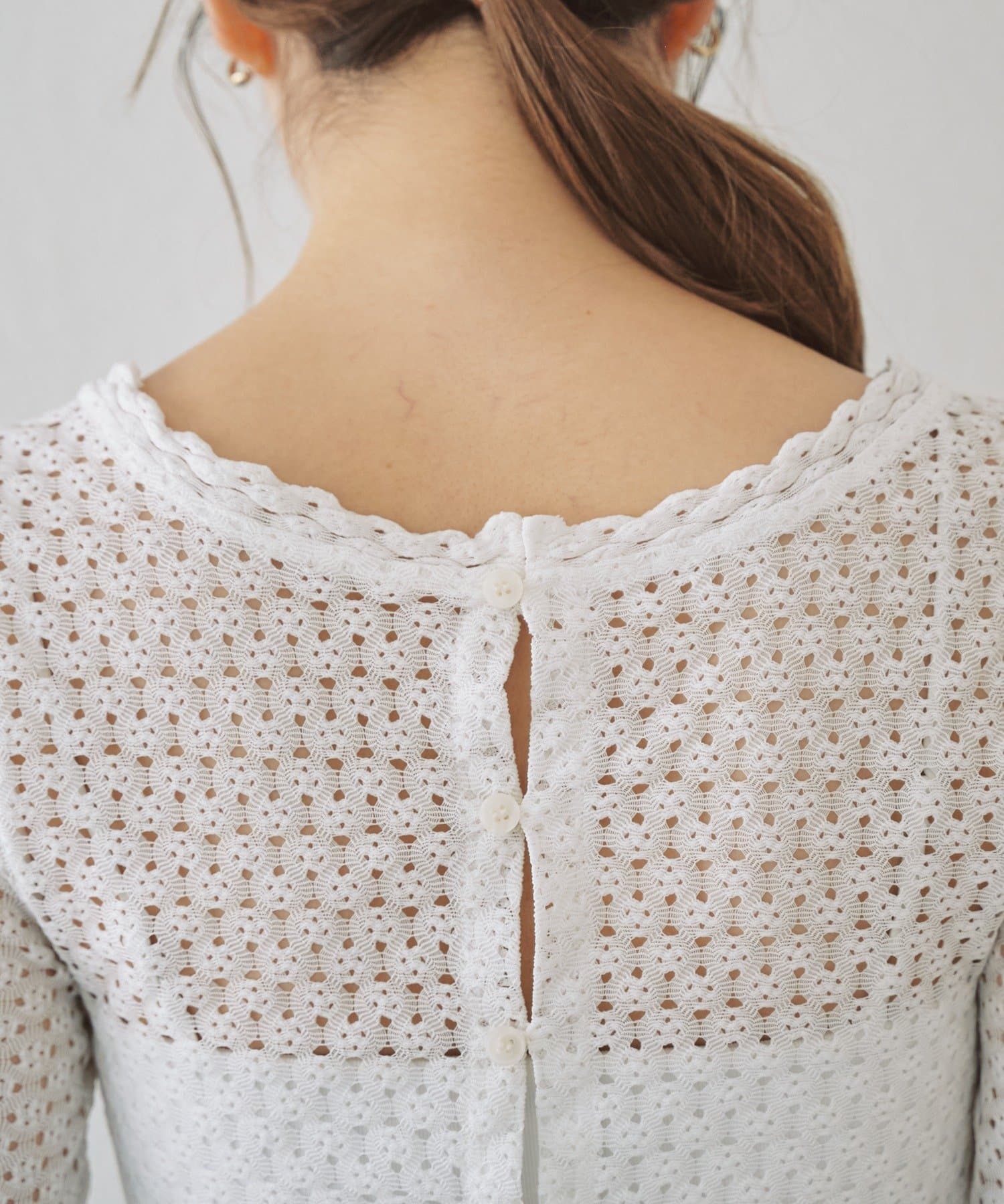 襟ぐりは顔回りがぐっと華やかに見えるスカラップデザイン。背面はボタン開きで前後2WAY で着用いただけます。