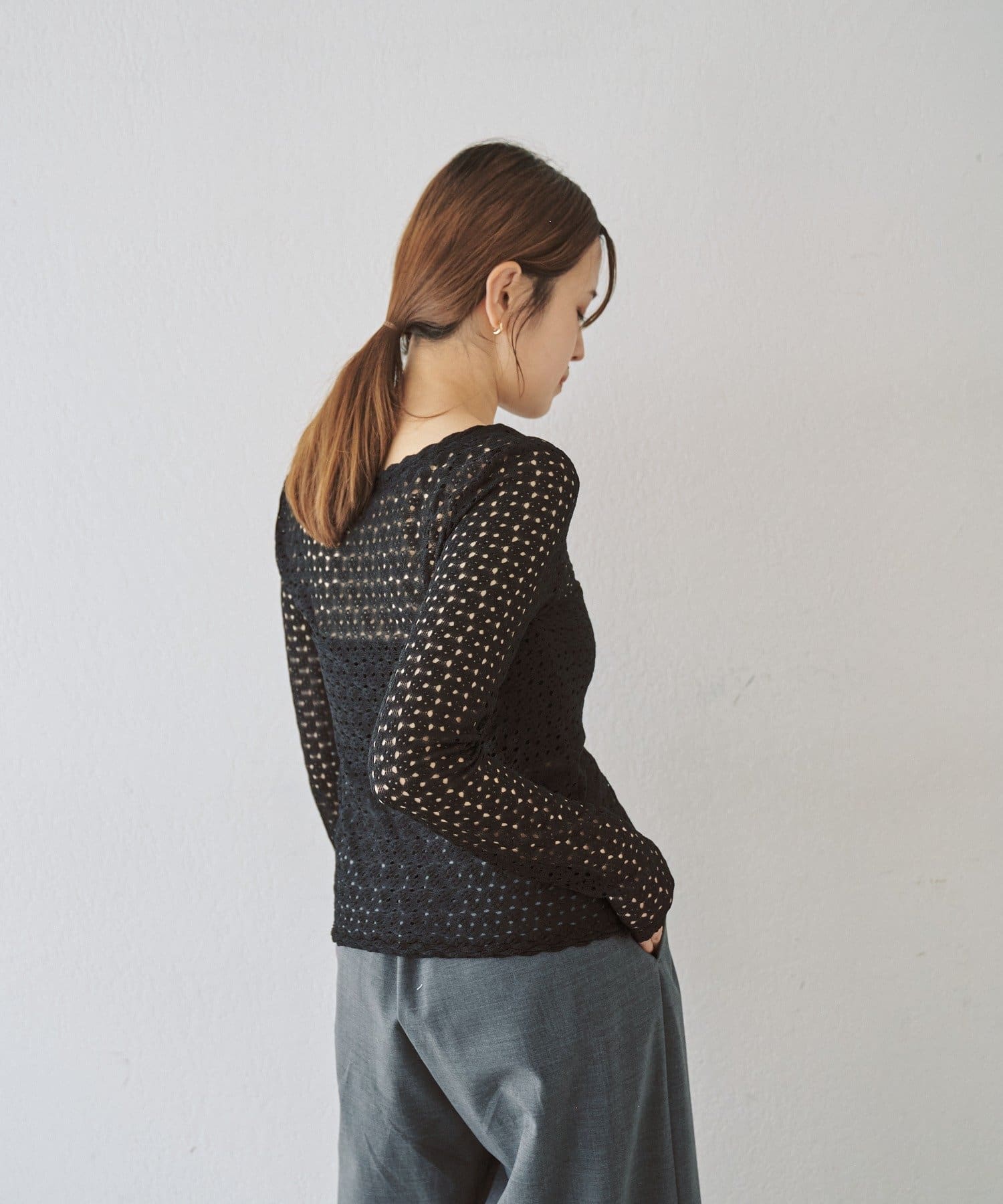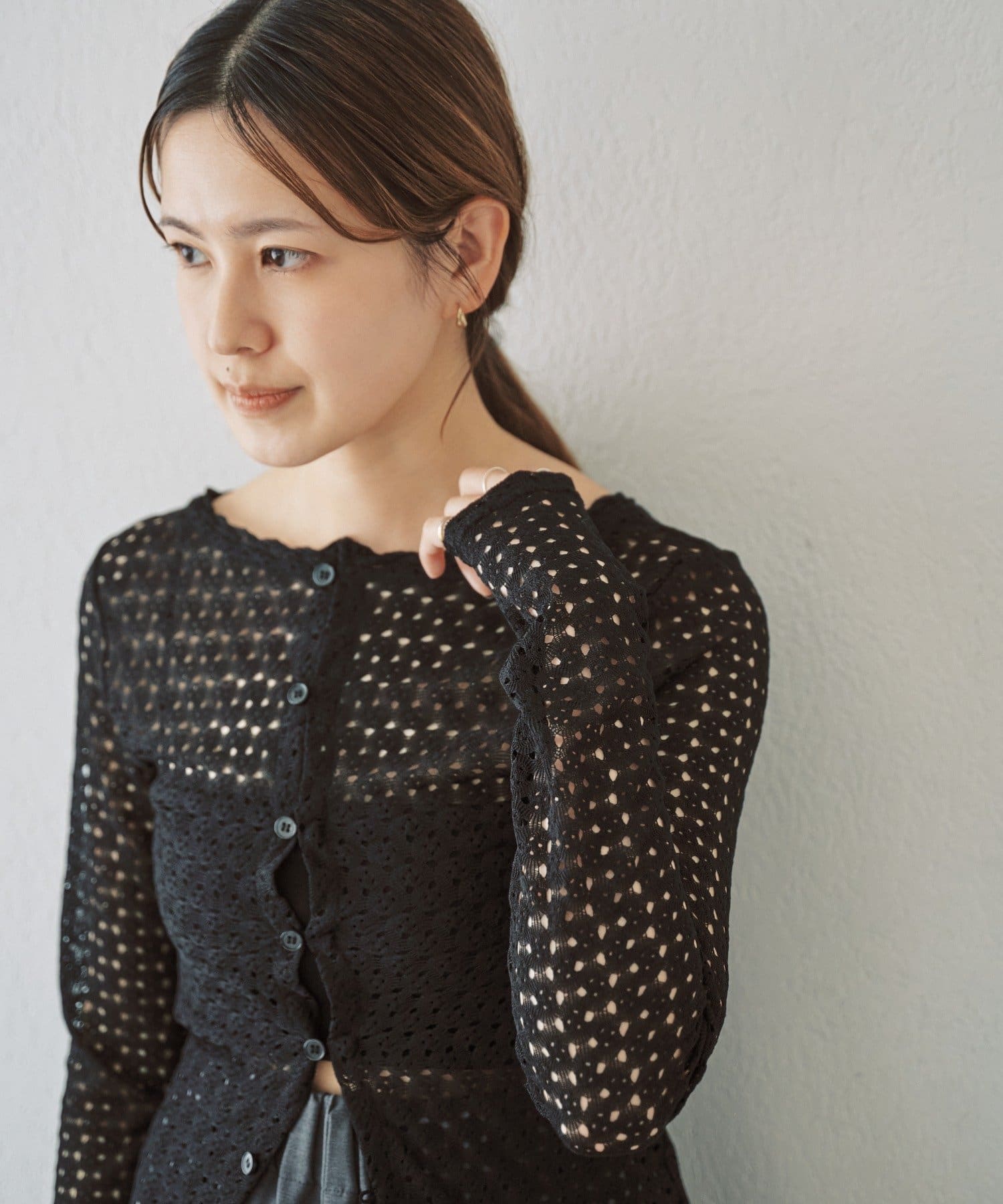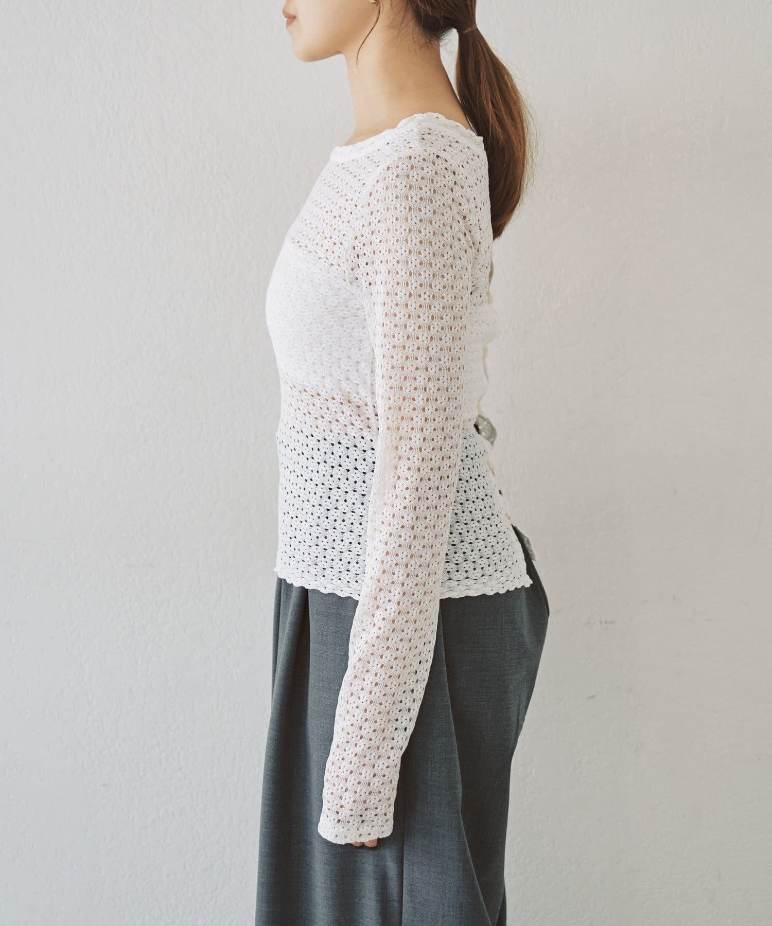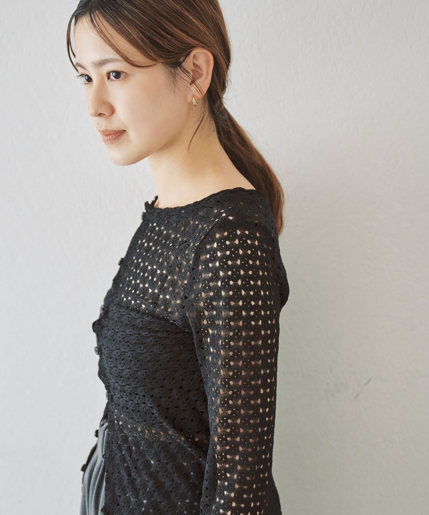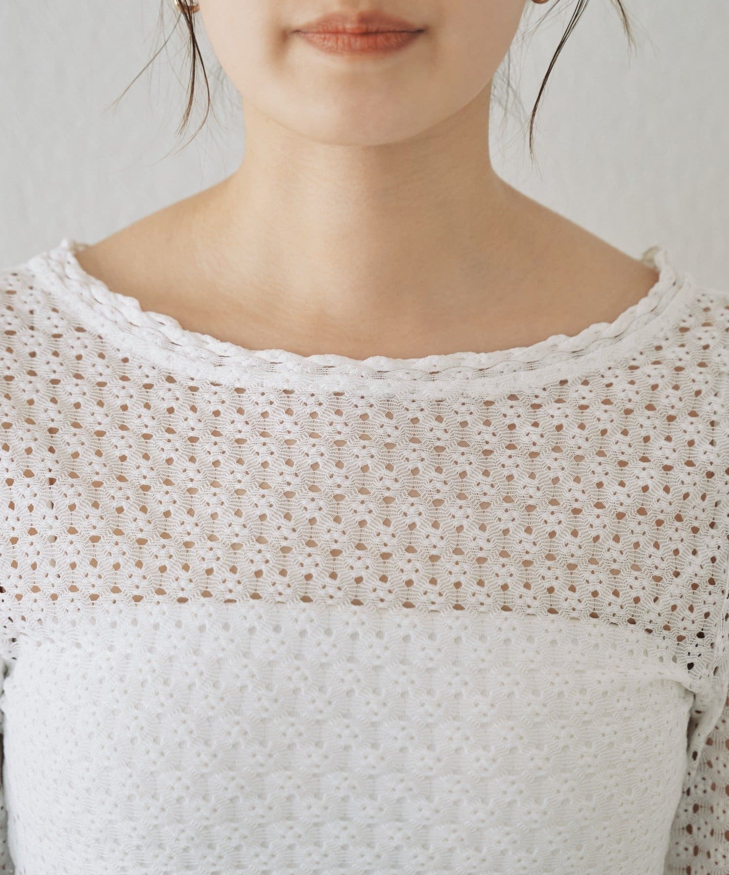 重ね着用にも1枚着にも、今シーズンつい手に取りたくなる、ウォッシャブルのレース編みトップスが完成しました。程よくフィット感のあるストレッチレースのカットソー生地がボディラインを優しく綺麗に拾うので、着痩せ効果も叶う嬉しい1着です。