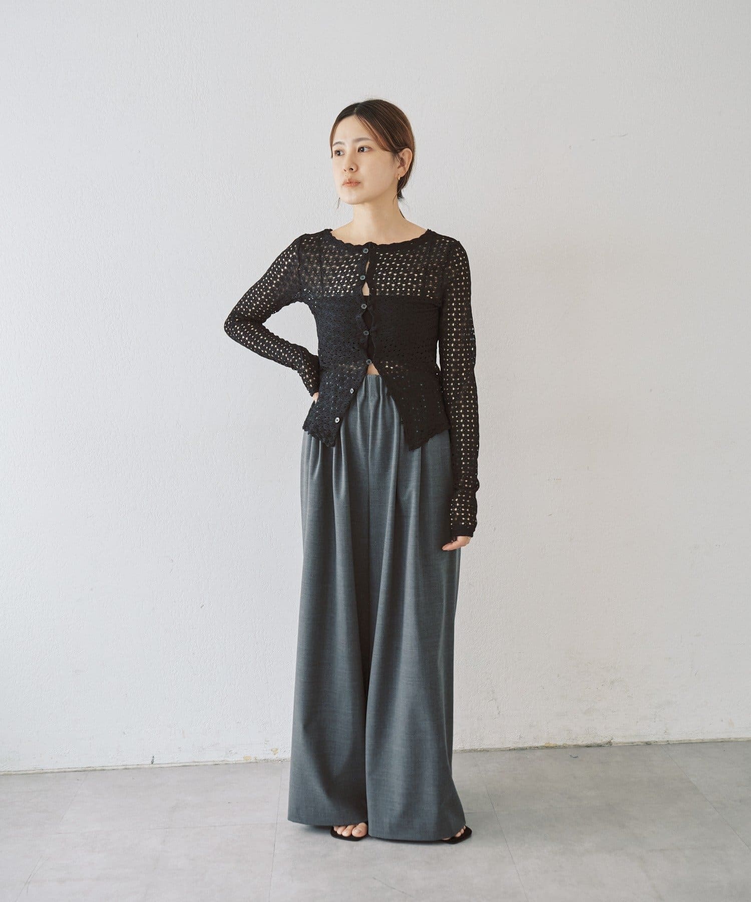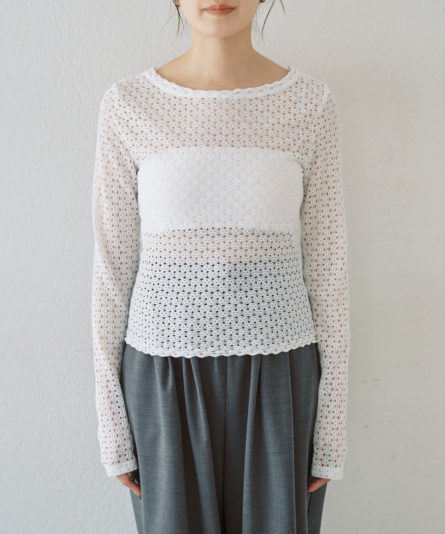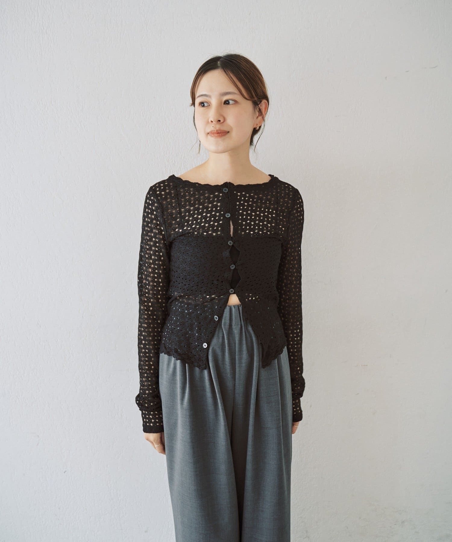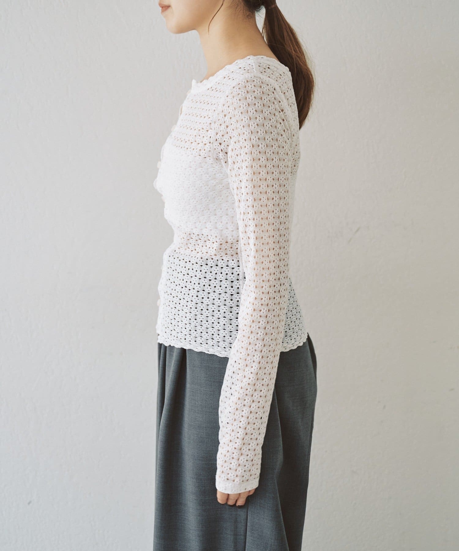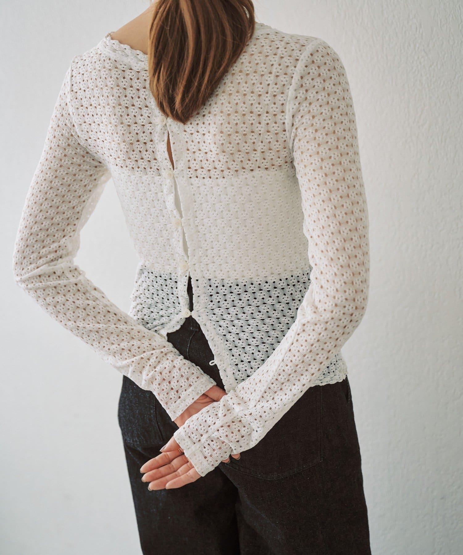 重ね着用にも1枚着にも、今シーズンつい手に取りたくなる、ウォッシャブルのレース編みトップスが完成しました。程よくフィット感のあるストレッチレースのカットソー生地がボディラインを優しく綺麗に拾うので、着痩せ効果も叶う嬉しい1着です。