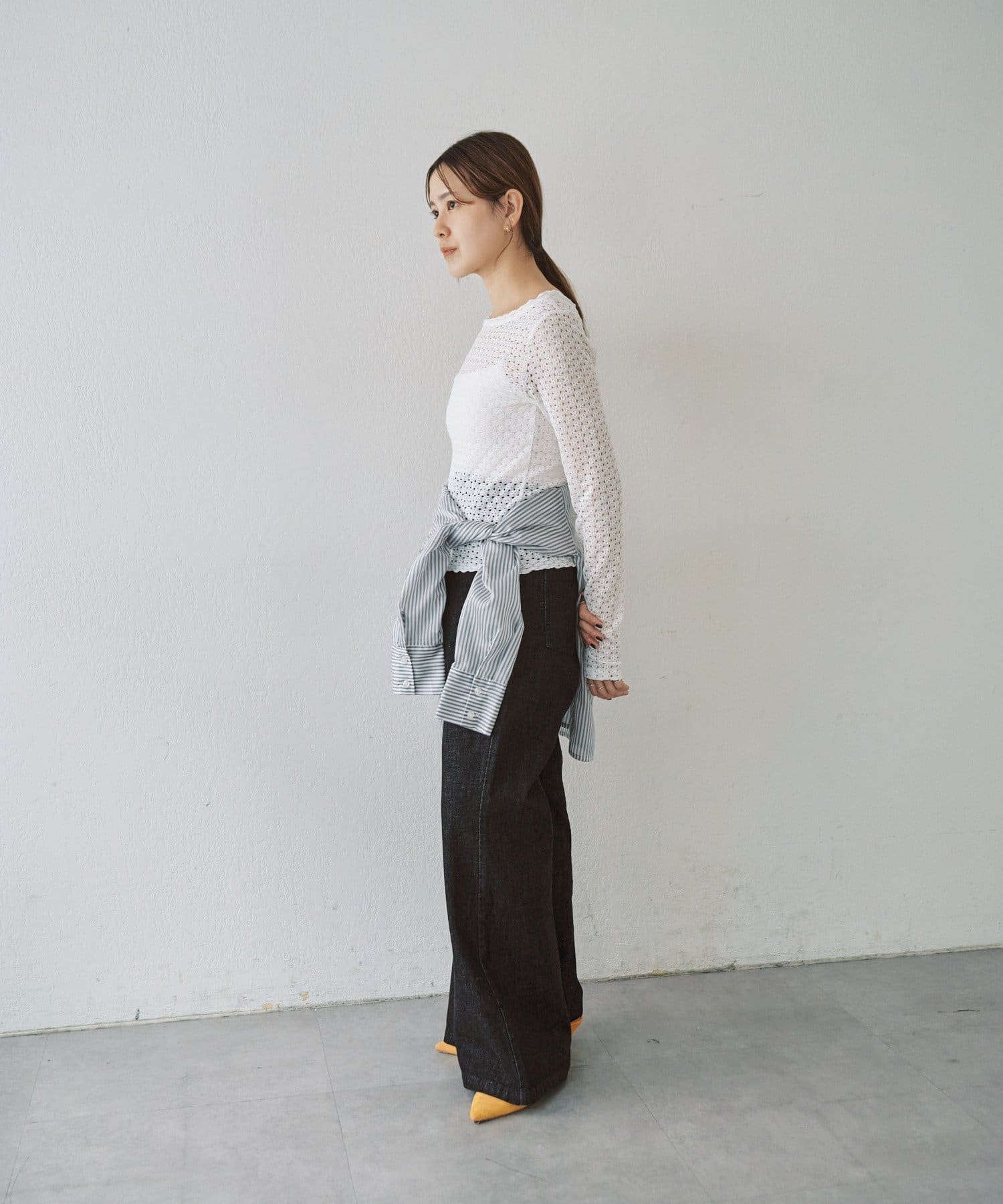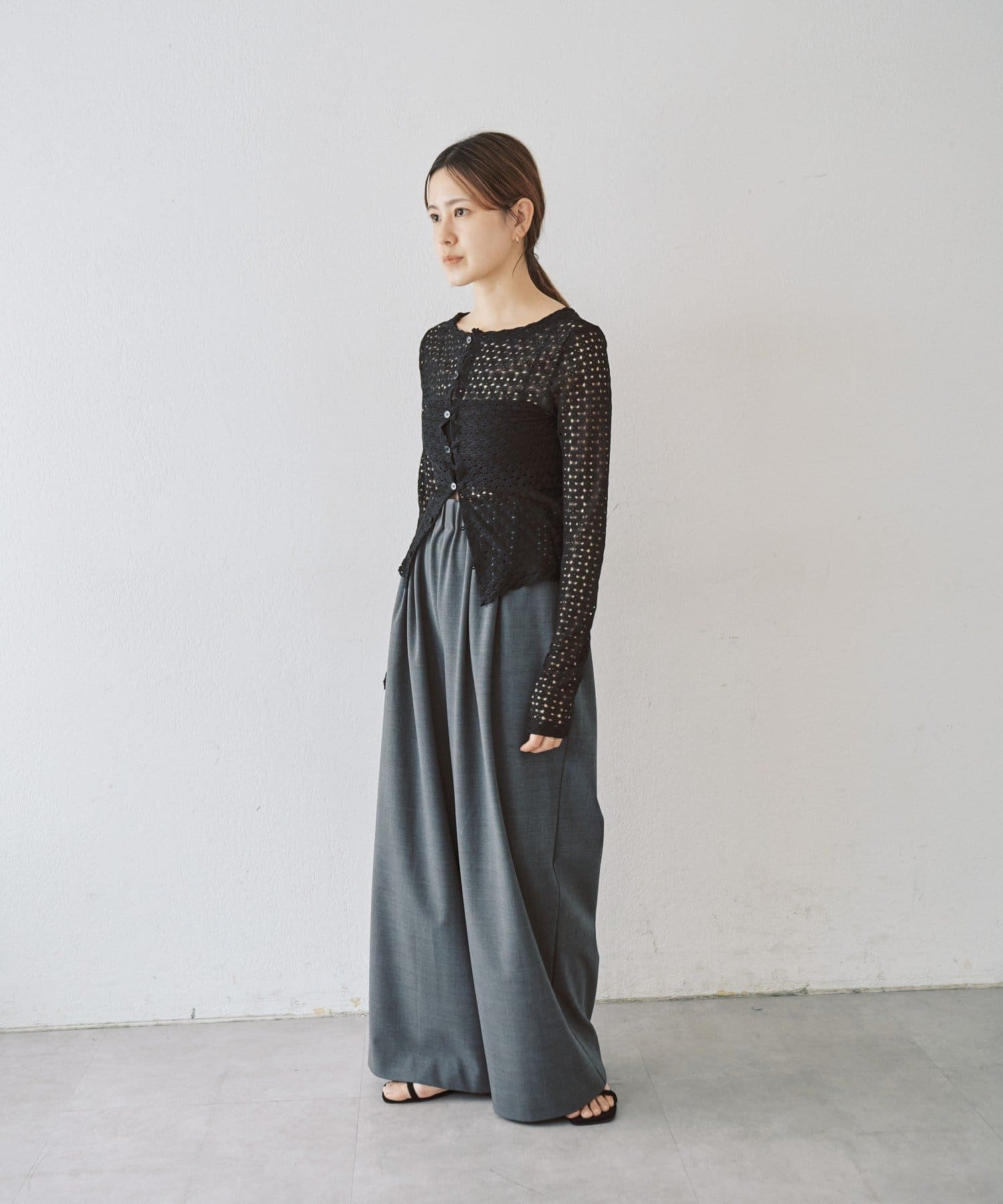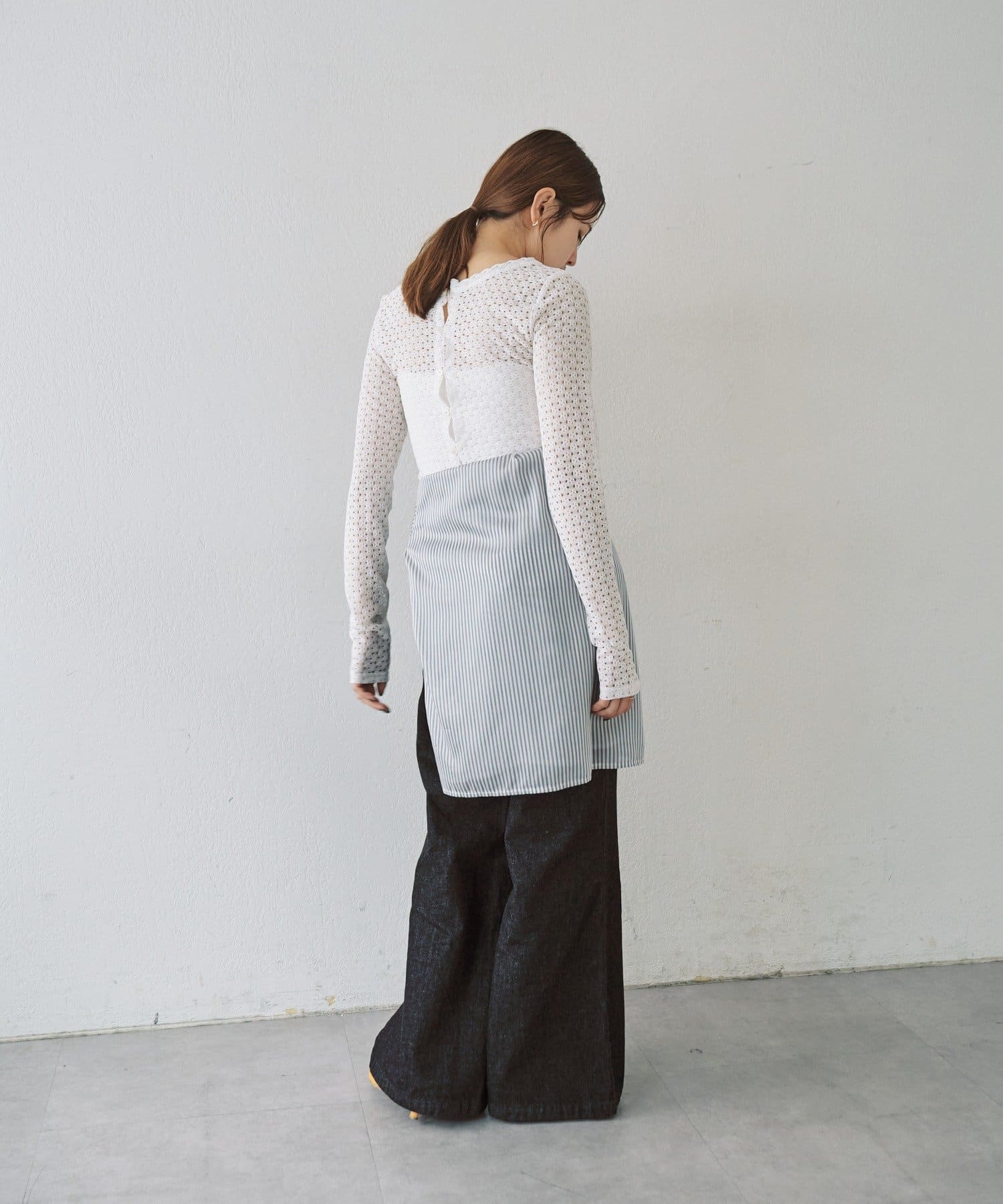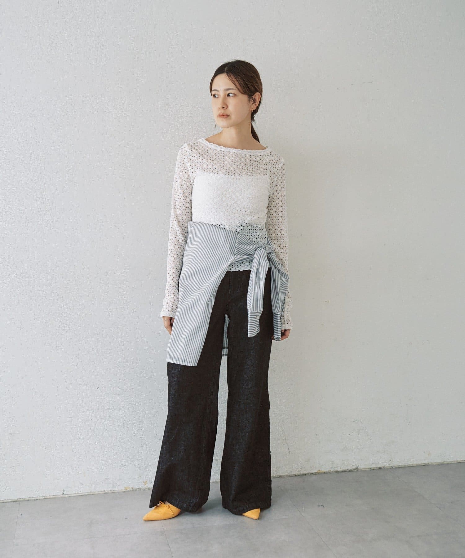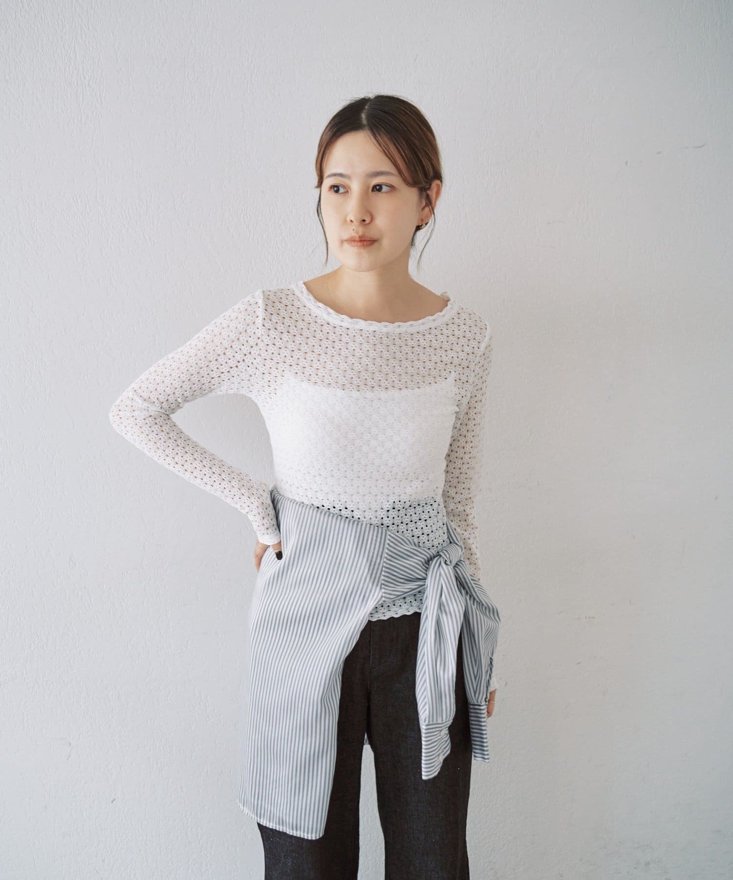 ジャンパースカートやサロペットとの相性が良く、スタイリングにレースの透け感や女性らしさをプラスしたい時に活躍します。