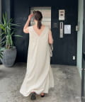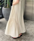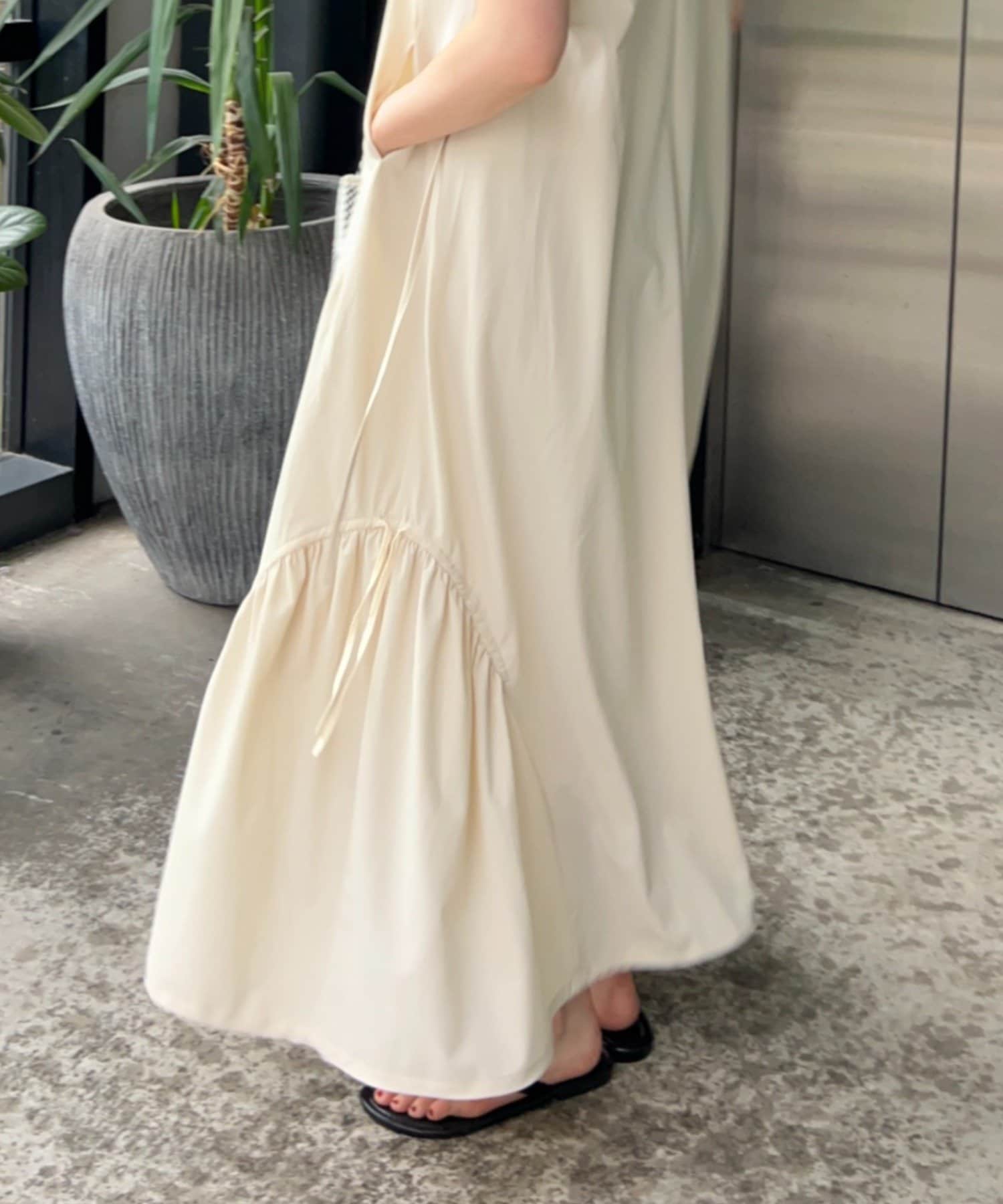 「160cmのわたしで、引きずるか引きずらないかギリギリの絶妙な丈感が、フラットサンダルと好相性。気分によって、サイドの紐で絞ってウエストラインを出せるのがポイントです。自宅でも、ちょっとしたお出かけにも楽に着れて、なのにお洒落見えが叶う気の利いた嬉しいワンピース!」