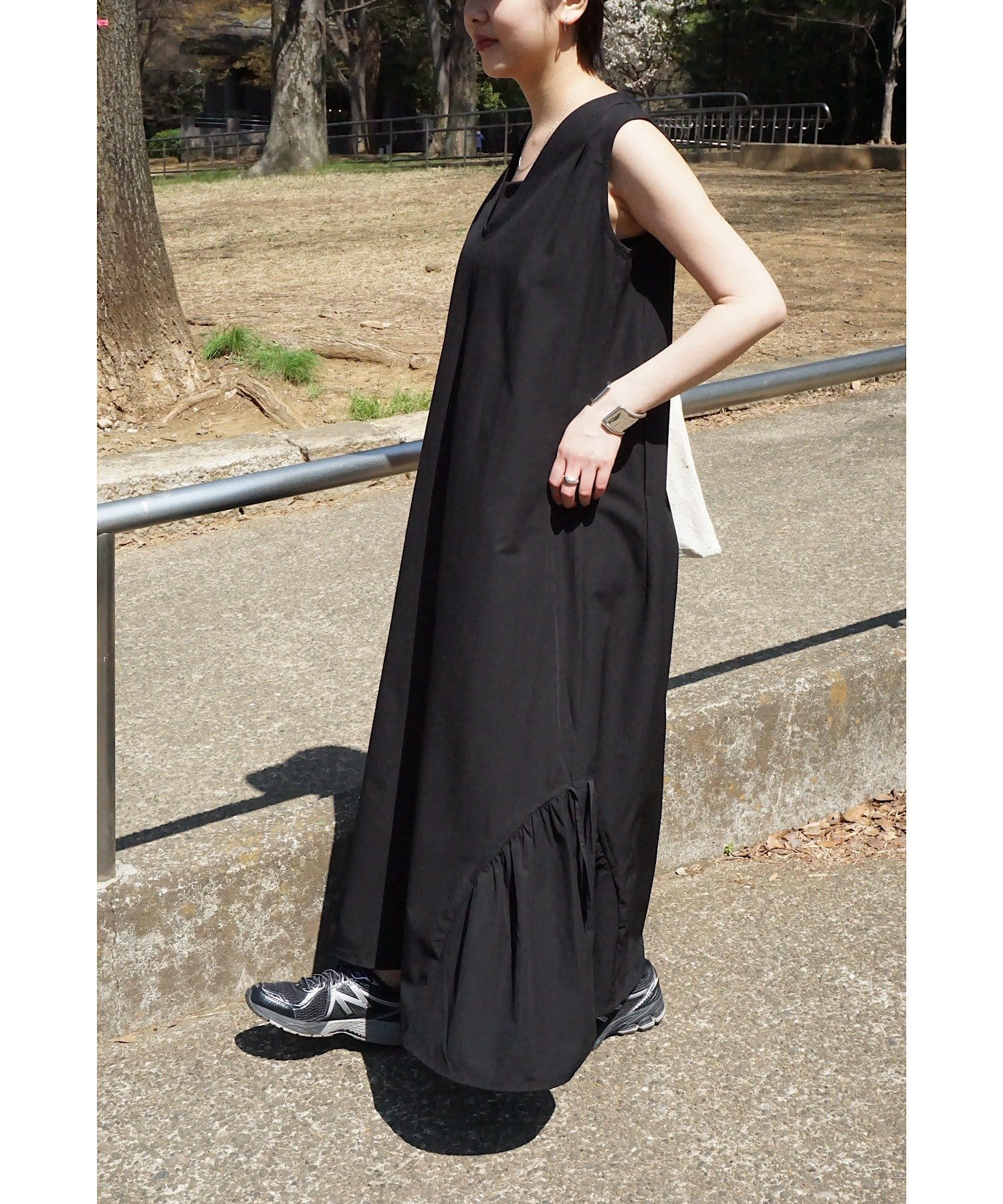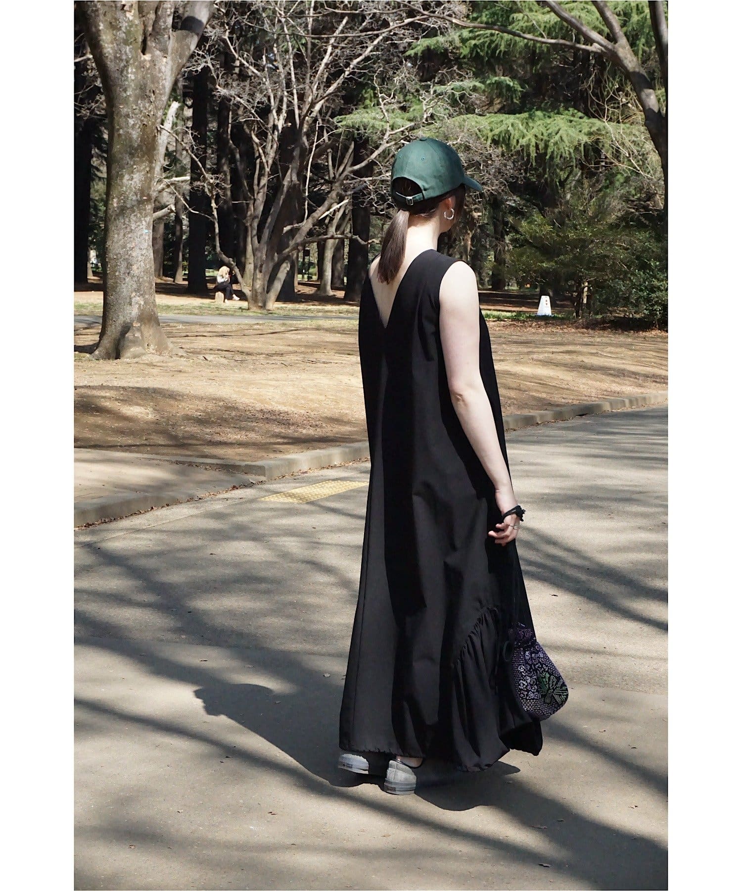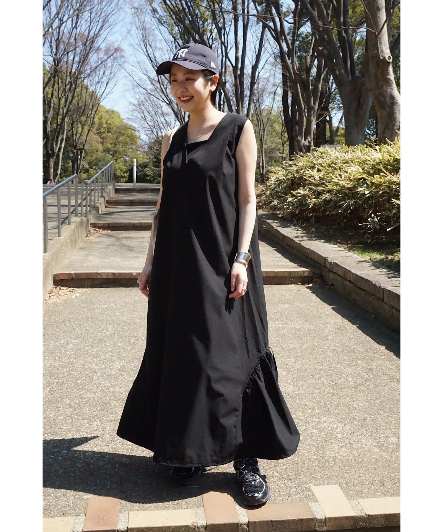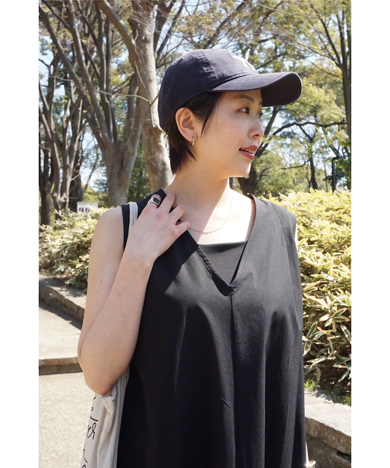 「背中がVあきで後ろ姿がスッキリ見えることと、ボディラインを拾わないテントラインのシルエットが、安心感があり嬉しいポイント。アクティブな日に着たいイメージだったので、キャップとスニーカーを合わせてコーディネートしてみました!」