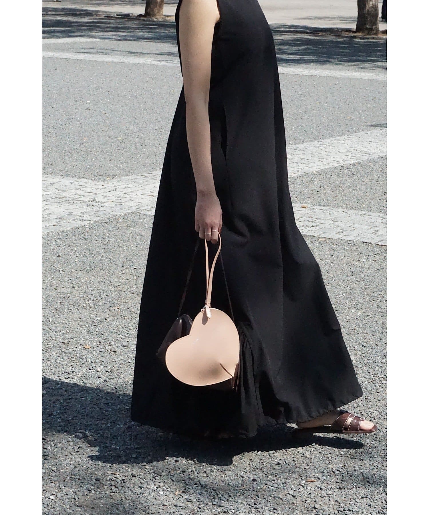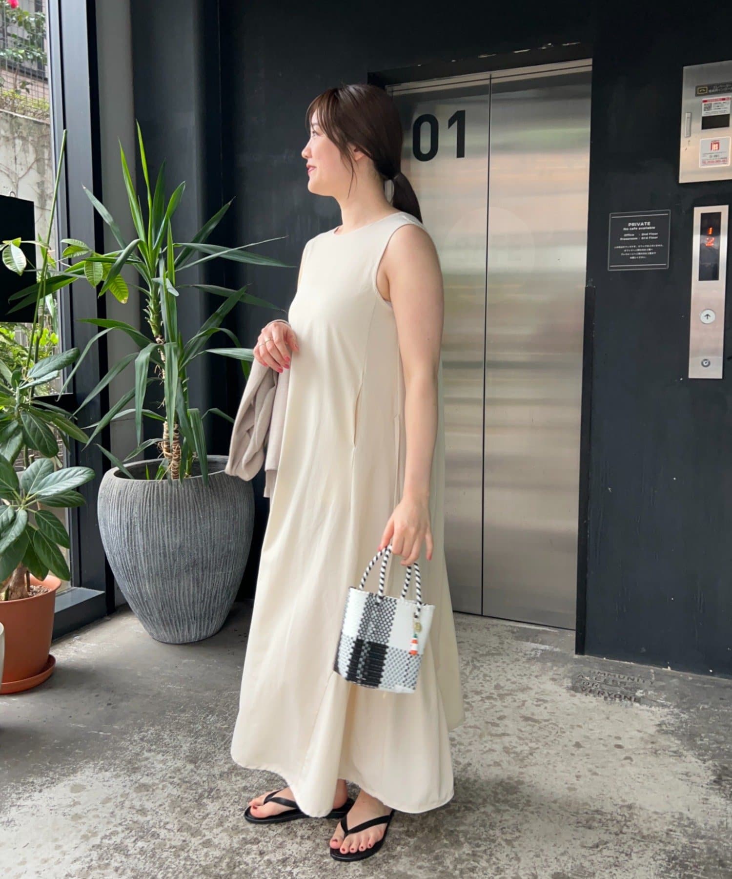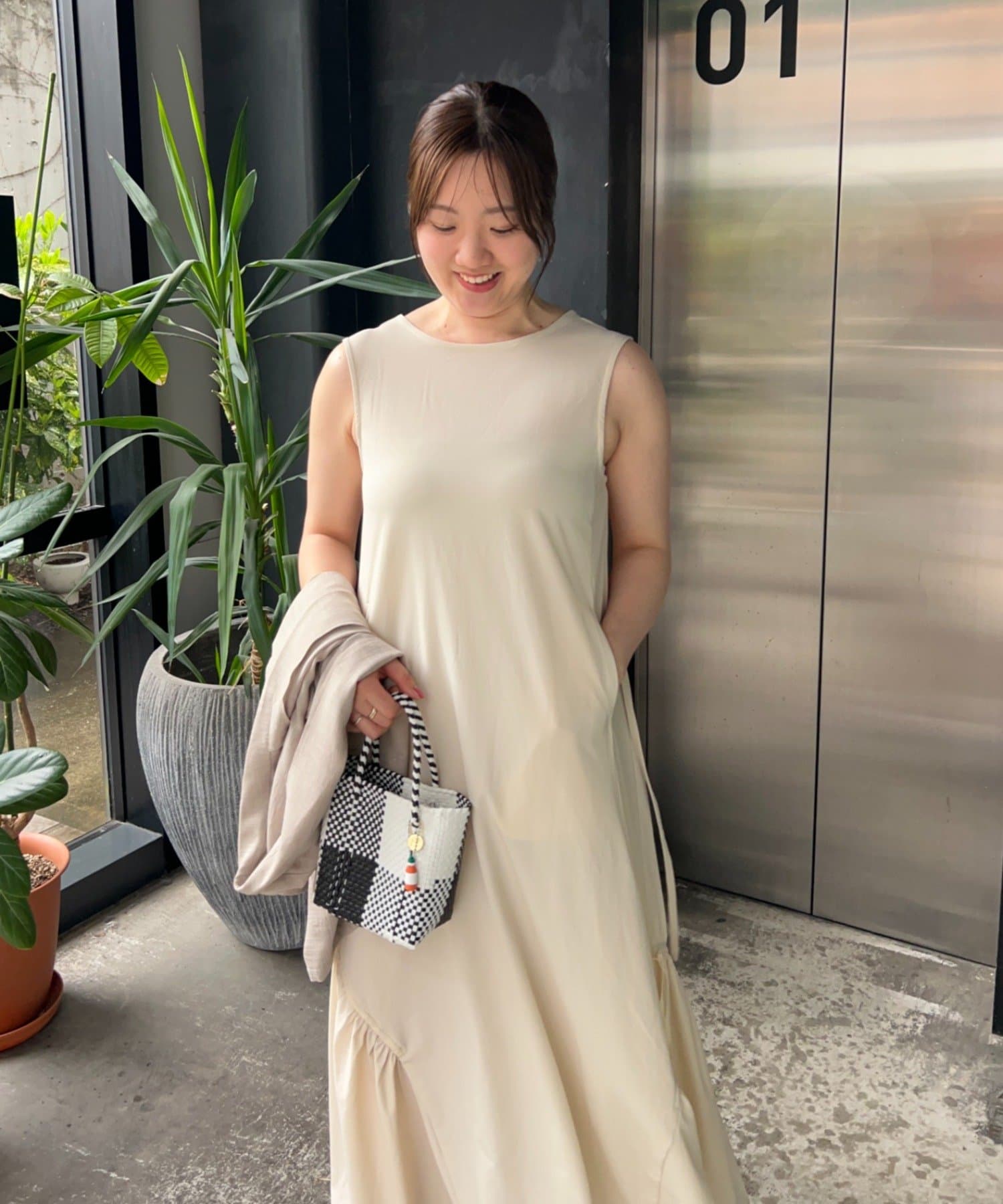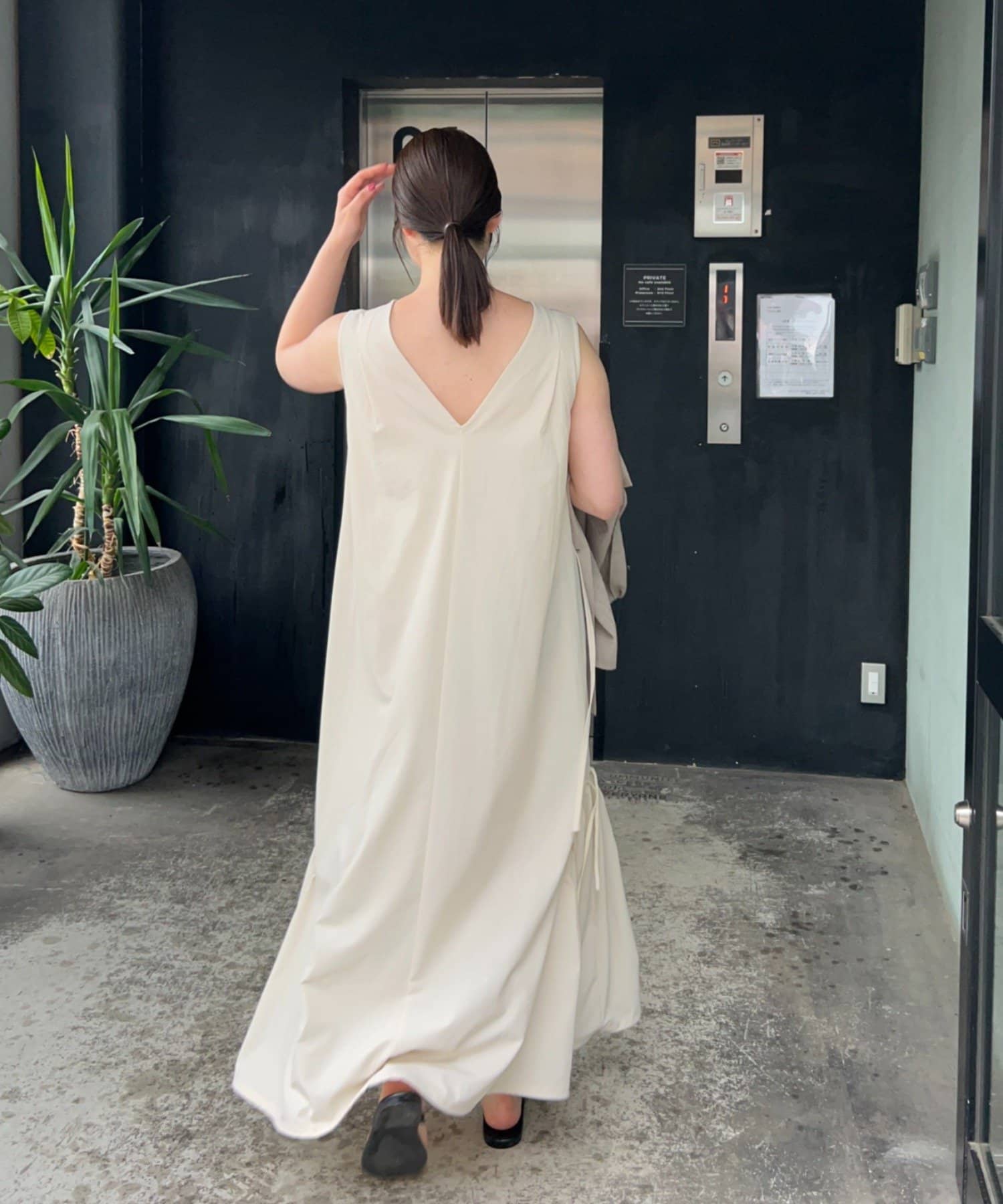 「背中がVあきで後ろ姿がスッキリ見えることと、ボディラインを拾わないテントラインのシルエットが、安心感があり嬉しいポイント。アクティブな日に着たいイメージだったので、キャップとスニーカーを合わせてコーディネートしてみました!」