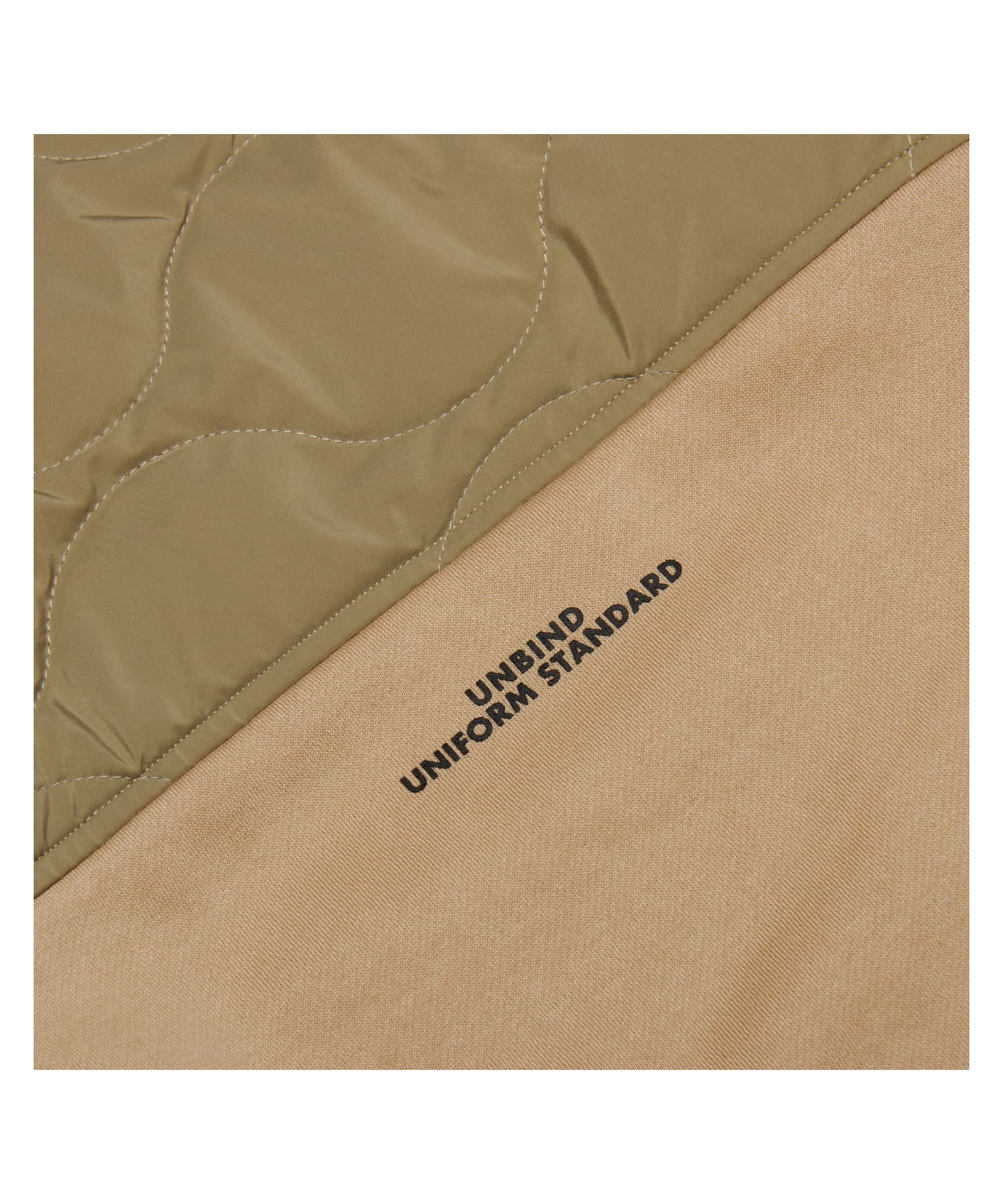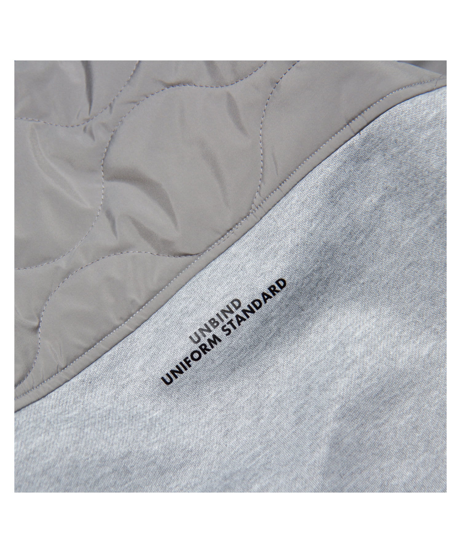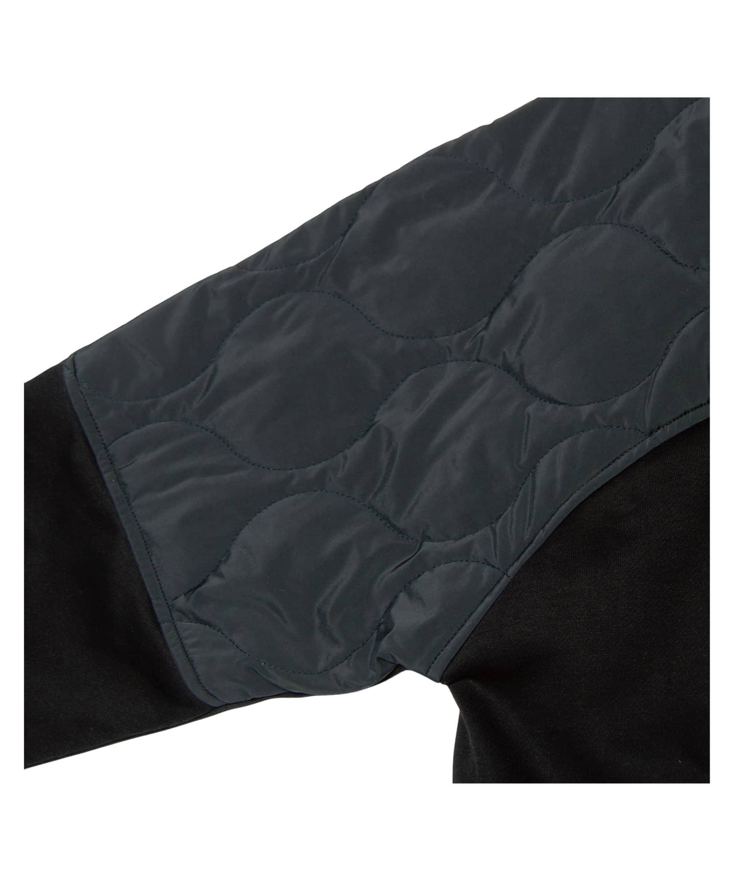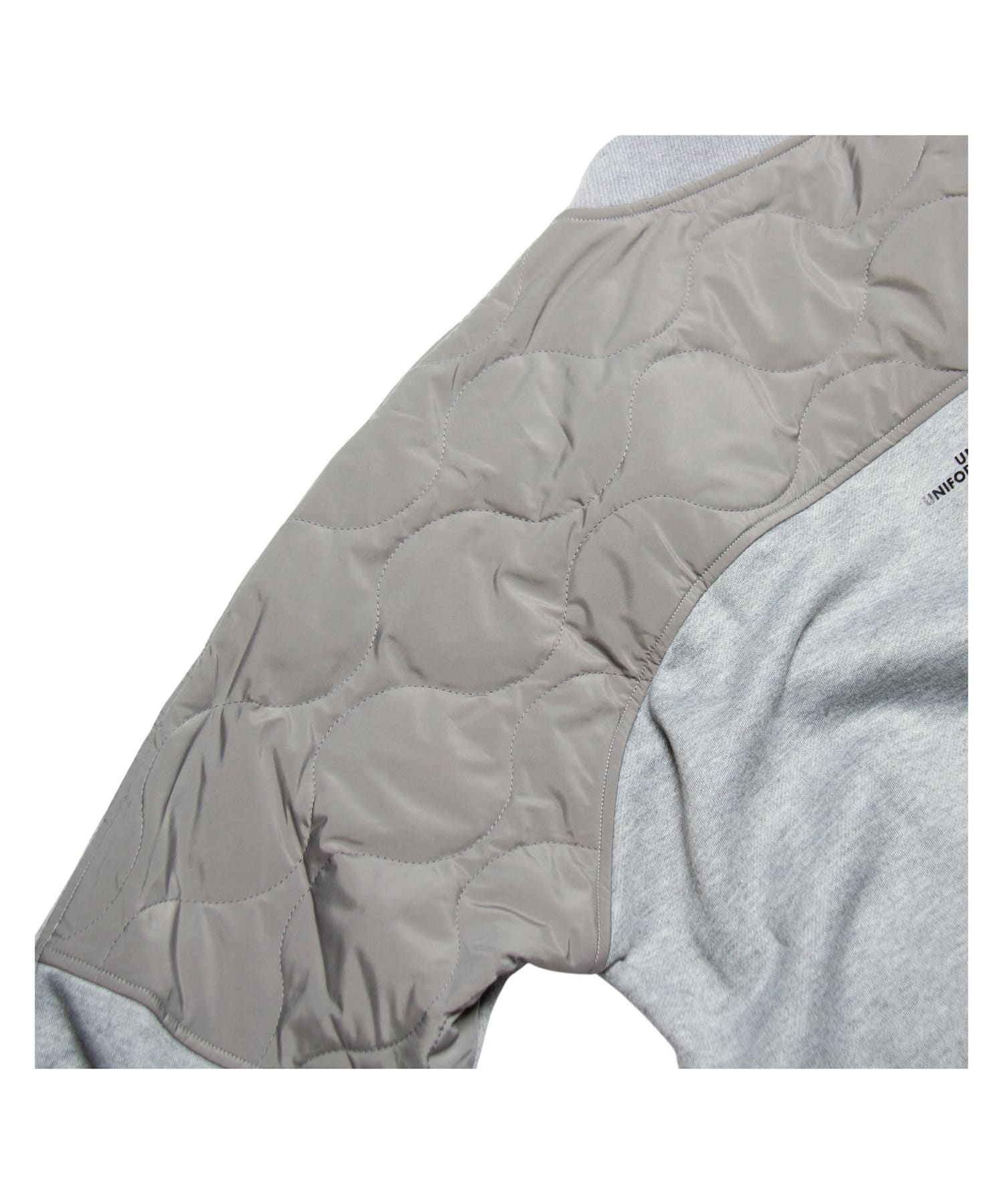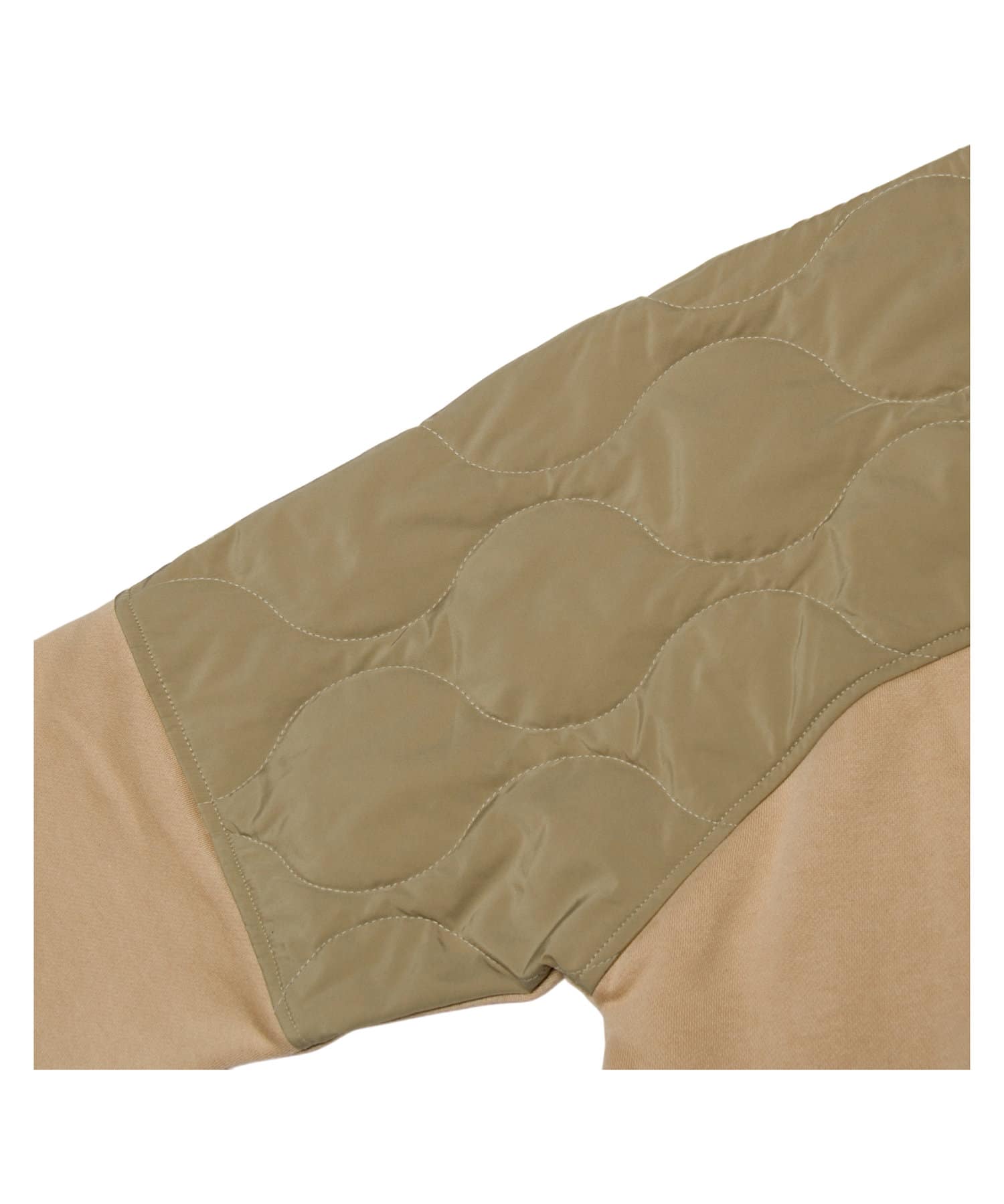 ややルーズなシルエットを描くスウェットの上部後ろ身頃を、 ミリタリーライクなひょうたんキルティングで切り替え。
