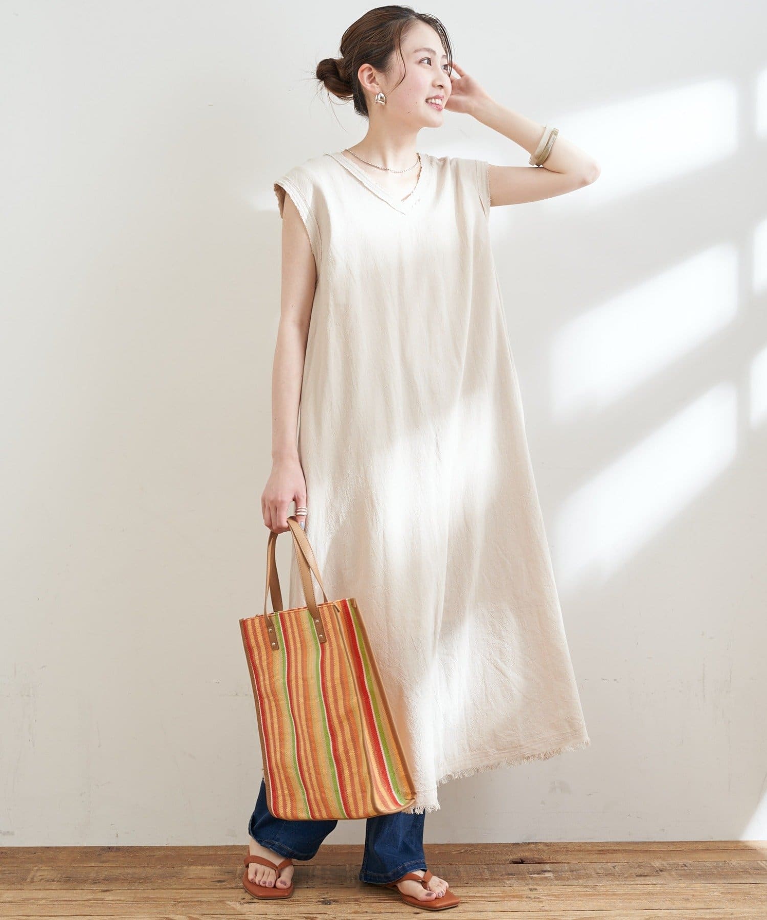 ゆったりとしたシルエットで夏のリラックススタイルにもおすすめ。
