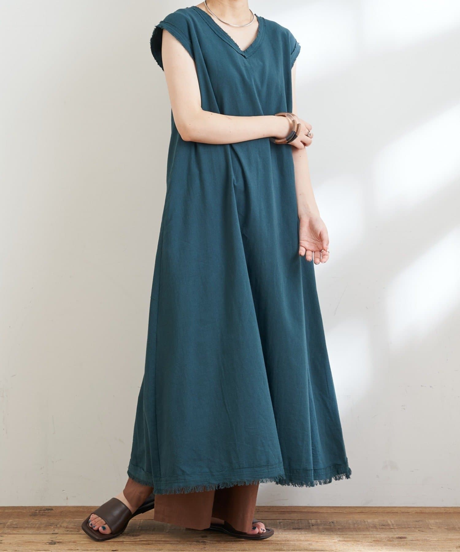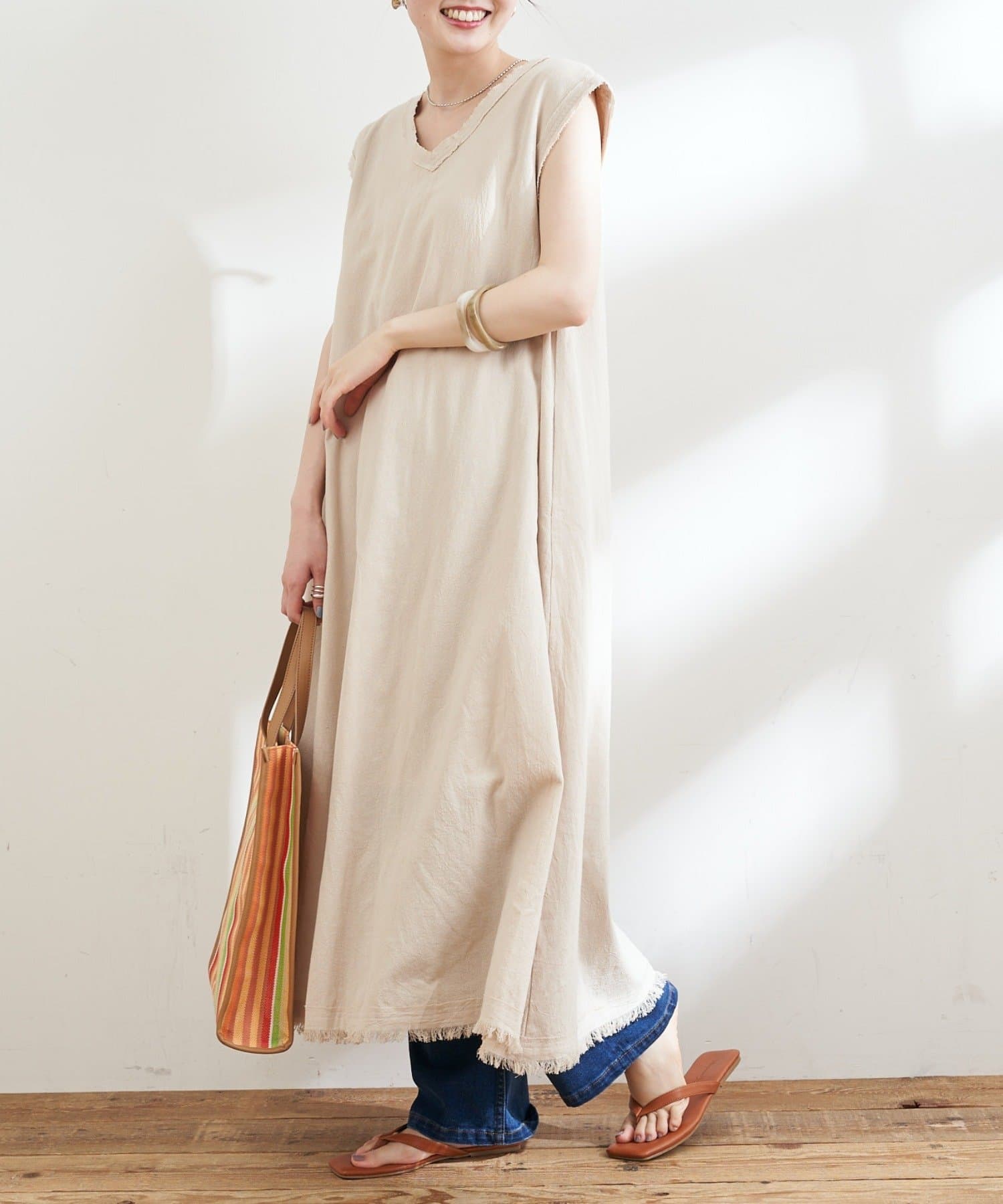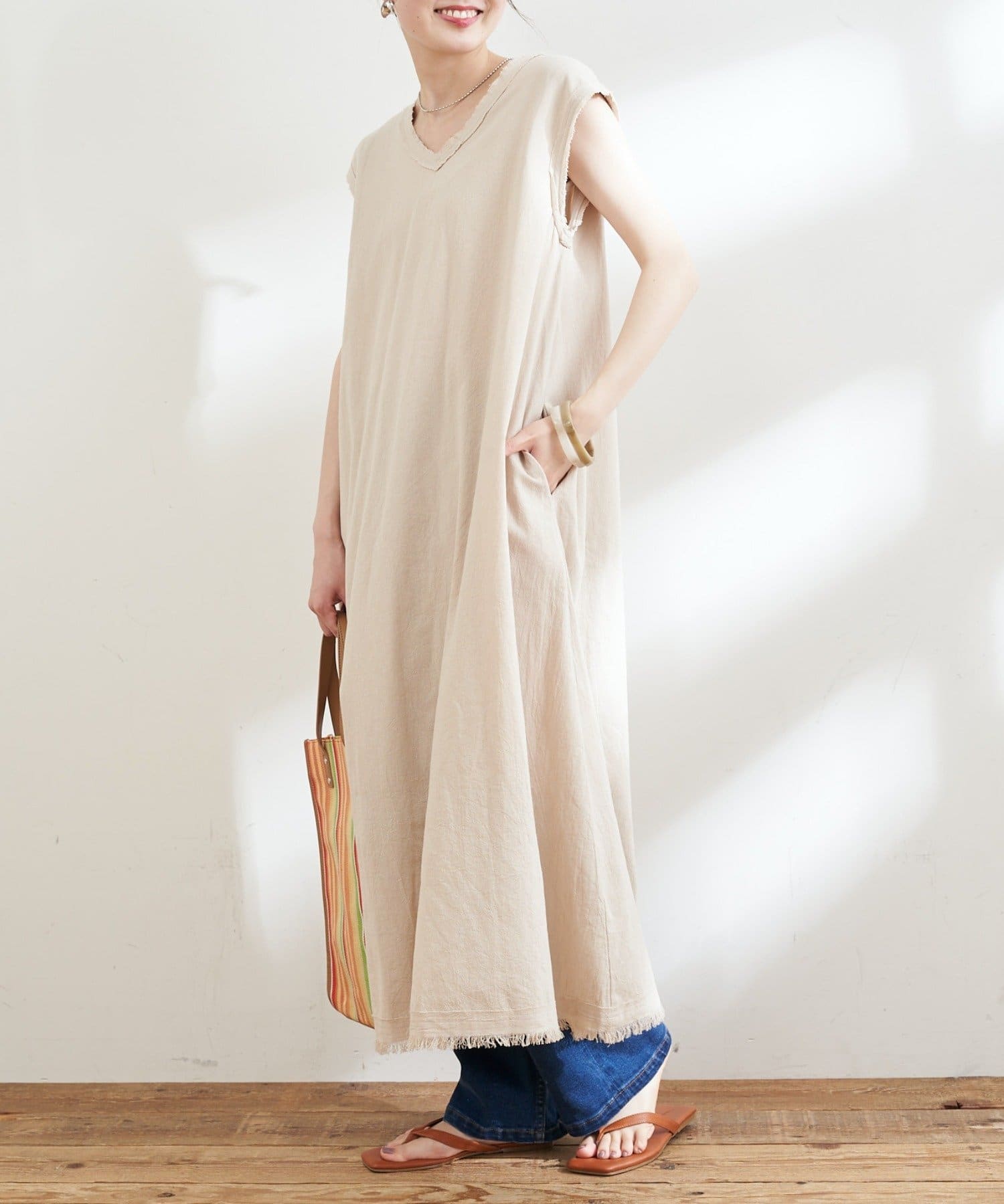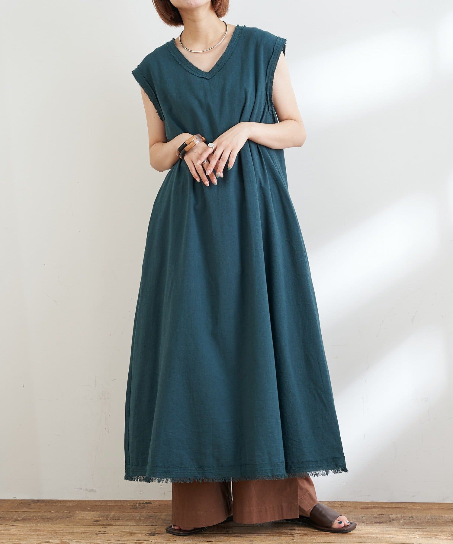 裾や首元、袖口にあしらわれたフリンジデザインで抜け感もプラスしてくれます。