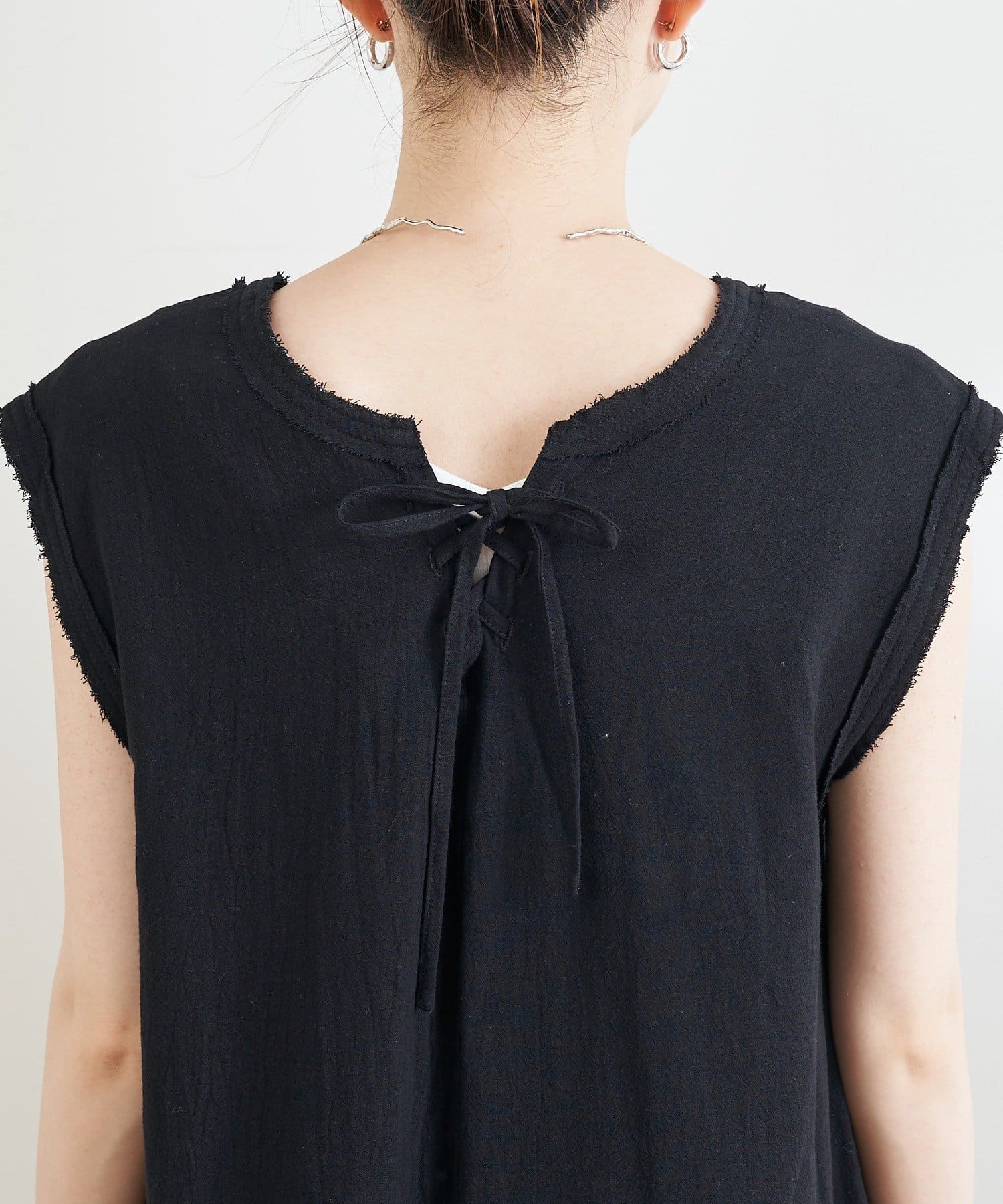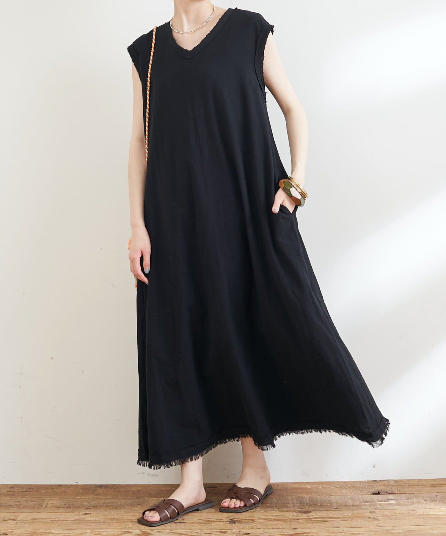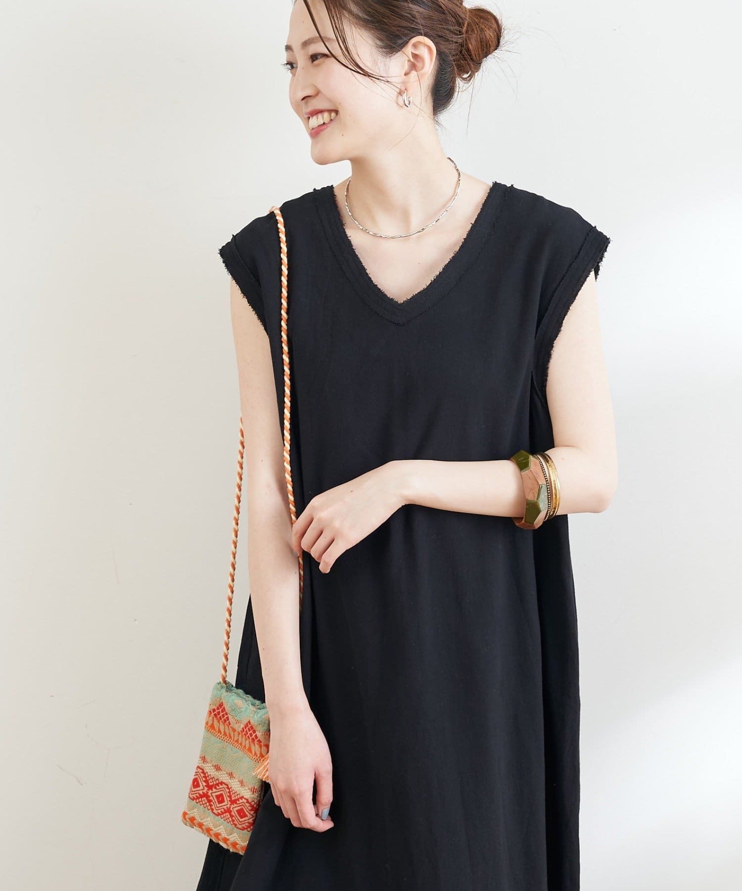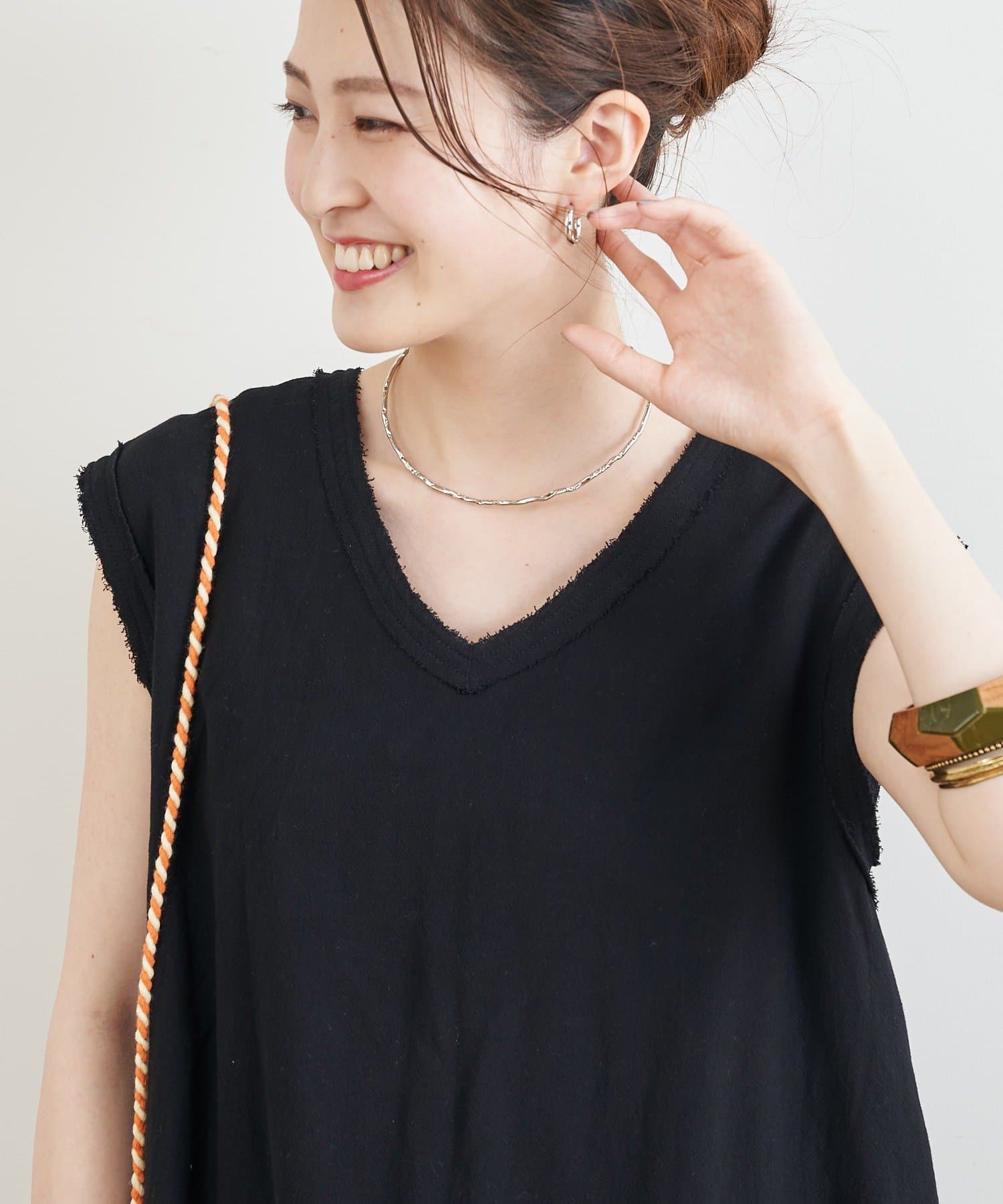 シンプルなデザインなので、ネックレスやバングルなどの小物をプラスしてアレンジを楽しめます。