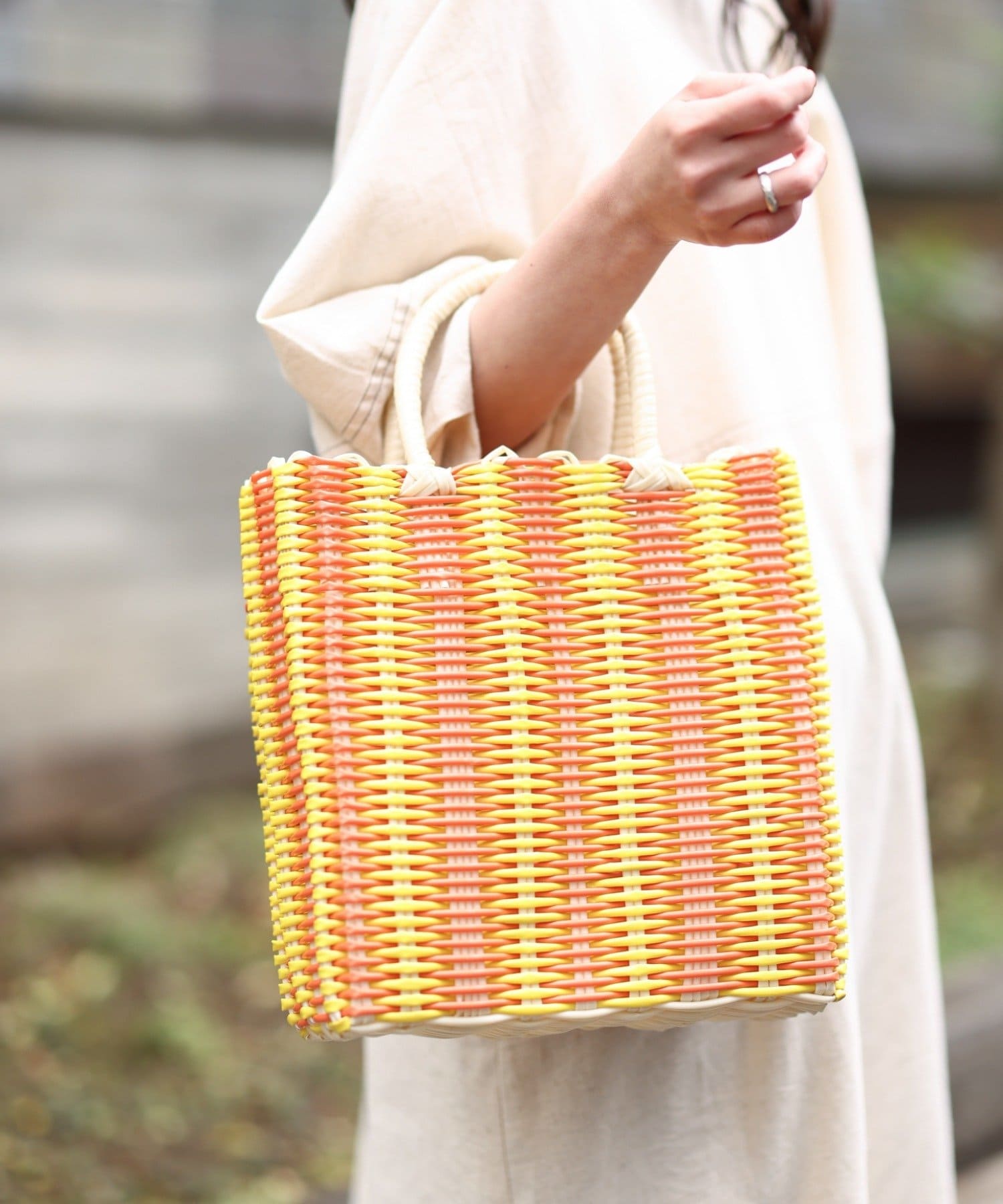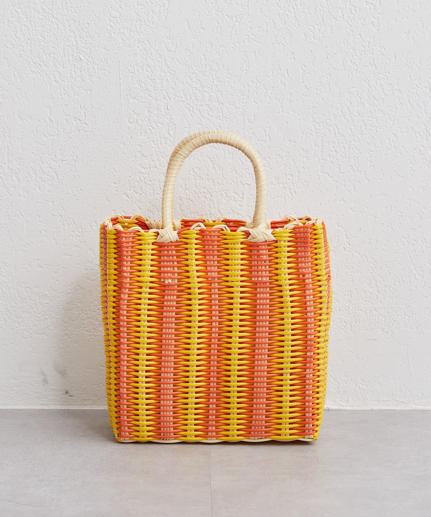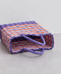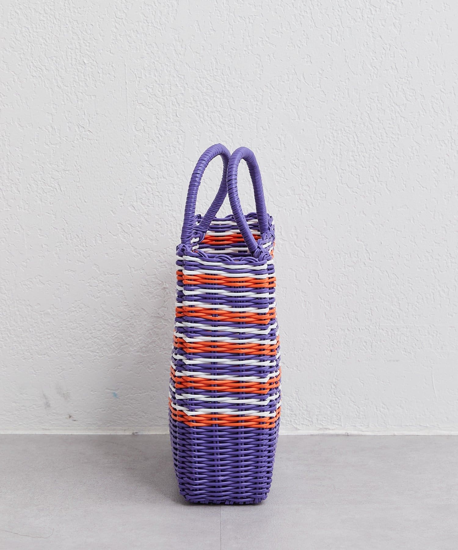 カラフルな配色が目を引く春夏らしいバスケット風のトートバッグ。