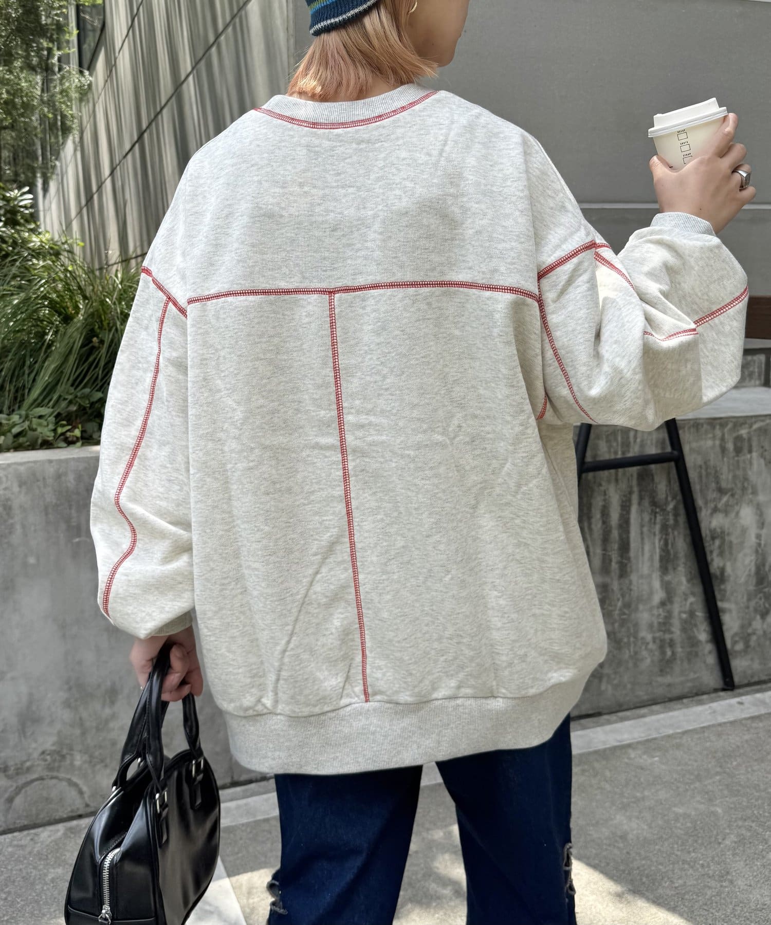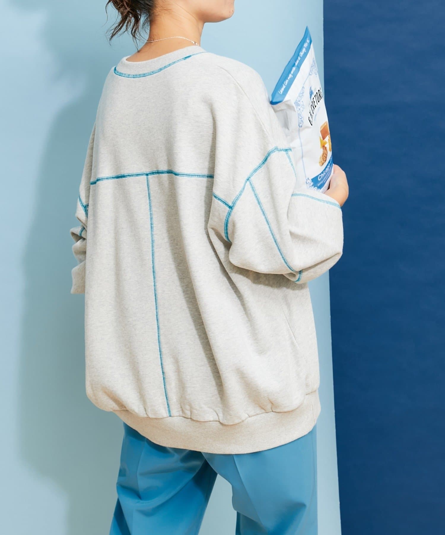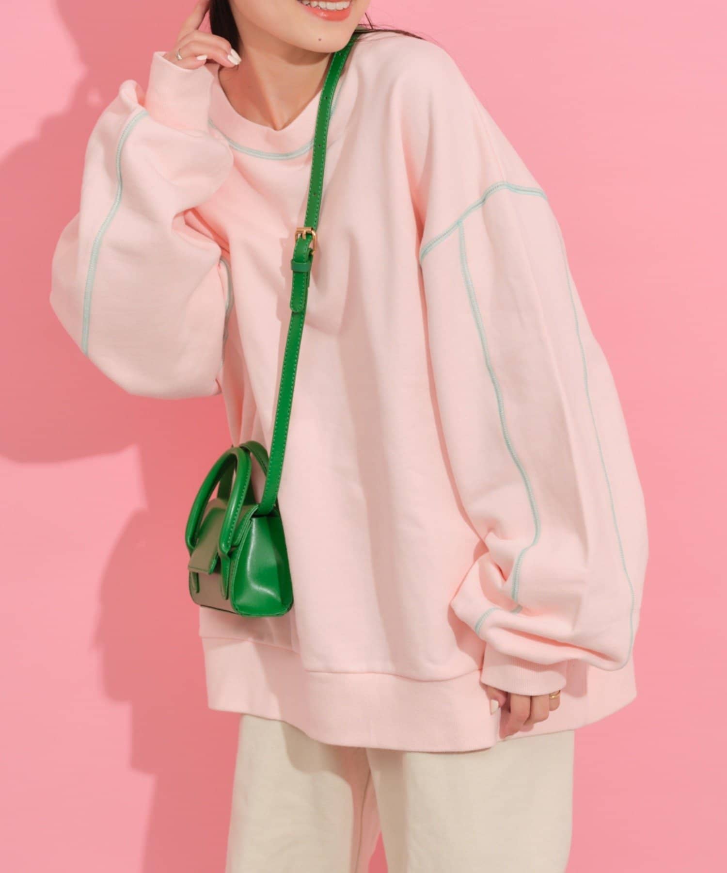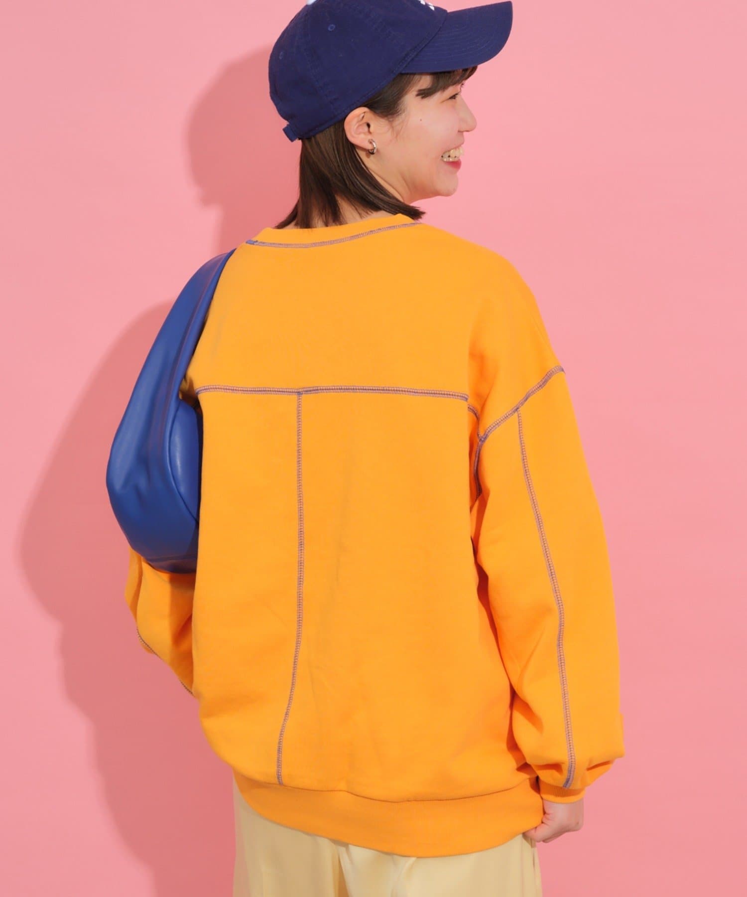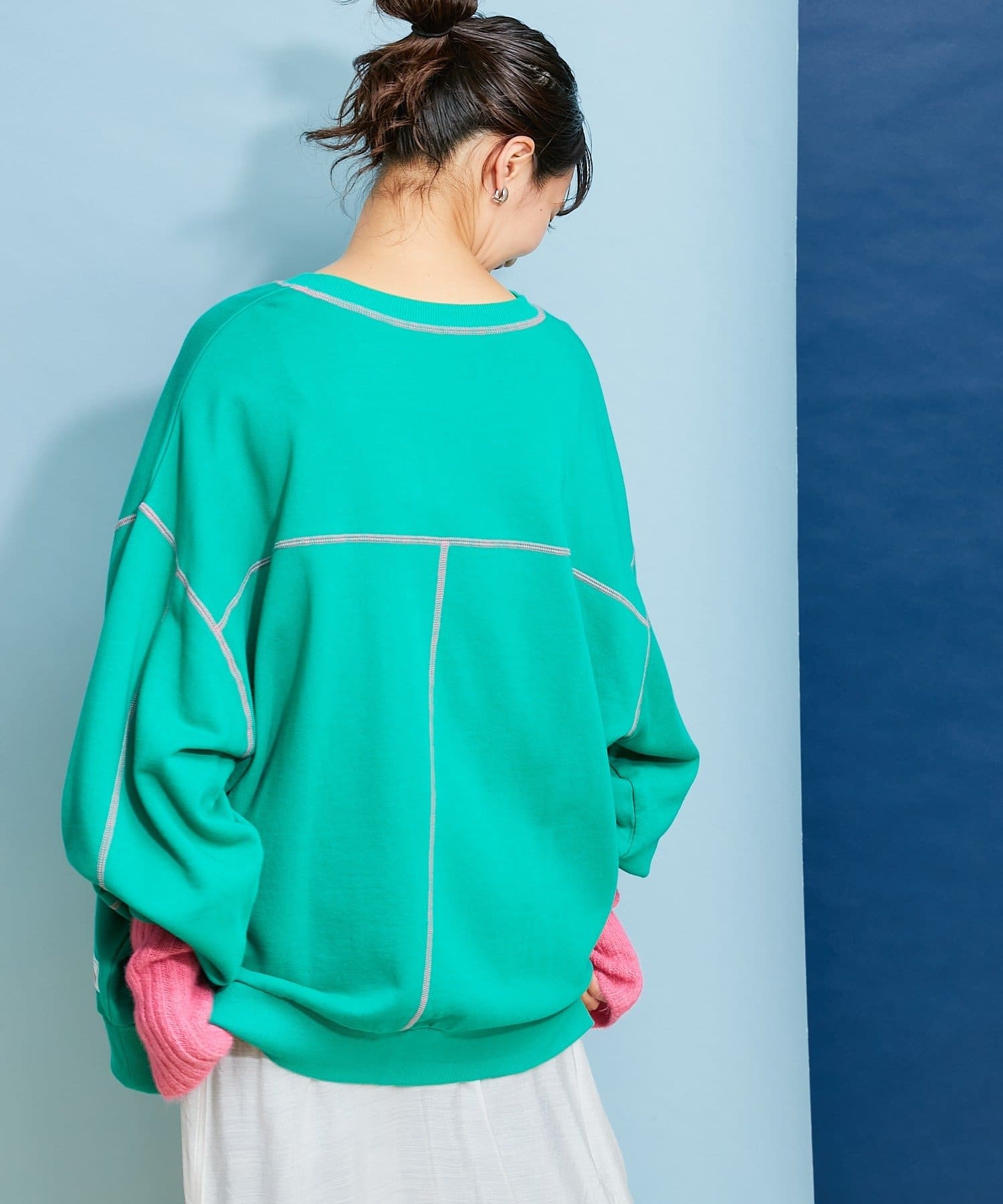配色ステッチデザインが目を惹くトレンドライクなオーバーサイズプルオーバー。