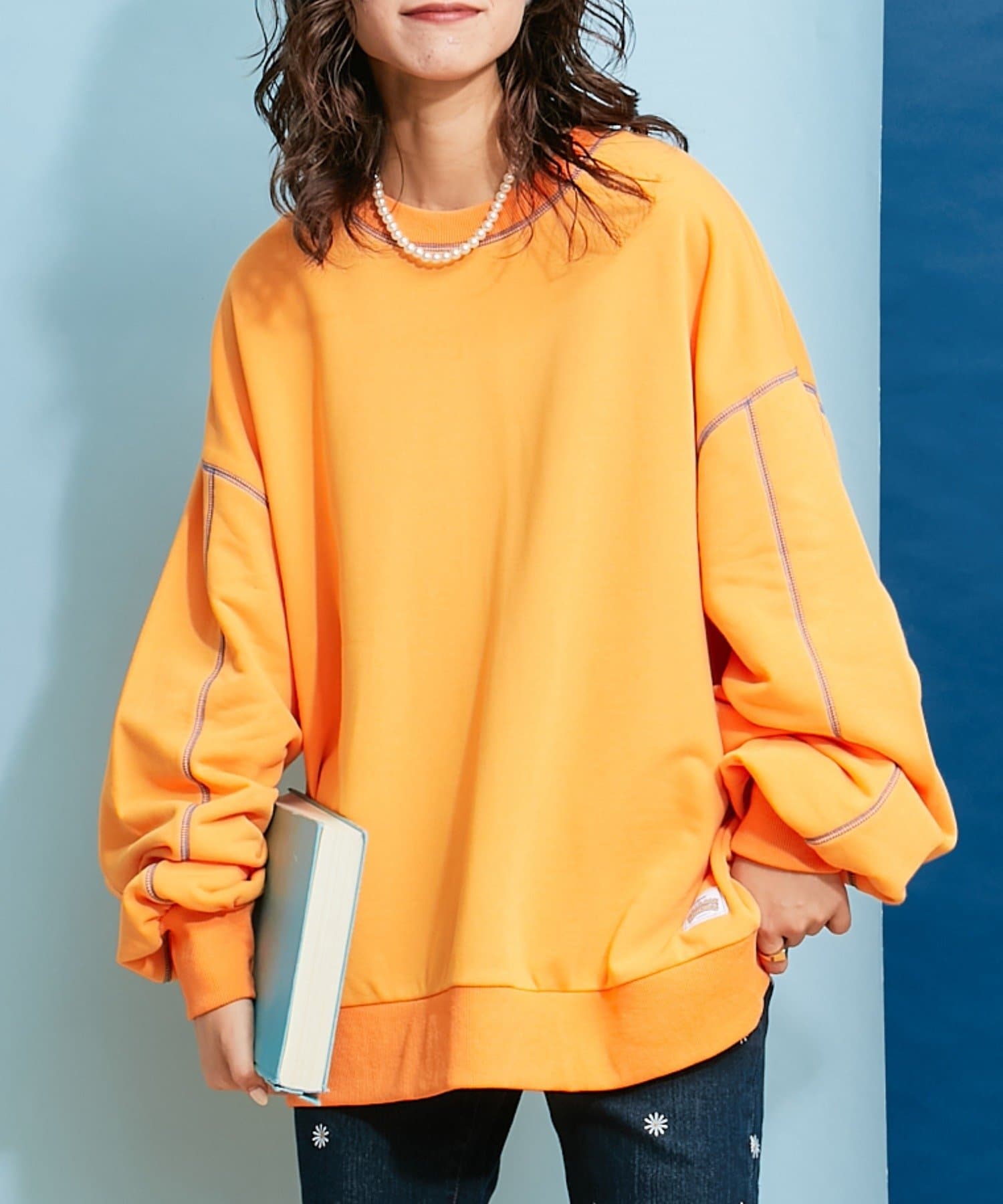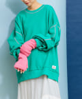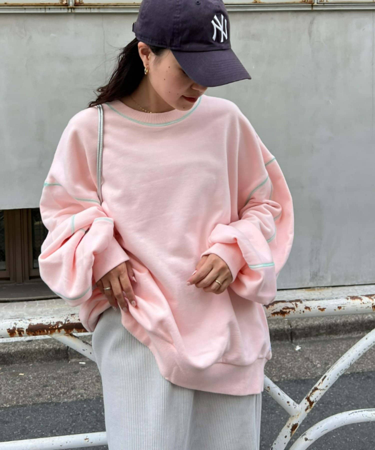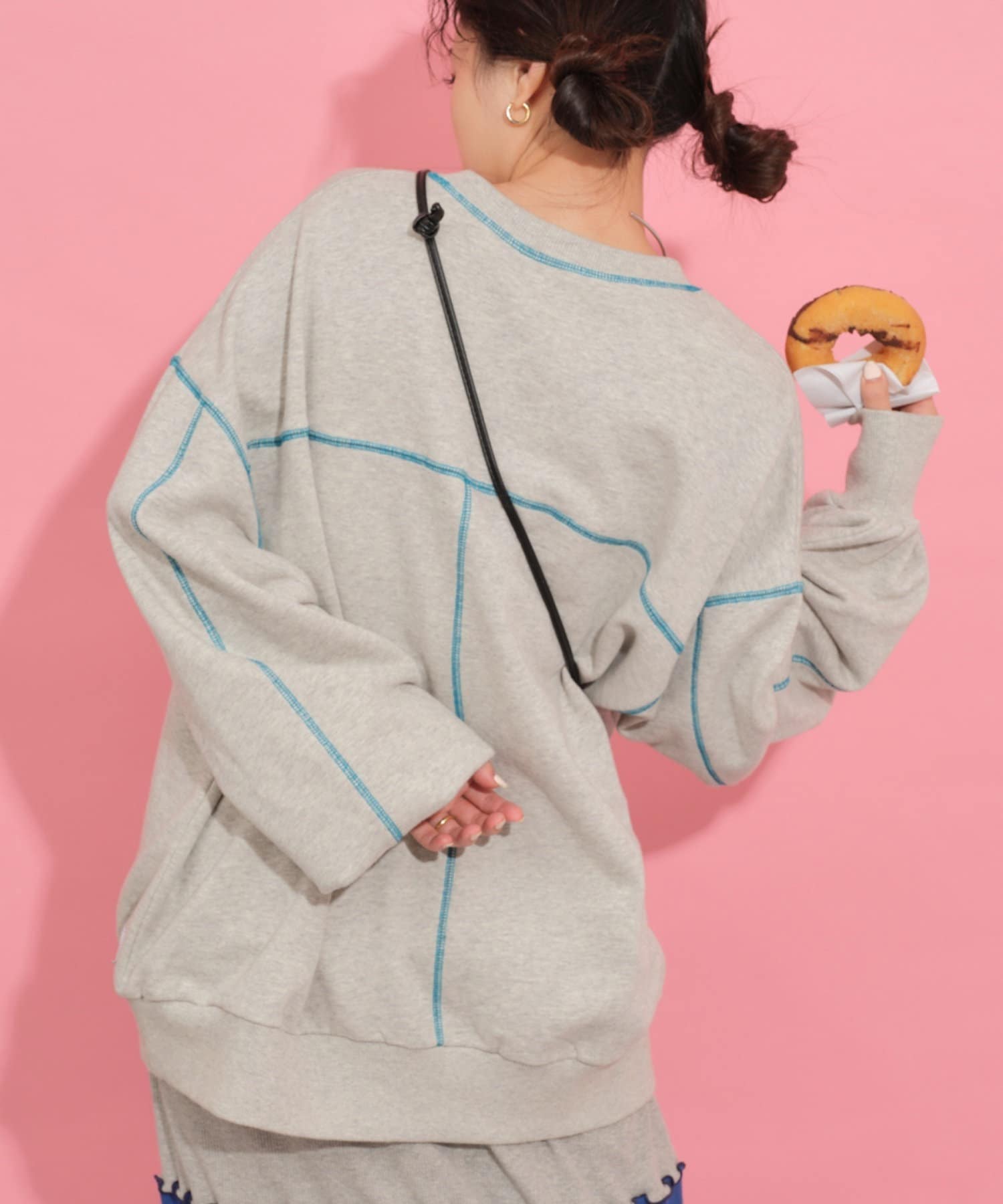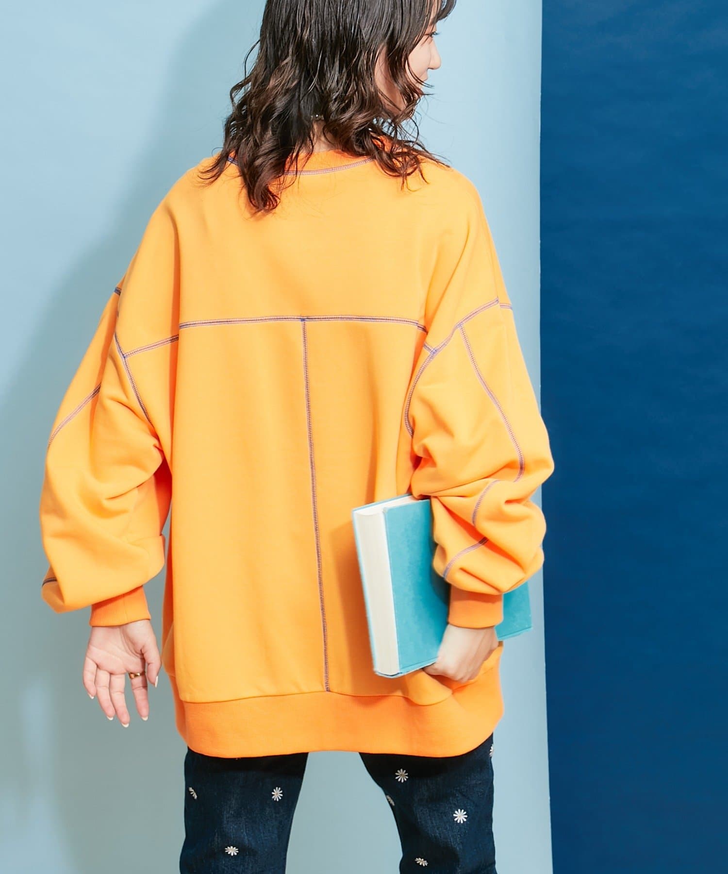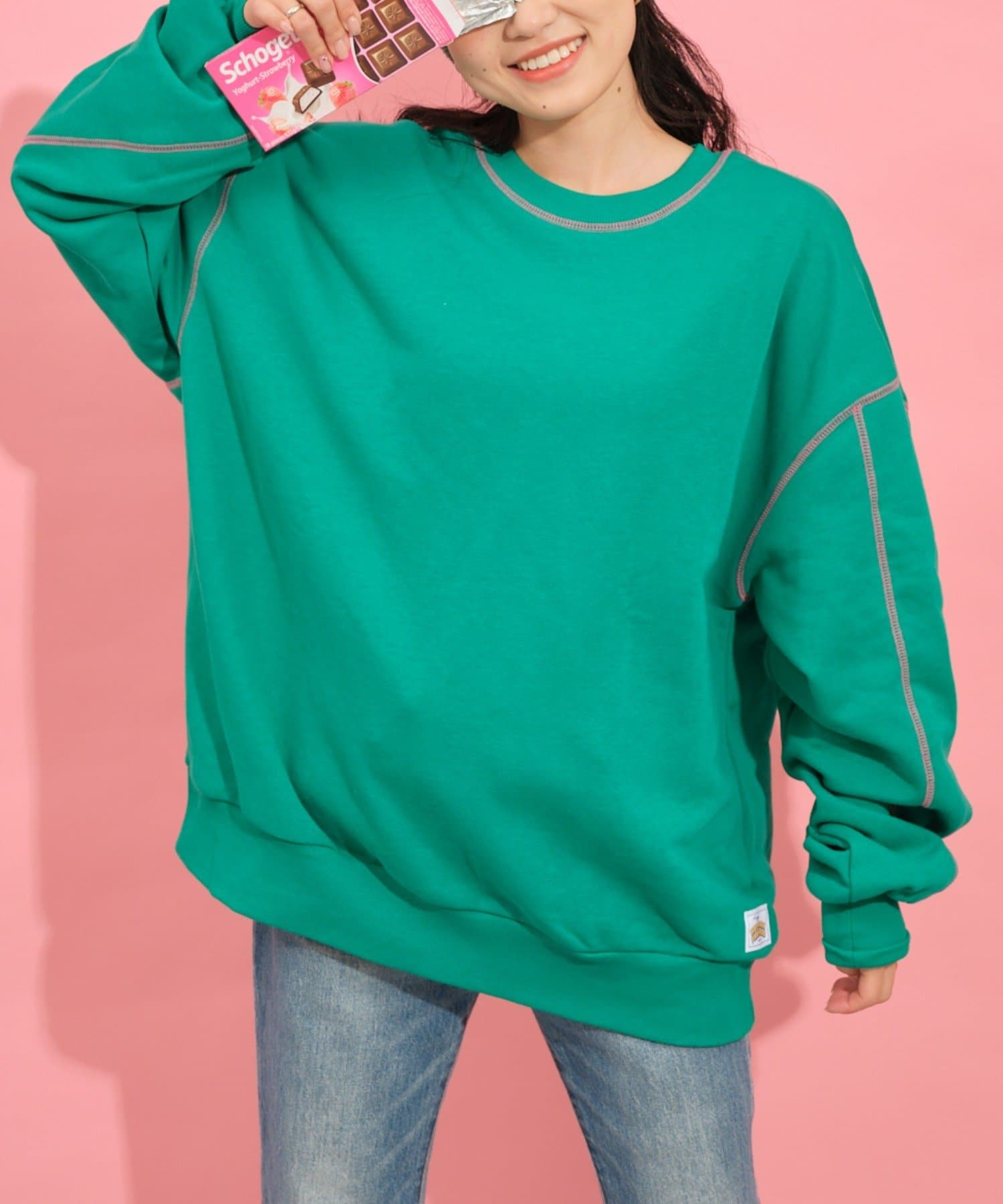 配色ステッチデザインが目を惹くトレンドライクなオーバーサイズプルオーバー。