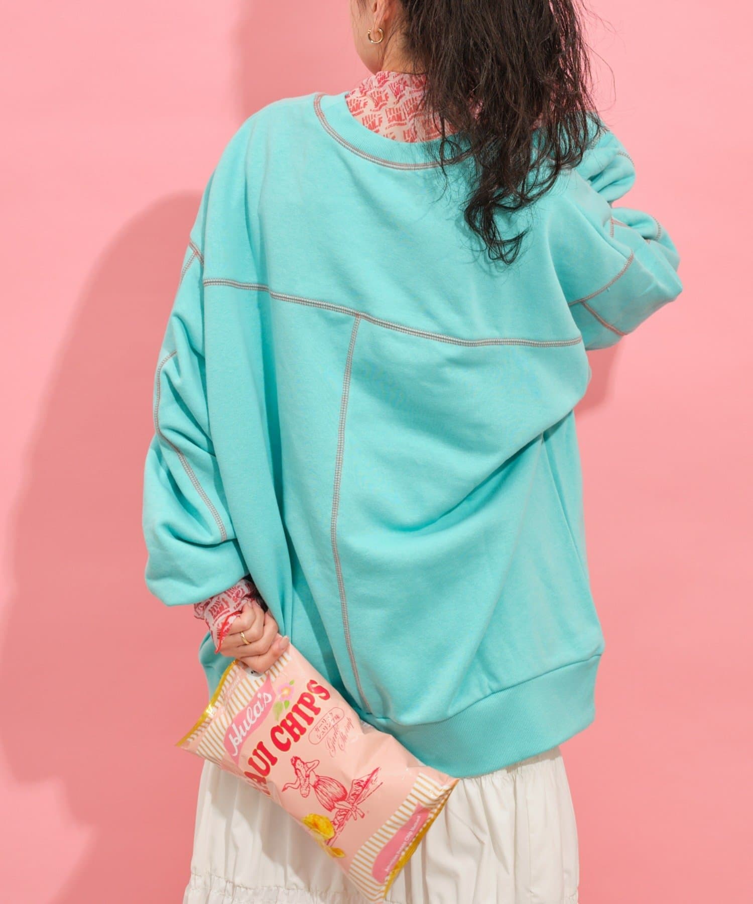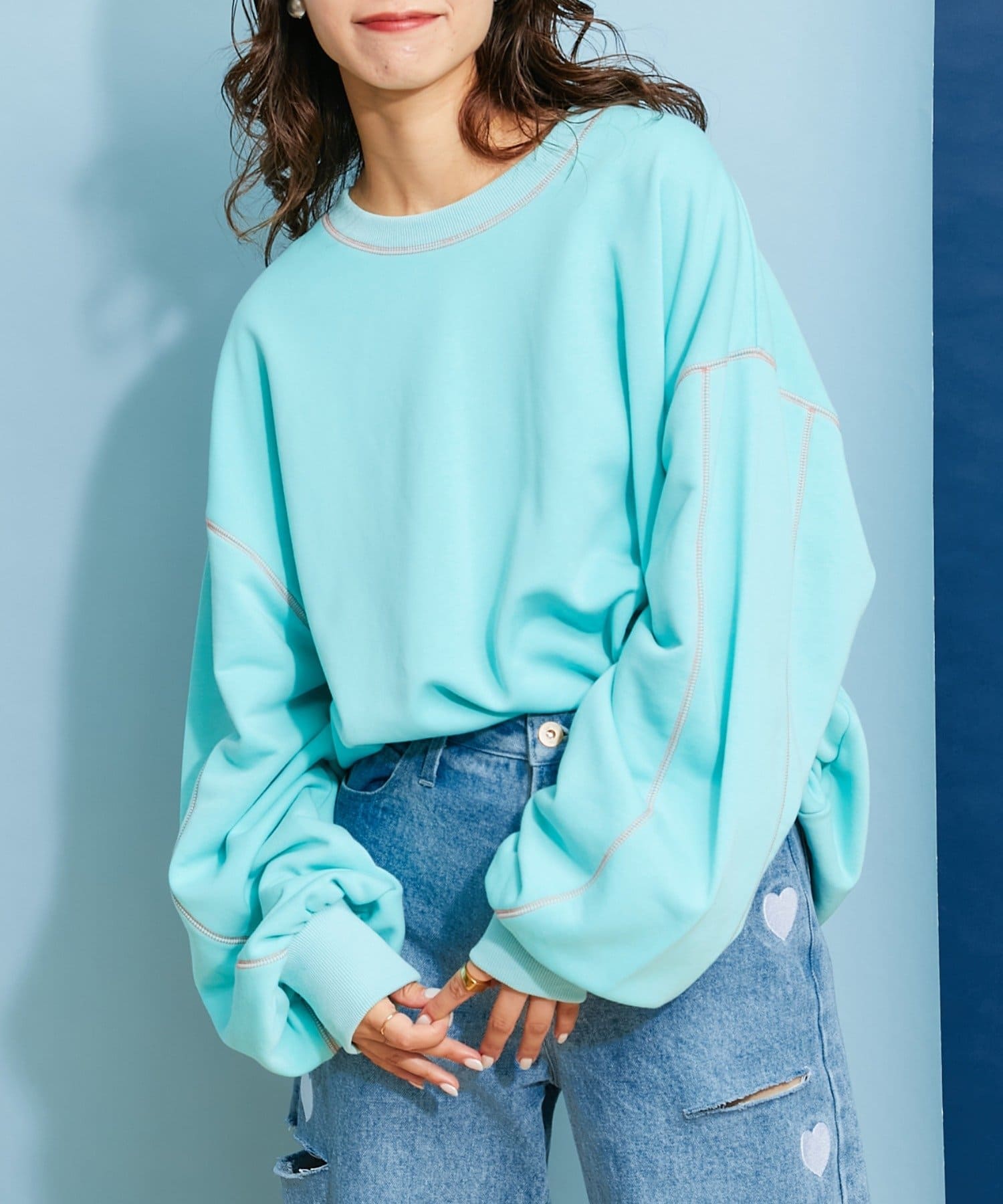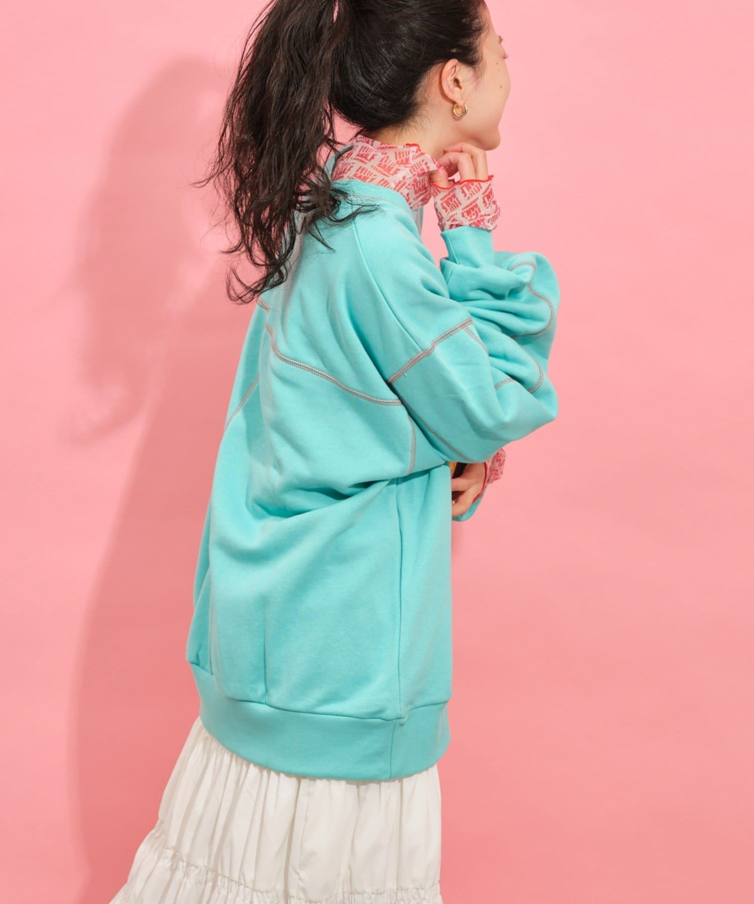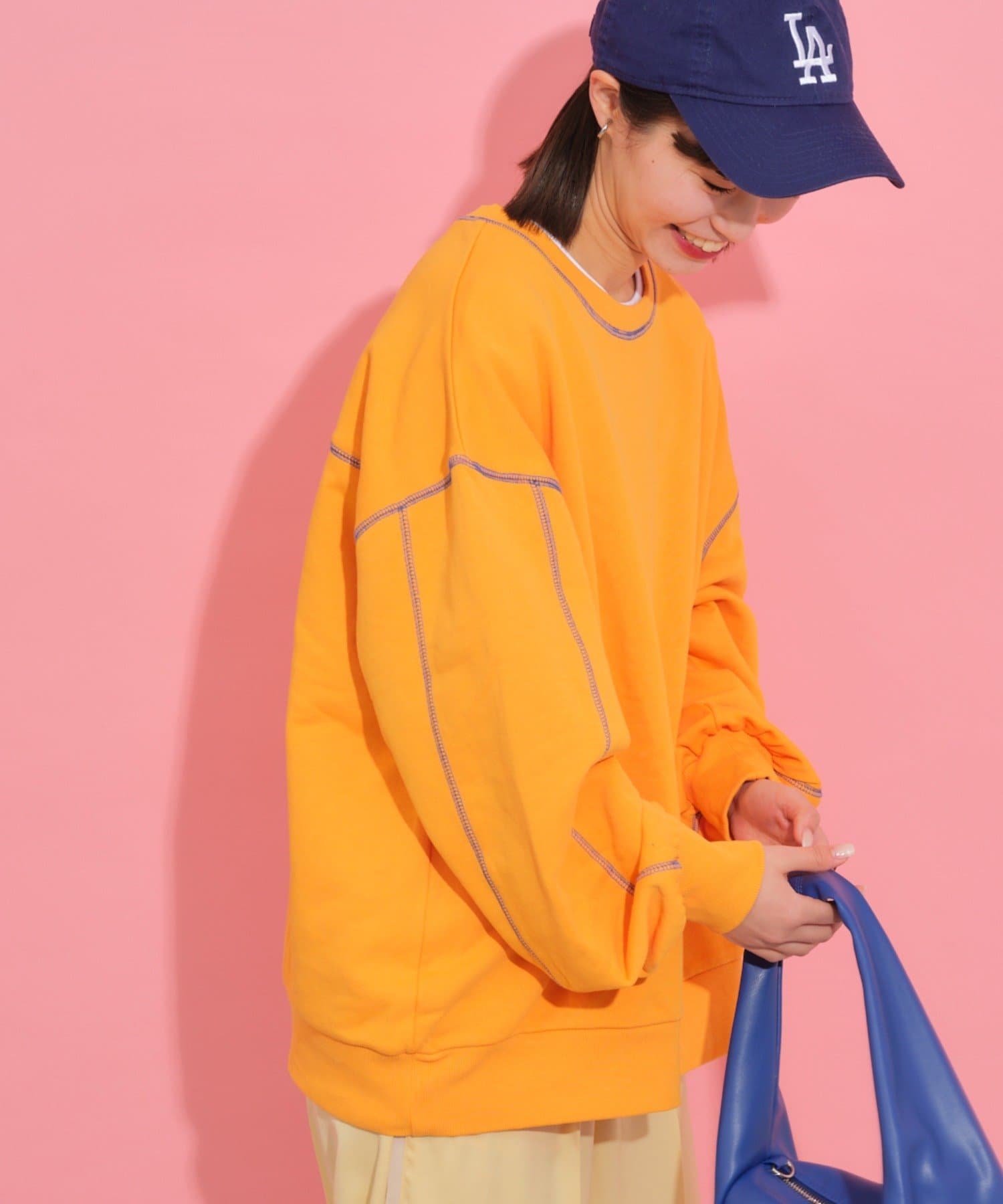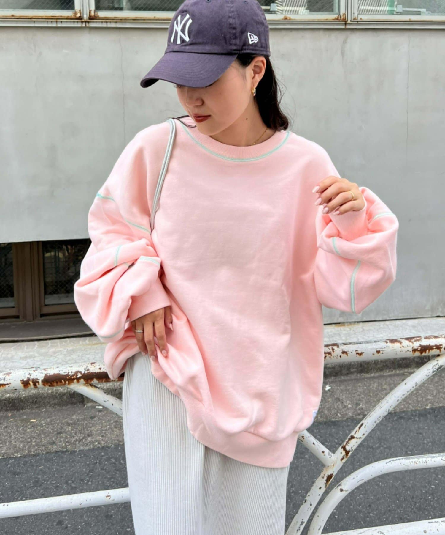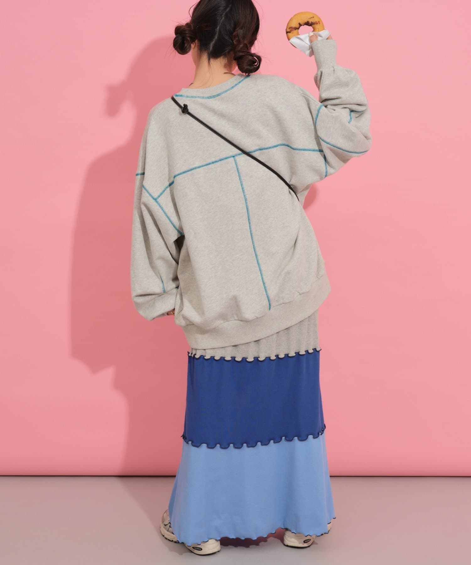 配色ステッチデザインが目を惹くトレンドライクなオーバーサイズプルオーバー。