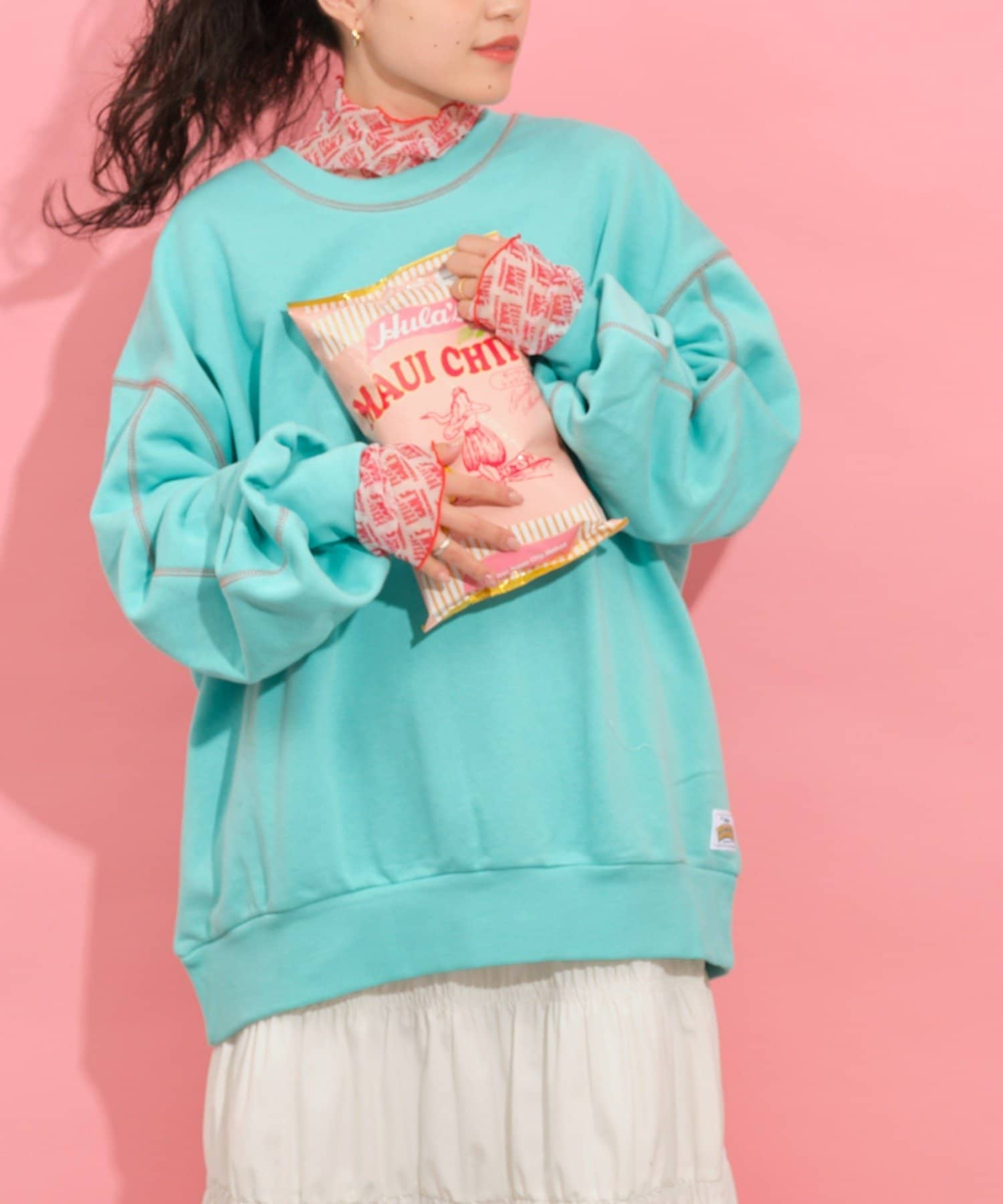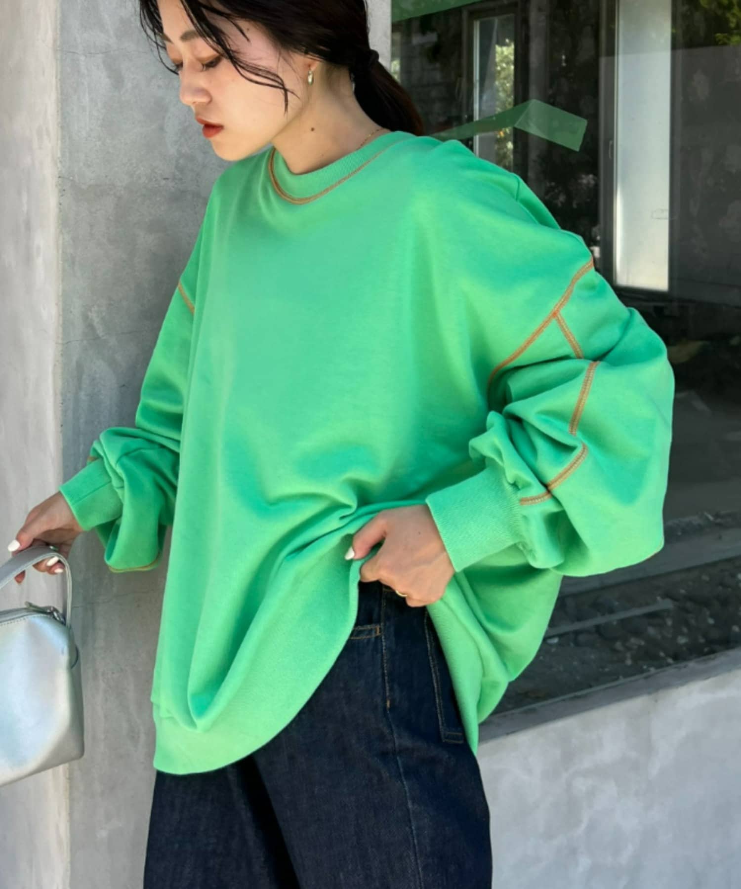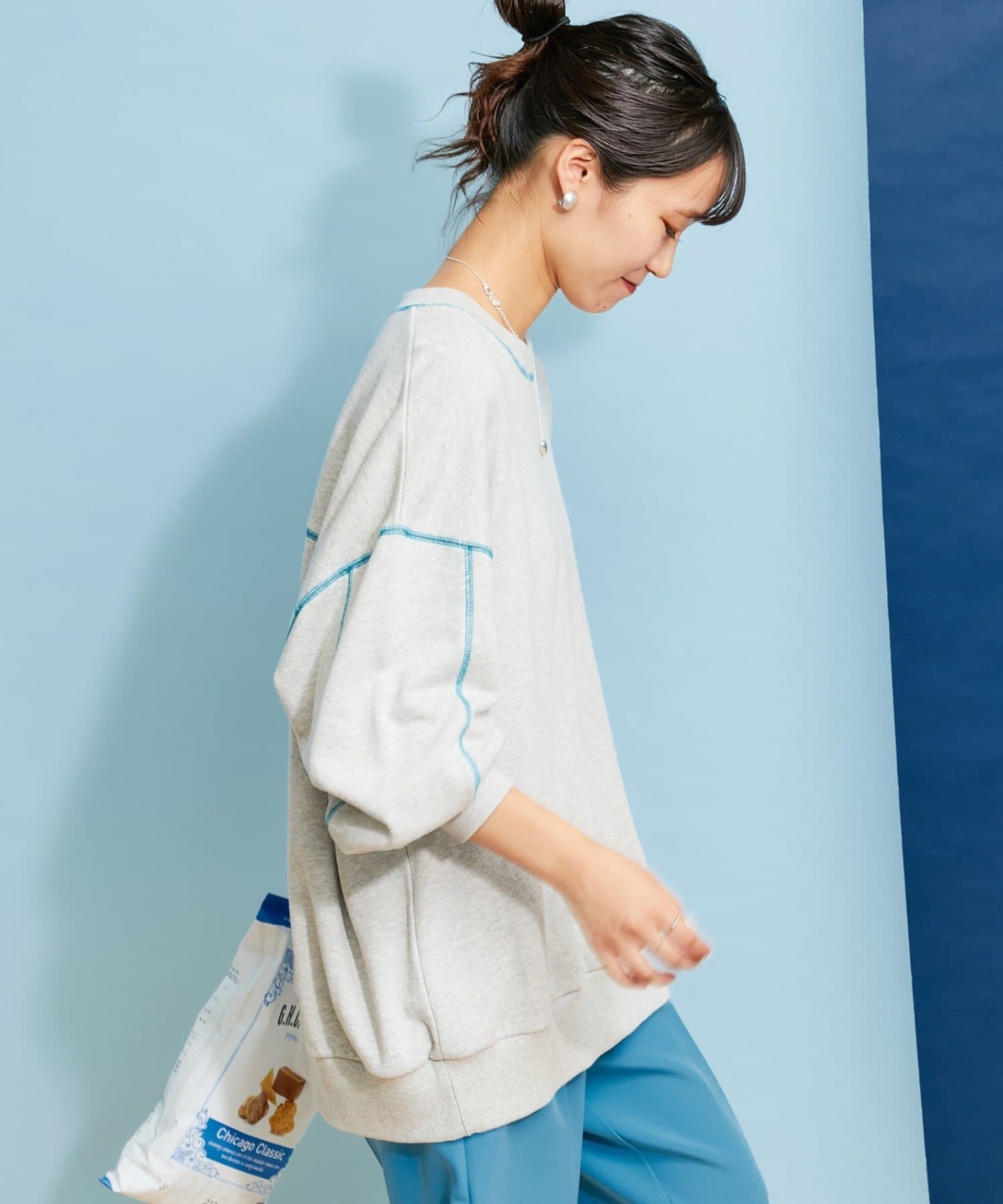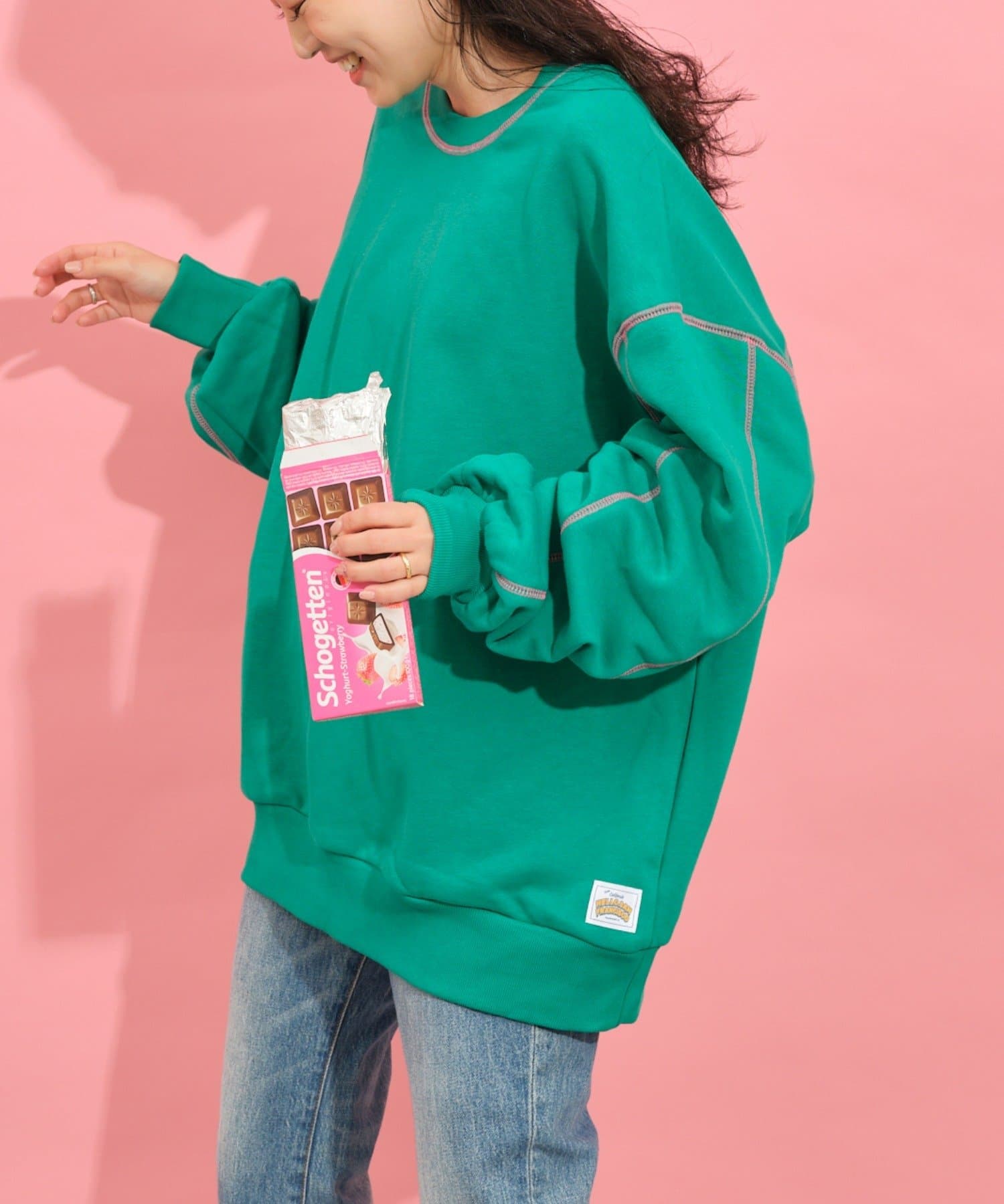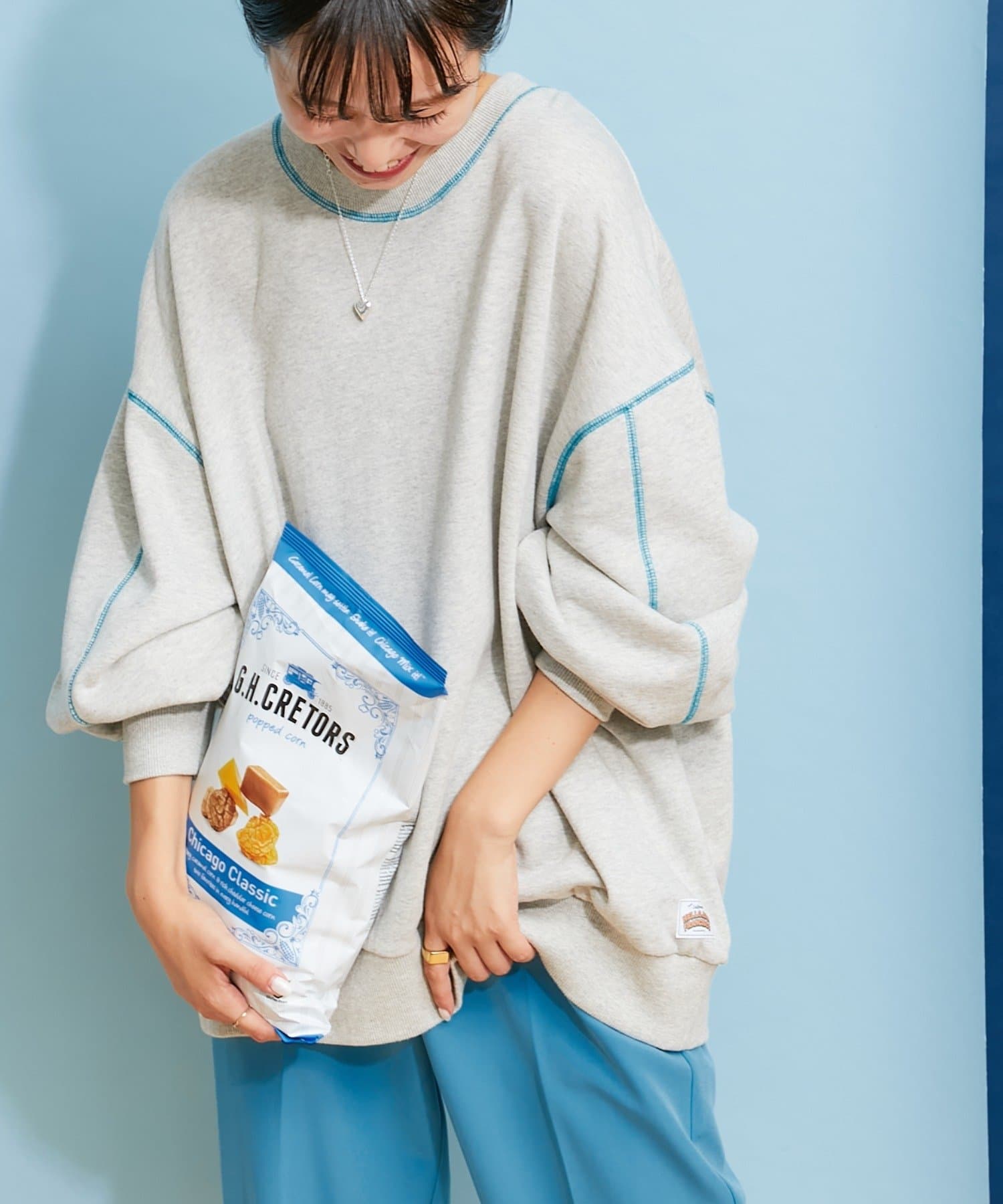 配色ステッチデザインが目を惹くトレンドライクなオーバーサイズプルオーバー。