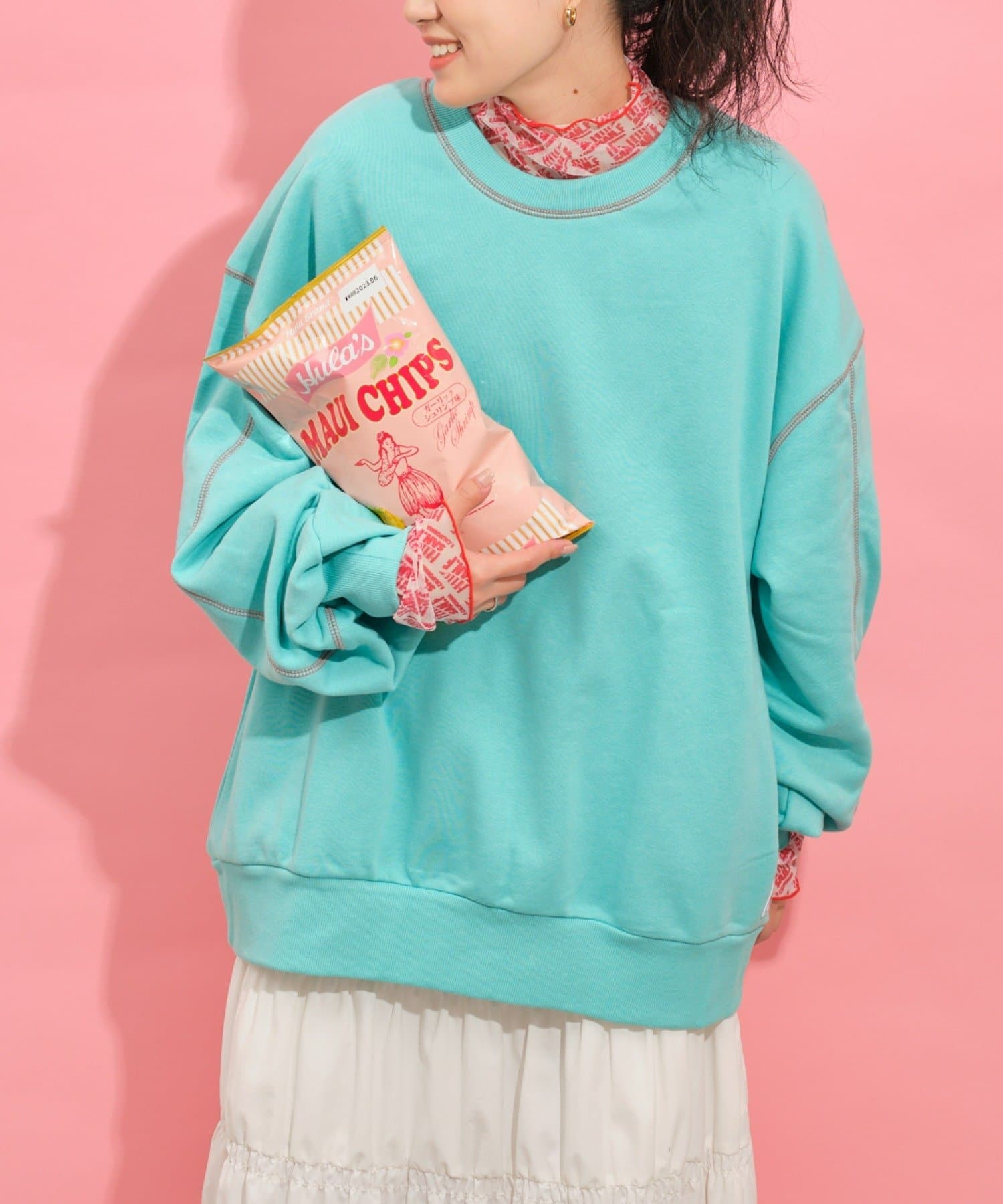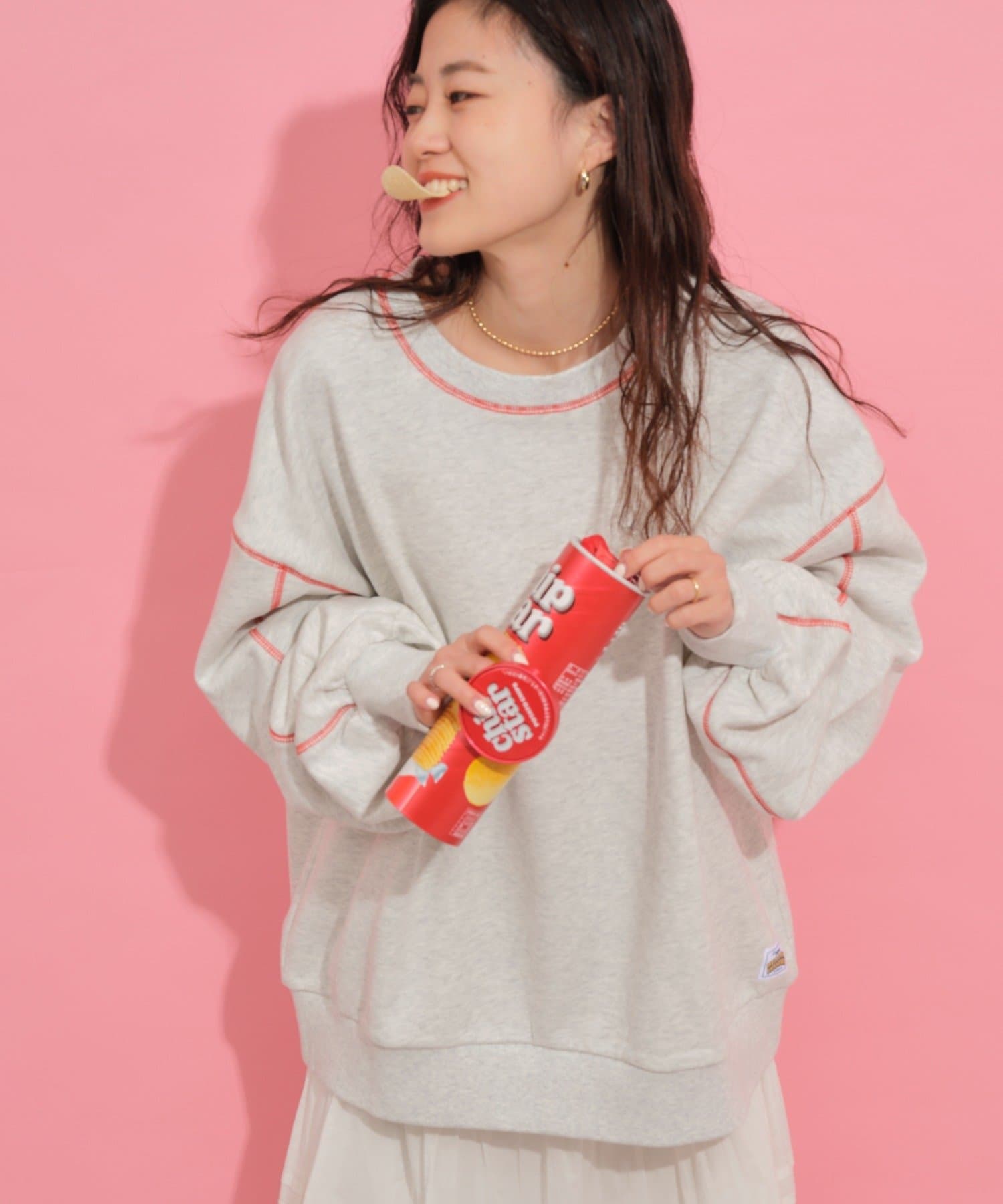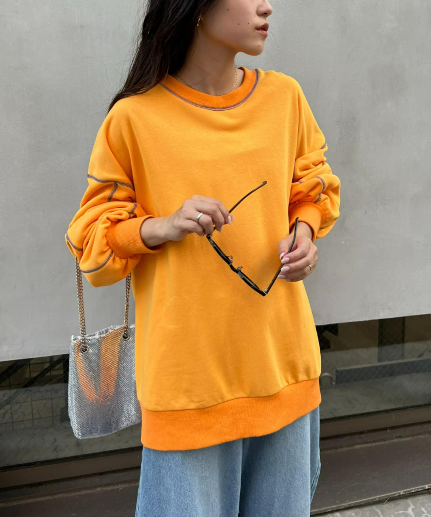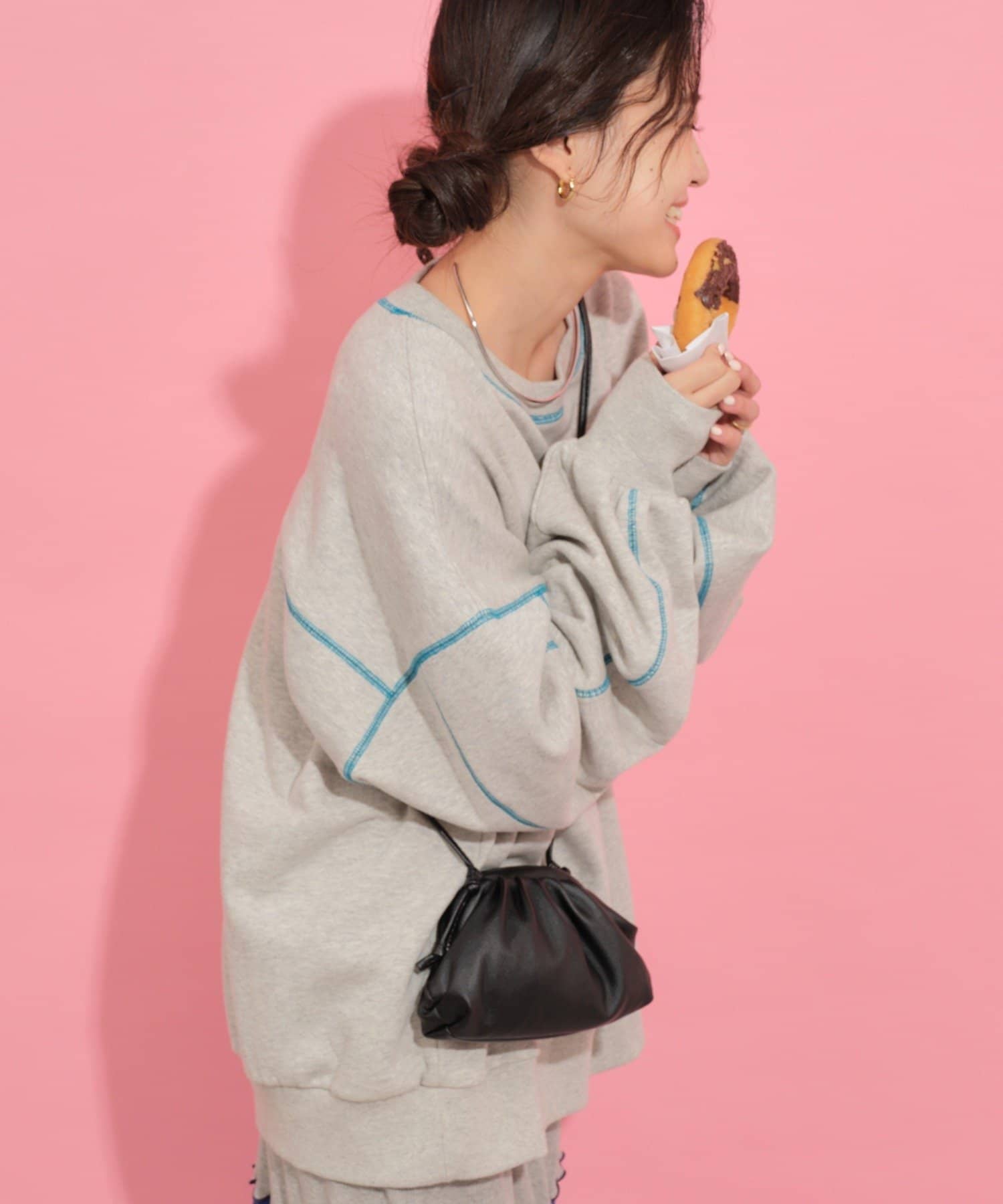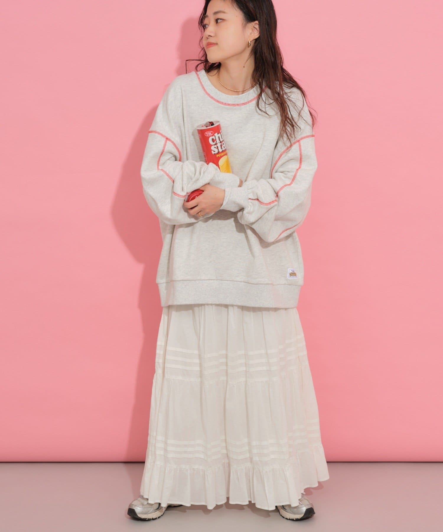 配色ステッチデザインが目を惹くトレンドライクなオーバーサイズプルオーバー。