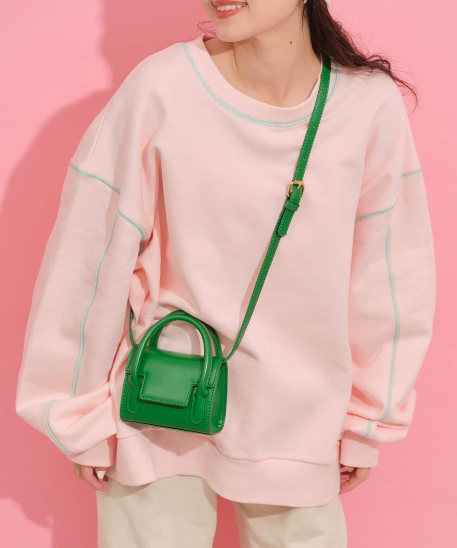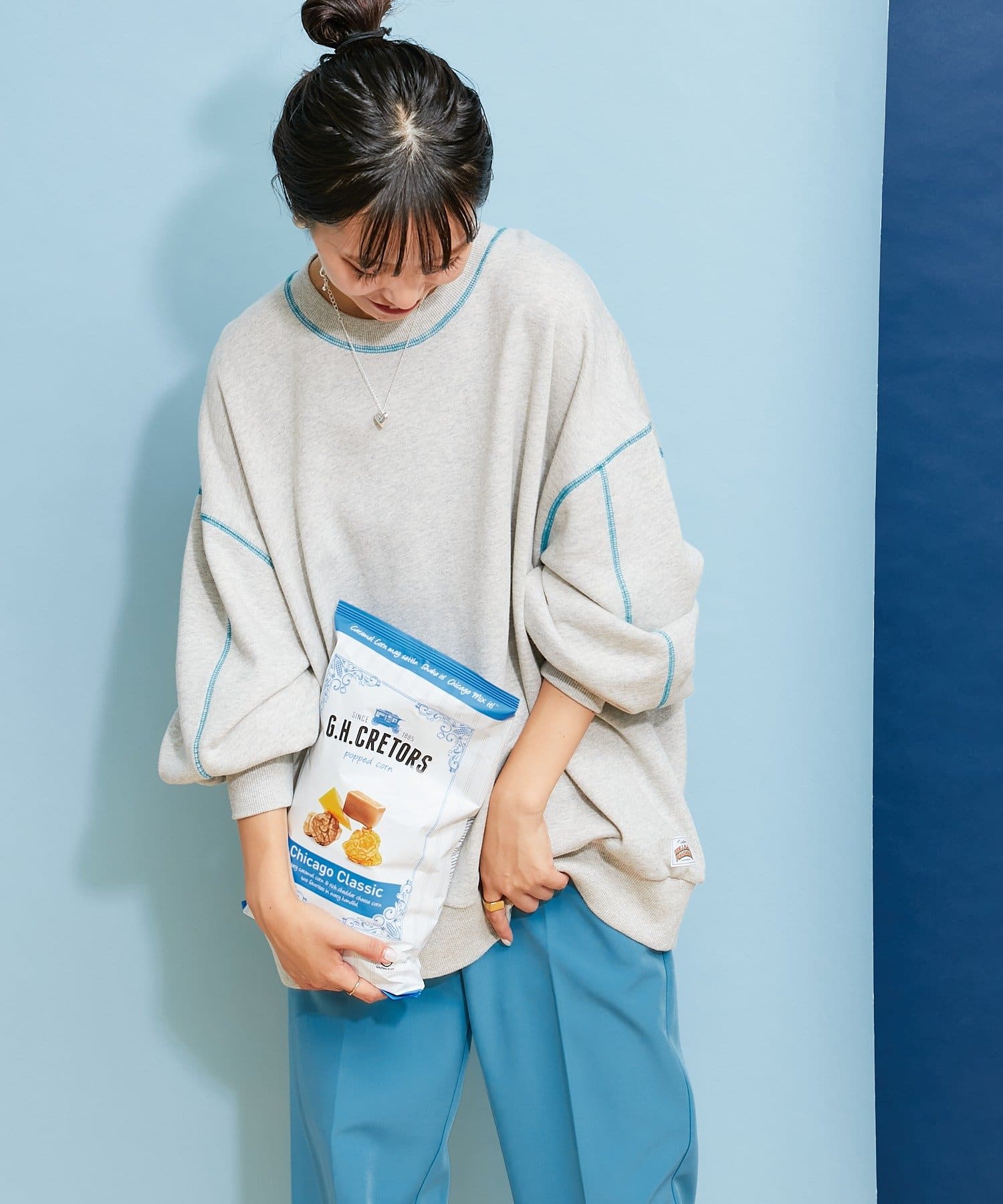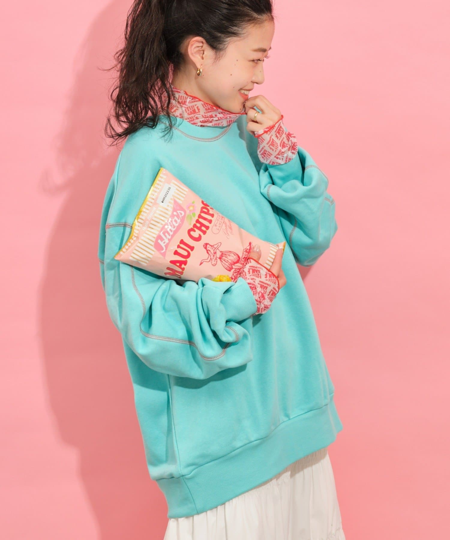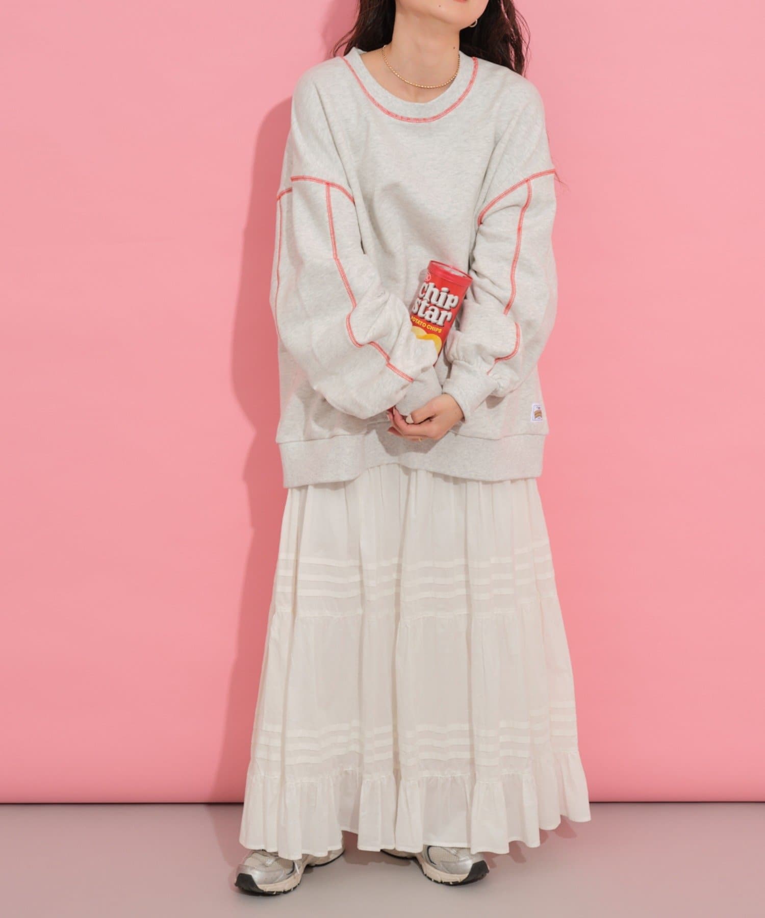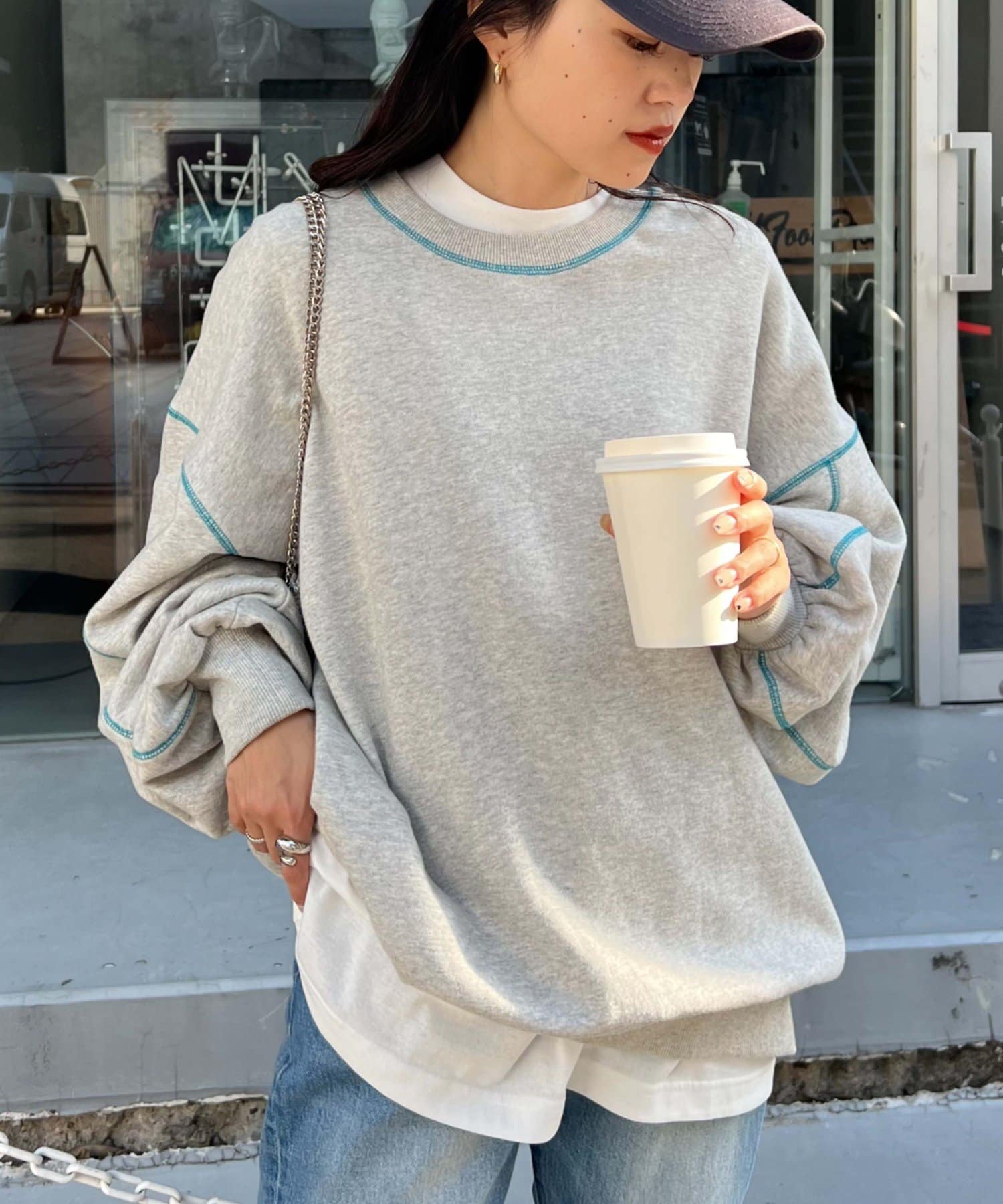 配色ステッチデザインが目を惹くトレンドライクなオーバーサイズプルオーバー。