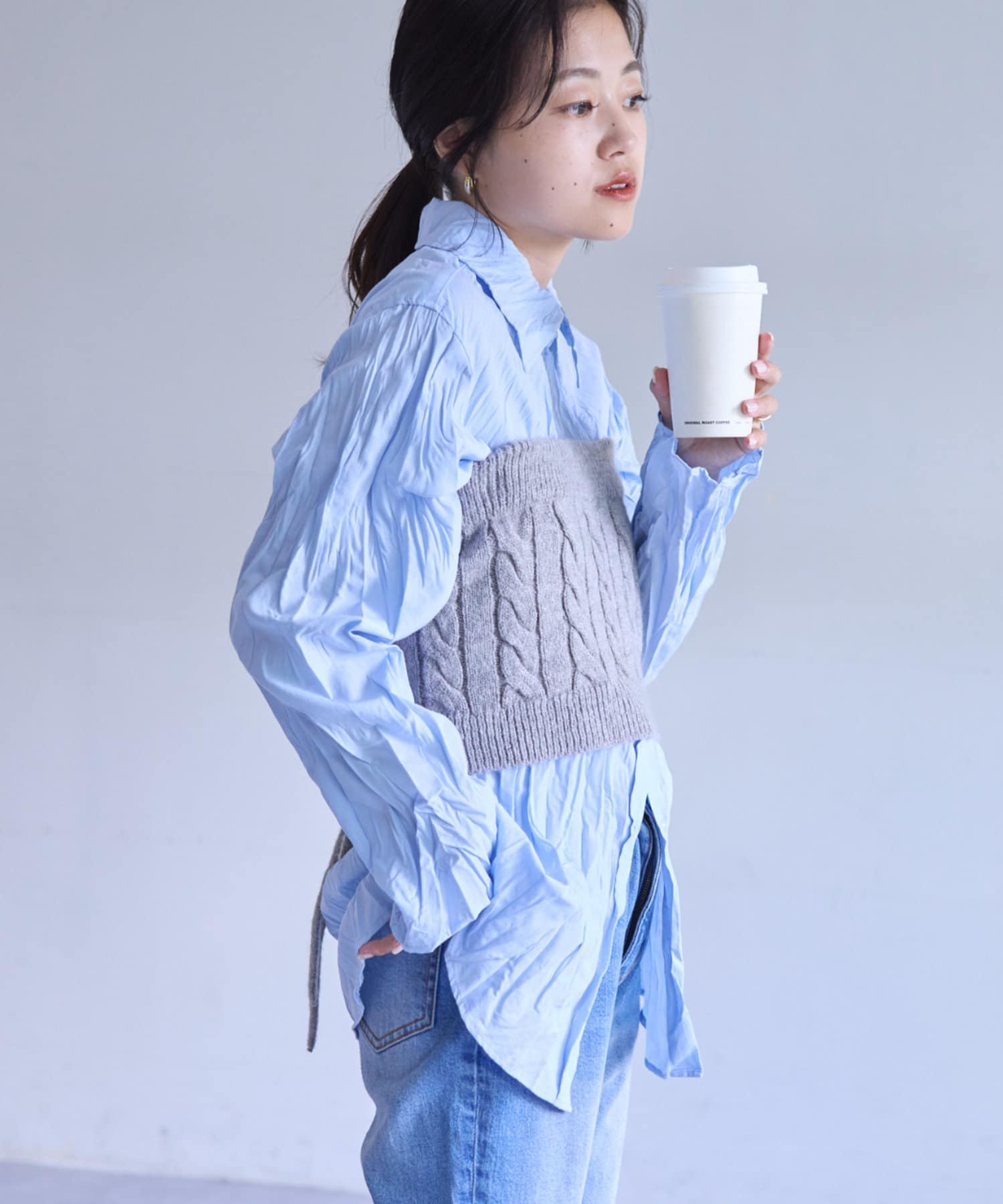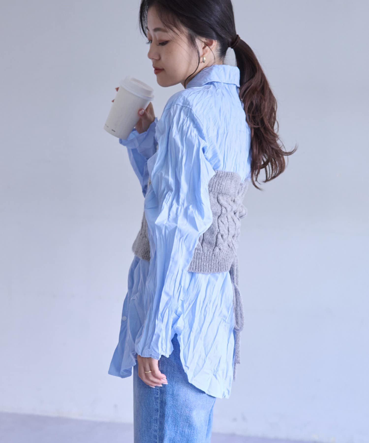 くしゅくしゅとしたしわ感のある素材が特徴のシャツ。