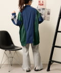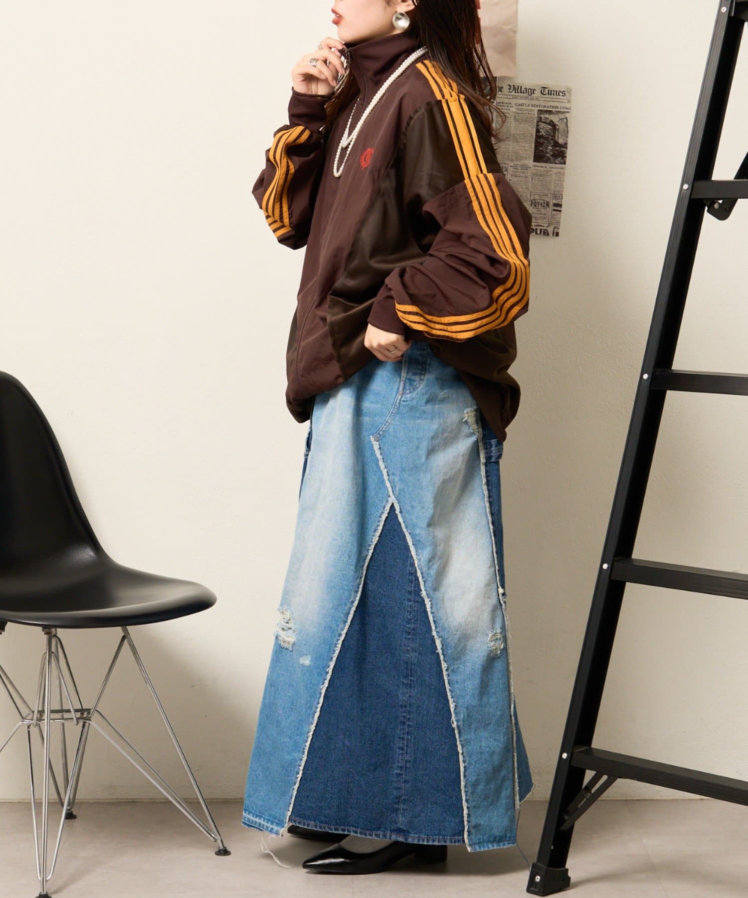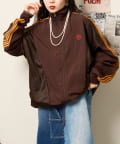 異なる2つの生地をつないだようなリメイク風のデザインが目を惹くジャケット。