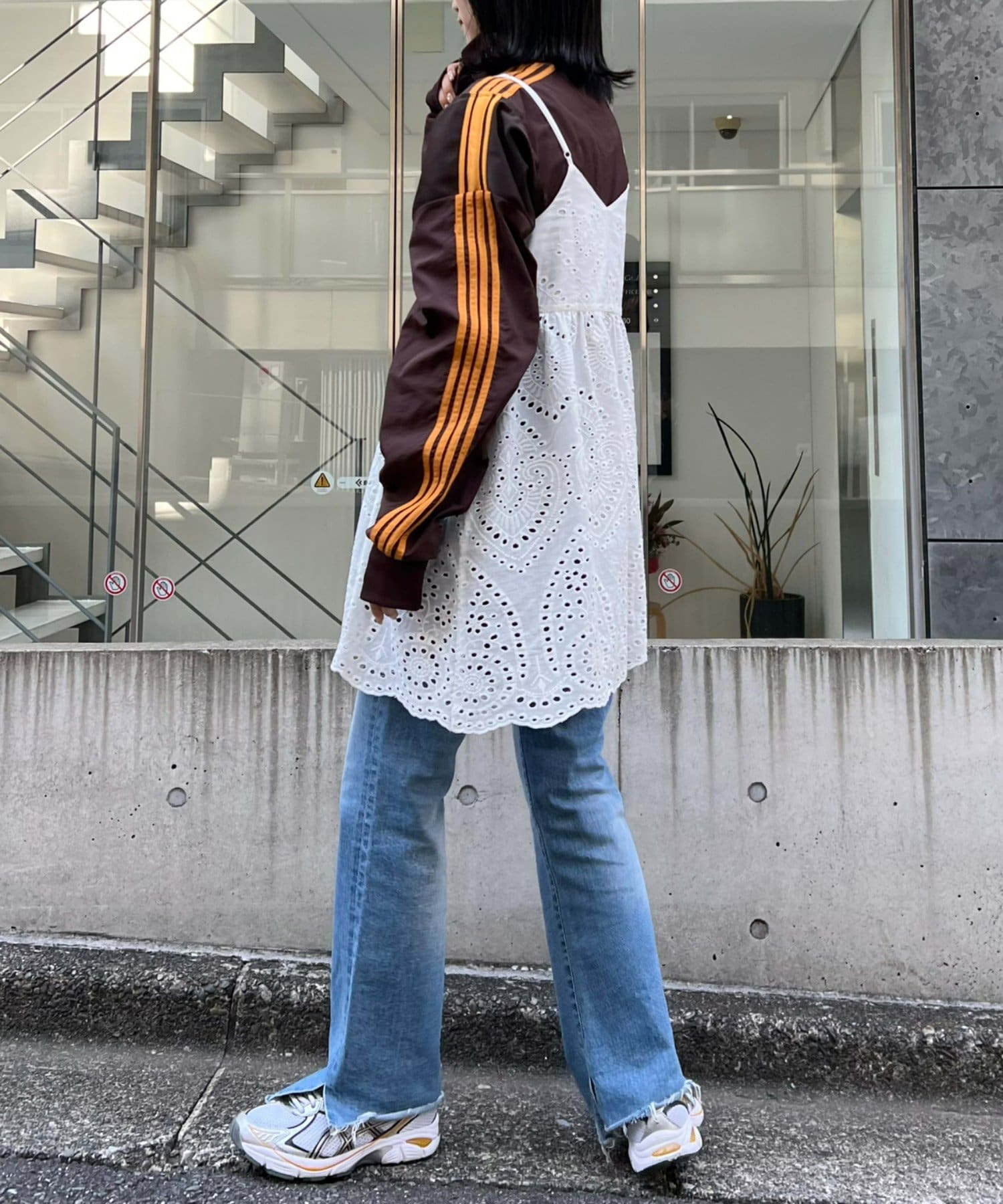 スカートやハーフパンツ、キャミワンピースなど女性らしいアイテムとも相性抜群です。