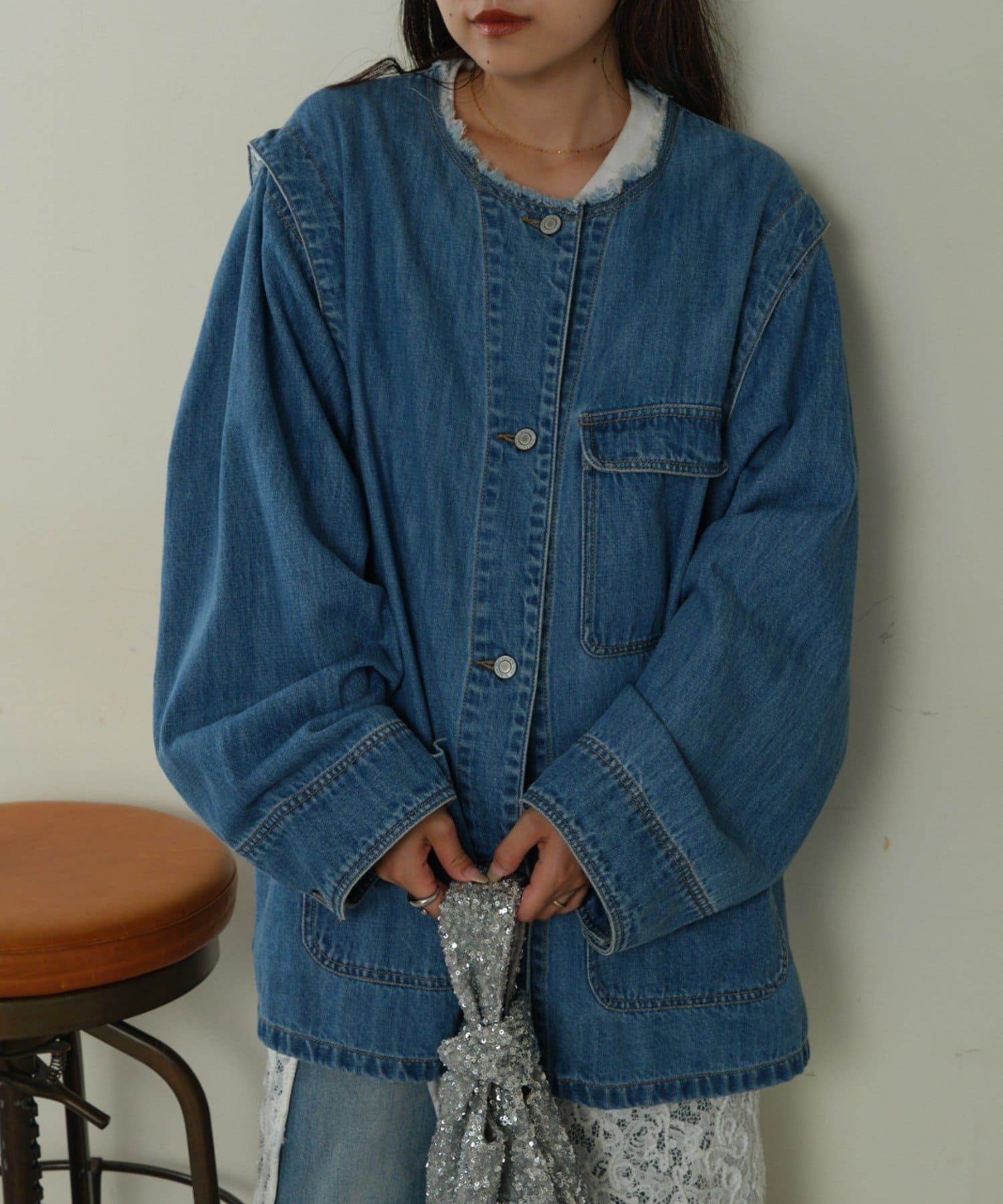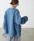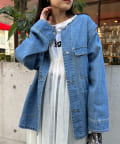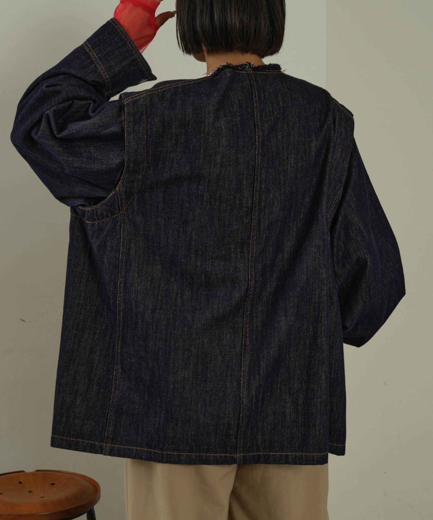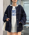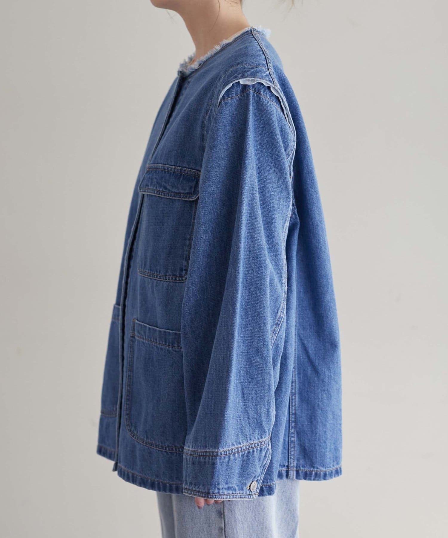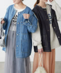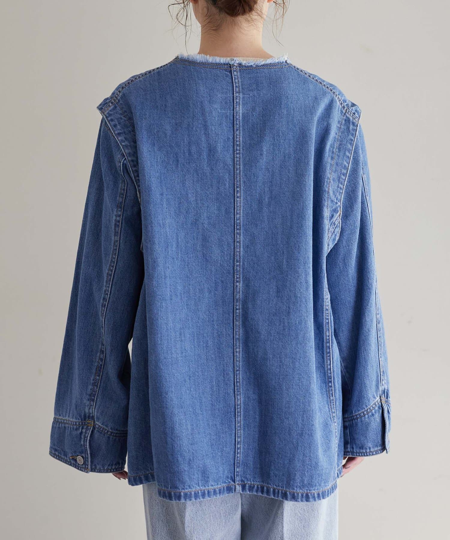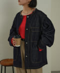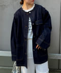 すっきりとした襟元でカジュアルすぎないノーカラーのデニムブルゾン。