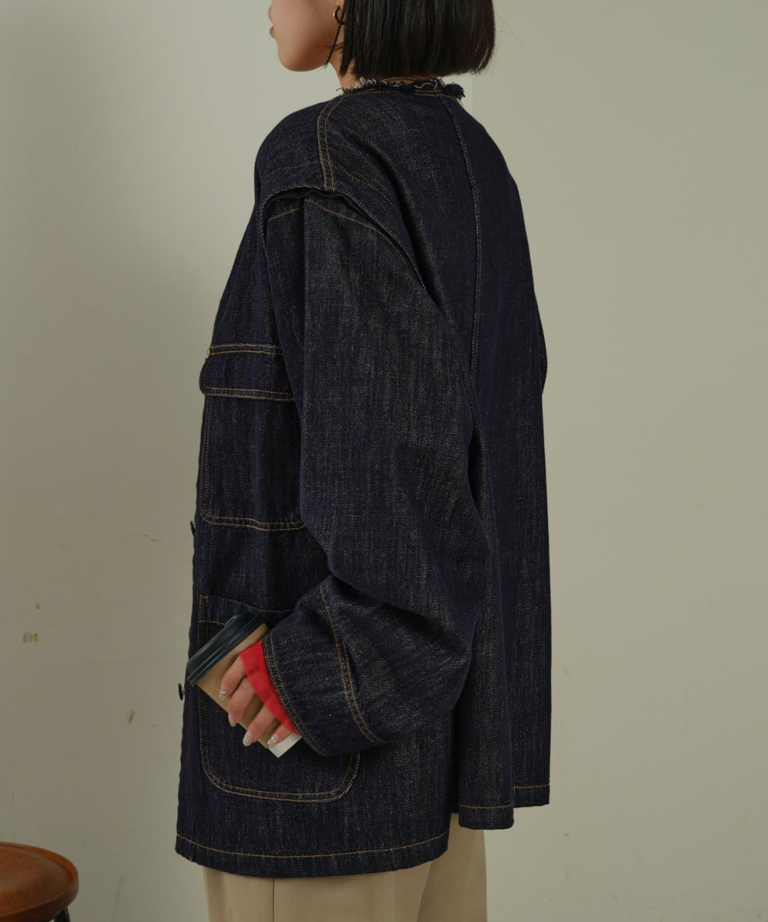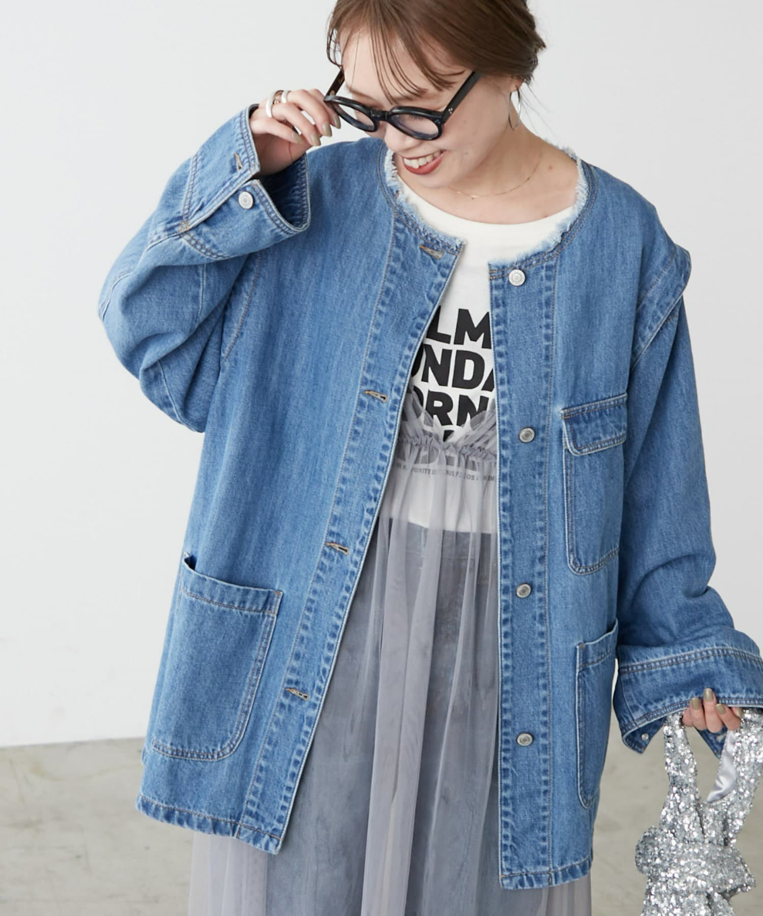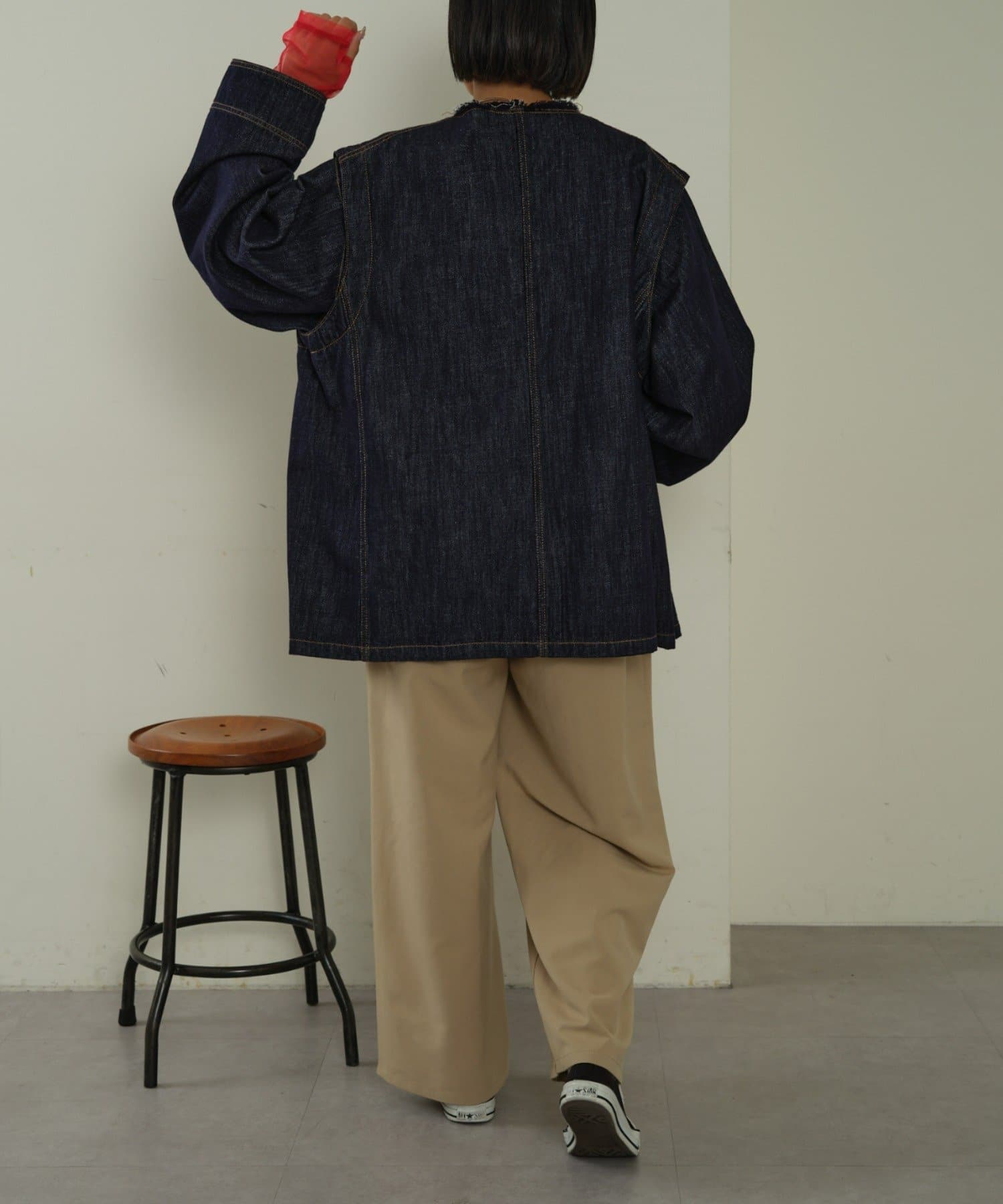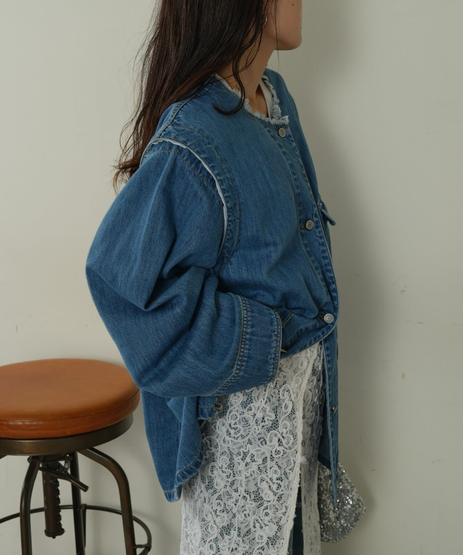 すっきりとした襟元でカジュアルすぎないノーカラーのデニムブルゾン。