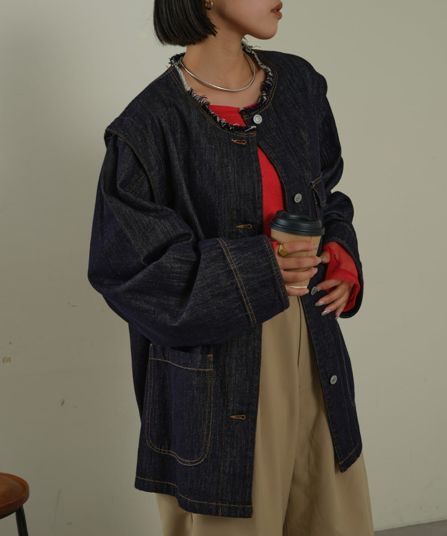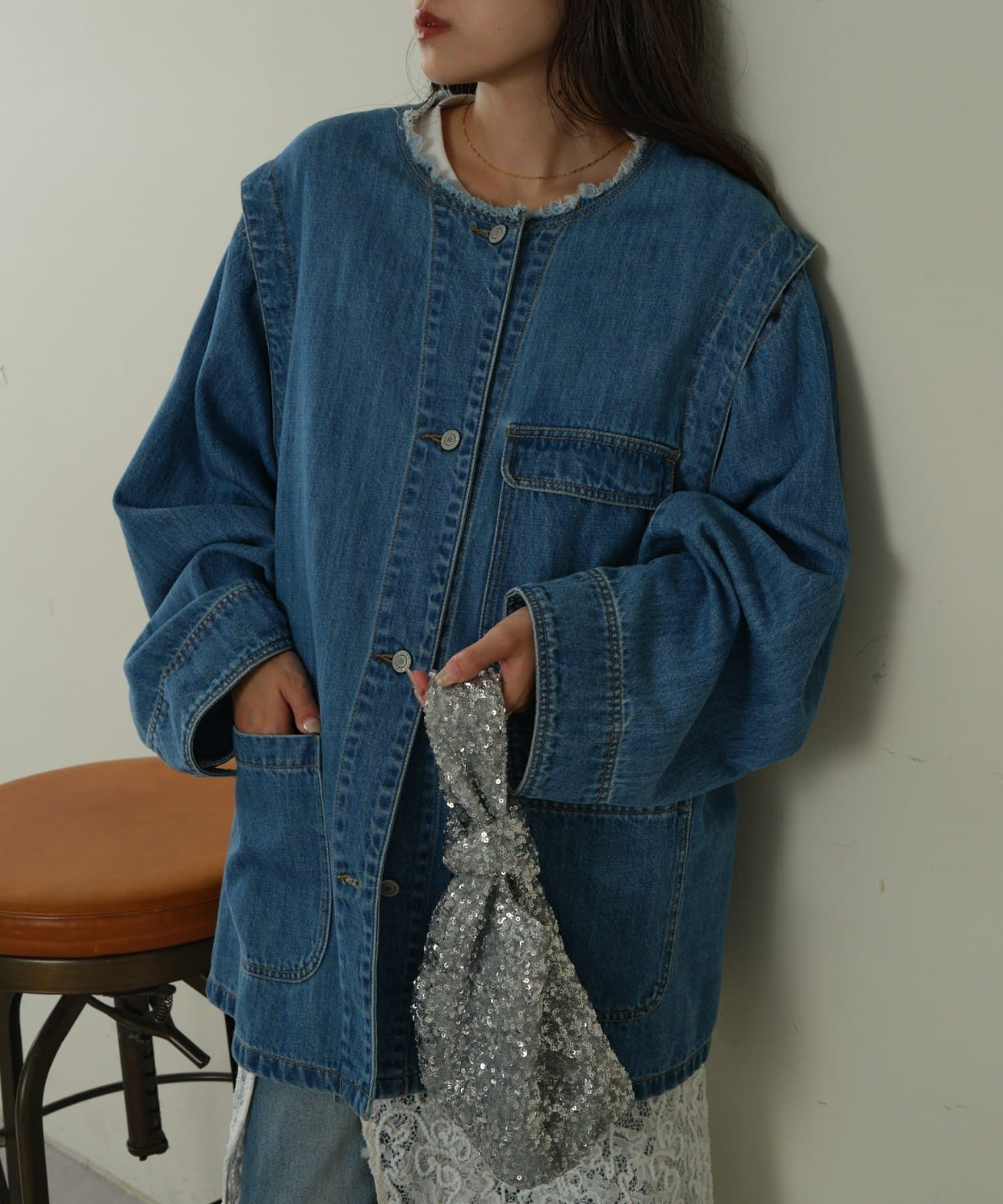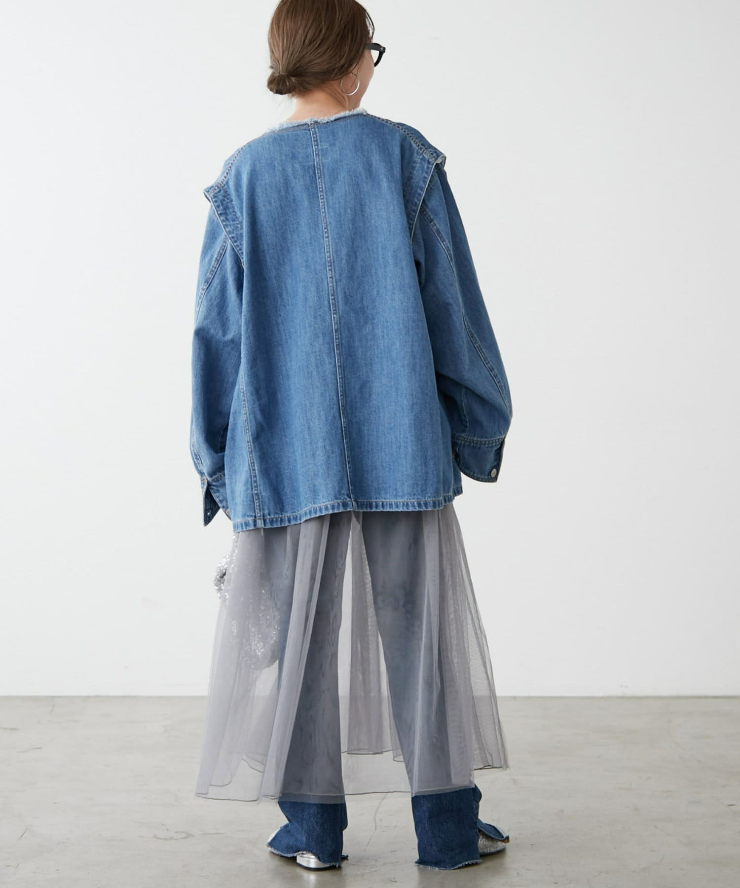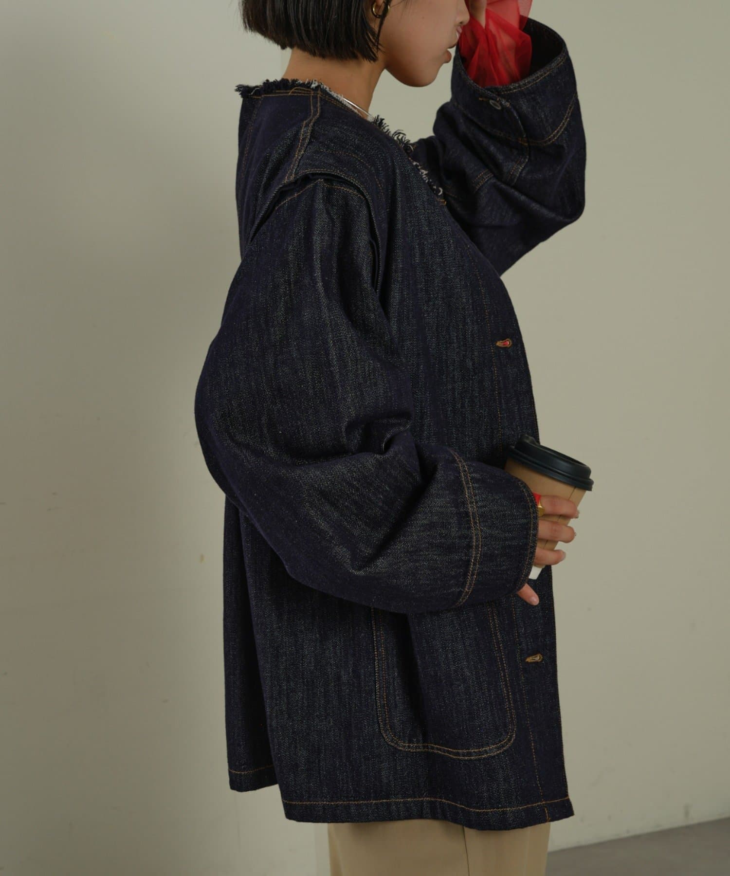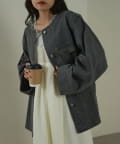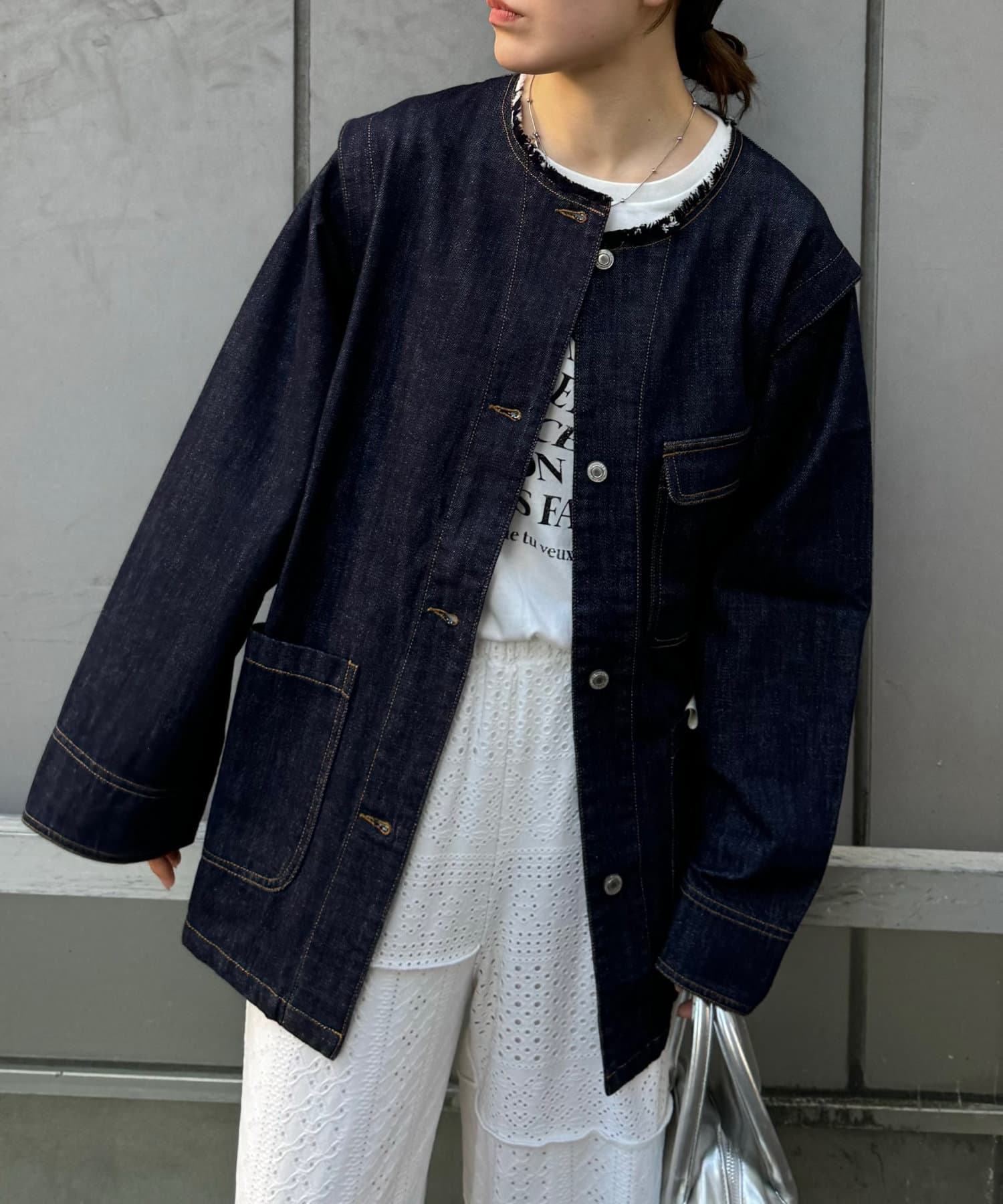 すっきりとした襟元でカジュアルすぎないノーカラーのデニムブルゾン。