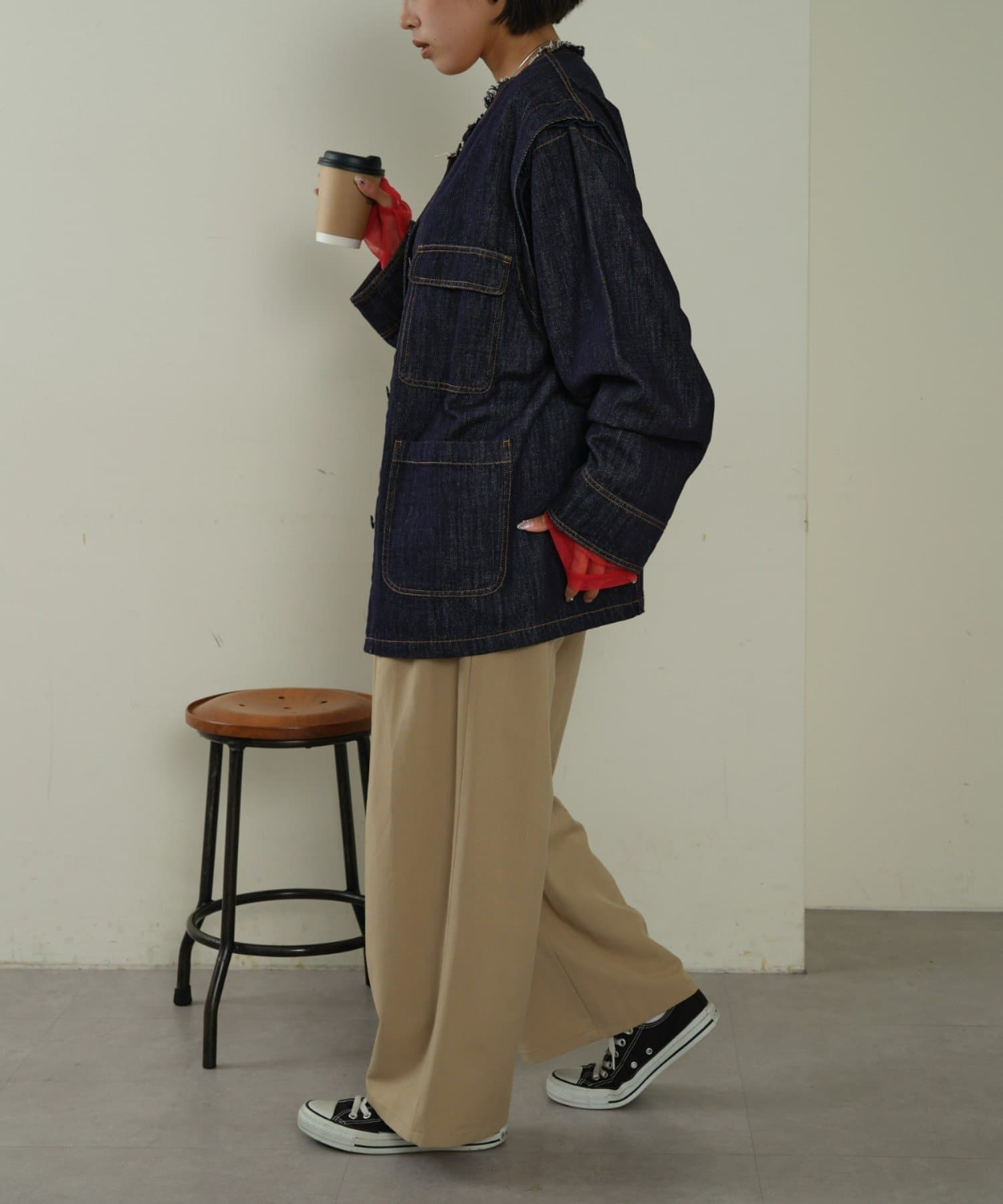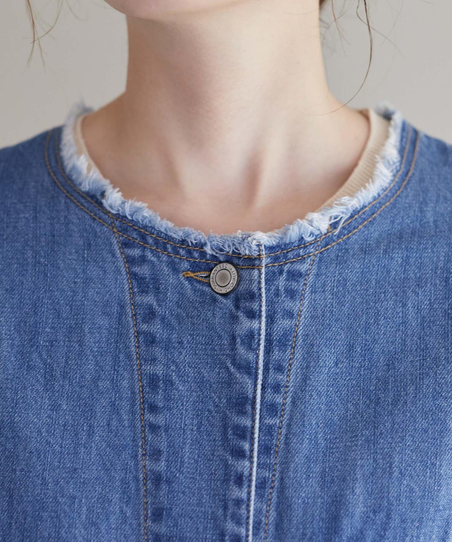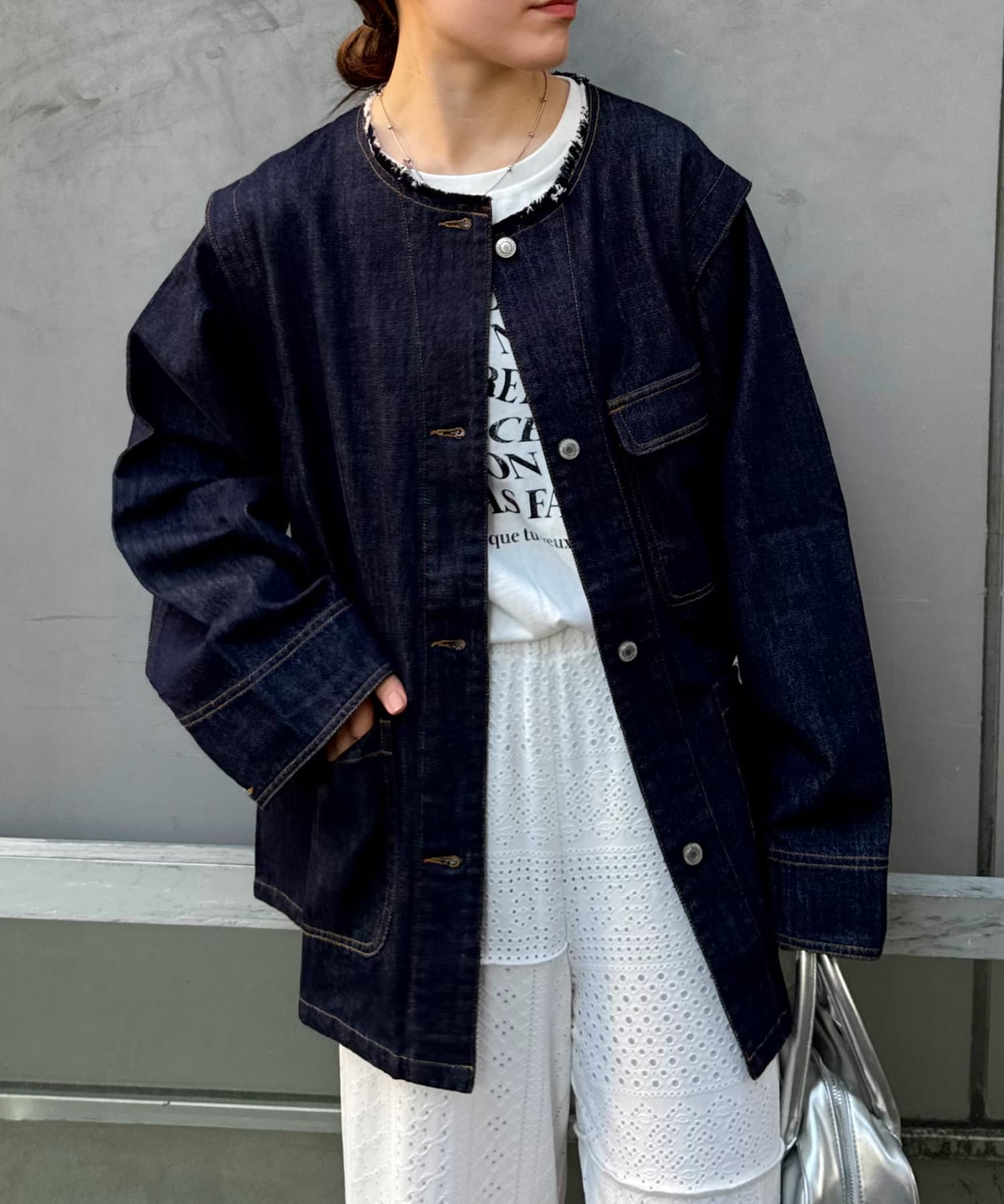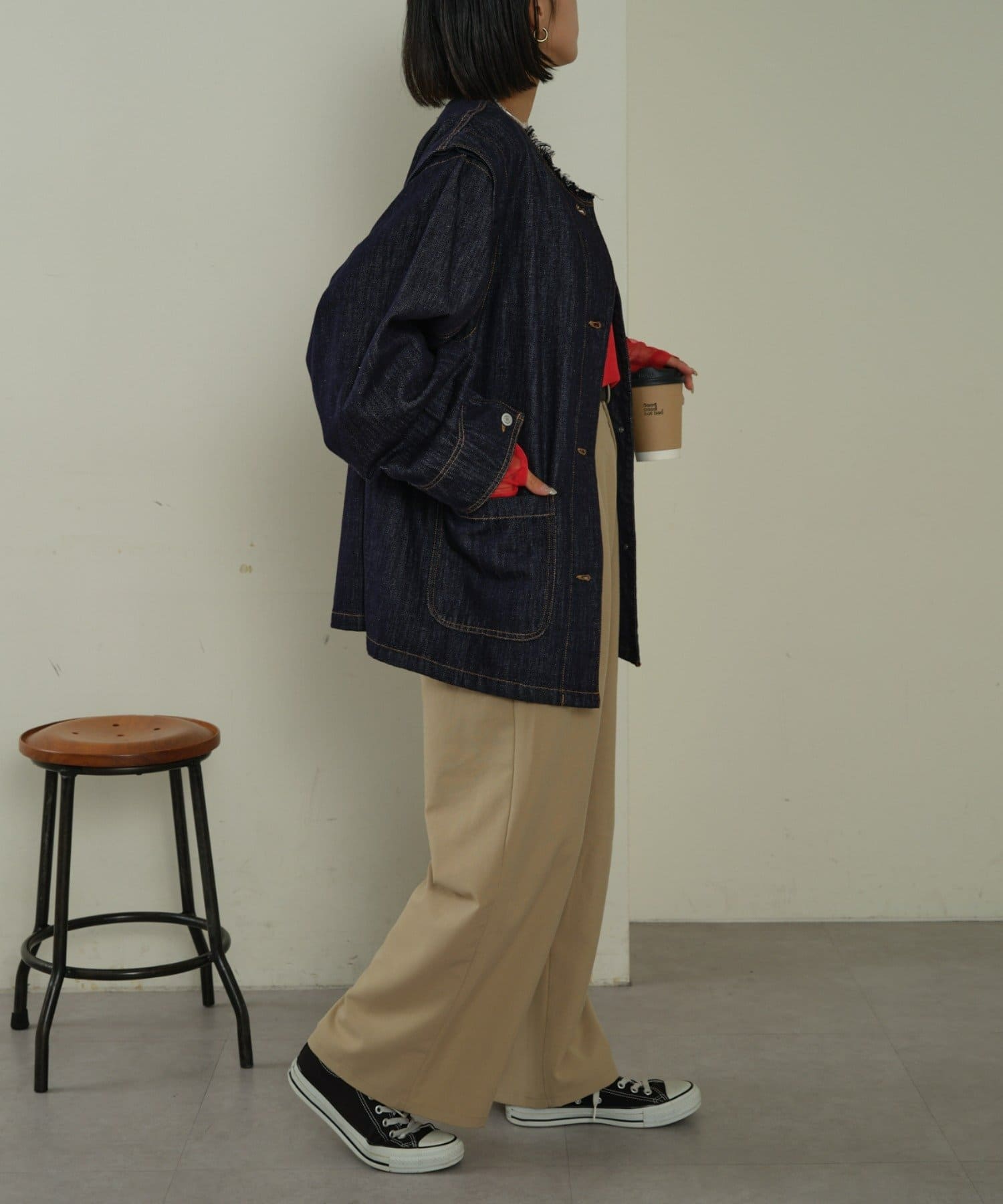 すっきりとした襟元でカジュアルすぎないノーカラーのデニムブルゾン。