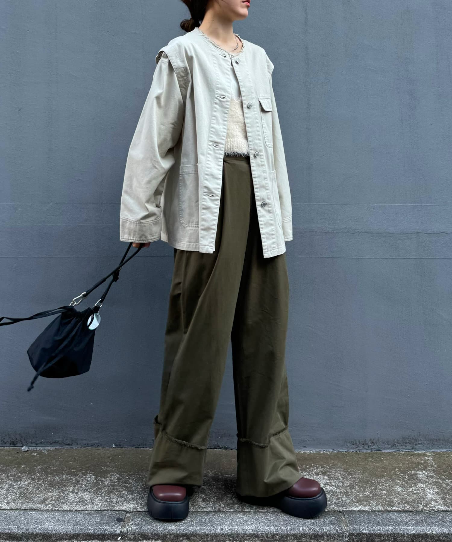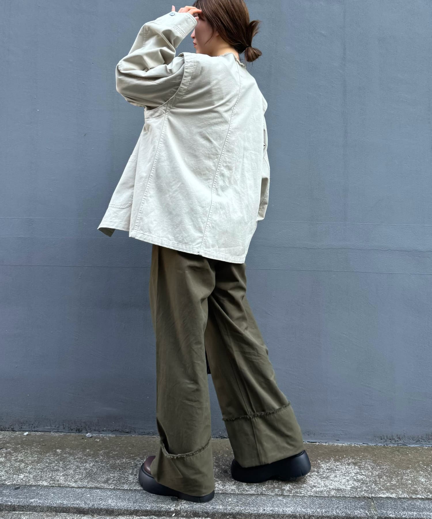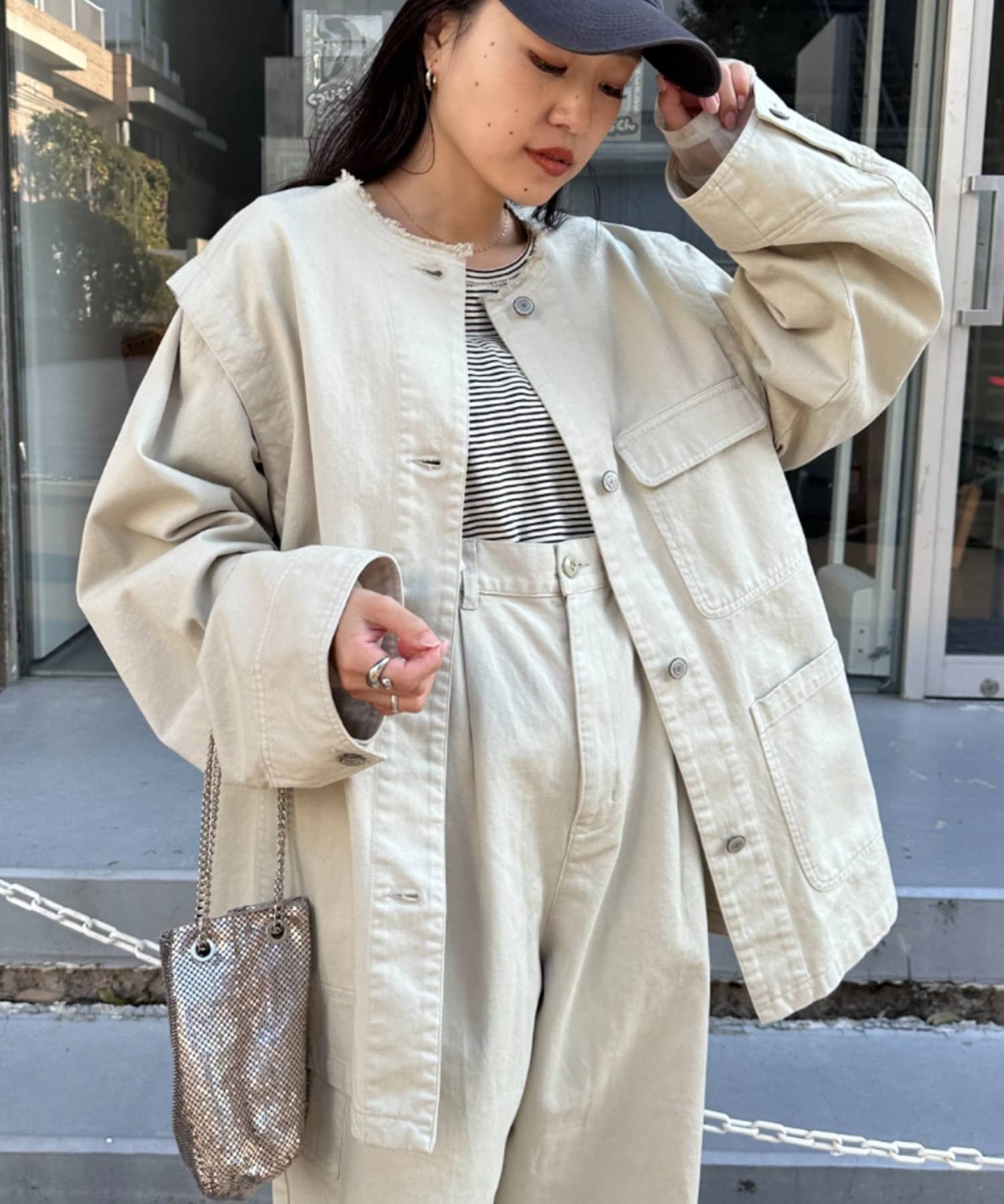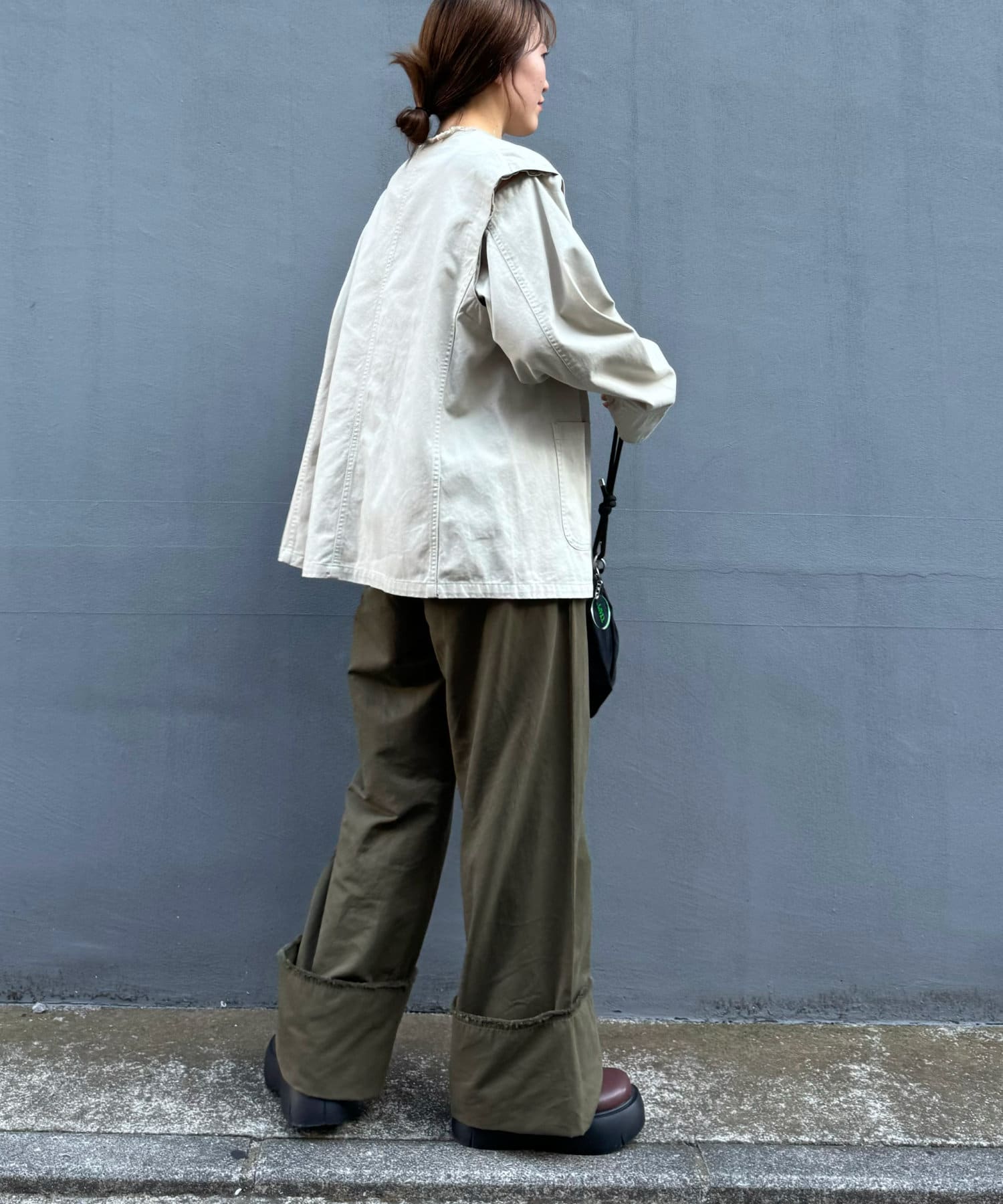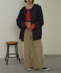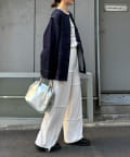 ゆったりとしたシルエットでメンズライクなラフさもありつつ、