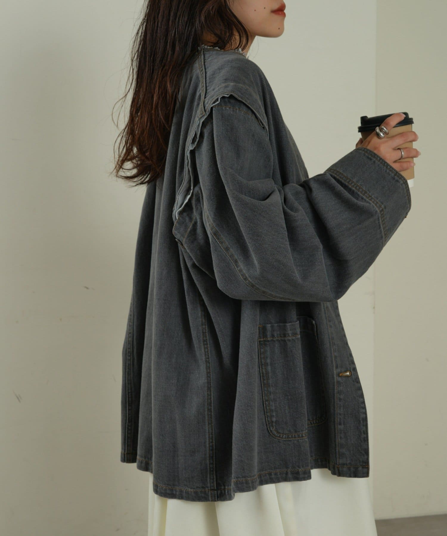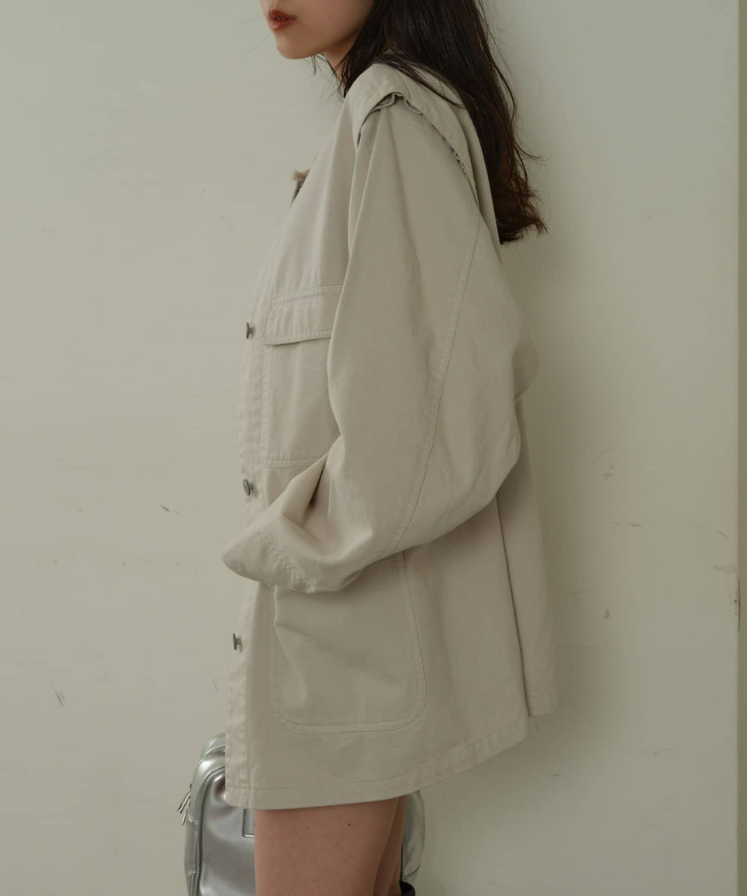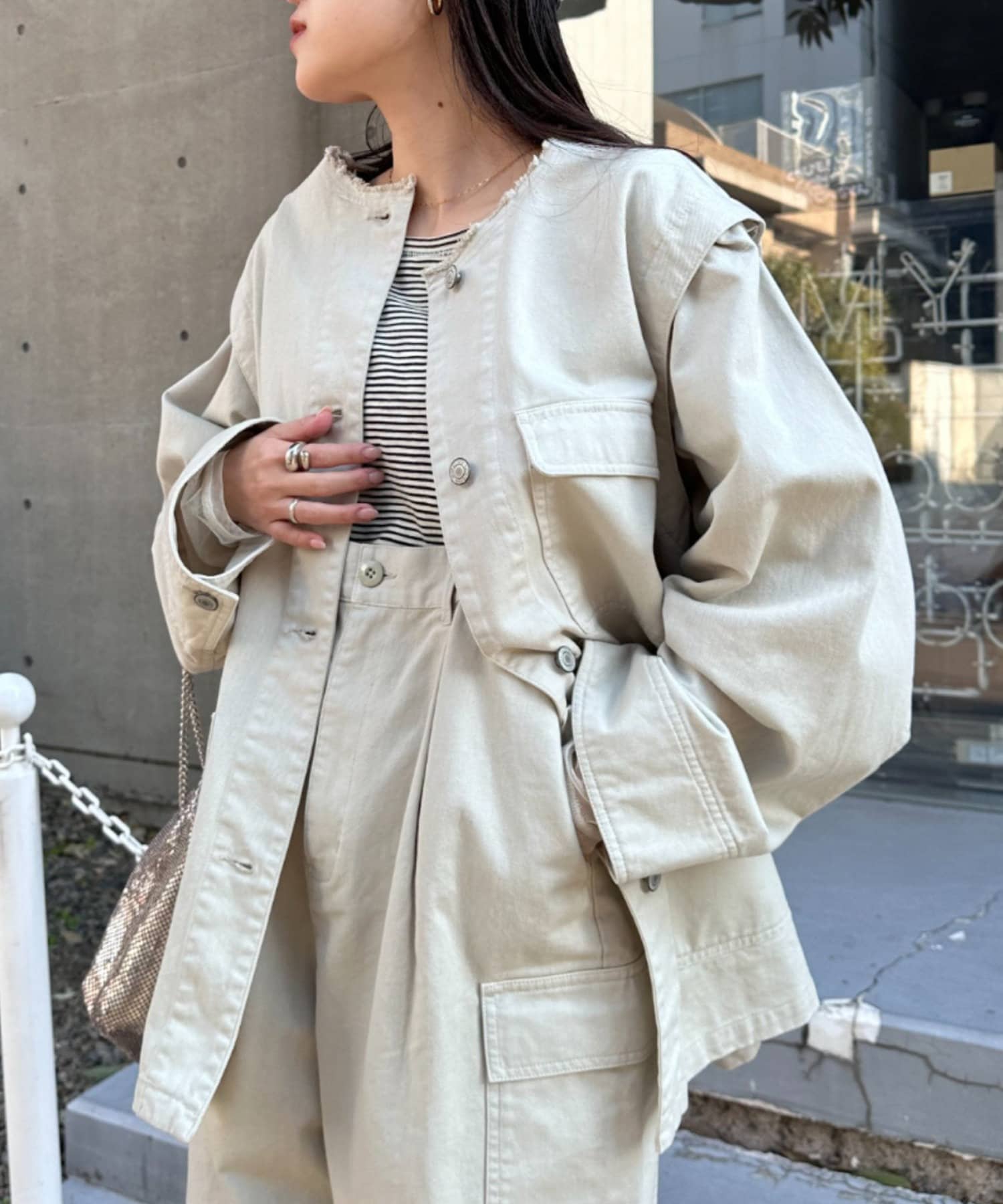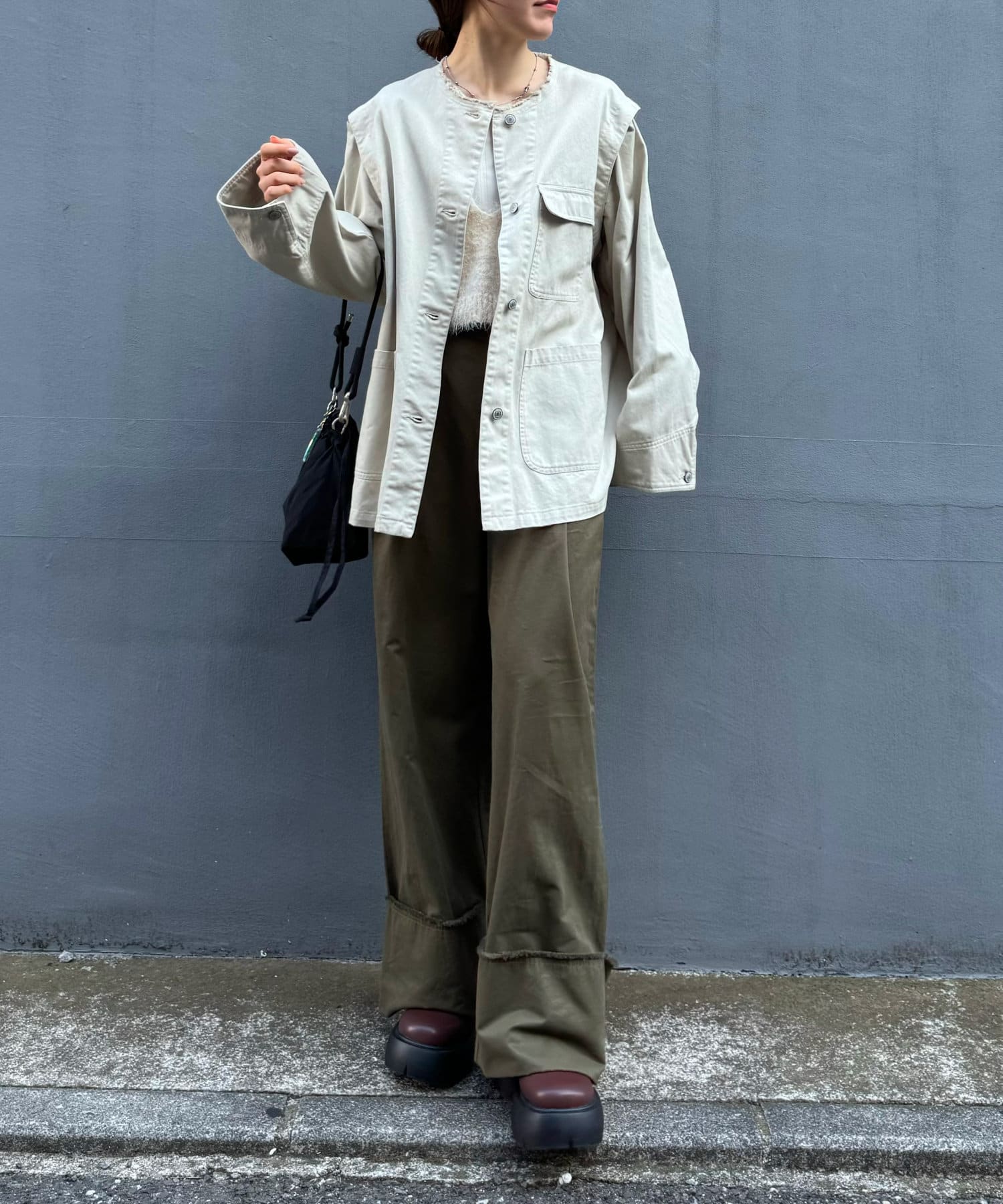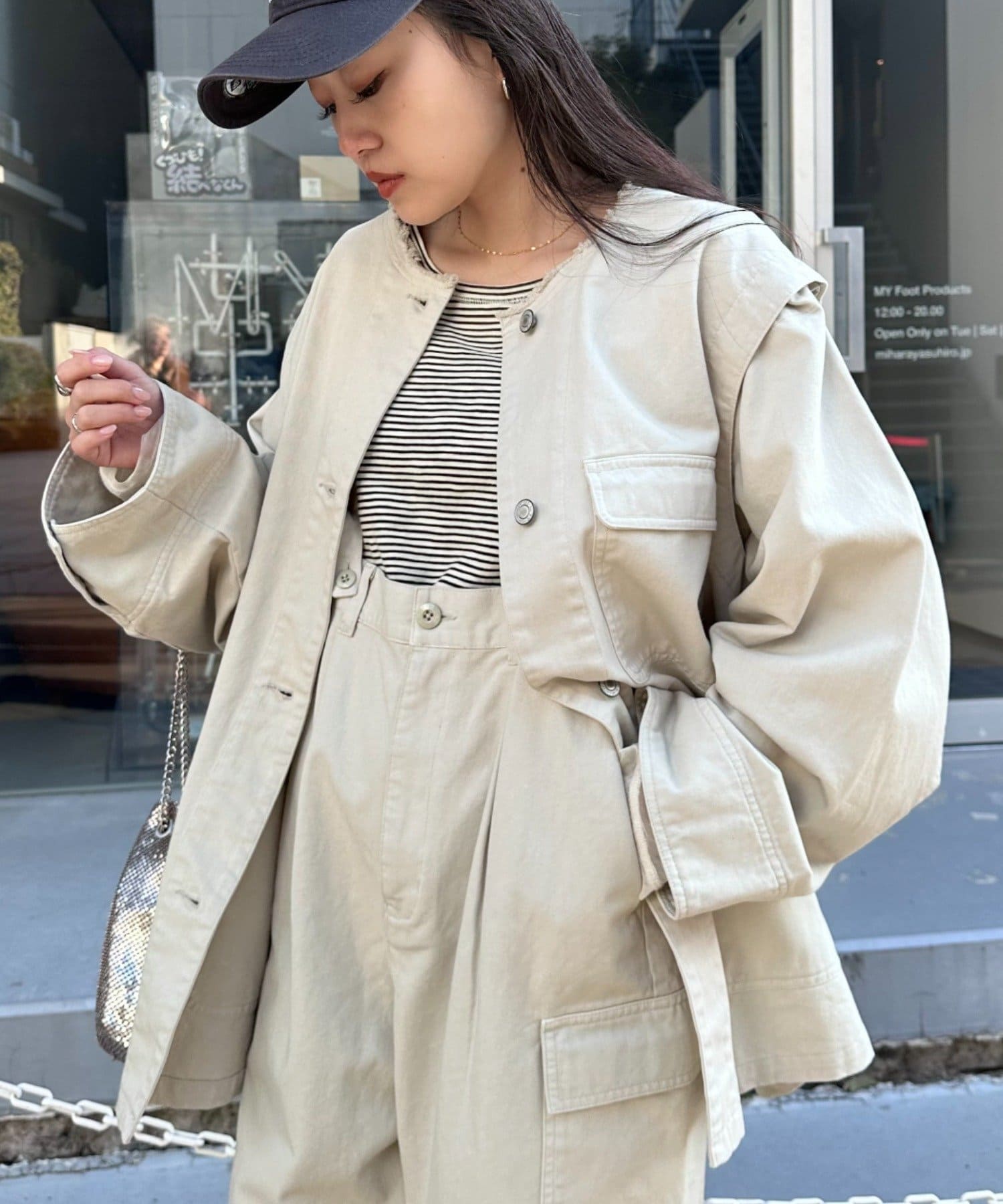 ゆったりとしたシルエットでメンズライクなラフさもありつつ、