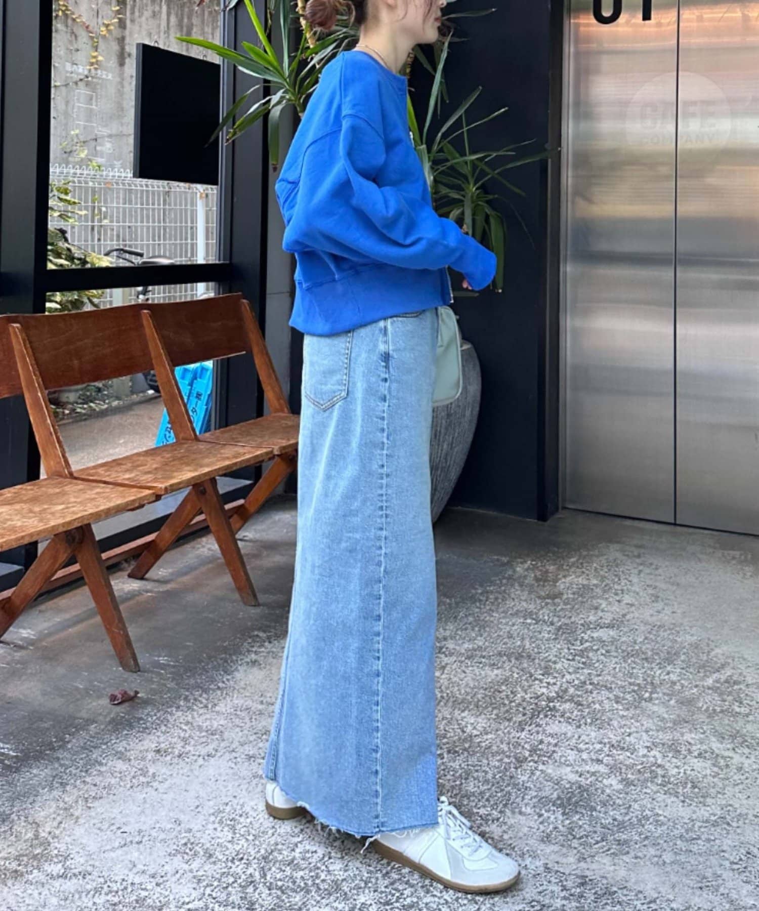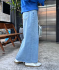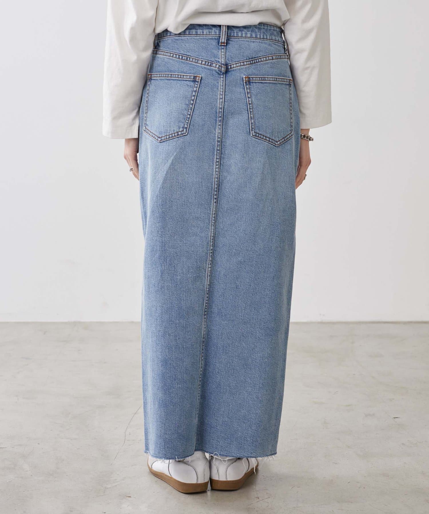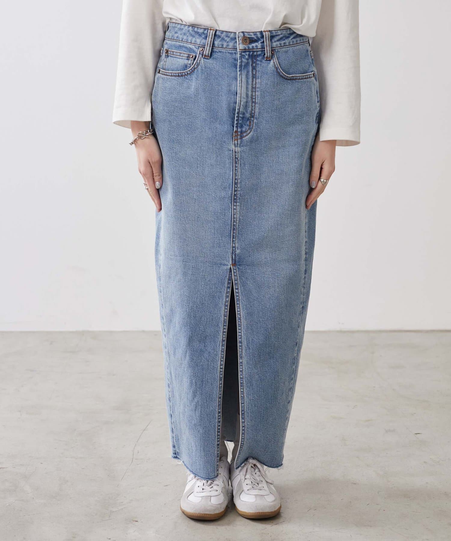 ベーシックなデニムスカートながらも、ウォッシュ加工&裾の断ち切りでヴィンテージ感漂うデザインに仕上げました。