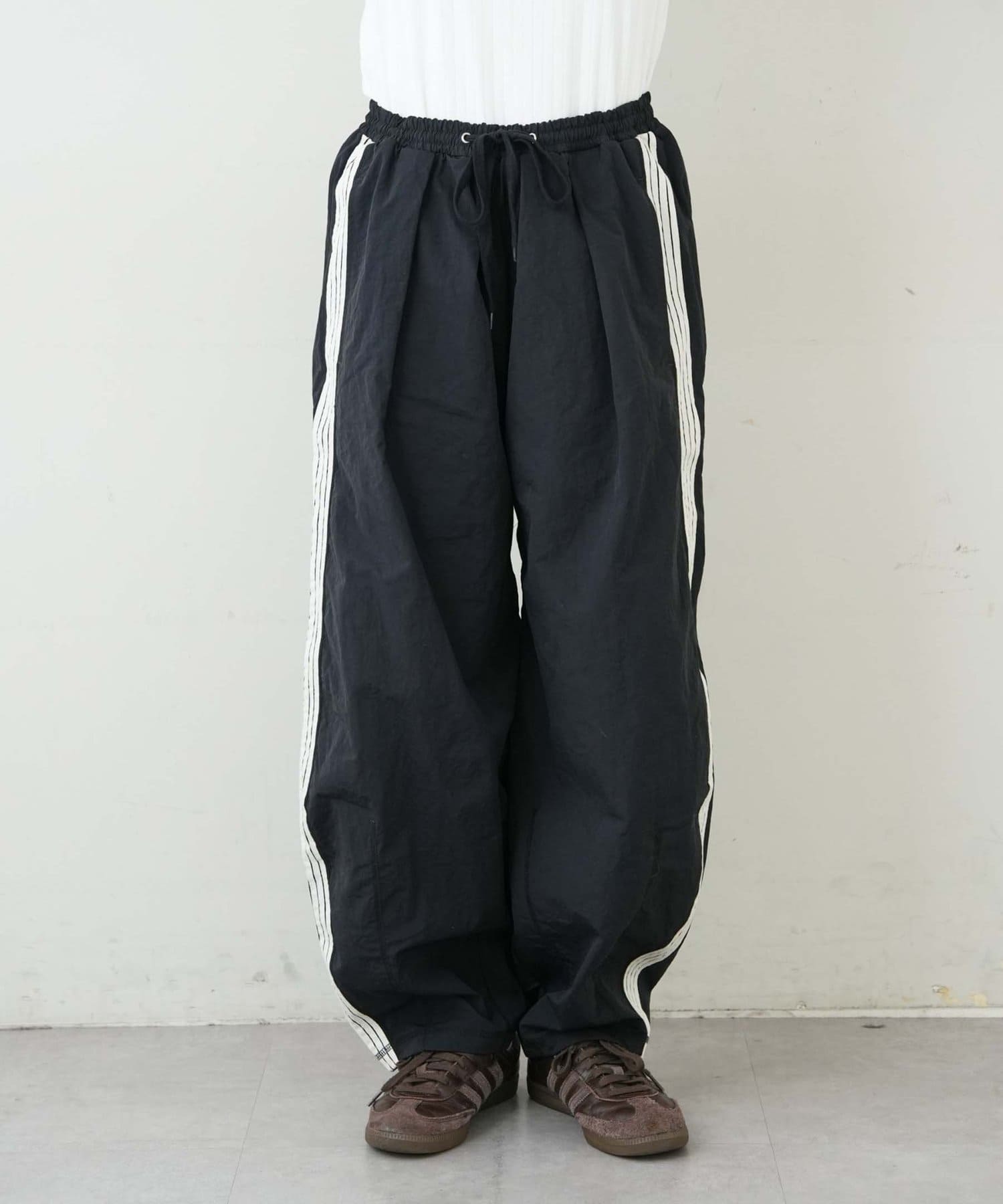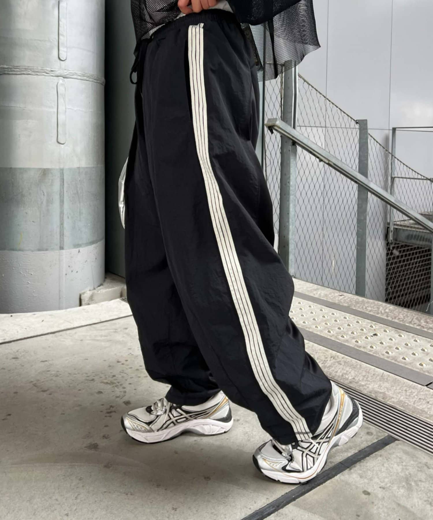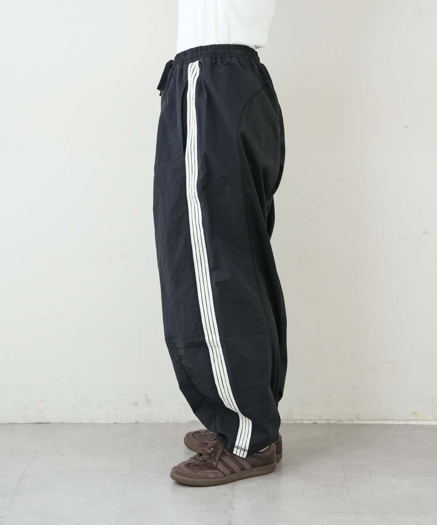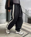 サイドの4本ラインがアクセントになった古着のようなジャージーパンツ。