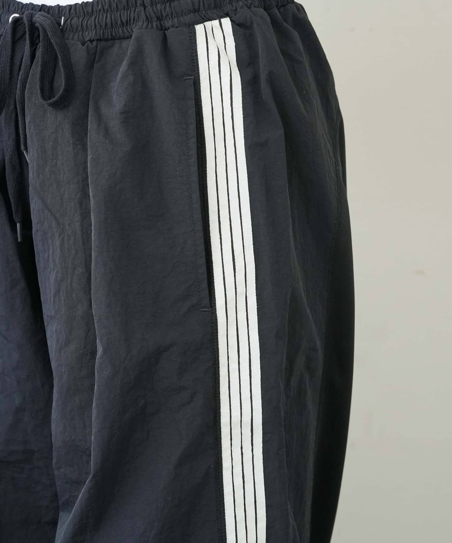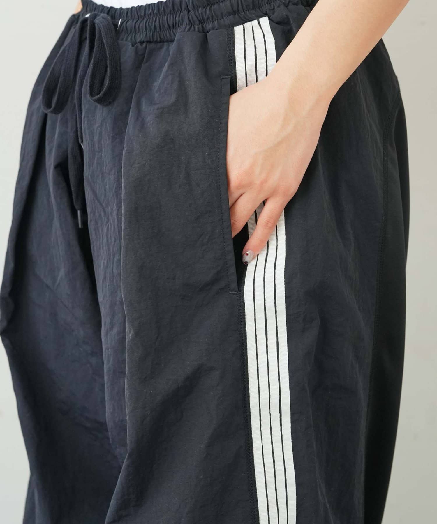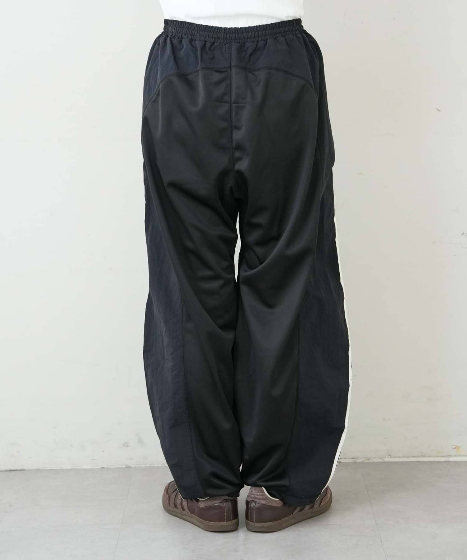 サイドの4本ラインがアクセントになった古着のようなジャージーパンツ。