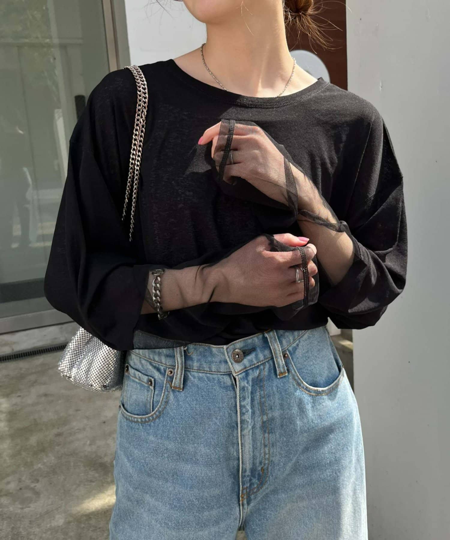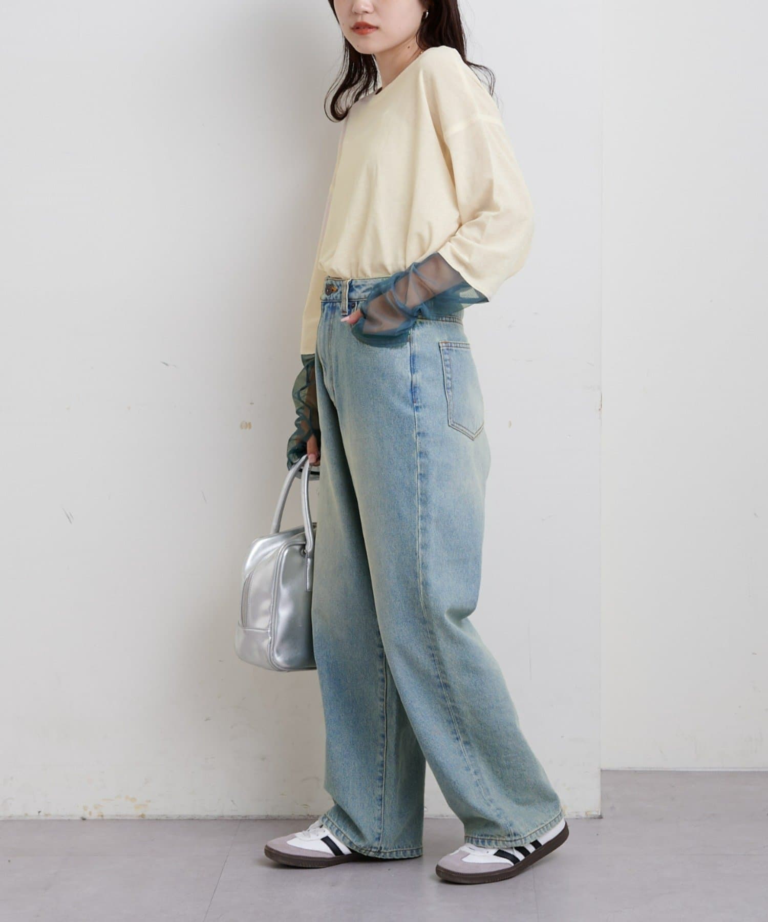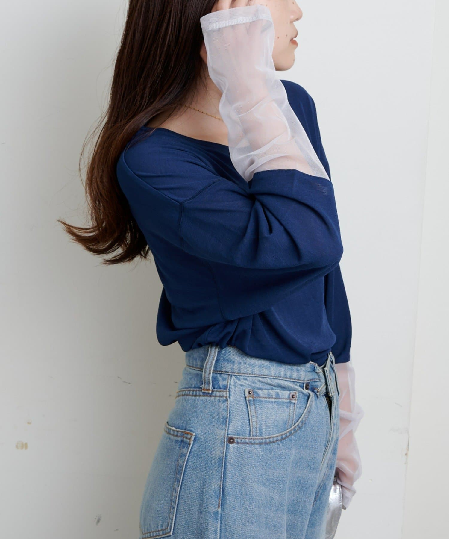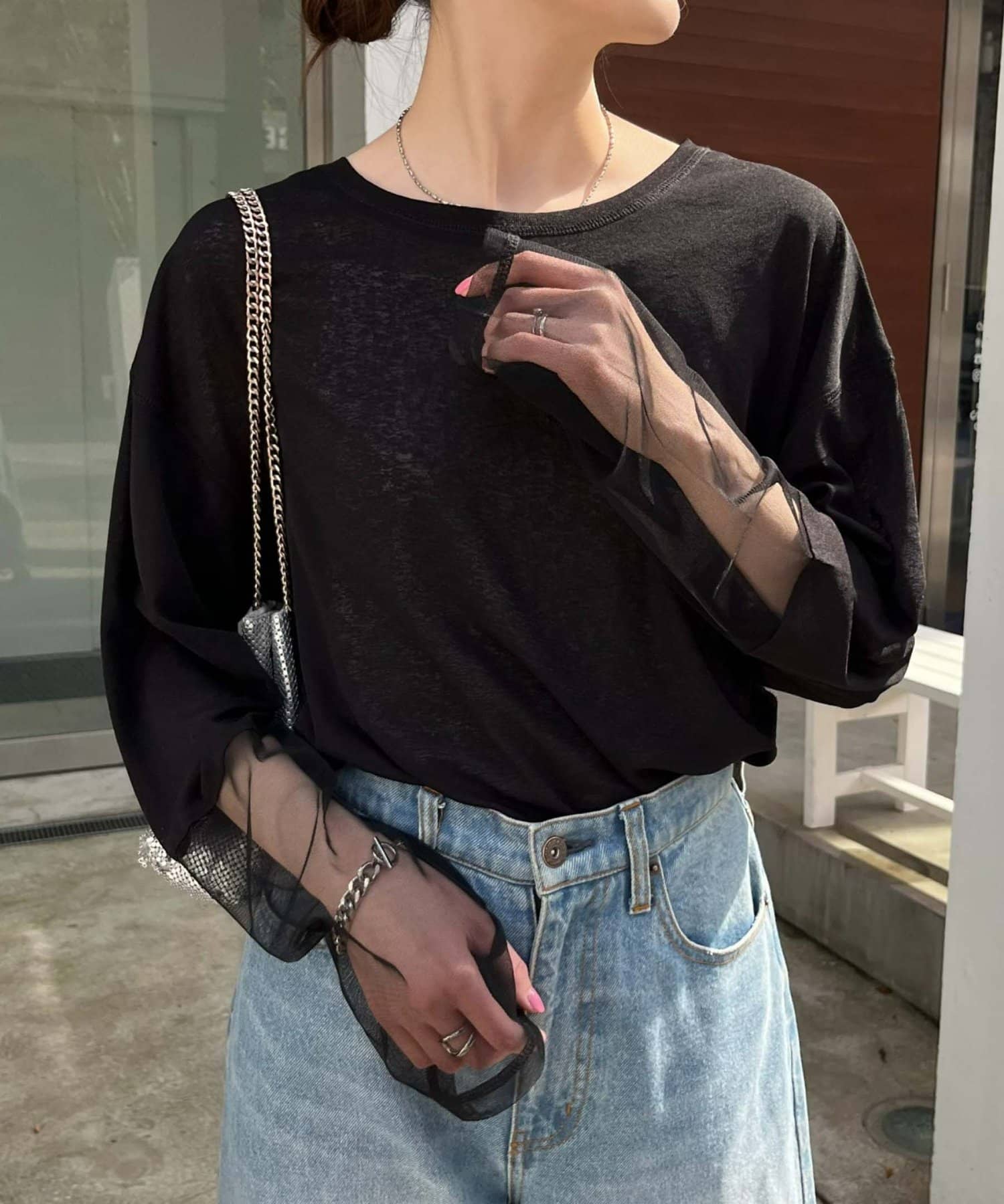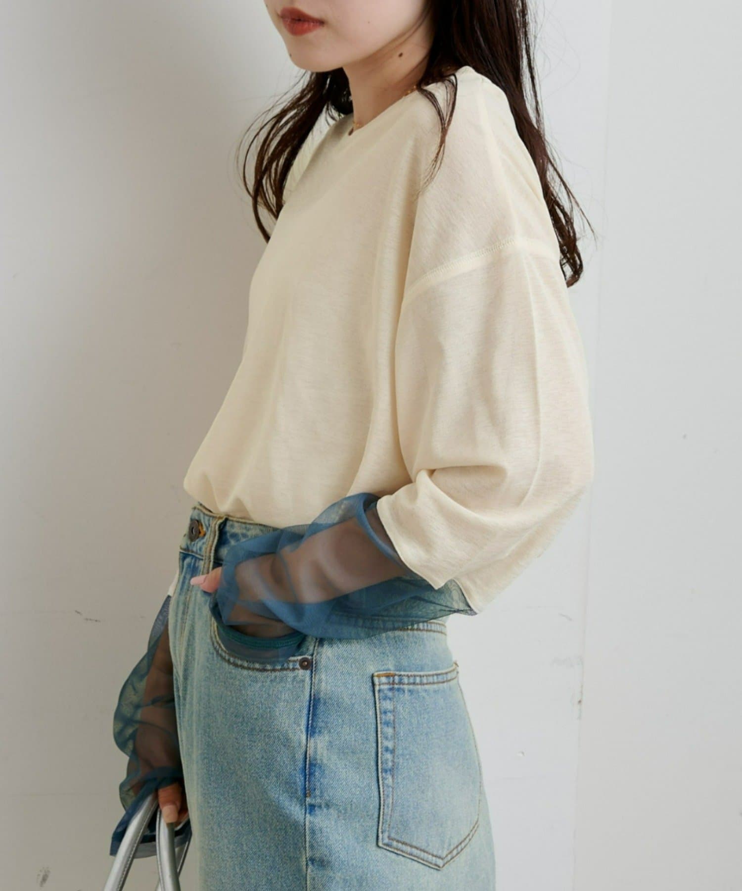 購入場所:店舗袖は長め。全体がシアー感ありのため、アクセントが強いボトムにさらっと流行りを添えたい時に良いです。